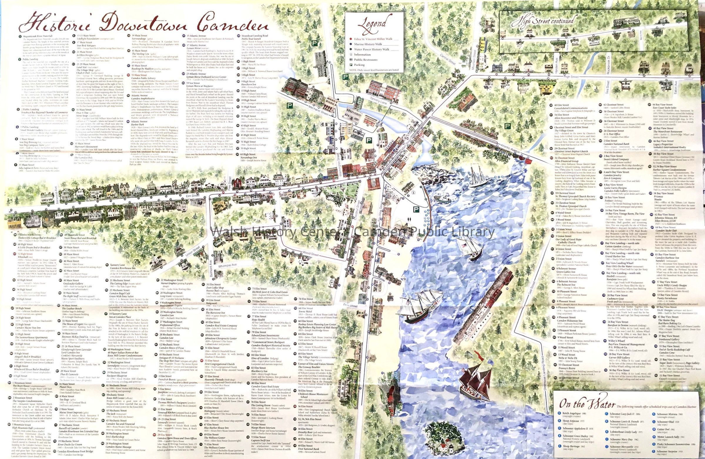 Historic Downtown Camden. Penobscot Bay Regional Chamber of Commerce, 2011 (Ann Morris, Editor. Design by Tim Seymour Designs. Map watercolors by Deborah Winship. Published by the Penobscot Bay Chamber of Commerce; originated by the Camden Area Business Group in 2008). A color map depicting (in commendable detail) some 200 numbered structures along streets in the downtown area of Camden, with address and brief description of each, as well as 10 sailing vessels offering scheduled trips out of Camden Harbor.