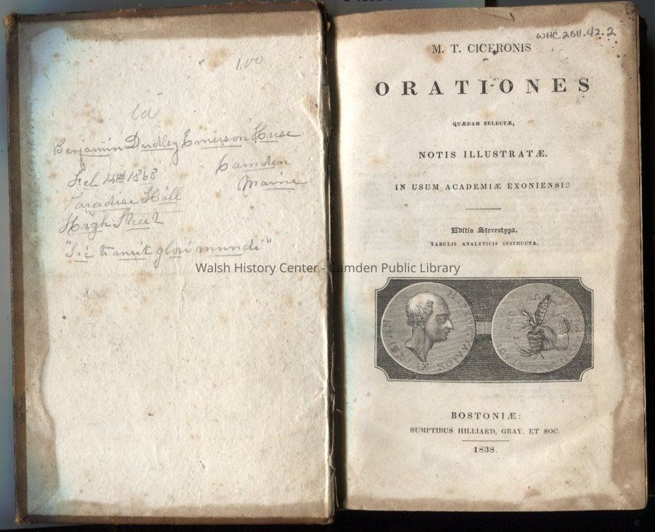 Cicero's Orations. Inscribed in pencil on inside cover "Dr. Benjamin Dudley Emerson Huse, Feb 12th 1868, Paradise Hill, High Street, Camden, Maine. Sic transit glori mundi."