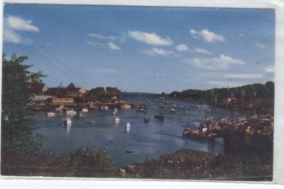 Color postcard of Camden harbor as viewed from Harbor Park circa 1950. The Public Landing is visible to the right, and Wayfarer Marine is on the left.Collection