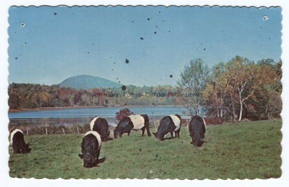 Postcard of the Belted Galloways at Aldermere Farm in Rockport, Maine. Bald Mountain is visible in the background over Lily Pond, from which natural ice was shipped for many years as far as the West Indies. The cows are part of the herd of hardy Scotch beef cattle, noted for their top quality meat.Collection