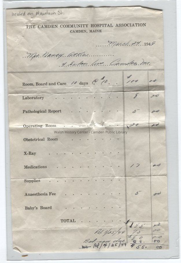 Bill for surgery and hospital stay for Nancy Atkins at the Camden Community Hospital located on Mountain Street in Camden, Maine. The bill is dated March 24, 1949 and totals $155 for 10 day stay. The hospital later became the Mountain Street Nursing Home, and is now a private residence at 19 Mountain Street.Collection
