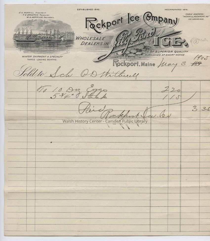 Billhead from Rockport Ice Company - wholesale dealers in Lily Pond Ice. Bill dated May 3, 1905.