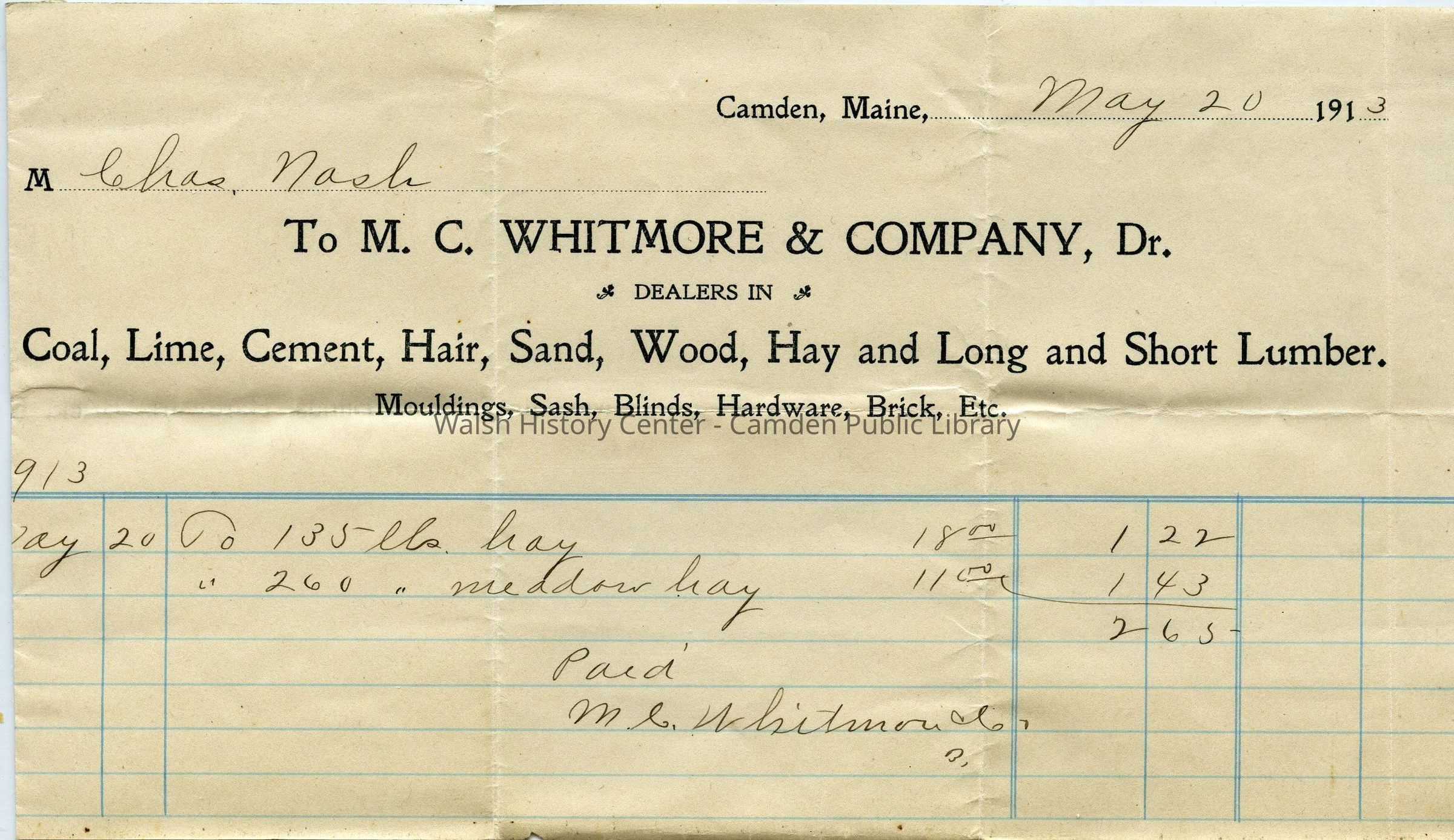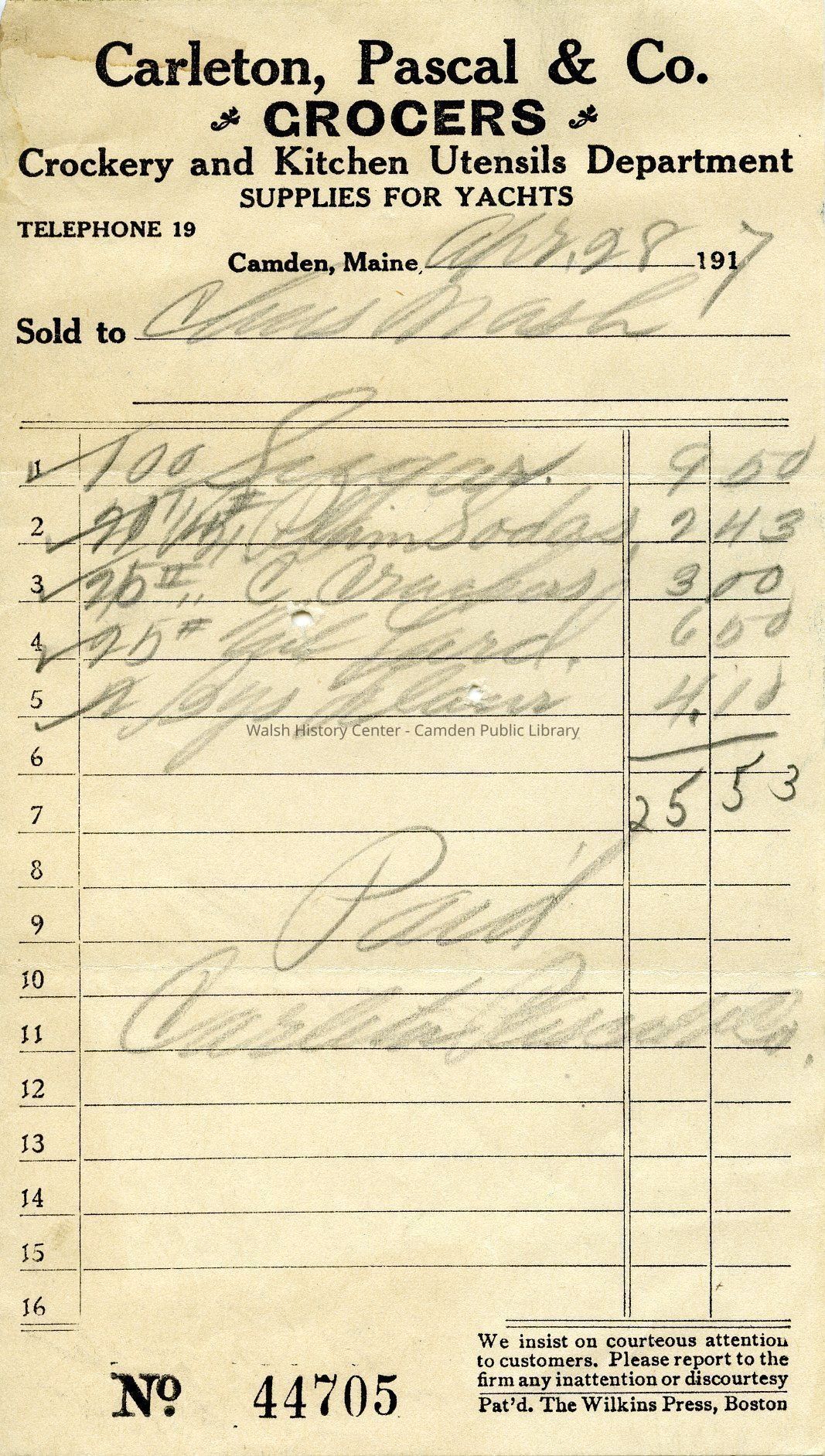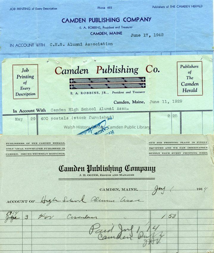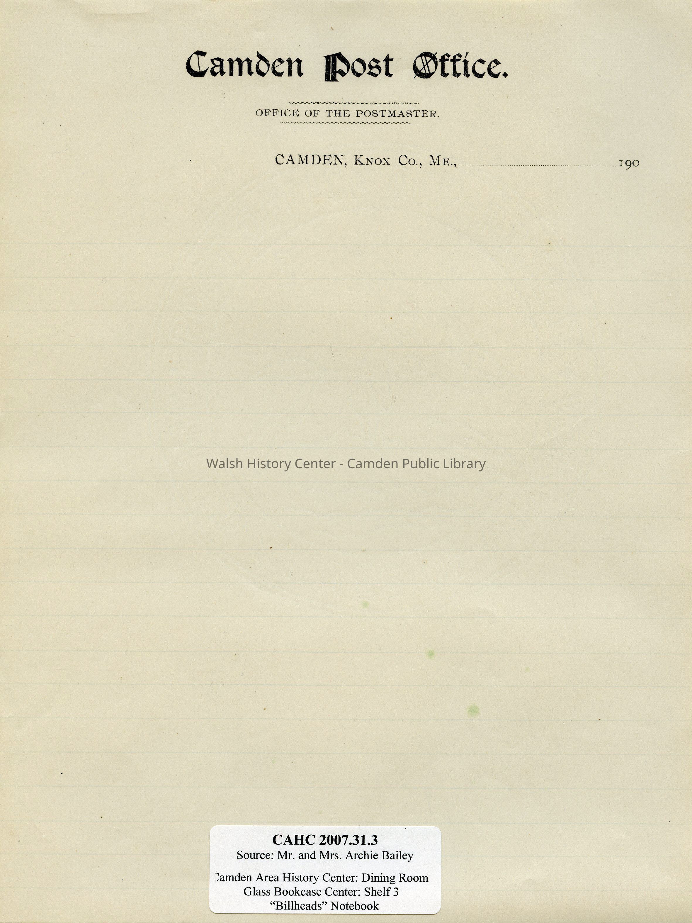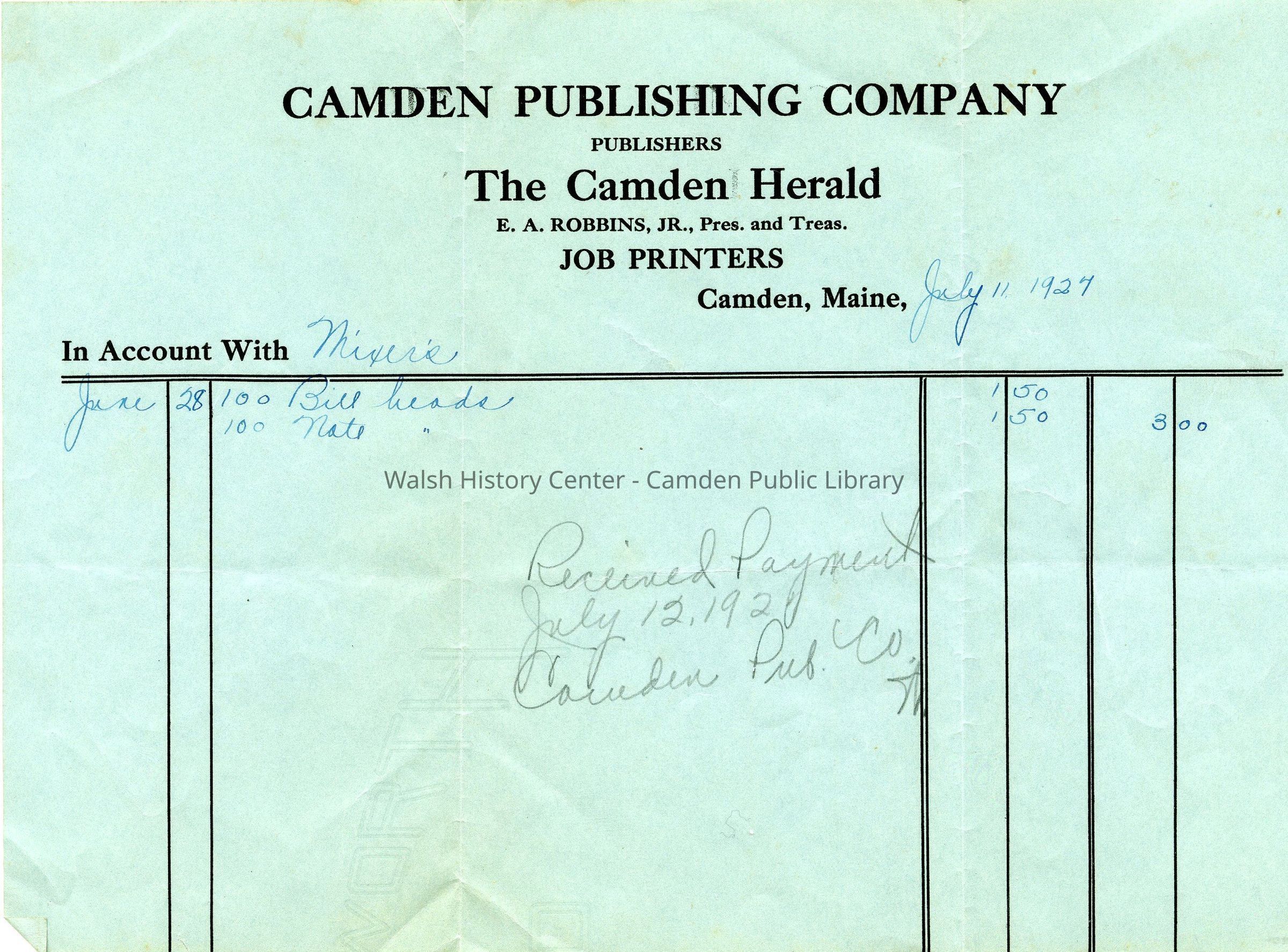 Contains billheads, stationery, bills, letterheads, and receipts from several Camden area businesses. These items date from the 1880's through the 1950's. Partial list of businesses represented: G.W. Achorn; Allen Insurance Agency; Ayers Market; Bay View House; Bay View Street Garage; Boynton's Pharmacy; Brown & Hobbs lumber; Brown's Market; Camden Anchor-Rockland Machine Co.; Camden & Rockland Water Company; Camden Farmer's Union; Camden Lumber Company; Camden Publishing Company; Camden Yacht Building and Railway Company; Carleton, Pascal & Co.; J.C. Curtis Hardware; Follansbee & Wood; Haskell & Corthell; J.H. Hobbs Company; Lenfest's Automotive Service; J.L. Locke; Maiden Cliff Rebekah Lodge; Maine Insane Hospital; The Megunticook Press; A.H. Parsons; Pendleton Dairy; S.G. Ritterbush, contractor; Rockland, Thomaston & Camden Street Railway; S.E. & H.L. Shepherd Company; TalbotCollection