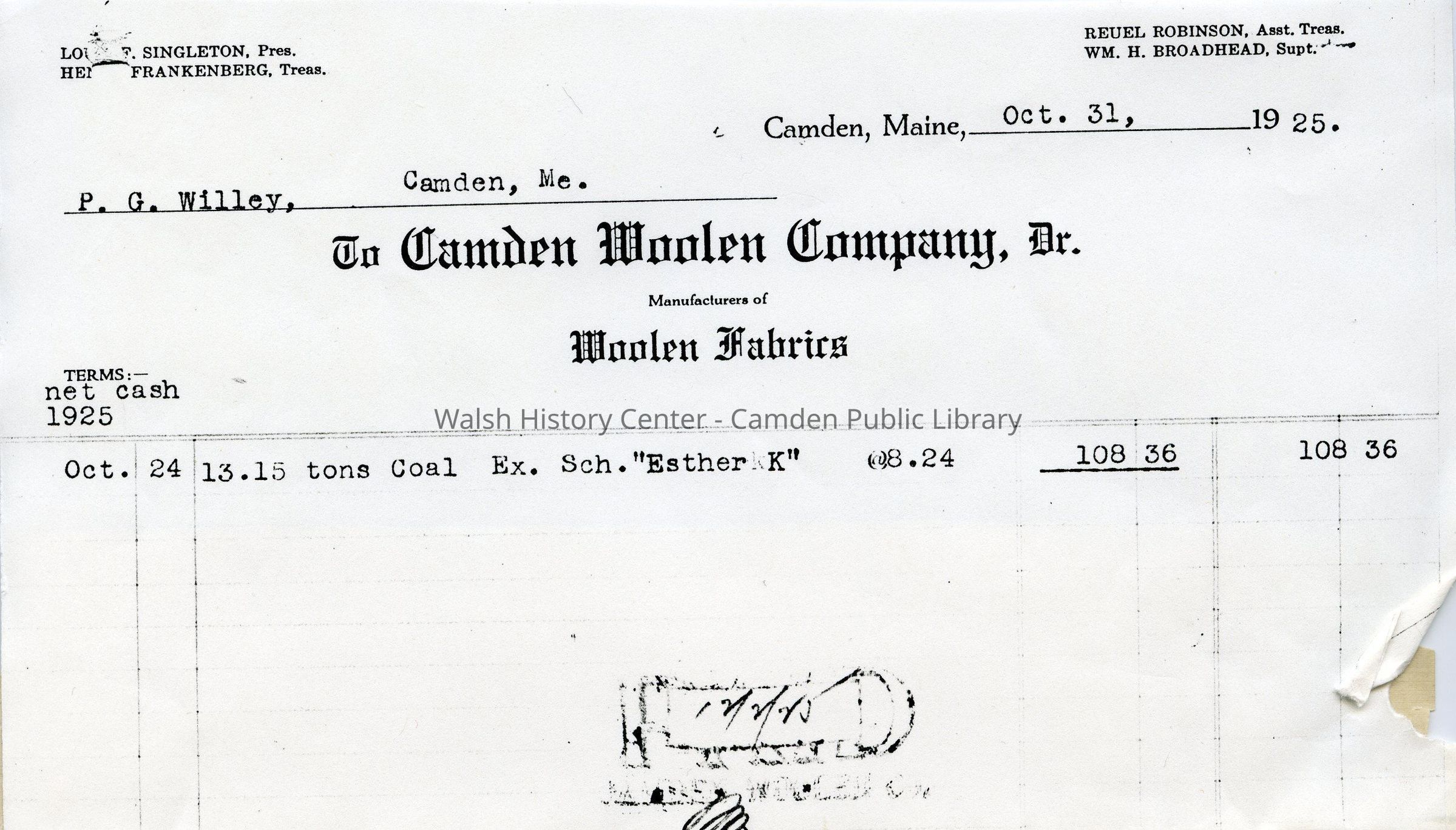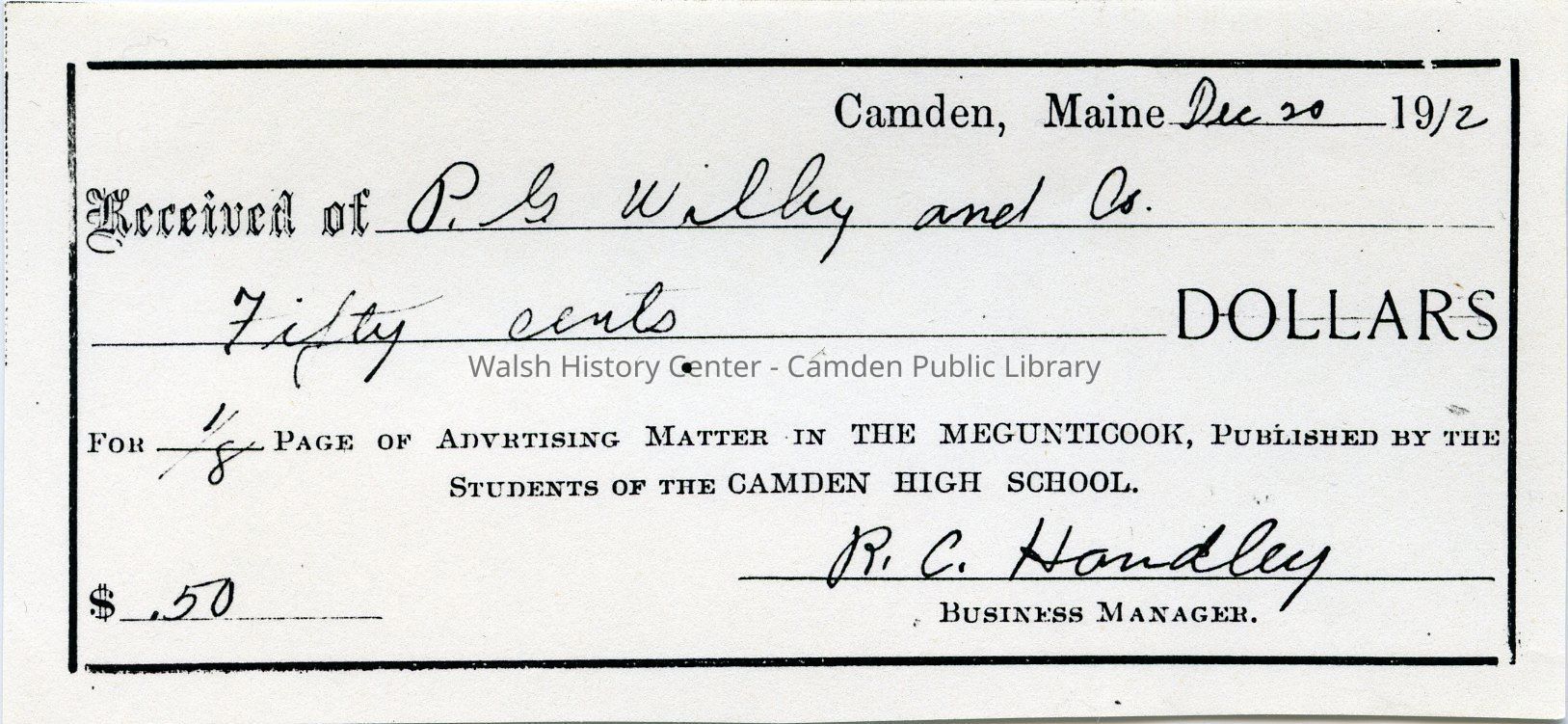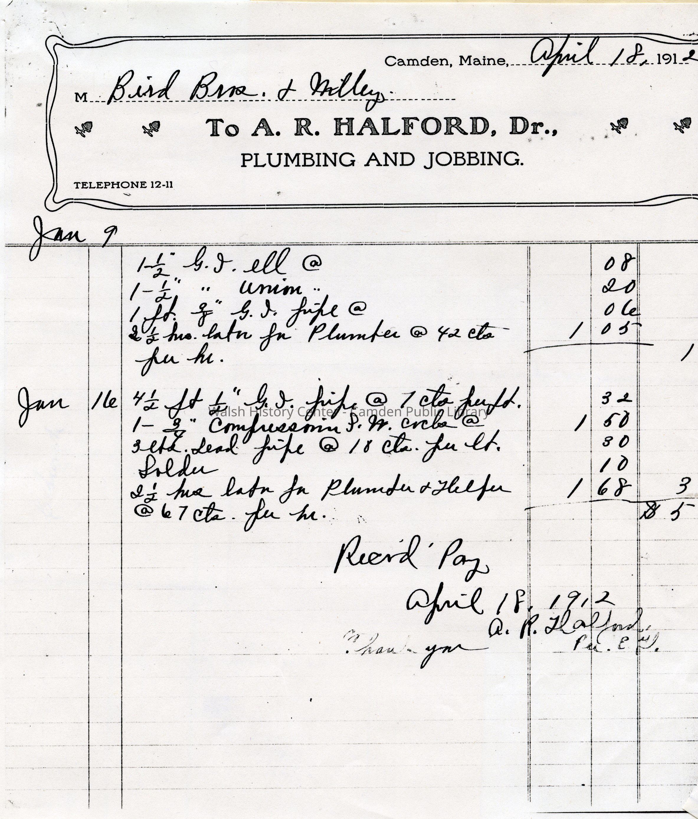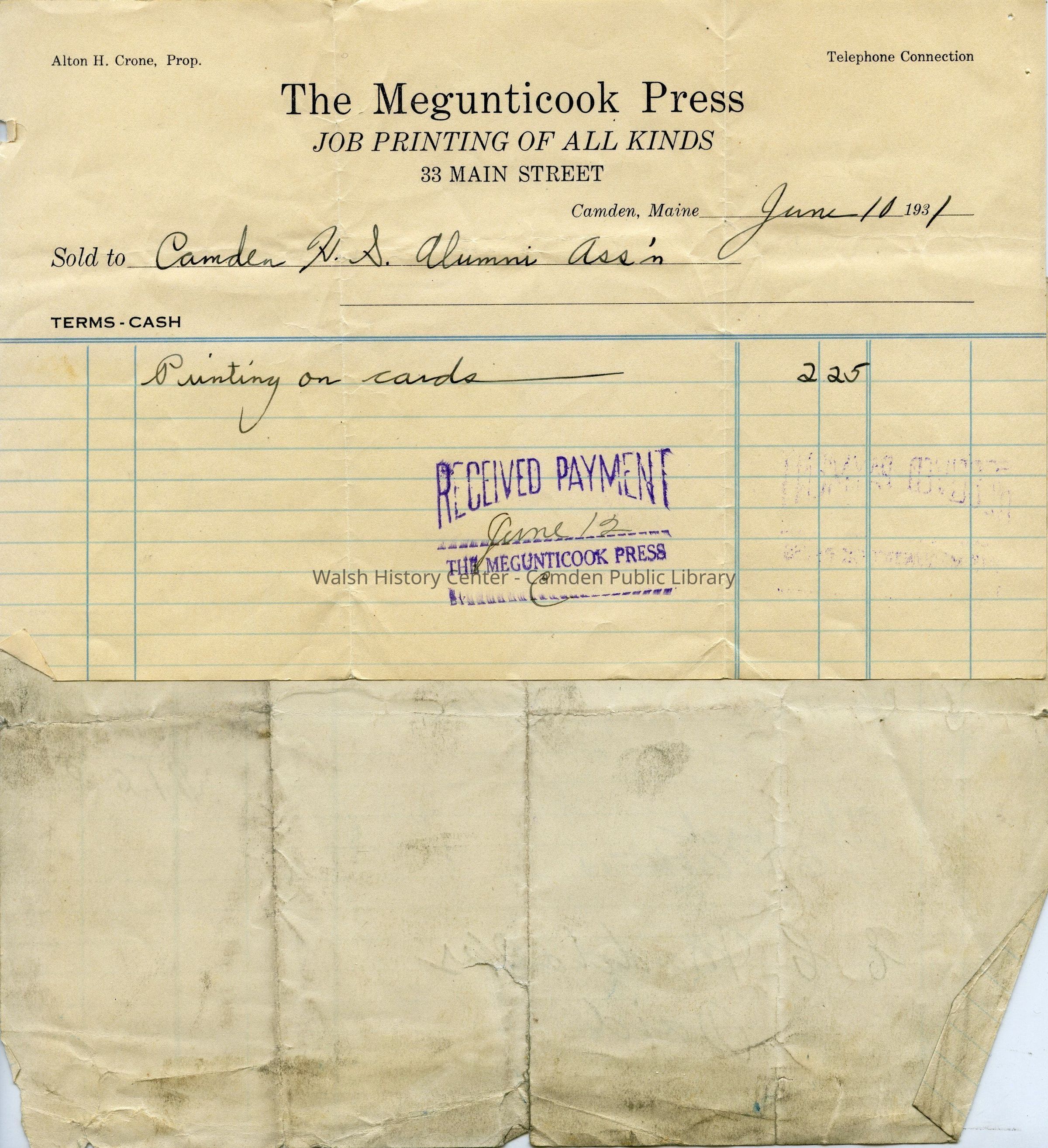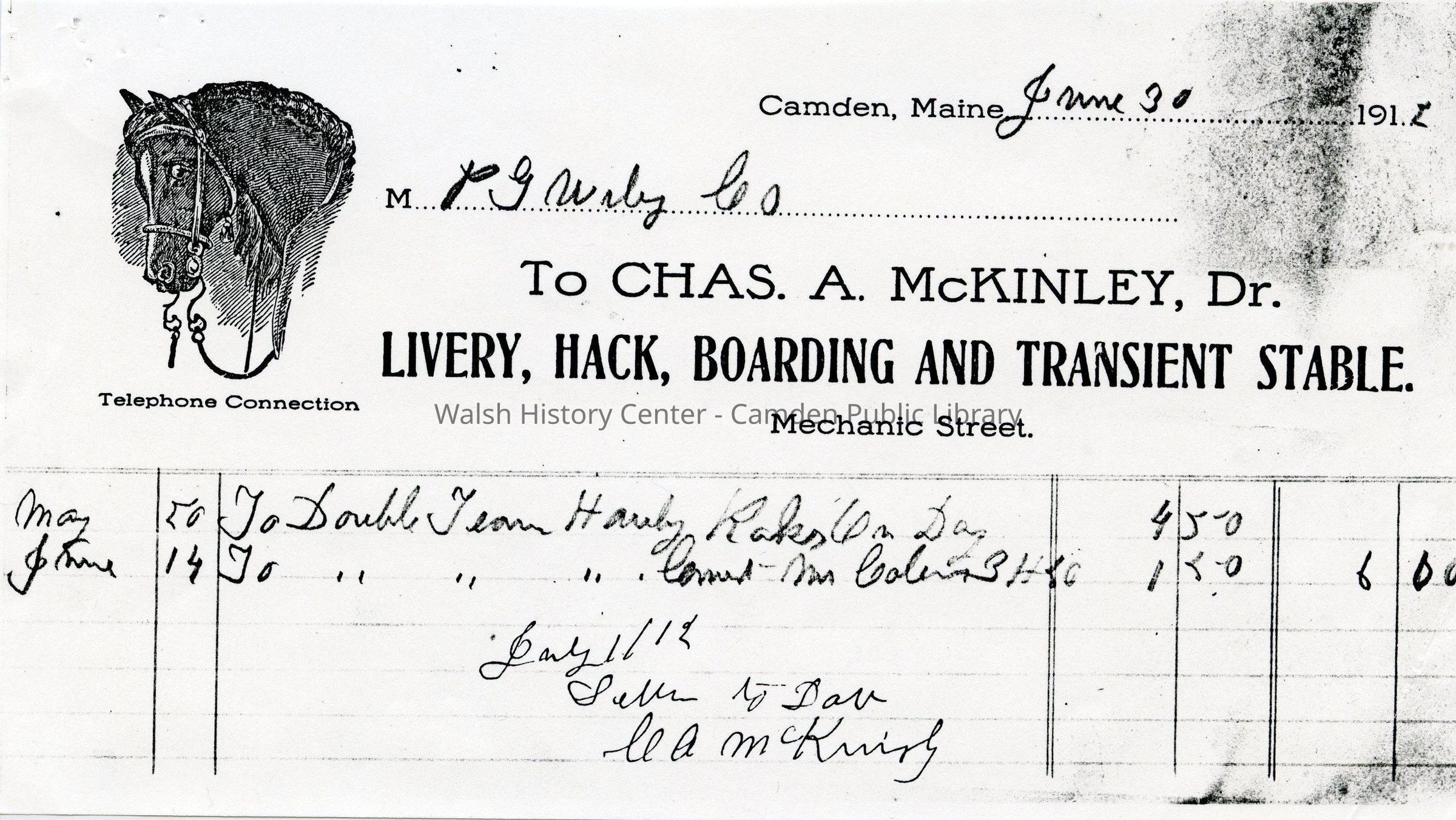 Contains billheads, stationery, bills, letterheads, and receipts from several Camden area businesses. These items date from the 1880's through the 1950's. Partial list of businesses represented: G.W. Achorn; Allen Insurance Agency; Ayers Market; Bay View House; Bay View Street Garage; Boynton's Pharmacy; Brown & Hobbs lumber; Brown's Market; Camden Anchor-Rockland Machine Co.; Camden & Rockland Water Company; Camden Farmer's Union; Camden Lumber Company; Camden Publishing Company; Camden Yacht Building and Railway Company; Carleton, Pascal & Co.; J.C. Curtis Hardware; Follansbee & Wood; Haskell & Corthell; J.H. Hobbs Company; Lenfest's Automotive Service; J.L. Locke; Maiden Cliff Rebekah Lodge; Maine Insane Hospital; The Megunticook Press; A.H. Parsons; Pendleton Dairy; S.G. Ritterbush, contractor; Rockland, Thomaston & Camden Street Railway; S.E. & H.L. Shepherd Company; TalbotCollection
