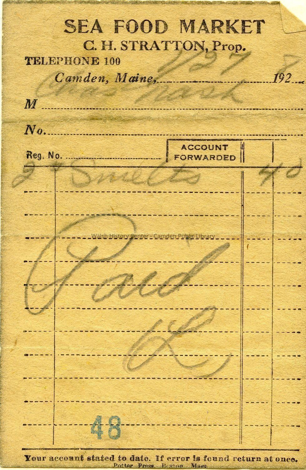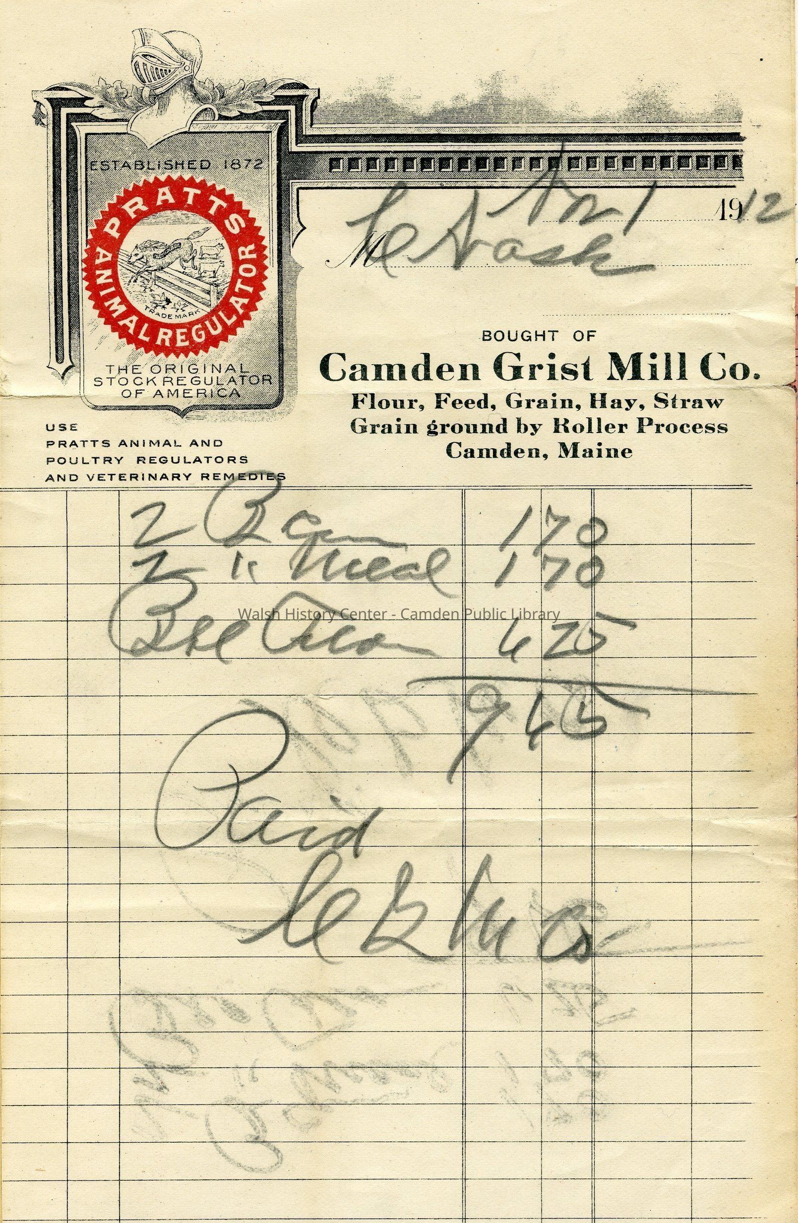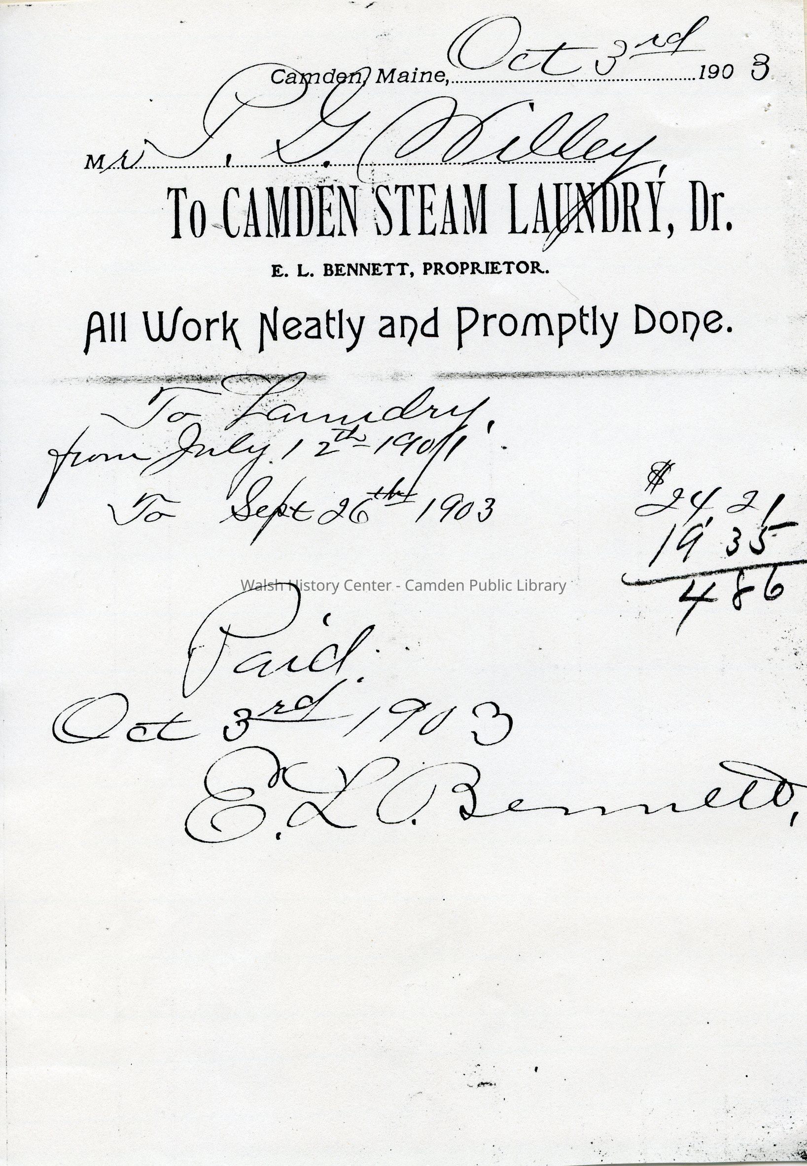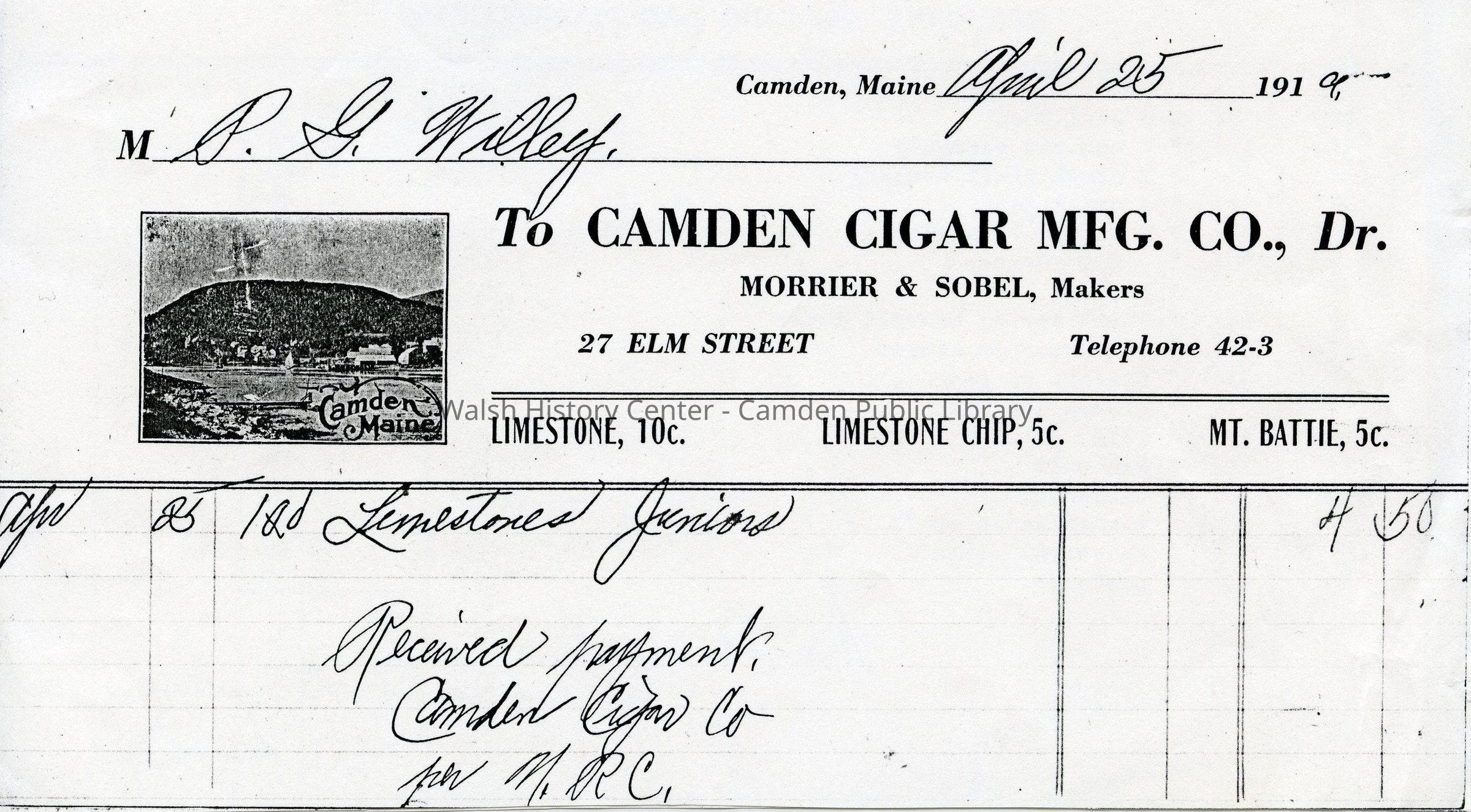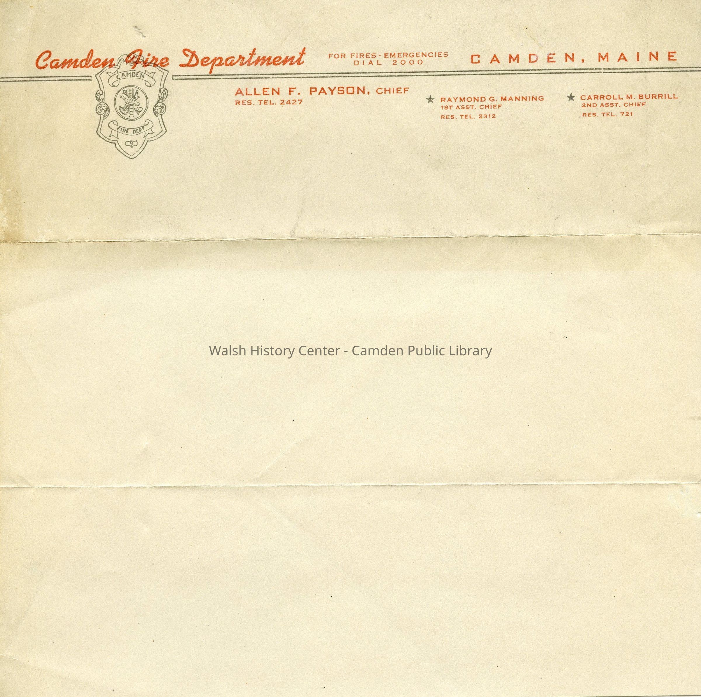 Contains billheads, stationery, bills, letterheads, and receipts from several Camden area businesses. These items date from the 1880's through the 1950's. Partial list of businesses represented: G.W. Achorn; Allen Insurance Agency; Ayers Market; Bay View House; Bay View Street Garage; Boynton's Pharmacy; Brown & Hobbs lumber; Brown's Market; Camden Anchor-Rockland Machine Co.; Camden & Rockland Water Company; Camden Farmer's Union; Camden Lumber Company; Camden Publishing Company; Camden Yacht Building and Railway Company; Carleton, Pascal & Co.; J.C. Curtis Hardware; Follansbee & Wood; Haskell & Corthell; J.H. Hobbs Company; Lenfest's Automotive Service; J.L. Locke; Maiden Cliff Rebekah Lodge; Maine Insane Hospital; The Megunticook Press; A.H. Parsons; Pendleton Dairy; S.G. Ritterbush, contractor; Rockland, Thomaston & Camden Street Railway; S.E. & H.L. Shepherd Company; TalbotCollection