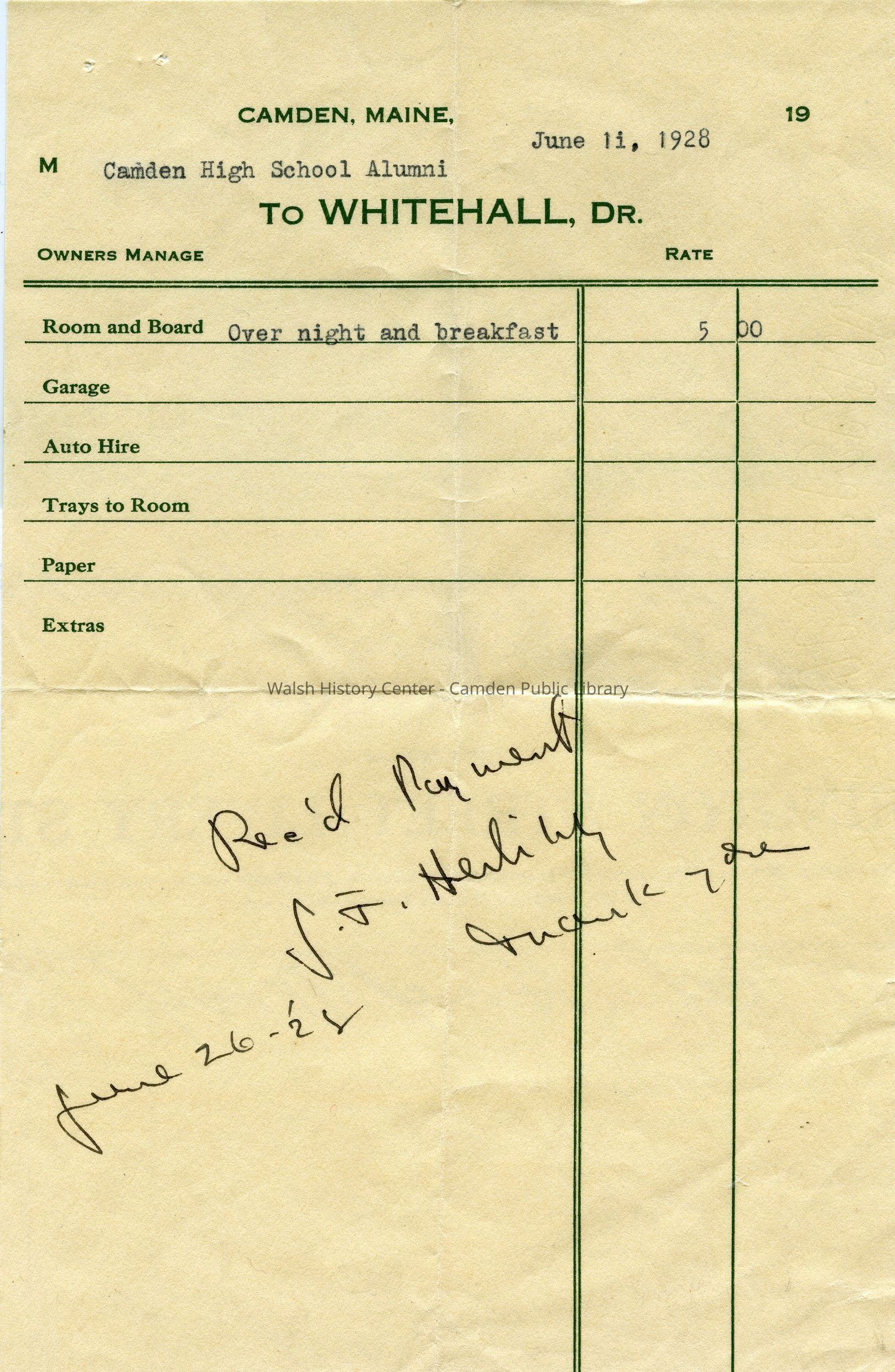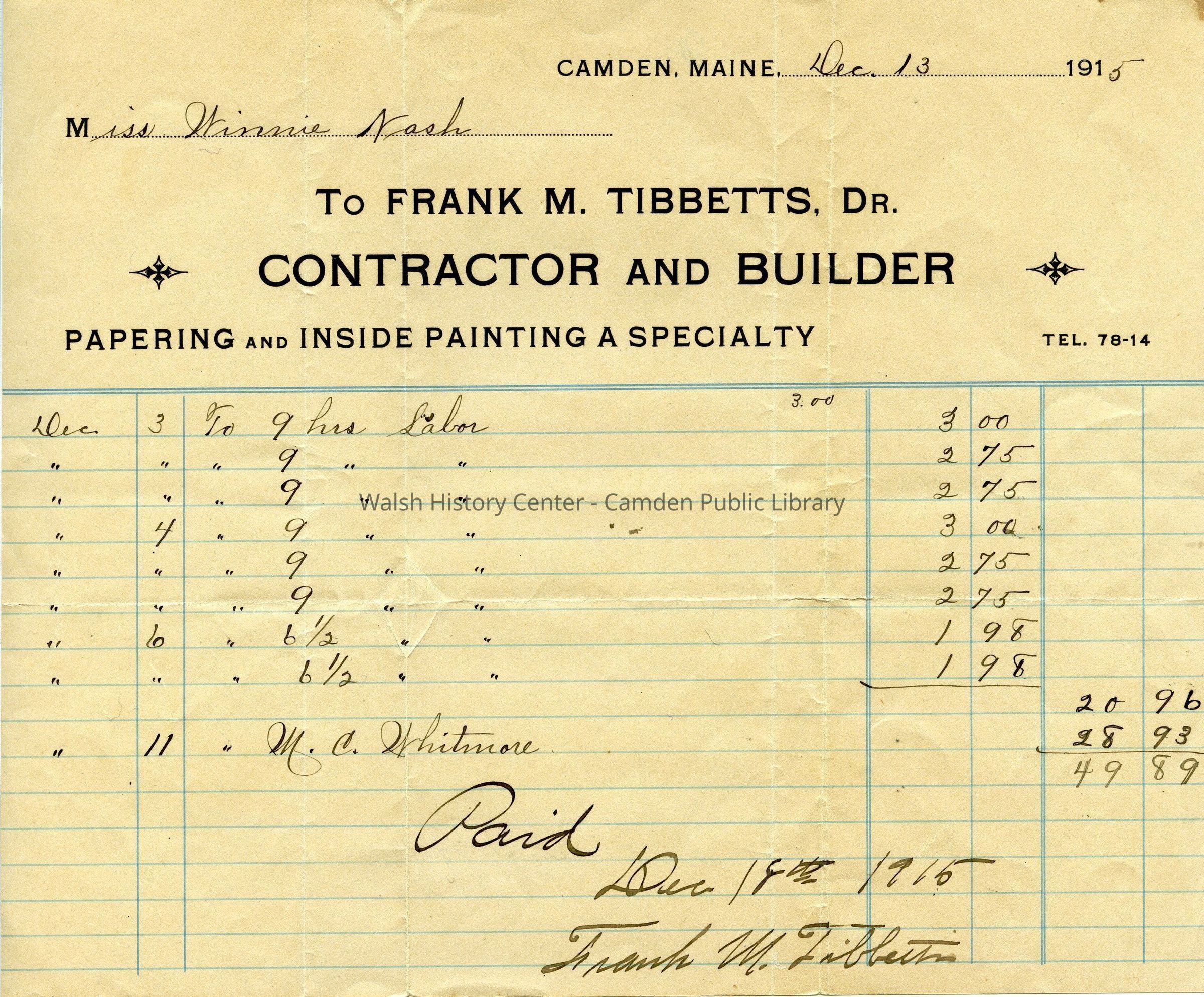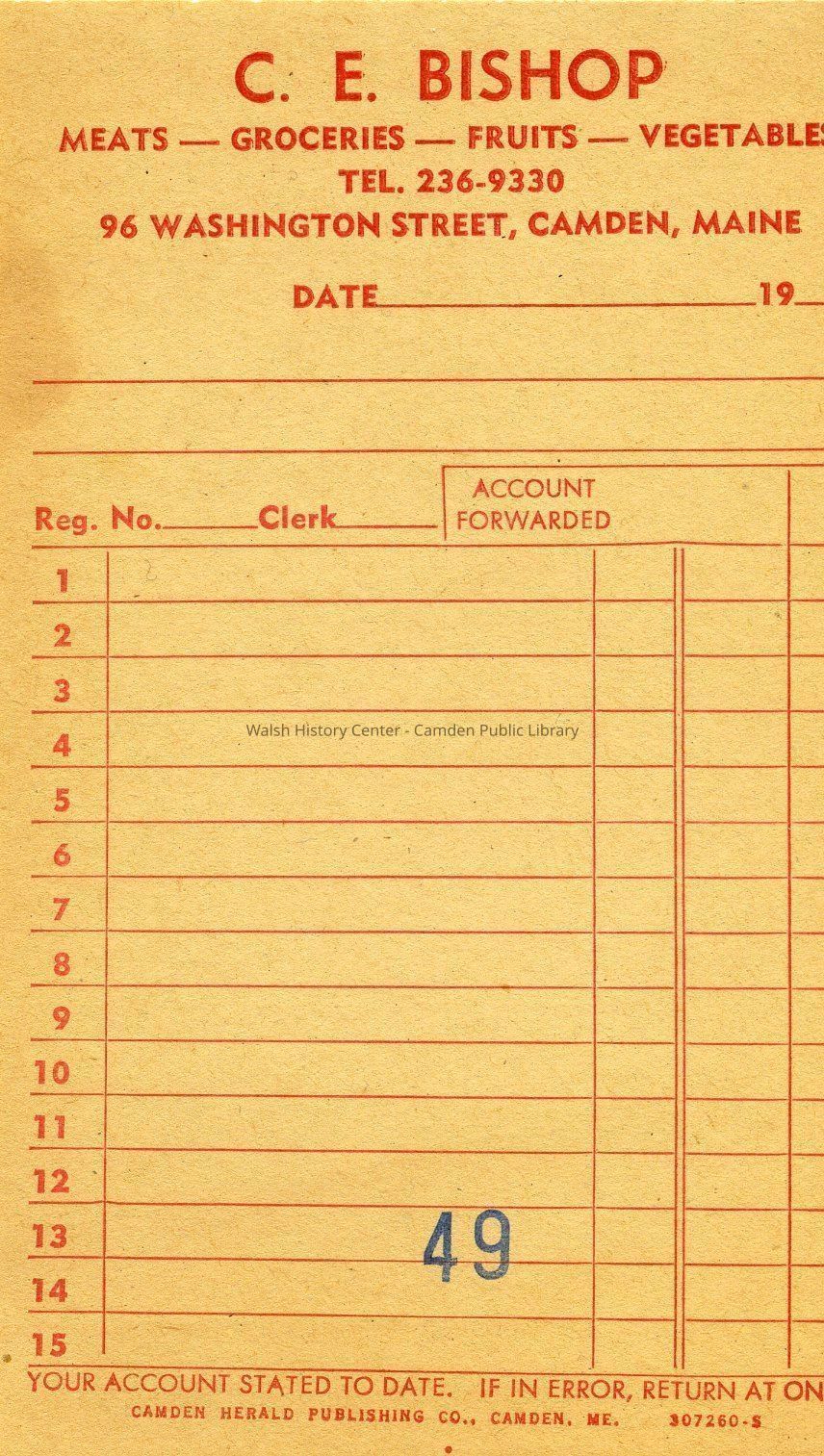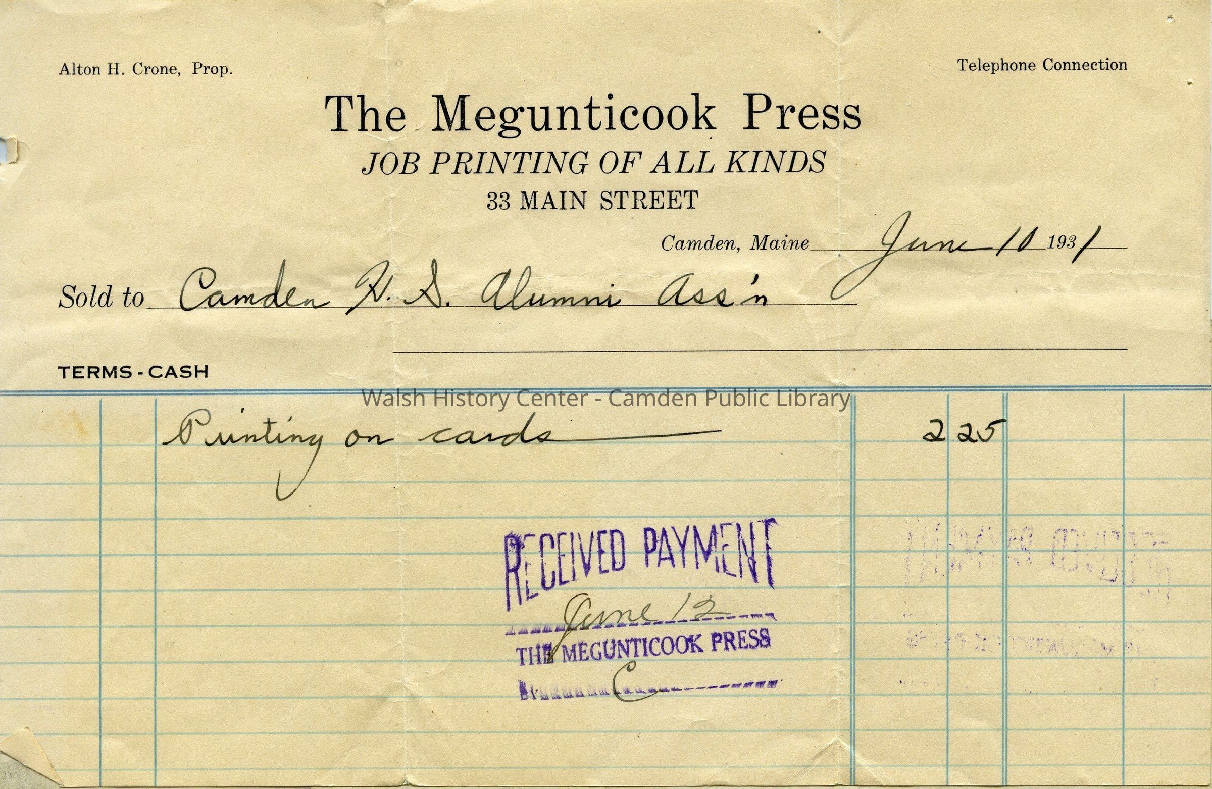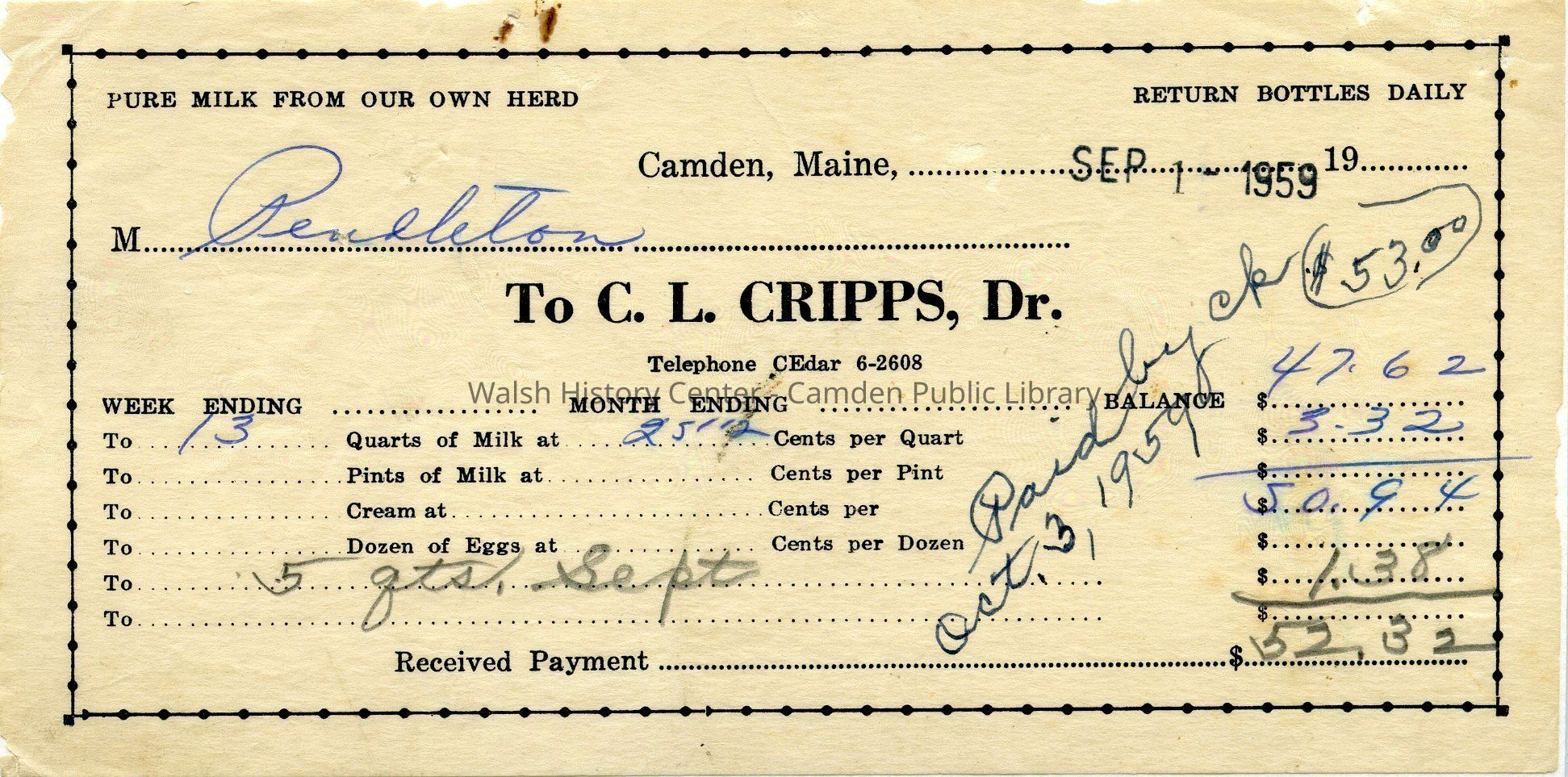 Contains billheads, stationery, bills, letterheads, and receipts from several Camden area businesses. These items date from the 1880's through the 1950's. Partial list of businesses represented: G.W. Achorn; Allen Insurance Agency; Ayers Market; Bay View House; Bay View Street Garage; Boynton's Pharmacy; Brown & Hobbs lumber; Brown's Market; Camden Anchor-Rockland Machine Co.; Camden & Rockland Water Company; Camden Farmer's Union; Camden Lumber Company; Camden Publishing Company; Camden Yacht Building and Railway Company; Carleton, Pascal & Co.; J.C. Curtis Hardware; Follansbee & Wood; Haskell & Corthell; J.H. Hobbs Company; Lenfest's Automotive Service; J.L. Locke; Maiden Cliff Rebekah Lodge; Maine Insane Hospital; The Megunticook Press; A.H. Parsons; Pendleton Dairy; S.G. Ritterbush, contractor; Rockland, Thomaston & Camden Street Railway; S.E. & H.L. Shepherd Company; TalbotCollection