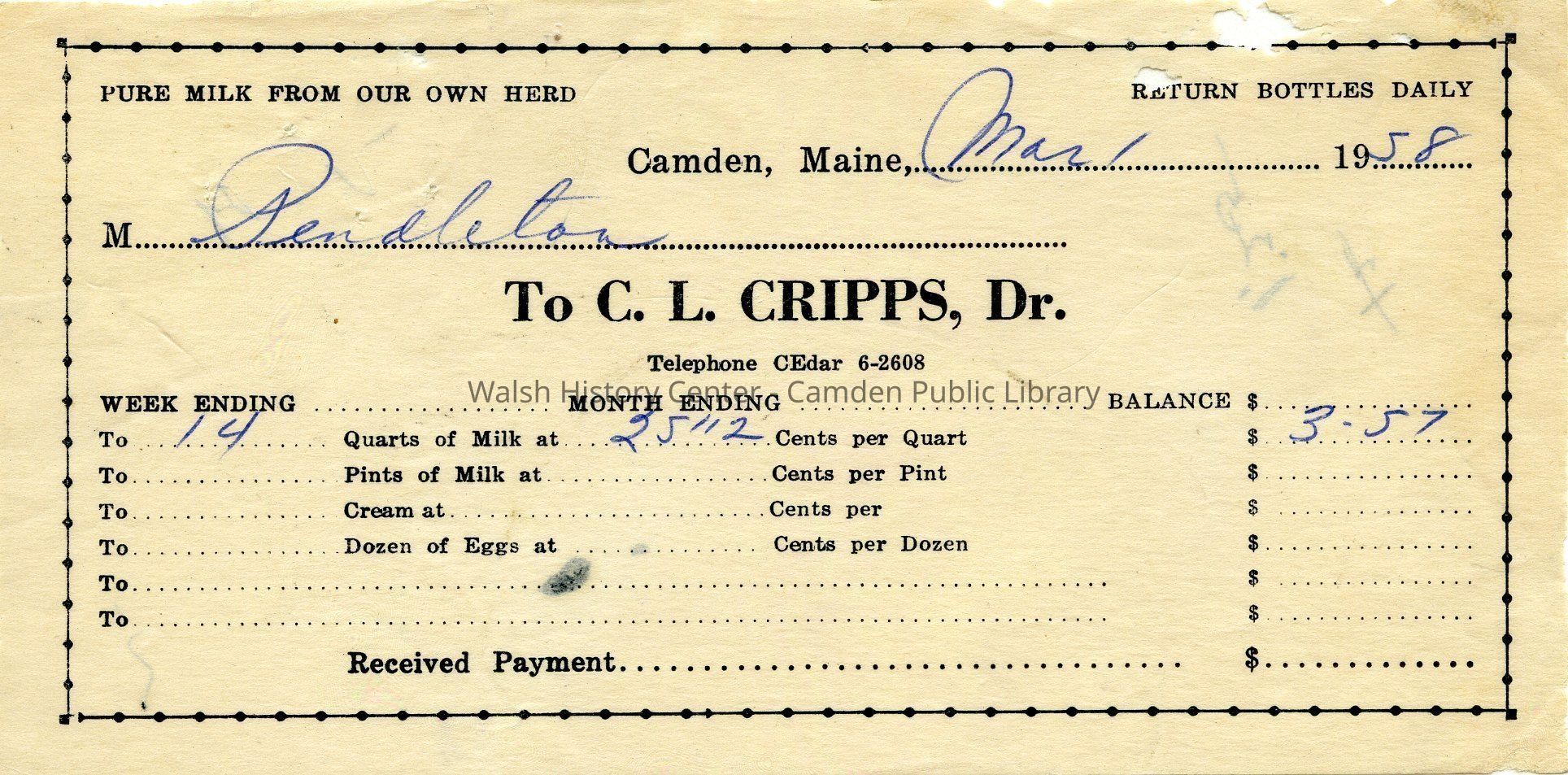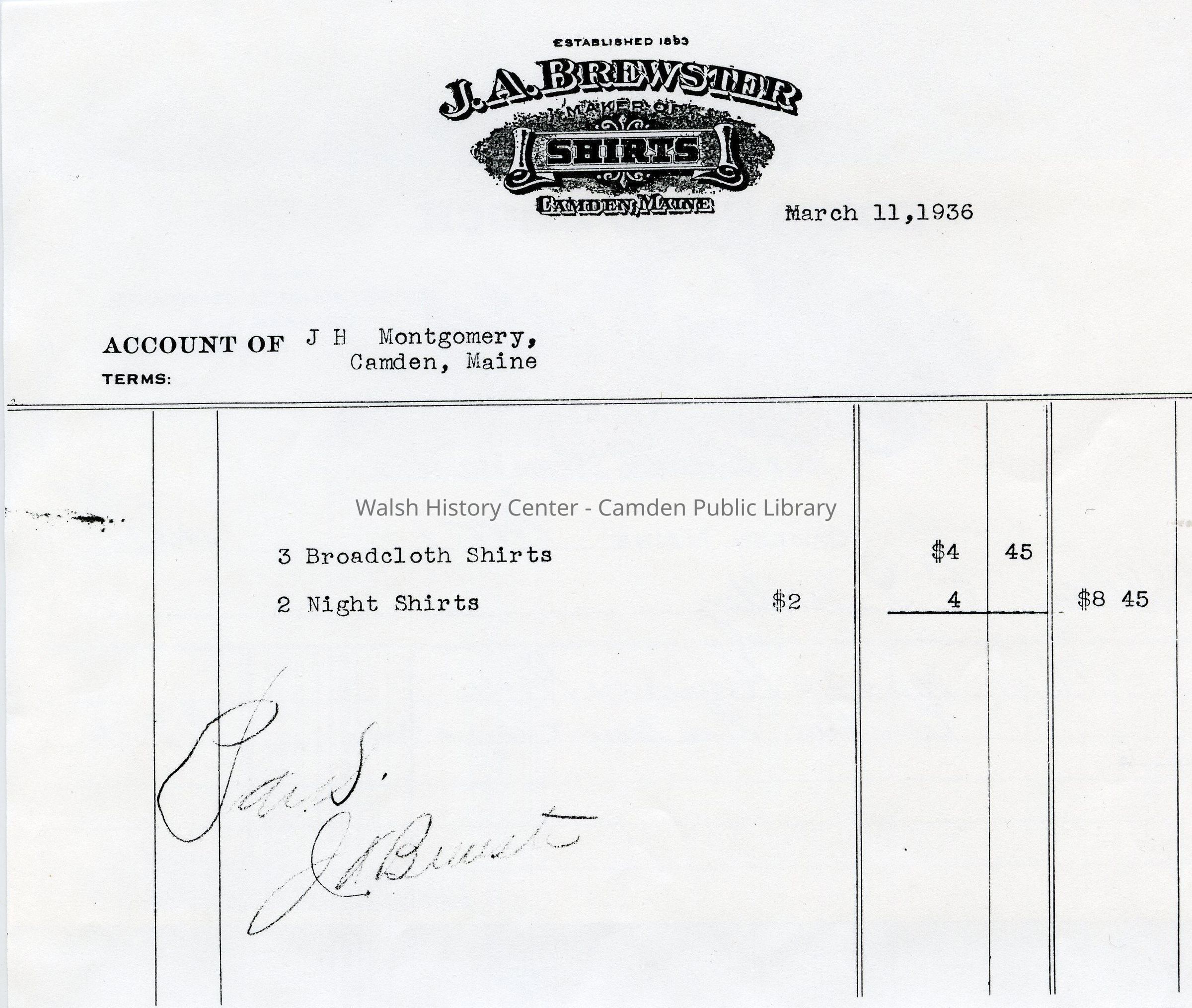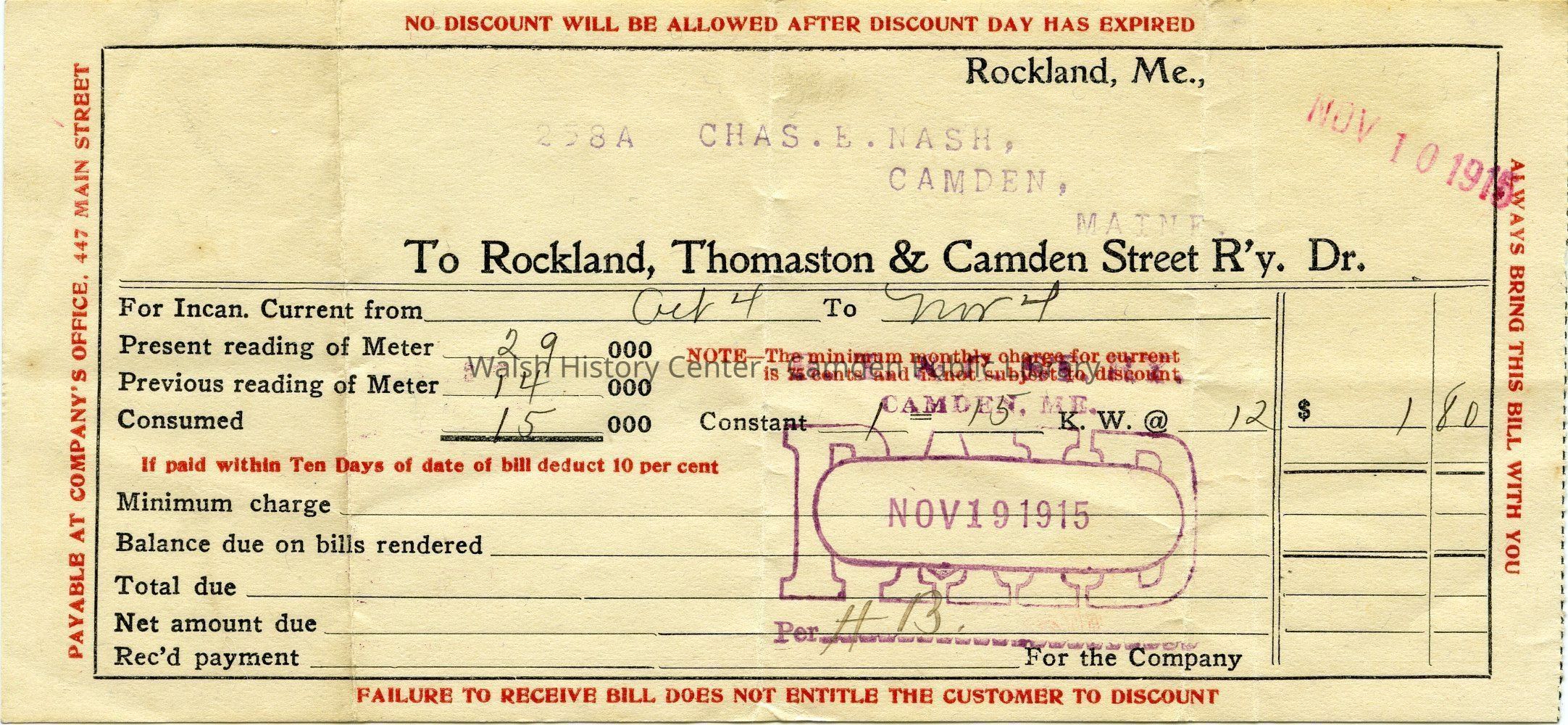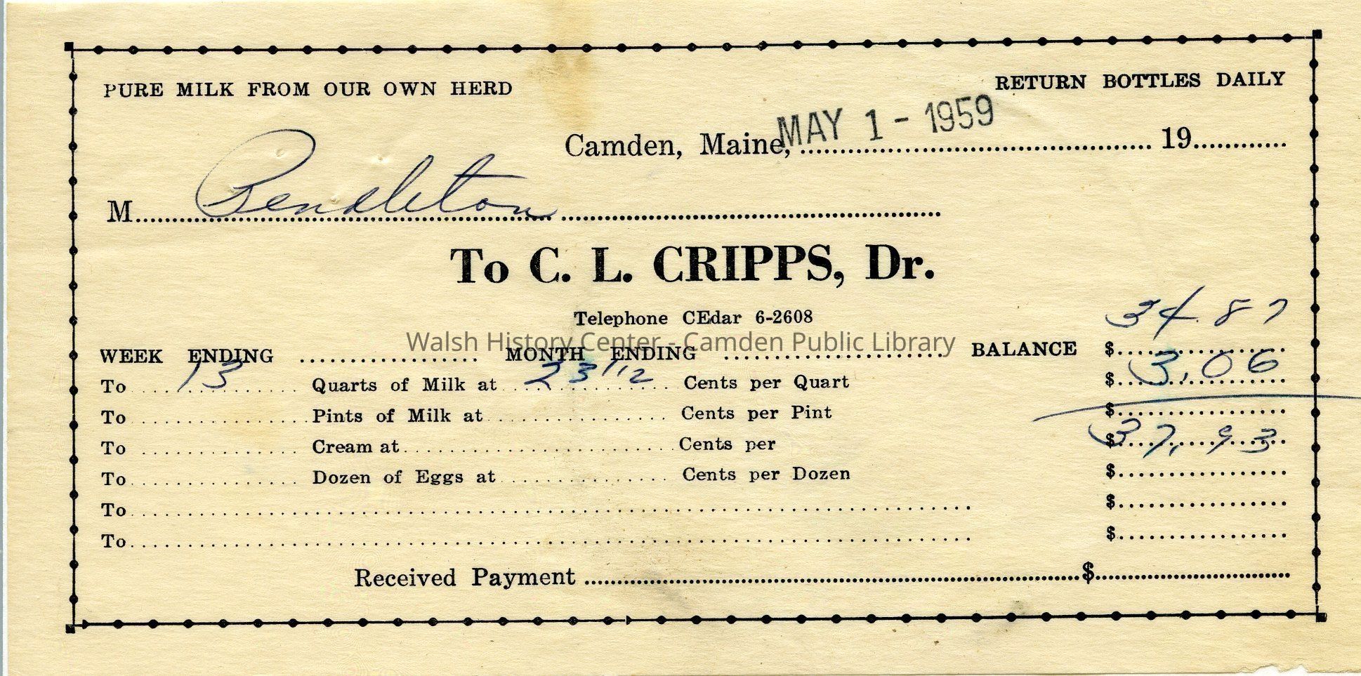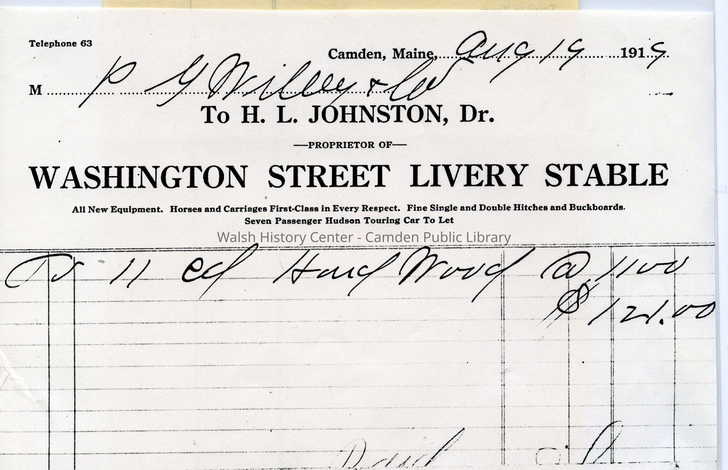 Contains billheads, stationery, bills, letterheads, and receipts from several Camden area businesses. These items date from the 1880's through the 1950's. Partial list of businesses represented: G.W. Achorn; Allen Insurance Agency; Ayers Market; Bay View House; Bay View Street Garage; Boynton's Pharmacy; Brown & Hobbs lumber; Brown's Market; Camden Anchor-Rockland Machine Co.; Camden & Rockland Water Company; Camden Farmer's Union; Camden Lumber Company; Camden Publishing Company; Camden Yacht Building and Railway Company; Carleton, Pascal & Co.; J.C. Curtis Hardware; Follansbee & Wood; Haskell & Corthell; J.H. Hobbs Company; Lenfest's Automotive Service; J.L. Locke; Maiden Cliff Rebekah Lodge; Maine Insane Hospital; The Megunticook Press; A.H. Parsons; Pendleton Dairy; S.G. Ritterbush, contractor; Rockland, Thomaston & Camden Street Railway; S.E. & H.L. Shepherd Company; TalbotCollection
