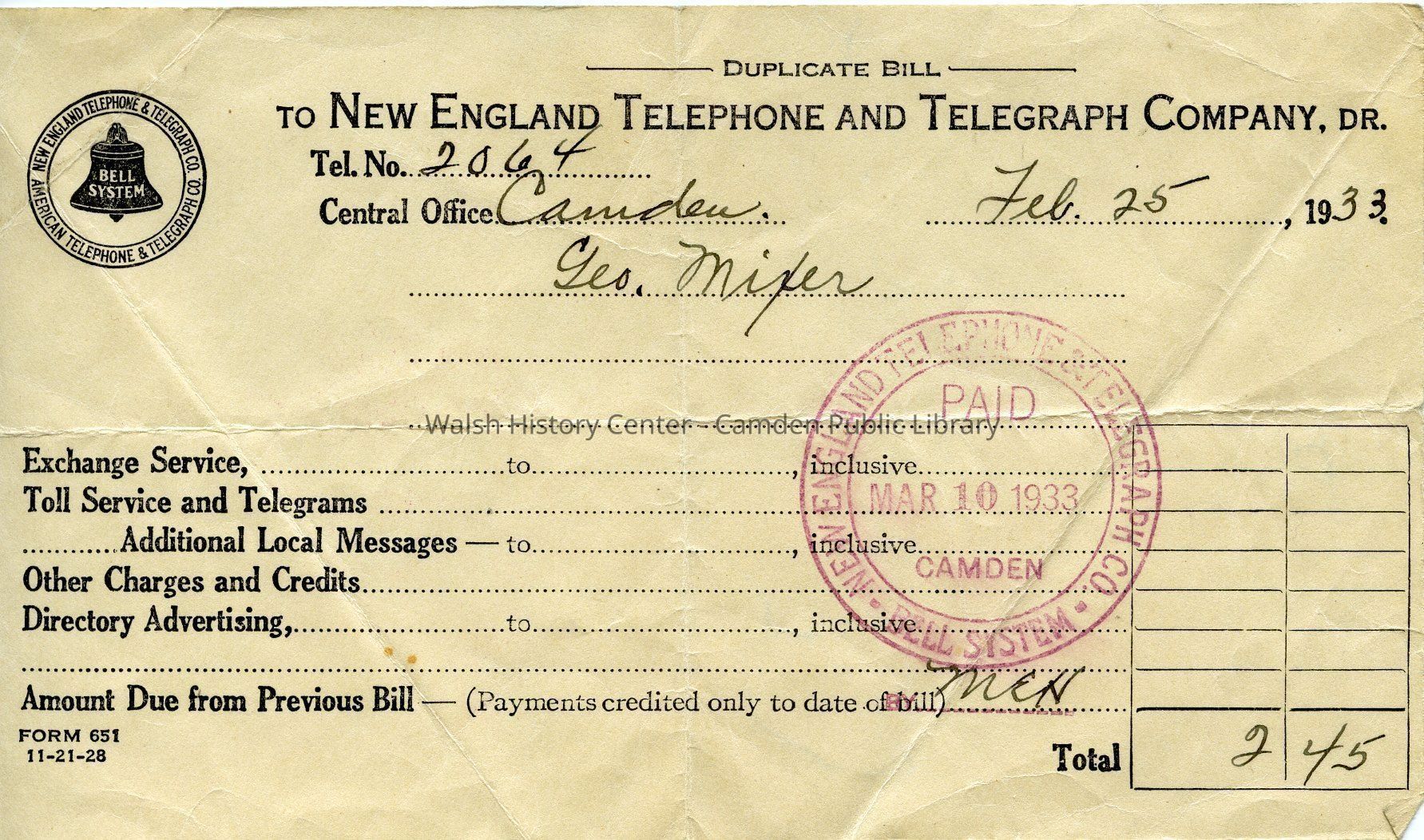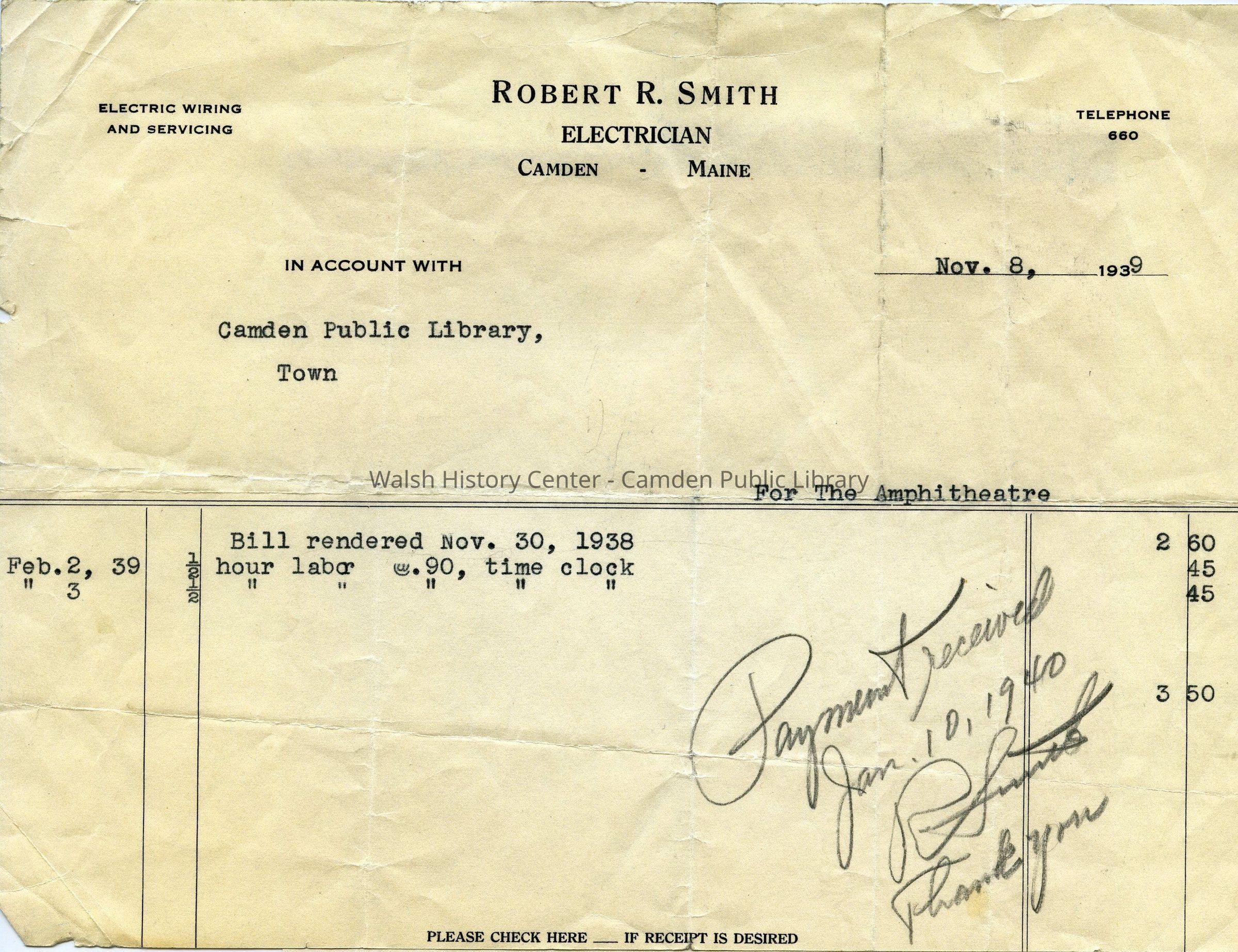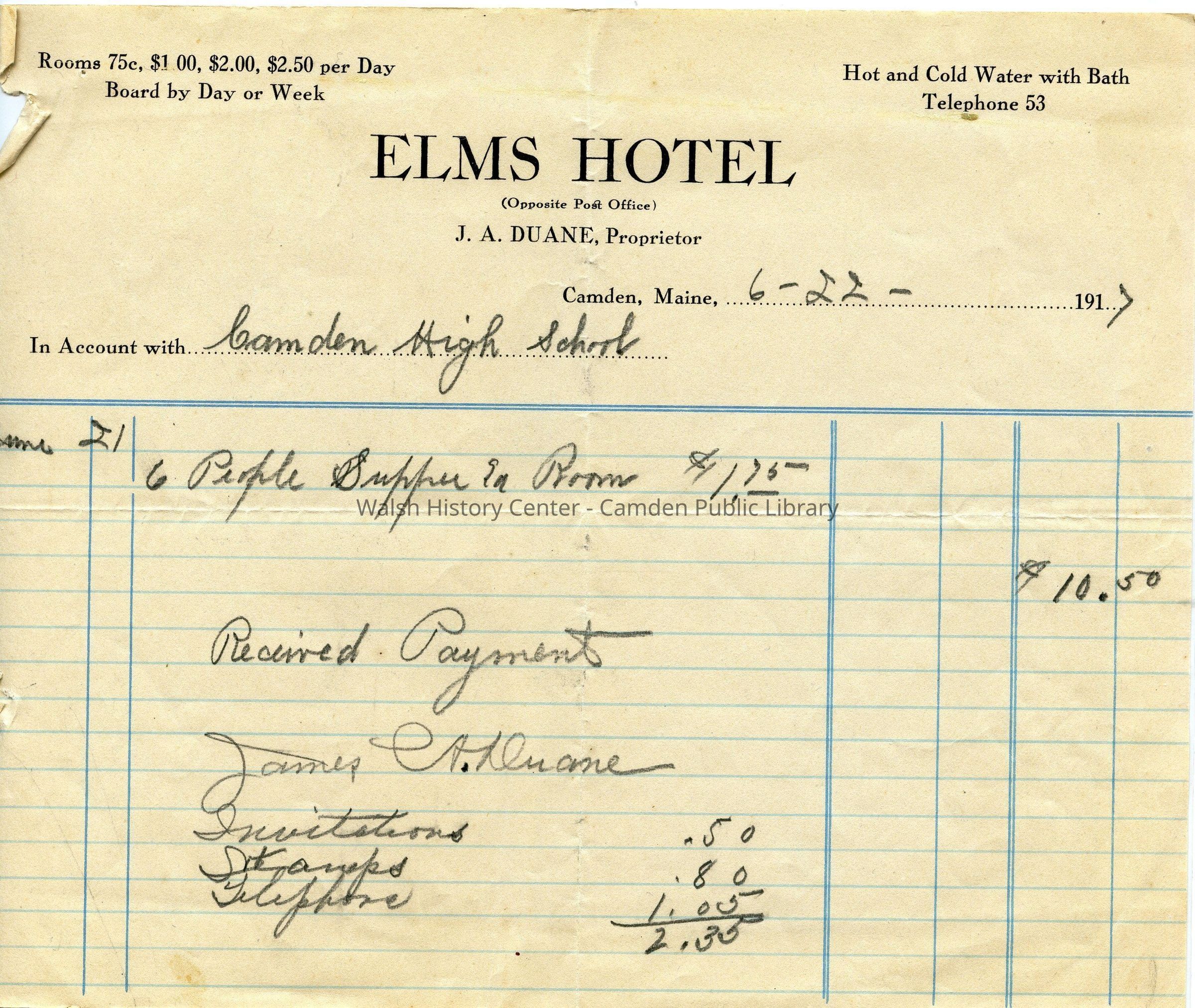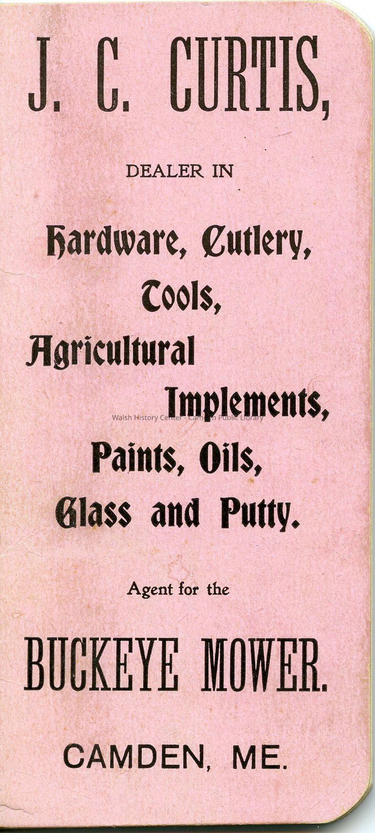 Contains billheads, stationery, bills, letterheads, and receipts from several Camden area businesses. These items date from the 1880's through the 1950's. Partial list of businesses represented: G.W. Achorn; Allen Insurance Agency; Ayers Market; Bay View House; Bay View Street Garage; Boynton's Pharmacy; Brown & Hobbs lumber; Brown's Market; Camden Anchor-Rockland Machine Co.; Camden & Rockland Water Company; Camden Farmer's Union; Camden Lumber Company; Camden Publishing Company; Camden Yacht Building and Railway Company; Carleton, Pascal & Co.; J.C. Curtis Hardware; Follansbee & Wood; Haskell & Corthell; J.H. Hobbs Company; Lenfest's Automotive Service; J.L. Locke; Maiden Cliff Rebekah Lodge; Maine Insane Hospital; The Megunticook Press; A.H. Parsons; Pendleton Dairy; S.G. Ritterbush, contractor; Rockland, Thomaston & Camden Street Railway; S.E. & H.L. Shepherd Company; TalbotCollection