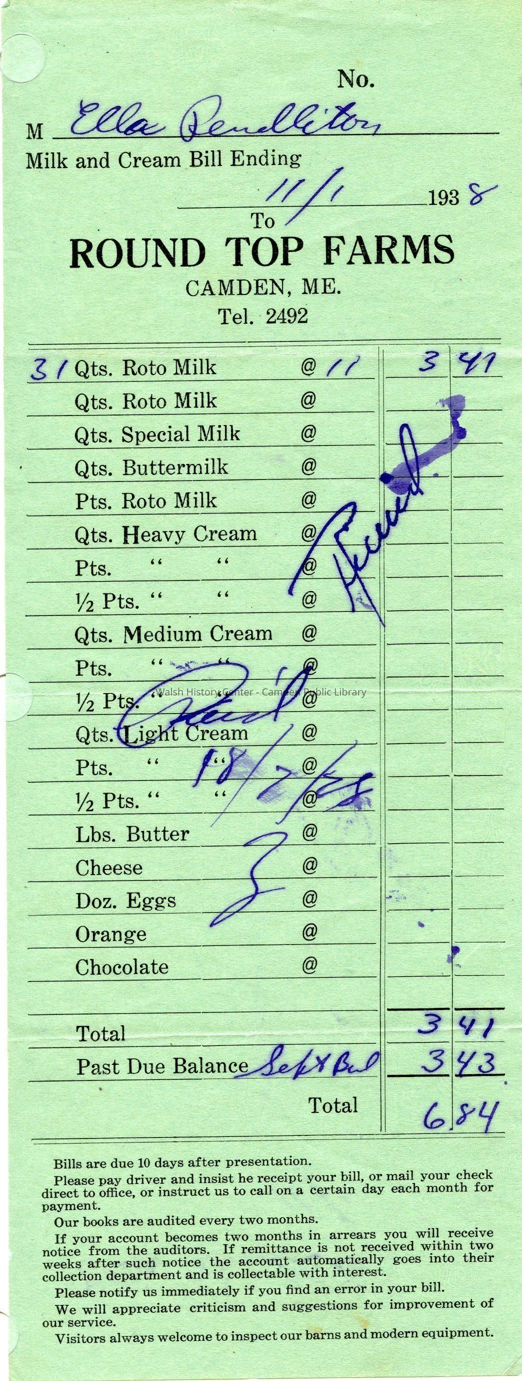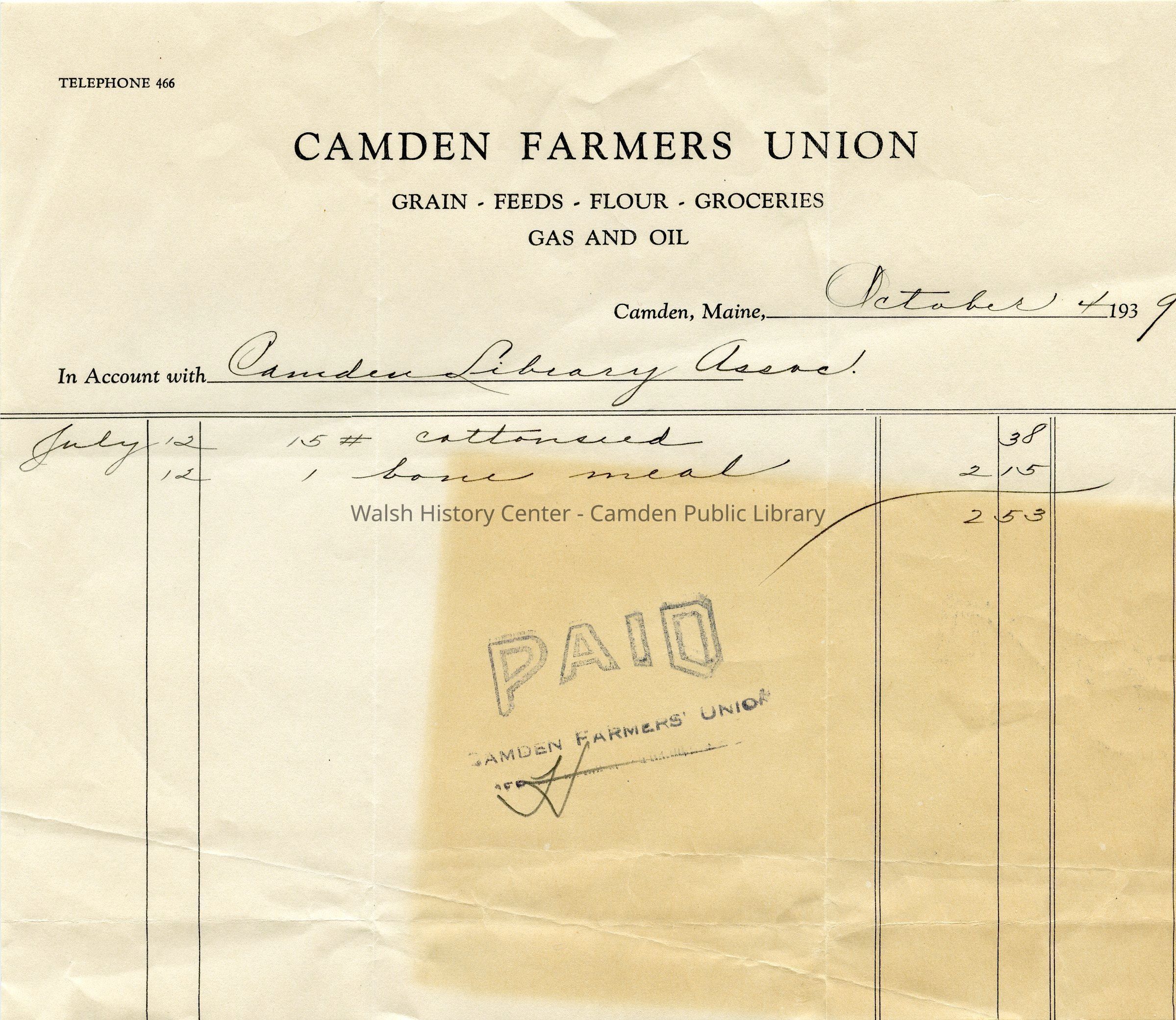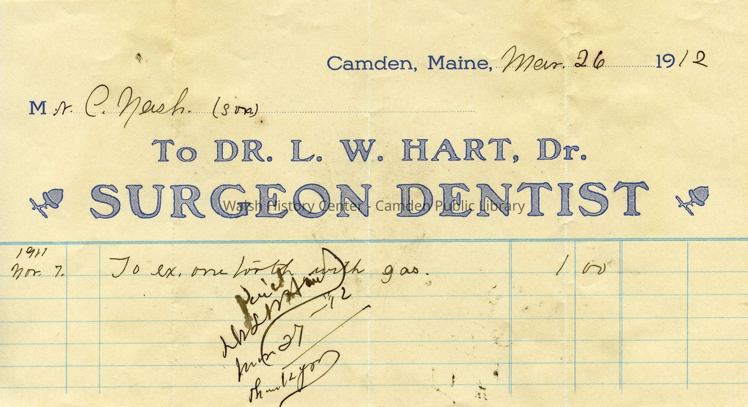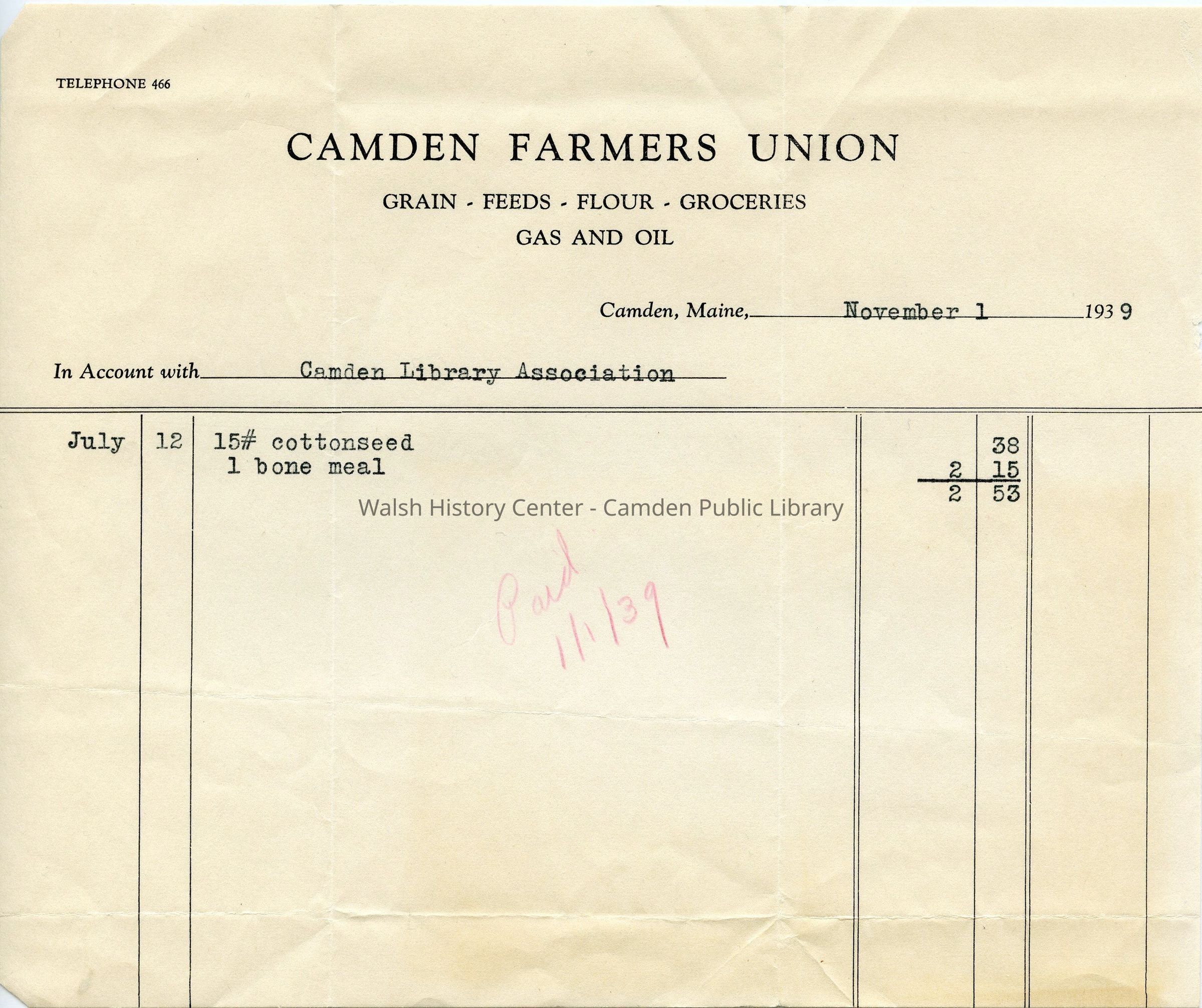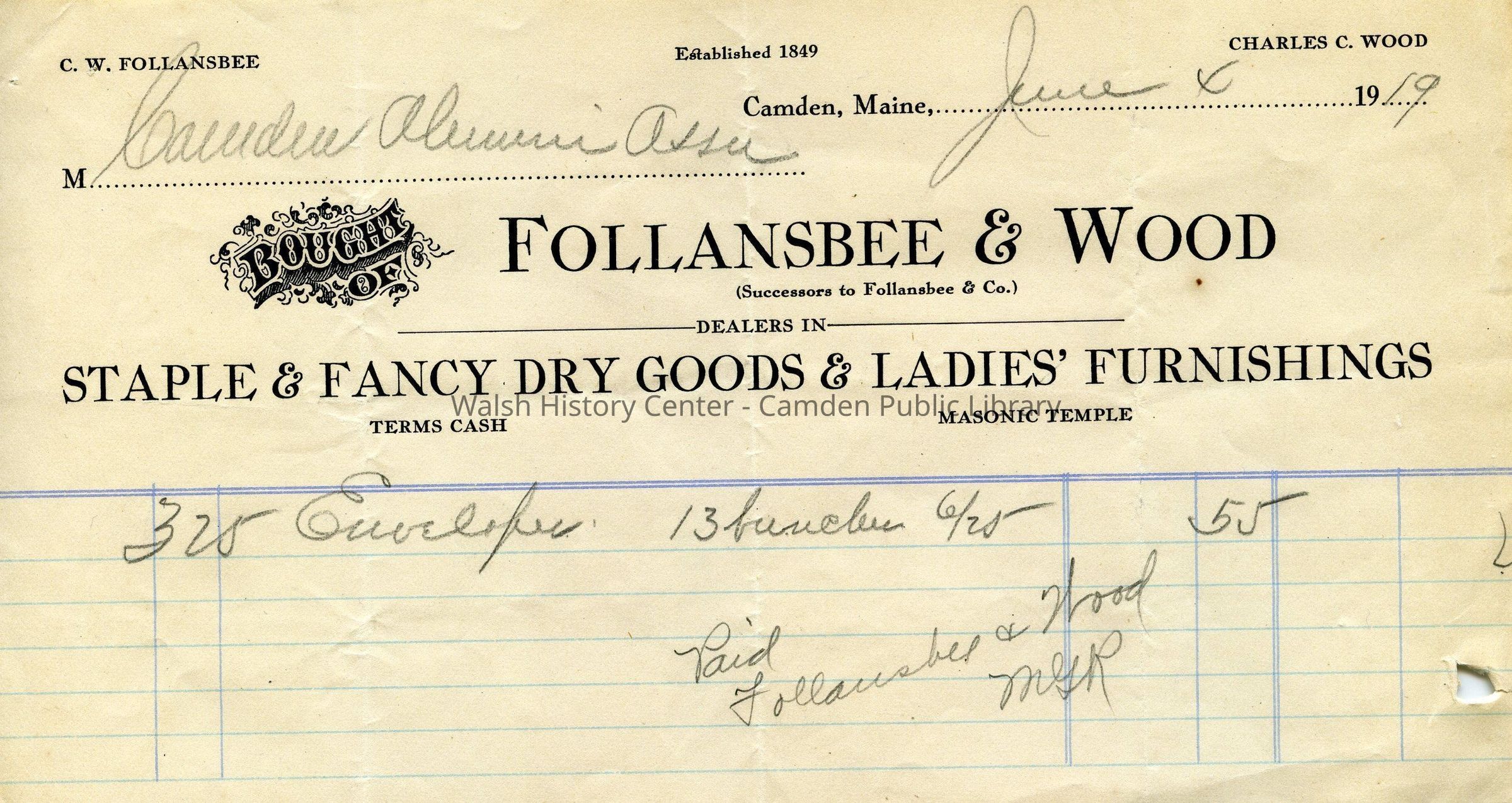 Contains billheads, stationery, bills, letterheads, and receipts from several Camden area businesses. These items date from the 1880's through the 1950's. Partial list of businesses represented: G.W. Achorn; Allen Insurance Agency; Ayers Market; Bay View House; Bay View Street Garage; Boynton's Pharmacy; Brown & Hobbs lumber; Brown's Market; Camden Anchor-Rockland Machine Co.; Camden & Rockland Water Company; Camden Farmer's Union; Camden Lumber Company; Camden Publishing Company; Camden Yacht Building and Railway Company; Carleton, Pascal & Co.; J.C. Curtis Hardware; Follansbee & Wood; Haskell & Corthell; J.H. Hobbs Company; Lenfest's Automotive Service; J.L. Locke; Maiden Cliff Rebekah Lodge; Maine Insane Hospital; The Megunticook Press; A.H. Parsons; Pendleton Dairy; S.G. Ritterbush, contractor; Rockland, Thomaston & Camden Street Railway; S.E. & H.L. Shepherd Company; TalbotCollection