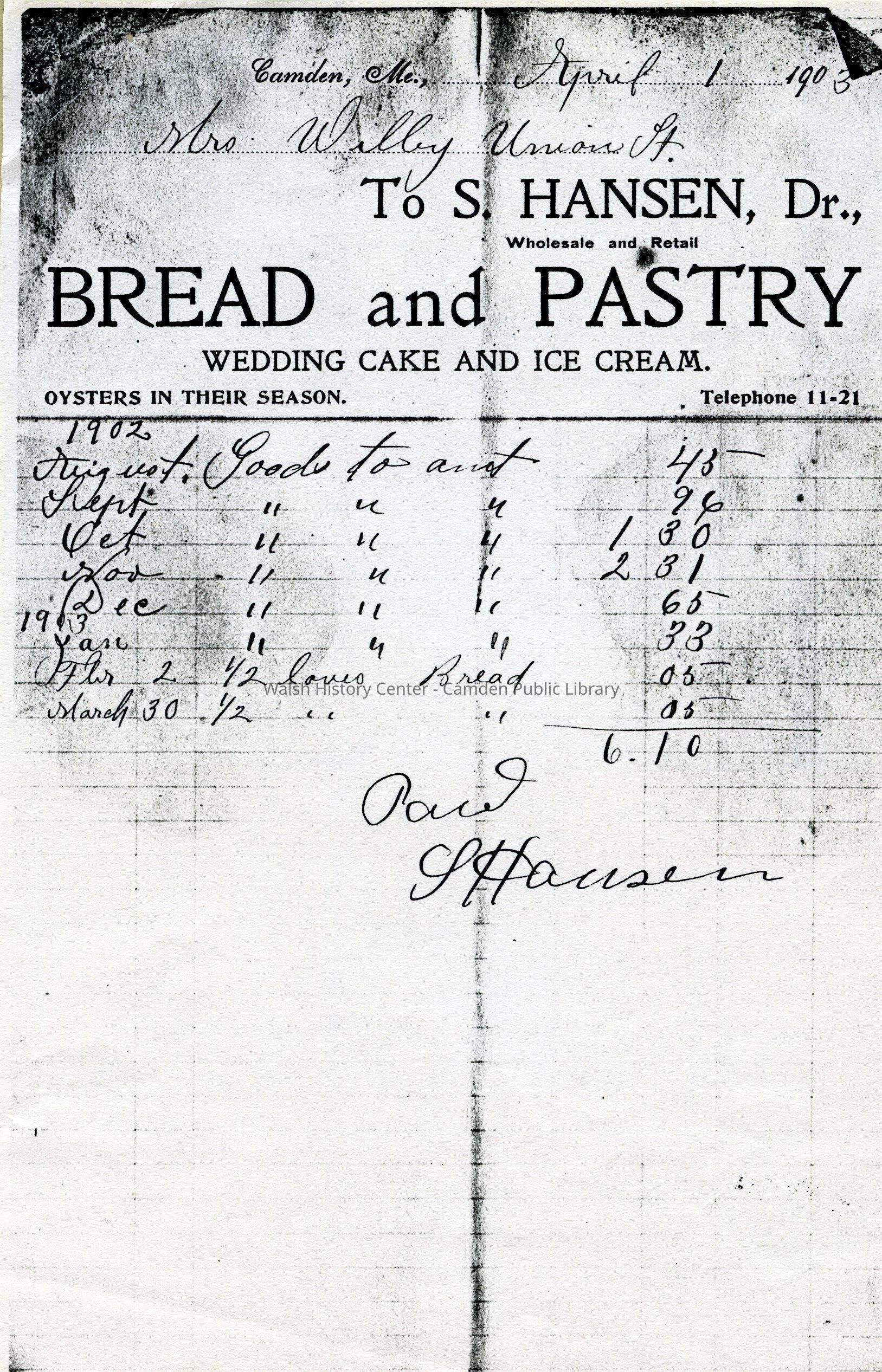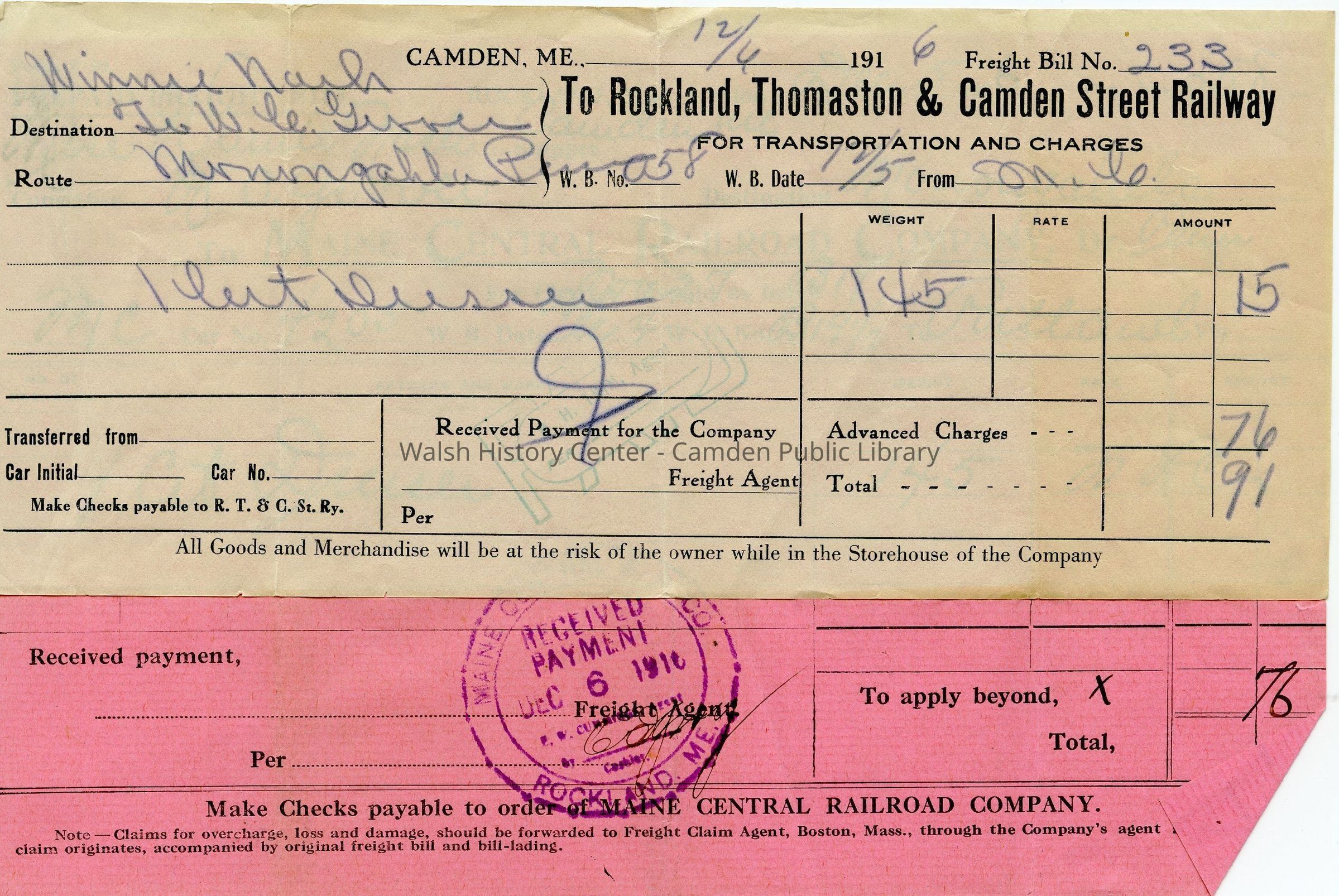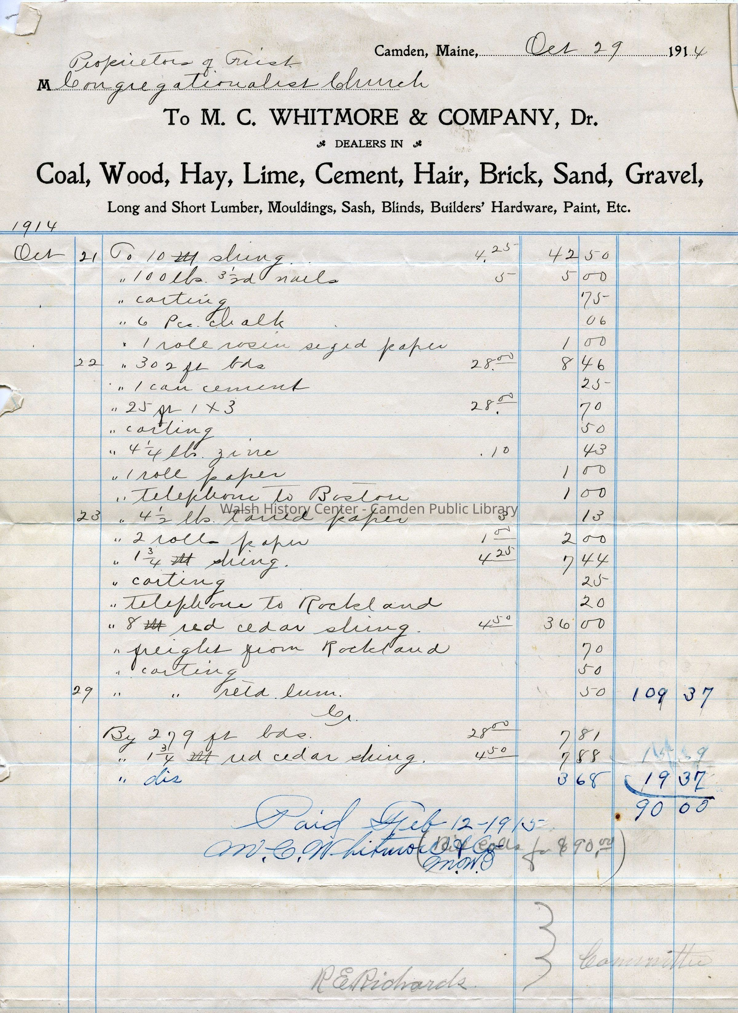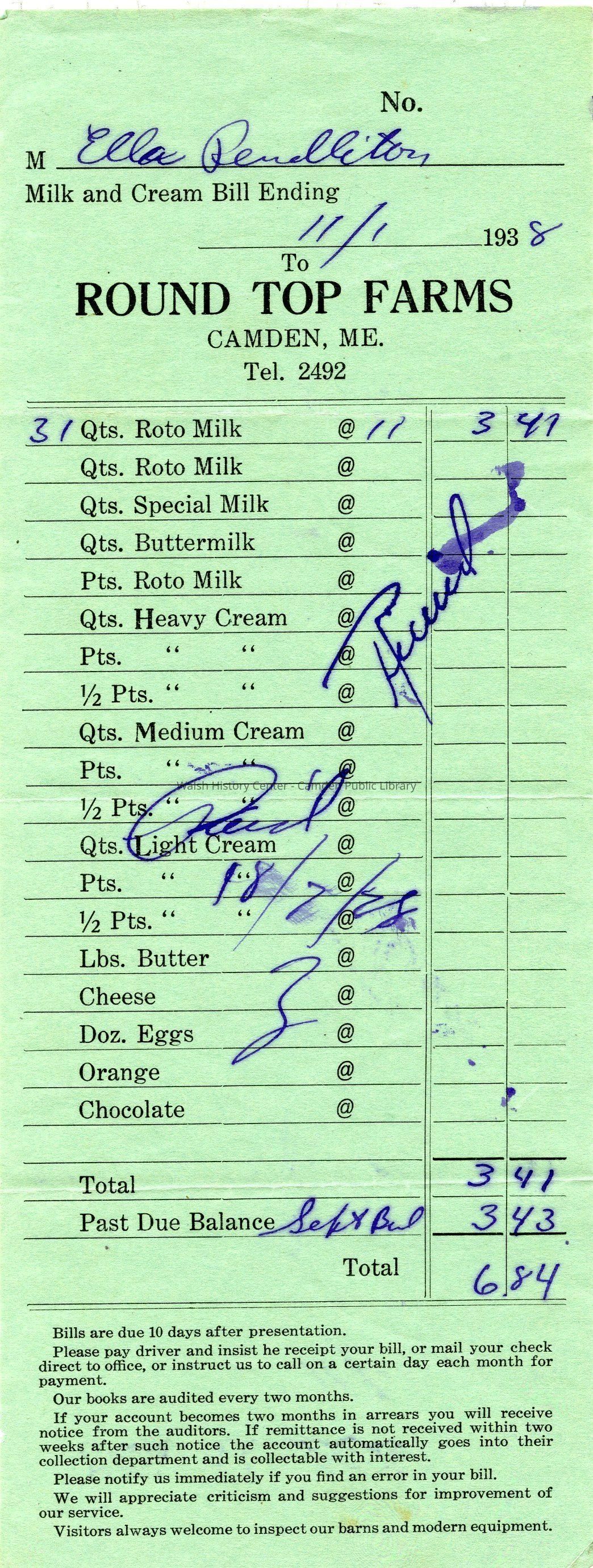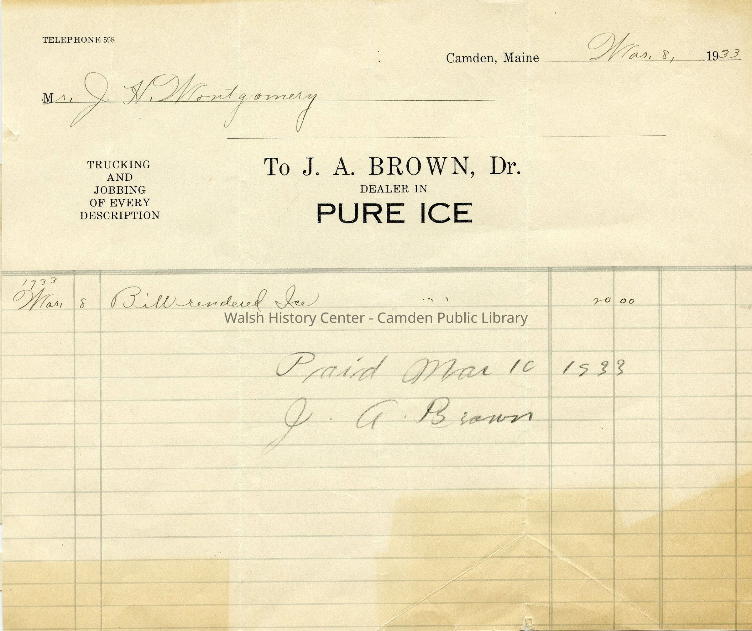 Contains billheads, stationery, bills, letterheads, and receipts from several Camden area businesses. These items date from the 1880's through the 1950's. Partial list of businesses represented: G.W. Achorn; Allen Insurance Agency; Ayers Market; Bay View House; Bay View Street Garage; Boynton's Pharmacy; Brown & Hobbs lumber; Brown's Market; Camden Anchor-Rockland Machine Co.; Camden & Rockland Water Company; Camden Farmer's Union; Camden Lumber Company; Camden Publishing Company; Camden Yacht Building and Railway Company; Carleton, Pascal & Co.; J.C. Curtis Hardware; Follansbee & Wood; Haskell & Corthell; J.H. Hobbs Company; Lenfest's Automotive Service; J.L. Locke; Maiden Cliff Rebekah Lodge; Maine Insane Hospital; The Megunticook Press; A.H. Parsons; Pendleton Dairy; S.G. Ritterbush, contractor; Rockland, Thomaston & Camden Street Railway; S.E. & H.L. Shepherd Company; TalbotCollection