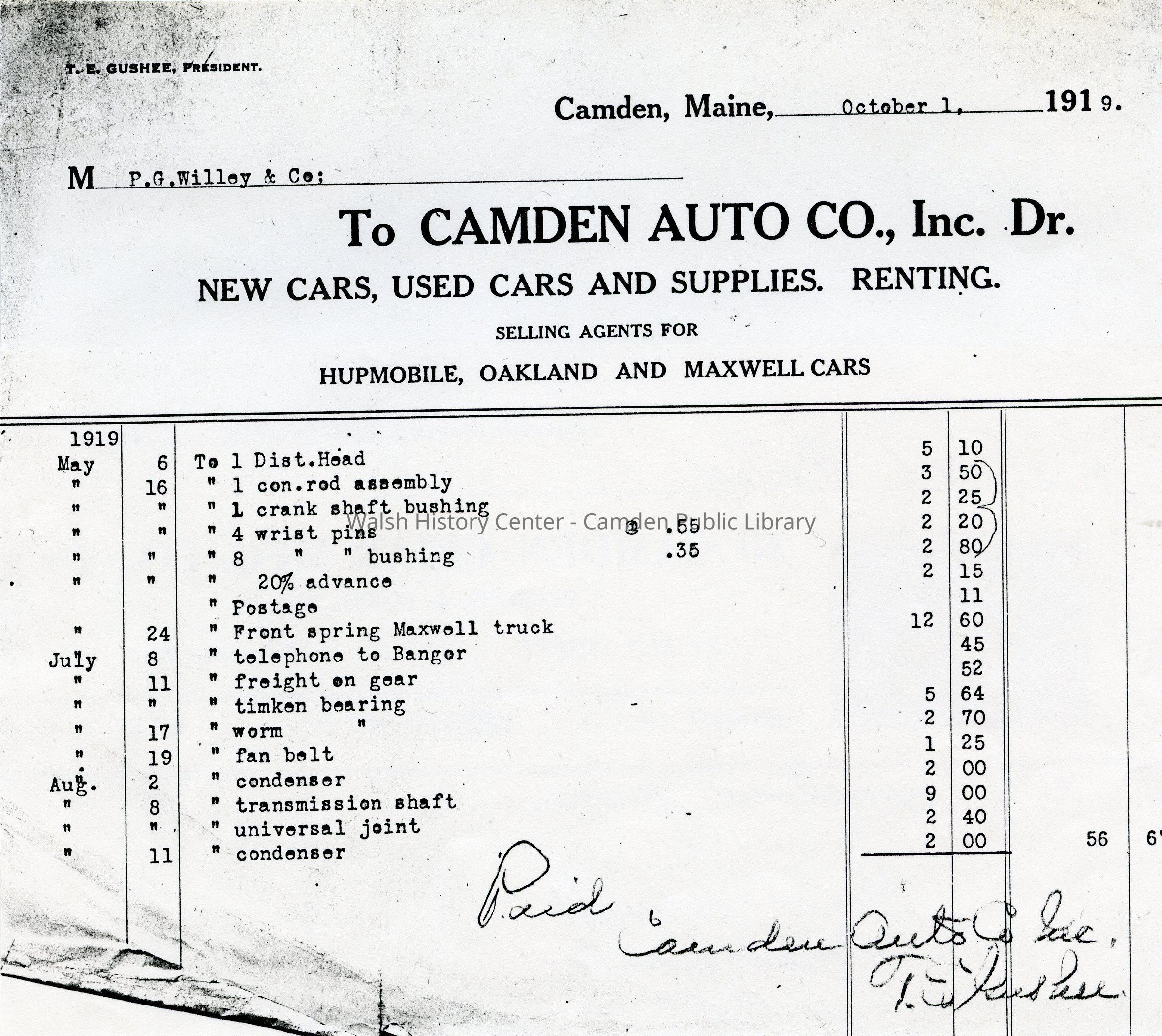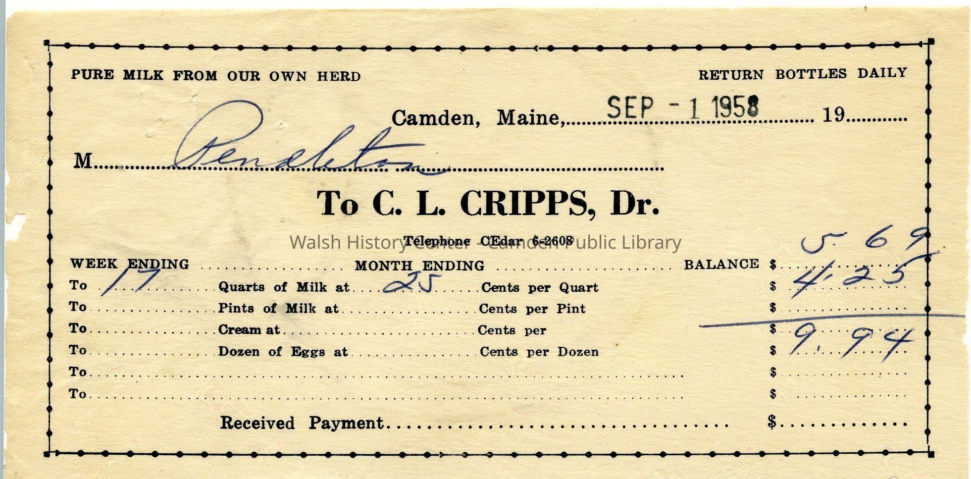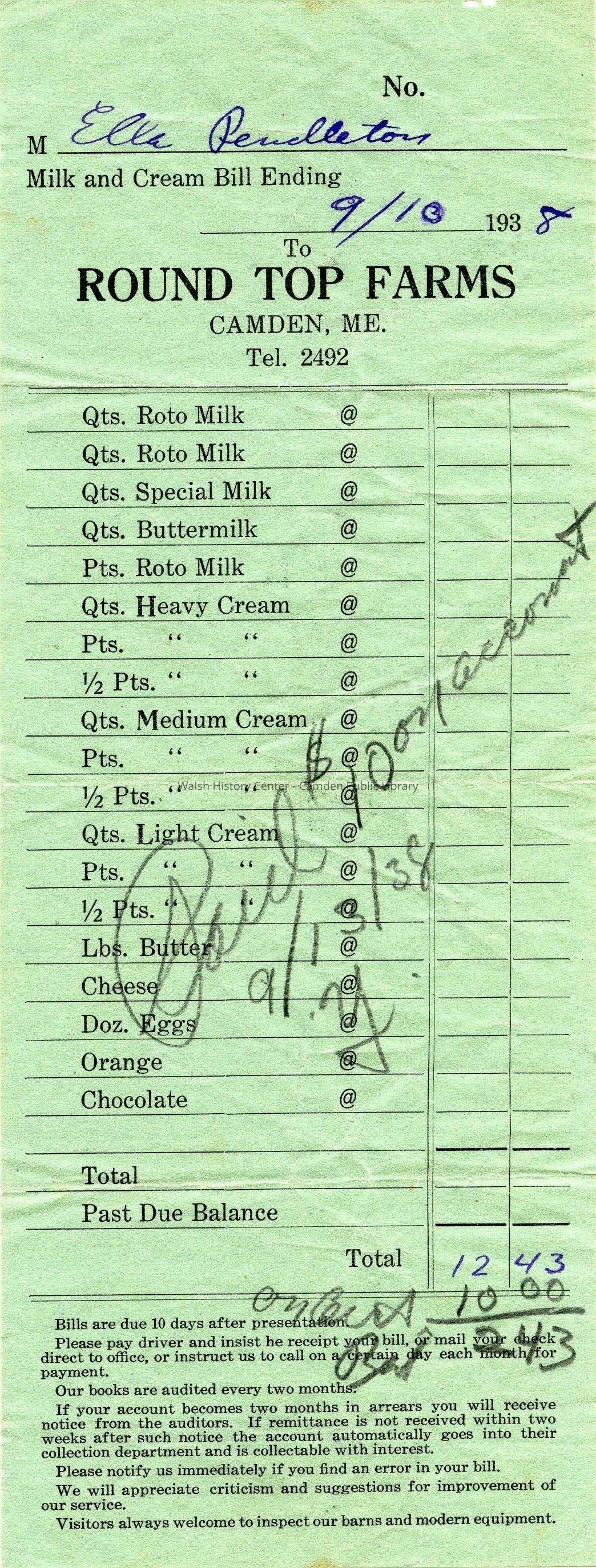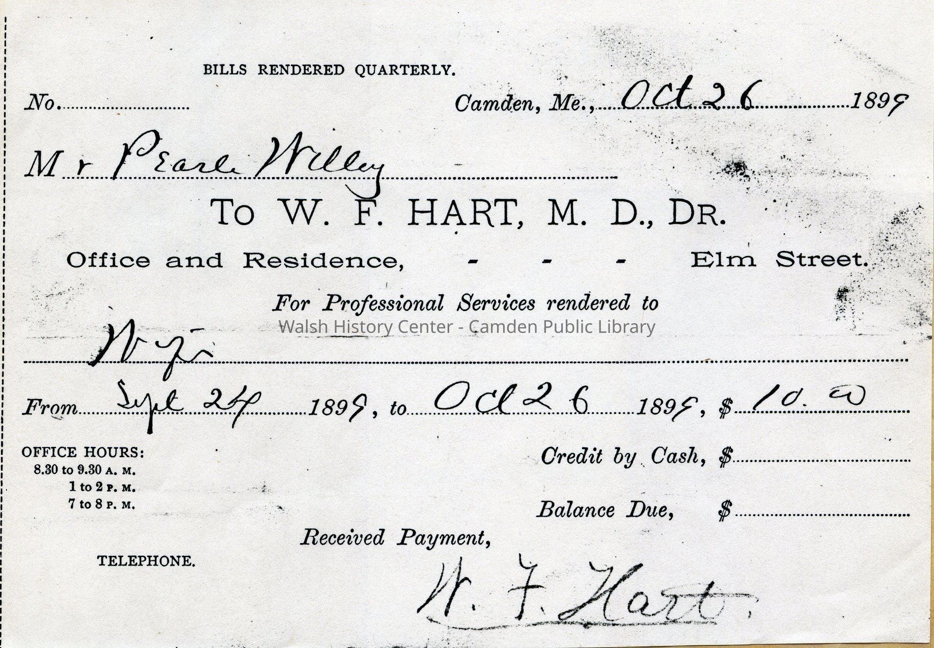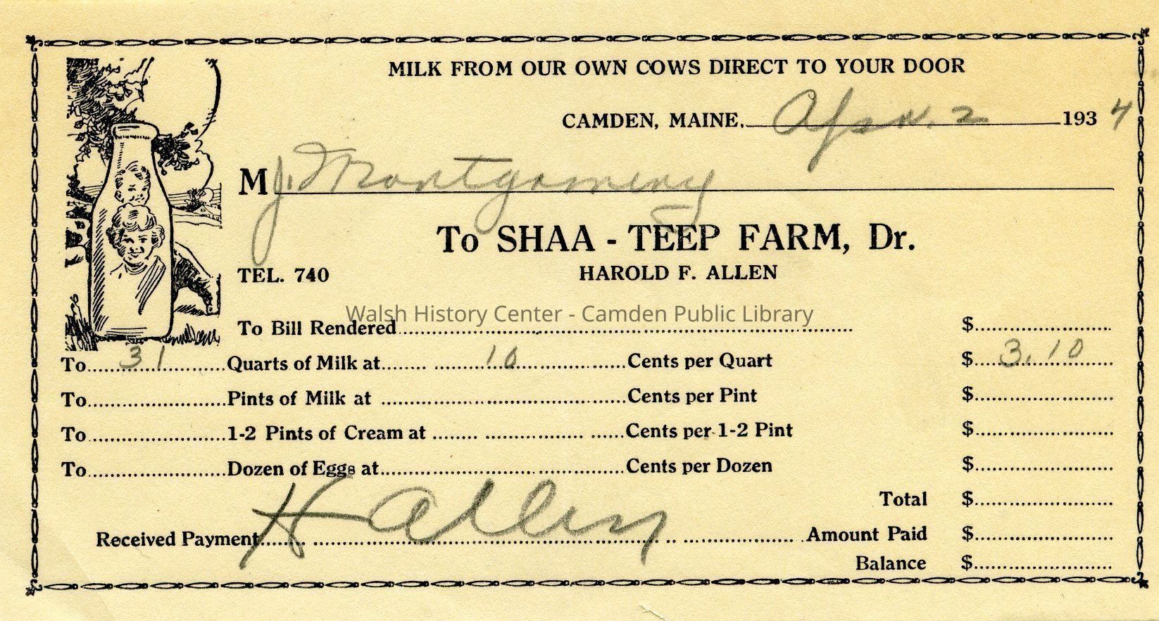 Contains billheads, stationery, bills, letterheads, and receipts from several Camden area businesses. These items date from the 1880's through the 1950's. Partial list of businesses represented: G.W. Achorn; Allen Insurance Agency; Ayers Market; Bay View House; Bay View Street Garage; Boynton's Pharmacy; Brown & Hobbs lumber; Brown's Market; Camden Anchor-Rockland Machine Co.; Camden & Rockland Water Company; Camden Farmer's Union; Camden Lumber Company; Camden Publishing Company; Camden Yacht Building and Railway Company; Carleton, Pascal & Co.; J.C. Curtis Hardware; Follansbee & Wood; Haskell & Corthell; J.H. Hobbs Company; Lenfest's Automotive Service; J.L. Locke; Maiden Cliff Rebekah Lodge; Maine Insane Hospital; The Megunticook Press; A.H. Parsons; Pendleton Dairy; S.G. Ritterbush, contractor; Rockland, Thomaston & Camden Street Railway; S.E. & H.L. Shepherd Company; TalbotCollection