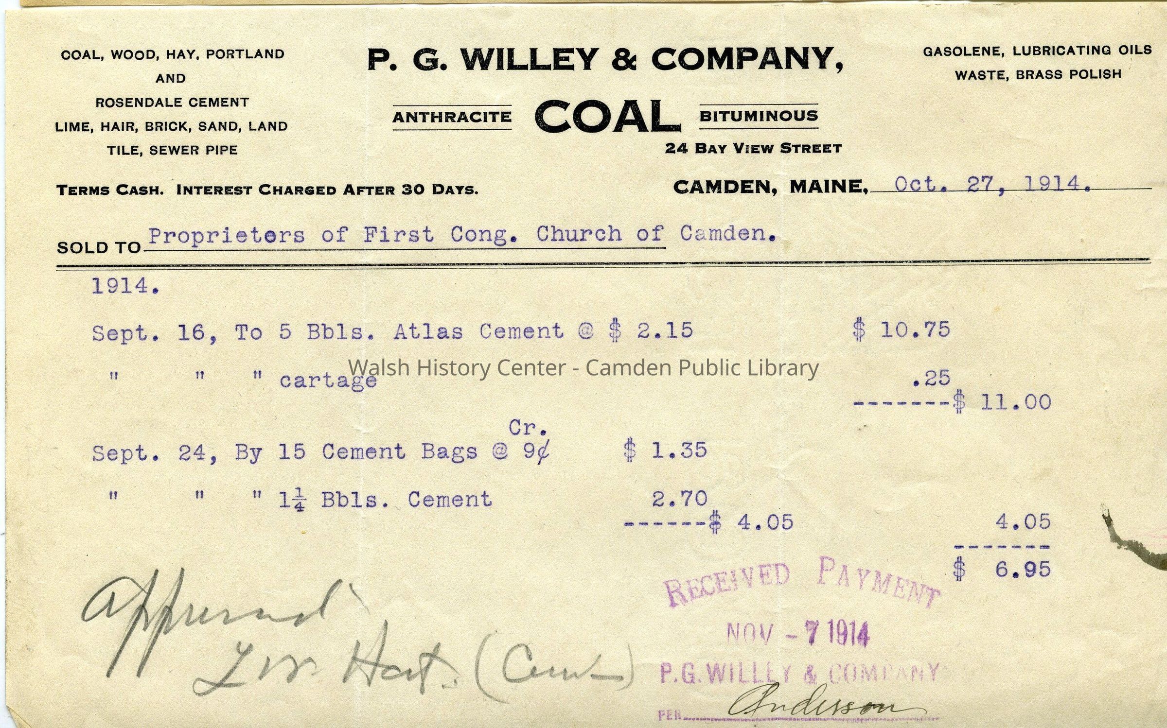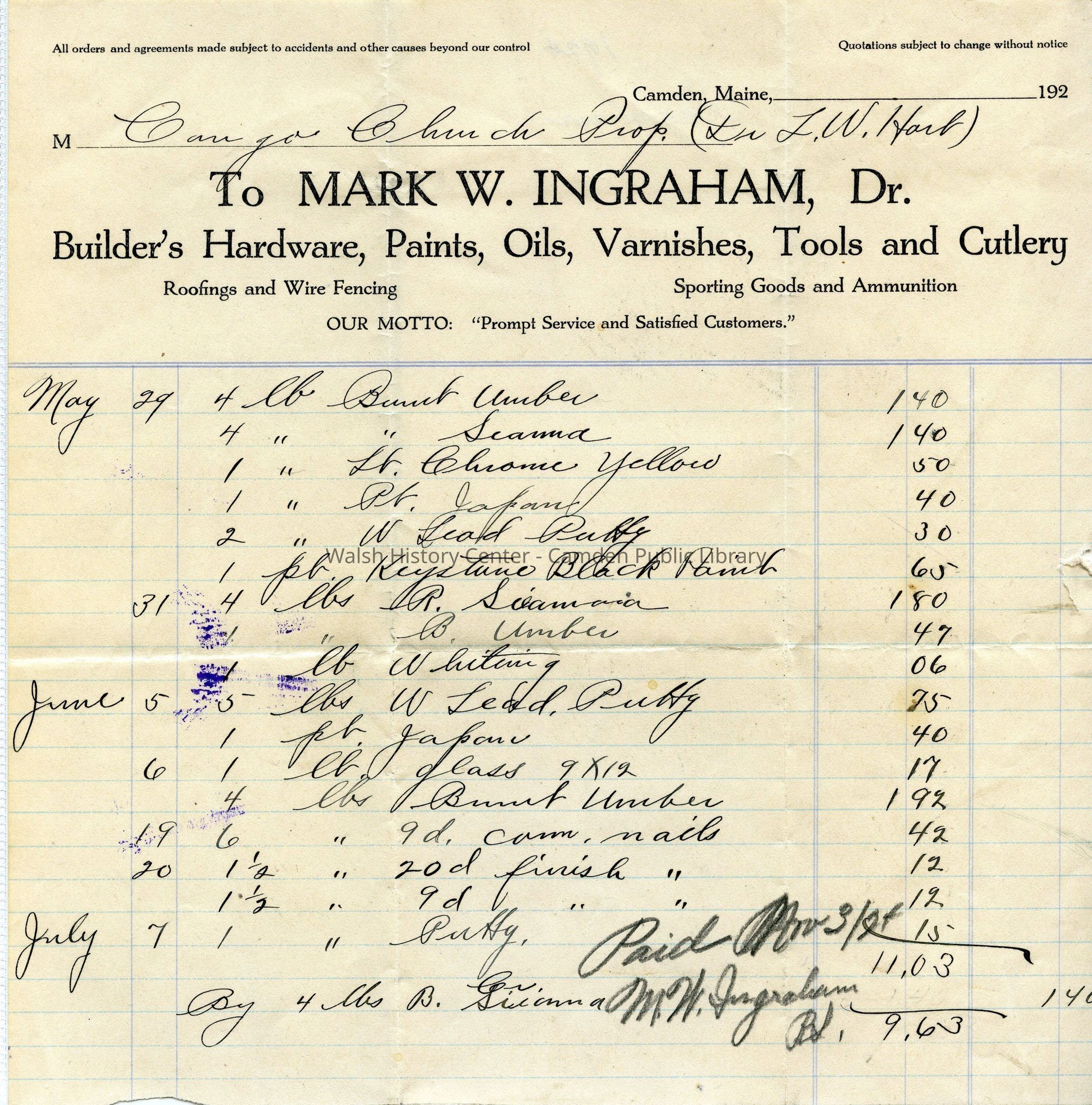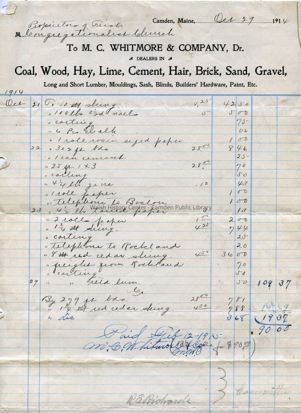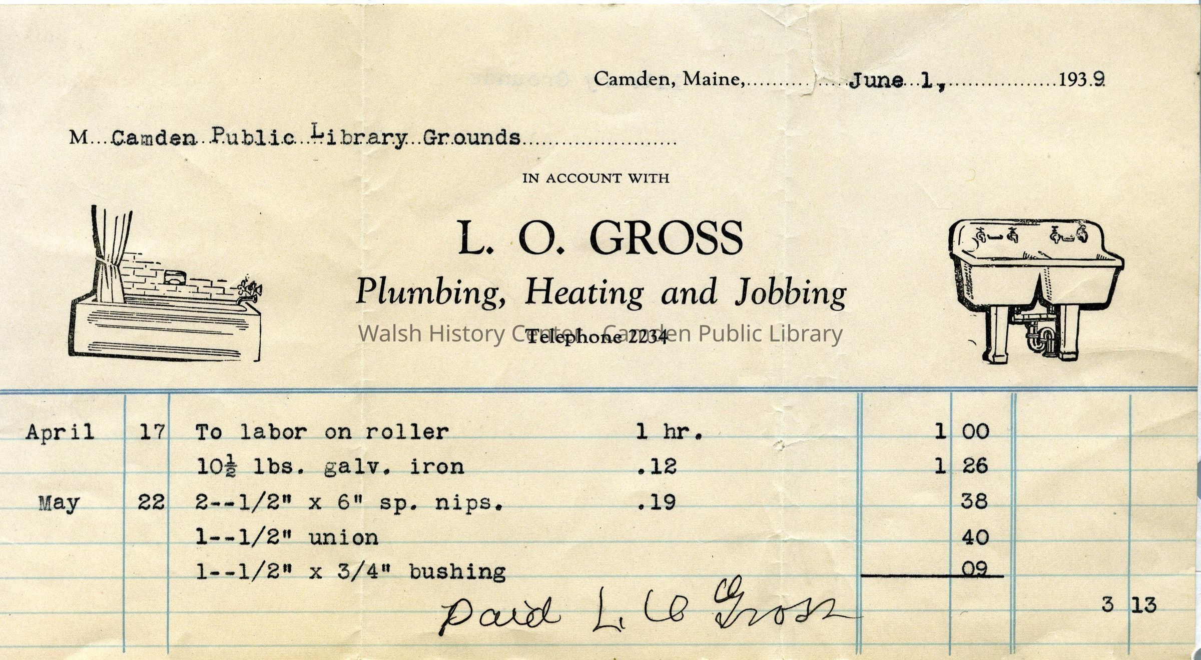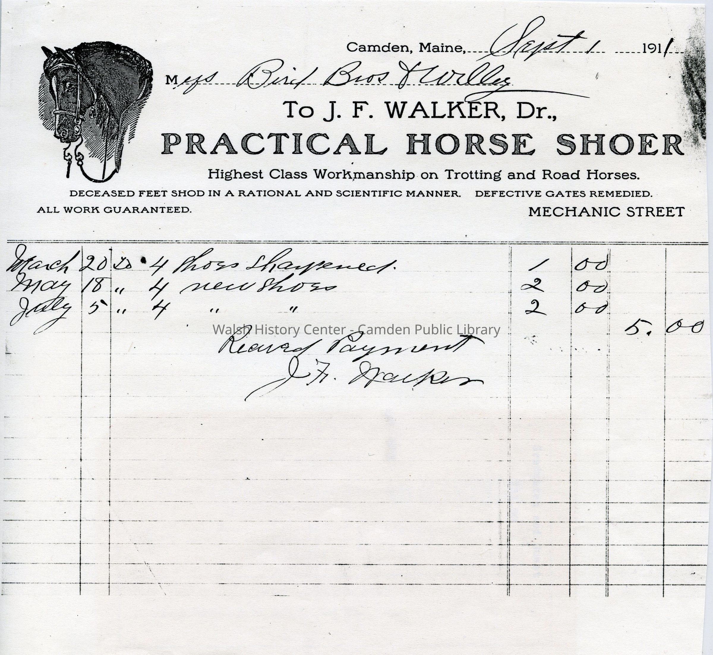 Contains billheads, stationery, bills, letterheads, and receipts from several Camden area businesses. These items date from the 1880's through the 1950's. Partial list of businesses represented: G.W. Achorn; Allen Insurance Agency; Ayers Market; Bay View House; Bay View Street Garage; Boynton's Pharmacy; Brown & Hobbs lumber; Brown's Market; Camden Anchor-Rockland Machine Co.; Camden & Rockland Water Company; Camden Farmer's Union; Camden Lumber Company; Camden Publishing Company; Camden Yacht Building and Railway Company; Carleton, Pascal & Co.; J.C. Curtis Hardware; Follansbee & Wood; Haskell & Corthell; J.H. Hobbs Company; Lenfest's Automotive Service; J.L. Locke; Maiden Cliff Rebekah Lodge; Maine Insane Hospital; The Megunticook Press; A.H. Parsons; Pendleton Dairy; S.G. Ritterbush, contractor; Rockland, Thomaston & Camden Street Railway; S.E. & H.L. Shepherd Company; TalbotCollection