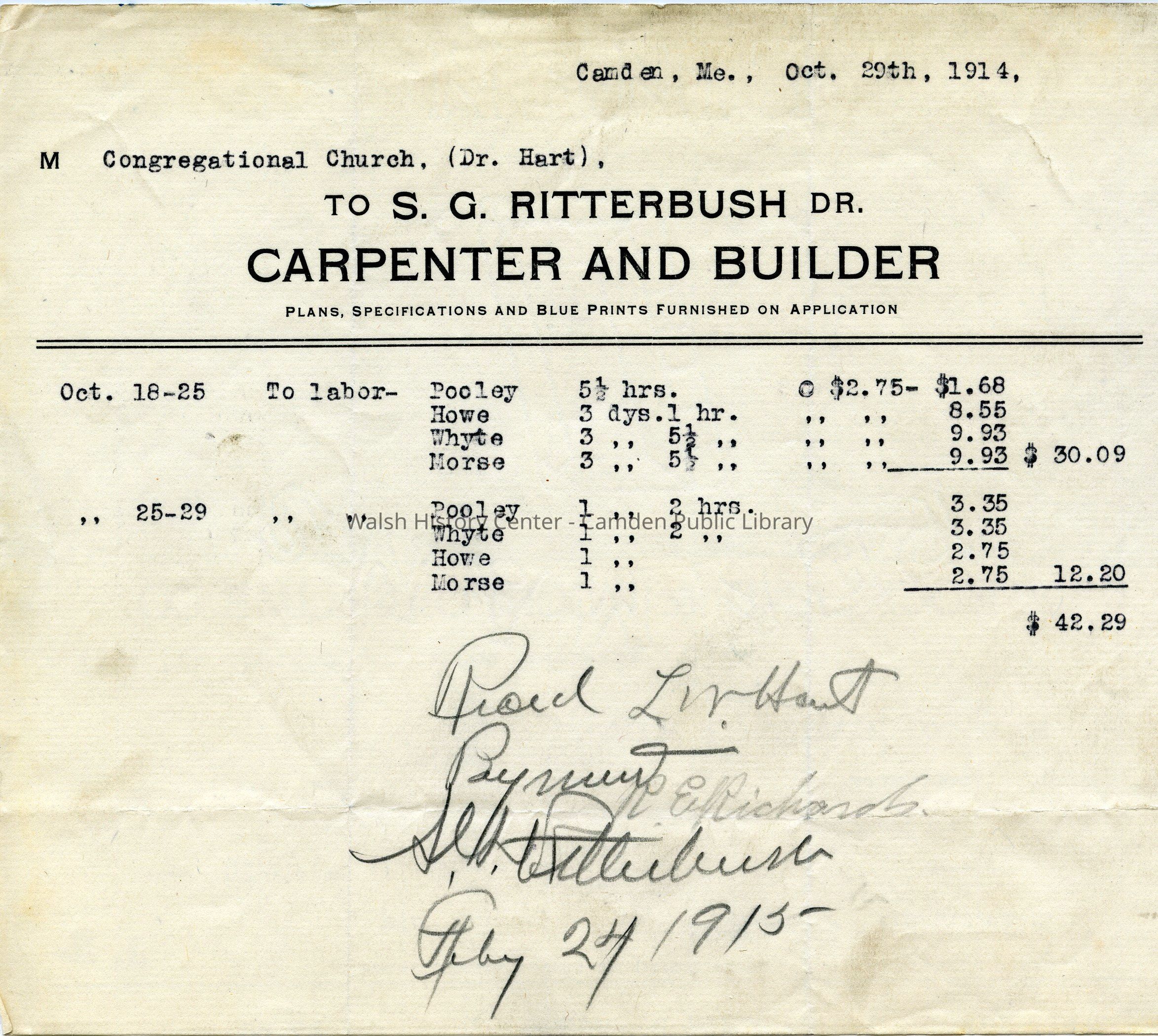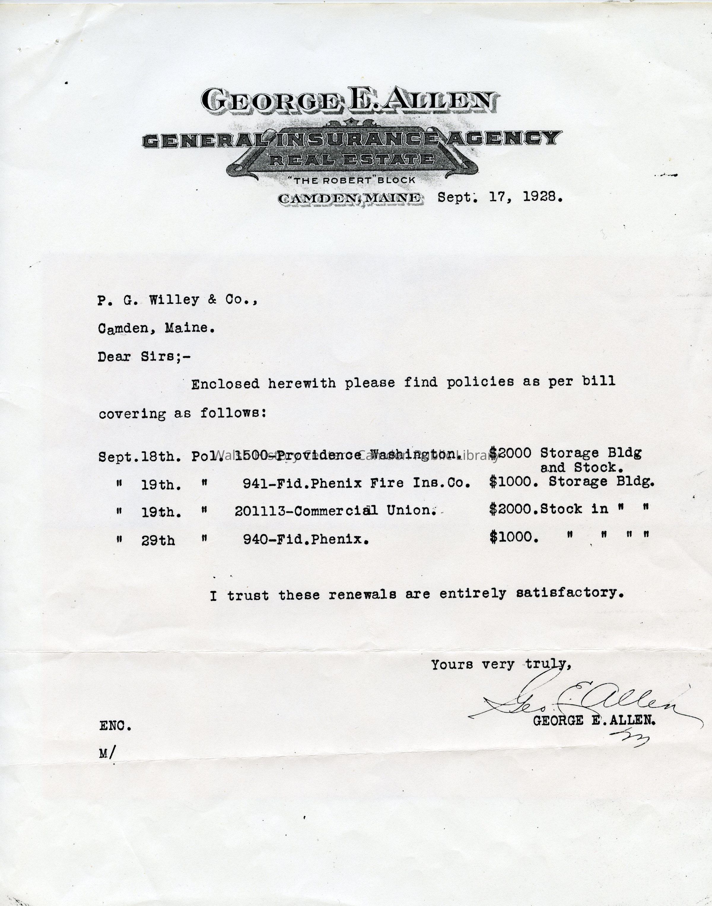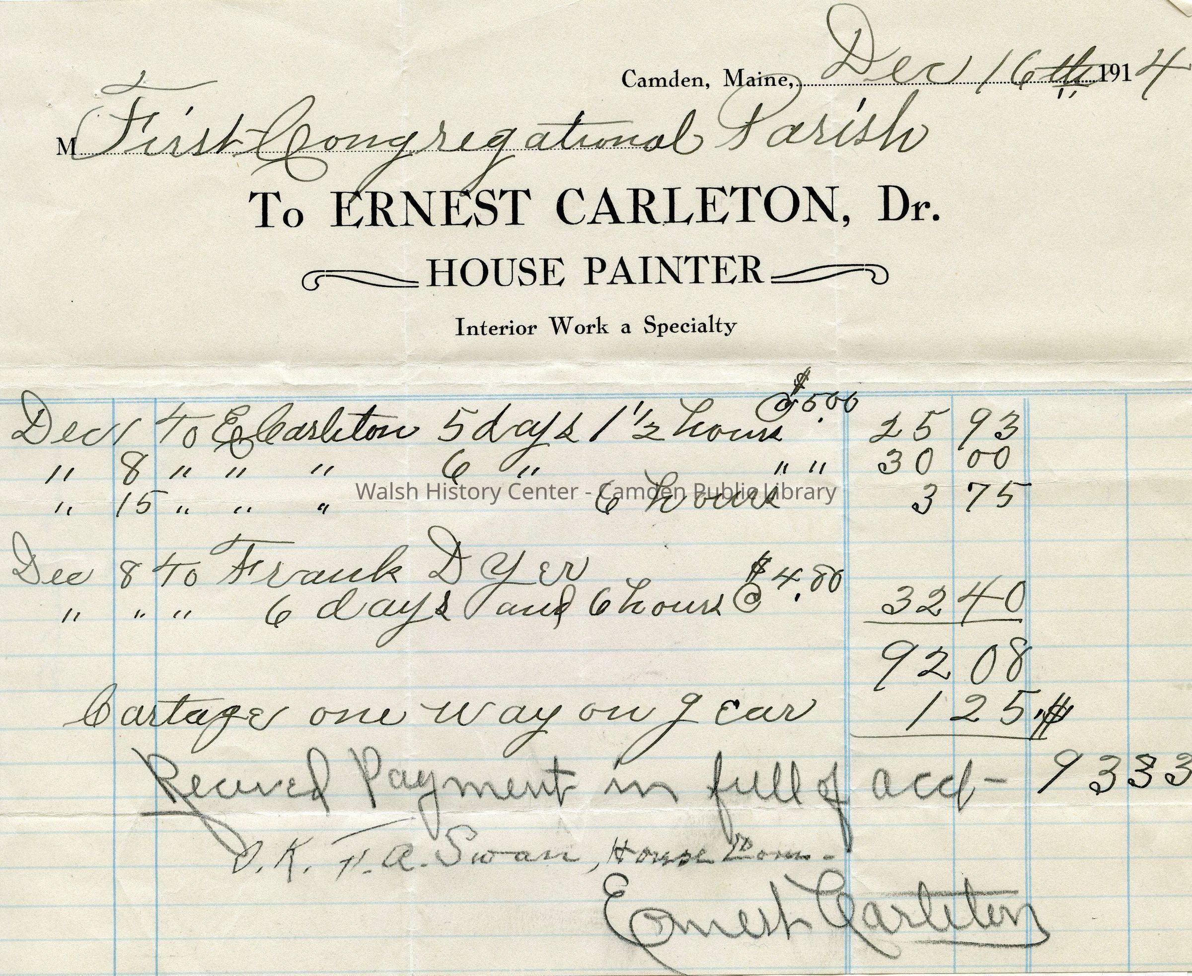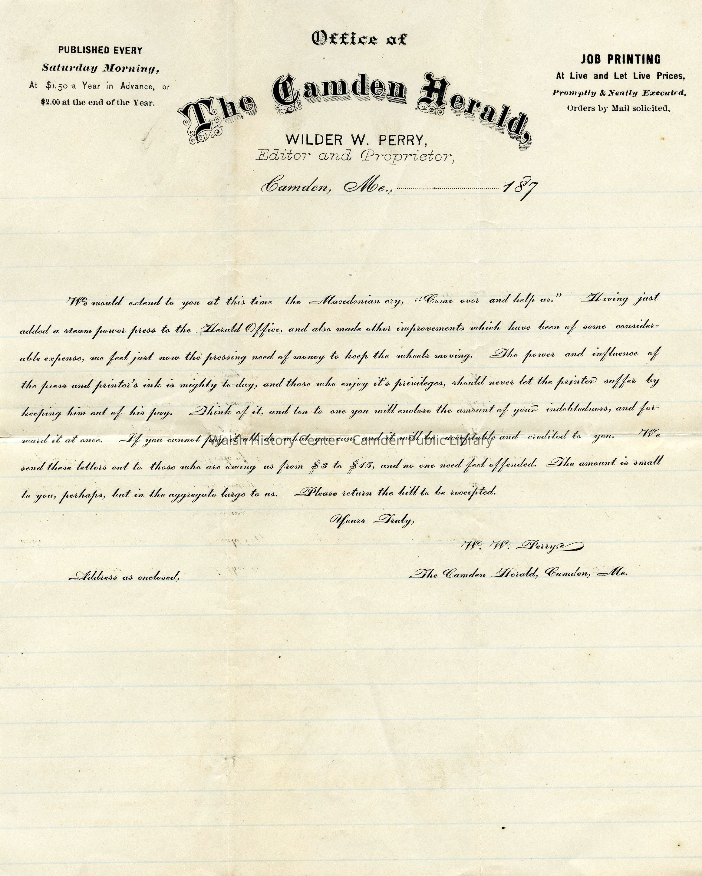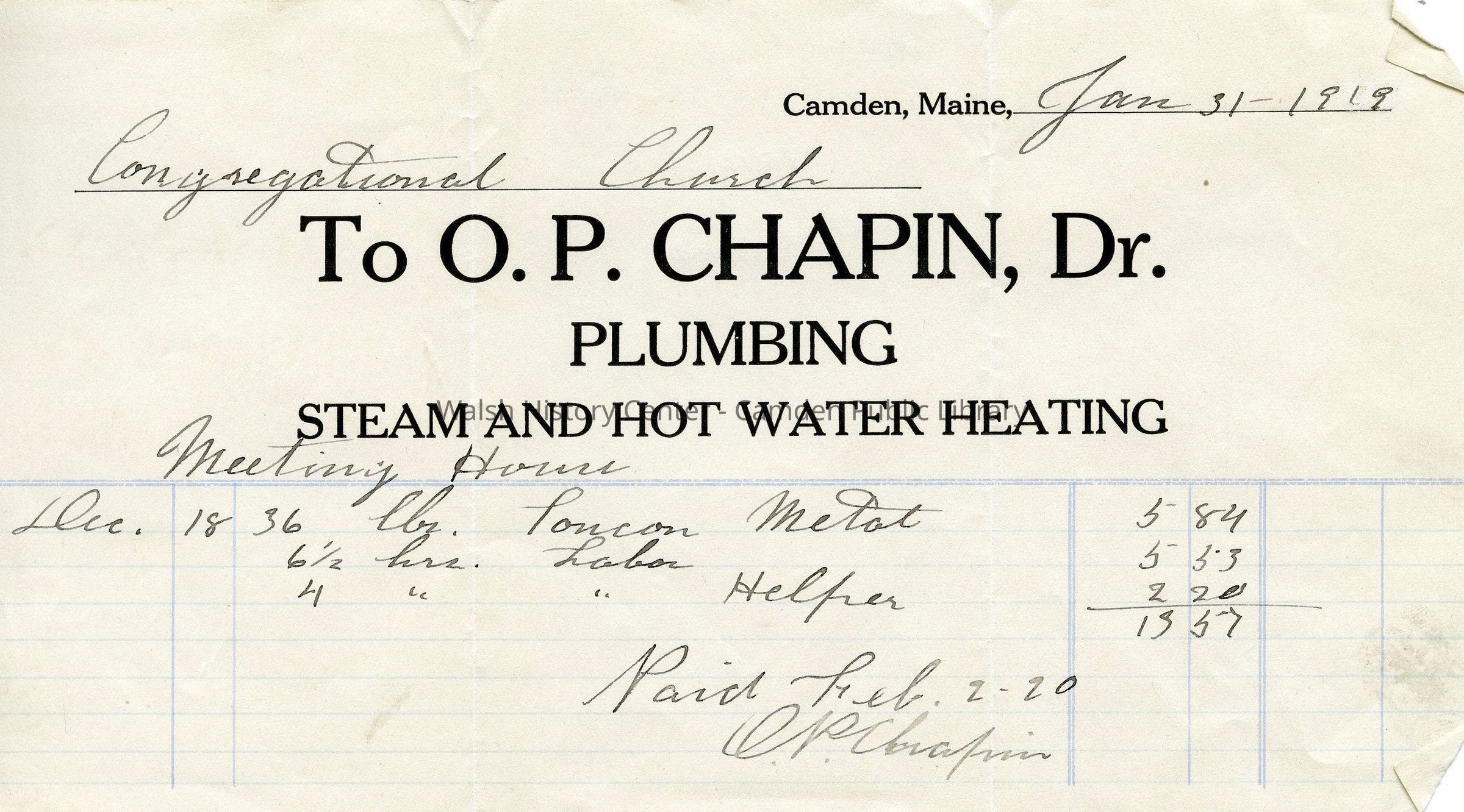 Contains billheads, stationery, bills, letterheads, and receipts from several Camden area businesses. These items date from the 1880's through the 1950's. Partial list of businesses represented: G.W. Achorn; Allen Insurance Agency; Ayers Market; Bay View House; Bay View Street Garage; Boynton's Pharmacy; Brown & Hobbs lumber; Brown's Market; Camden Anchor-Rockland Machine Co.; Camden & Rockland Water Company; Camden Farmer's Union; Camden Lumber Company; Camden Publishing Company; Camden Yacht Building and Railway Company; Carleton, Pascal & Co.; J.C. Curtis Hardware; Follansbee & Wood; Haskell & Corthell; J.H. Hobbs Company; Lenfest's Automotive Service; J.L. Locke; Maiden Cliff Rebekah Lodge; Maine Insane Hospital; The Megunticook Press; A.H. Parsons; Pendleton Dairy; S.G. Ritterbush, contractor; Rockland, Thomaston & Camden Street Railway; S.E. & H.L. Shepherd Company; TalbotCollection