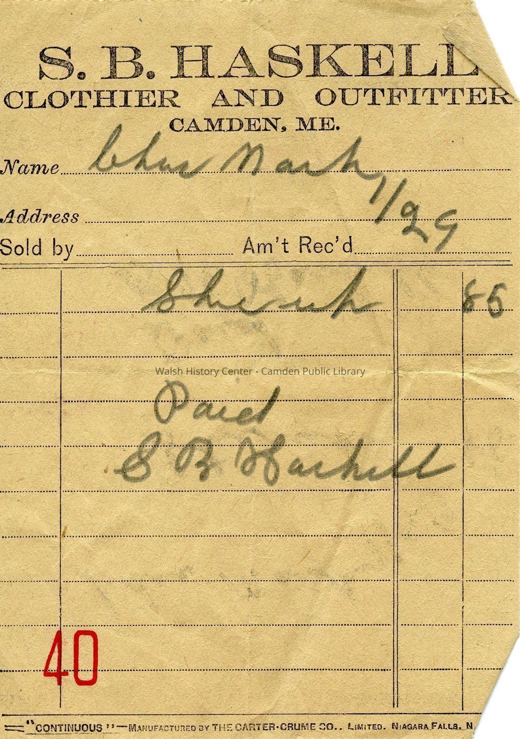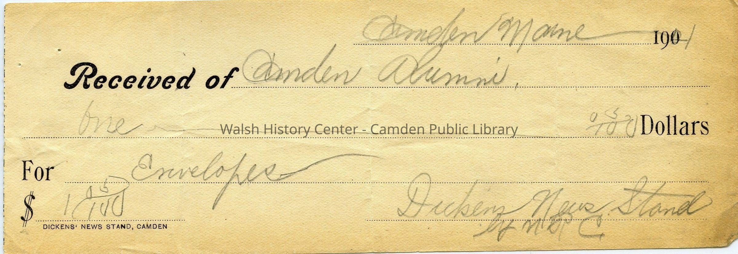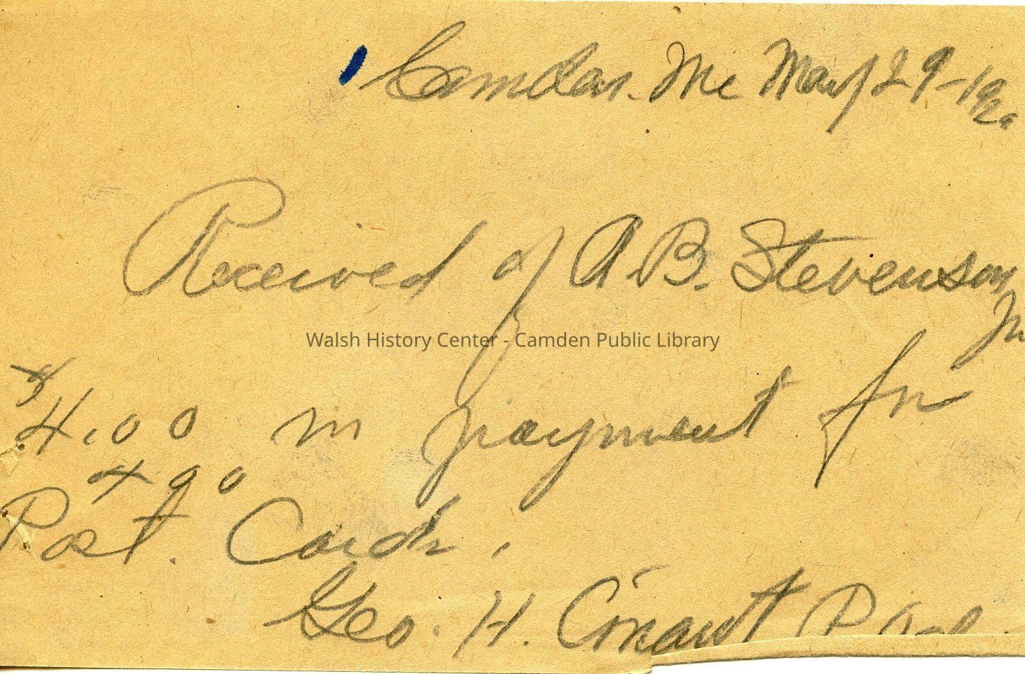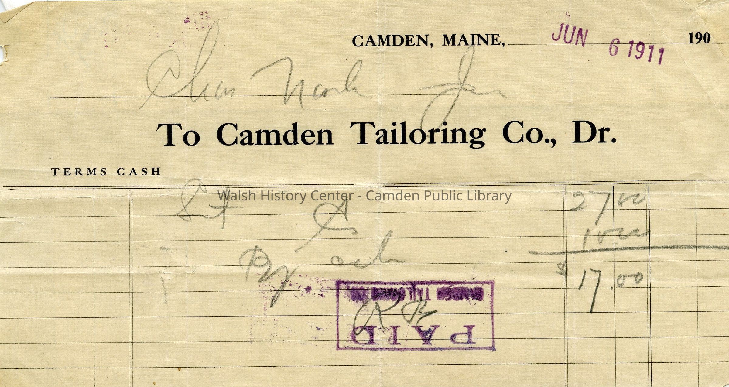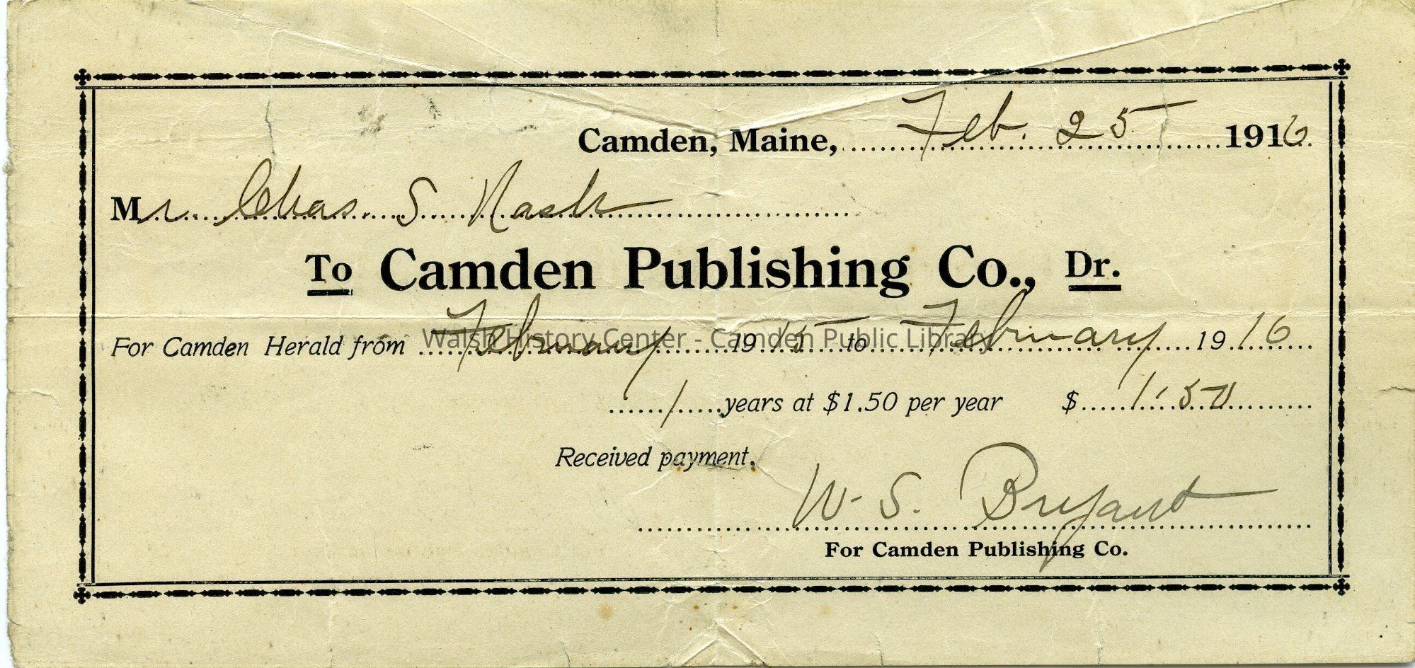 Contains billheads, stationery, bills, letterheads, and receipts from several Camden area businesses. These items date from the 1880's through the 1950's. Partial list of businesses represented: G.W. Achorn; Allen Insurance Agency; Ayers Market; Bay View House; Bay View Street Garage; Boynton's Pharmacy; Brown & Hobbs lumber; Brown's Market; Camden Anchor-Rockland Machine Co.; Camden & Rockland Water Company; Camden Farmer's Union; Camden Lumber Company; Camden Publishing Company; Camden Yacht Building and Railway Company; Carleton, Pascal & Co.; J.C. Curtis Hardware; Follansbee & Wood; Haskell & Corthell; J.H. Hobbs Company; Lenfest's Automotive Service; J.L. Locke; Maiden Cliff Rebekah Lodge; Maine Insane Hospital; The Megunticook Press; A.H. Parsons; Pendleton Dairy; S.G. Ritterbush, contractor; Rockland, Thomaston & Camden Street Railway; S.E. & H.L. Shepherd Company; TalbotArchive Details