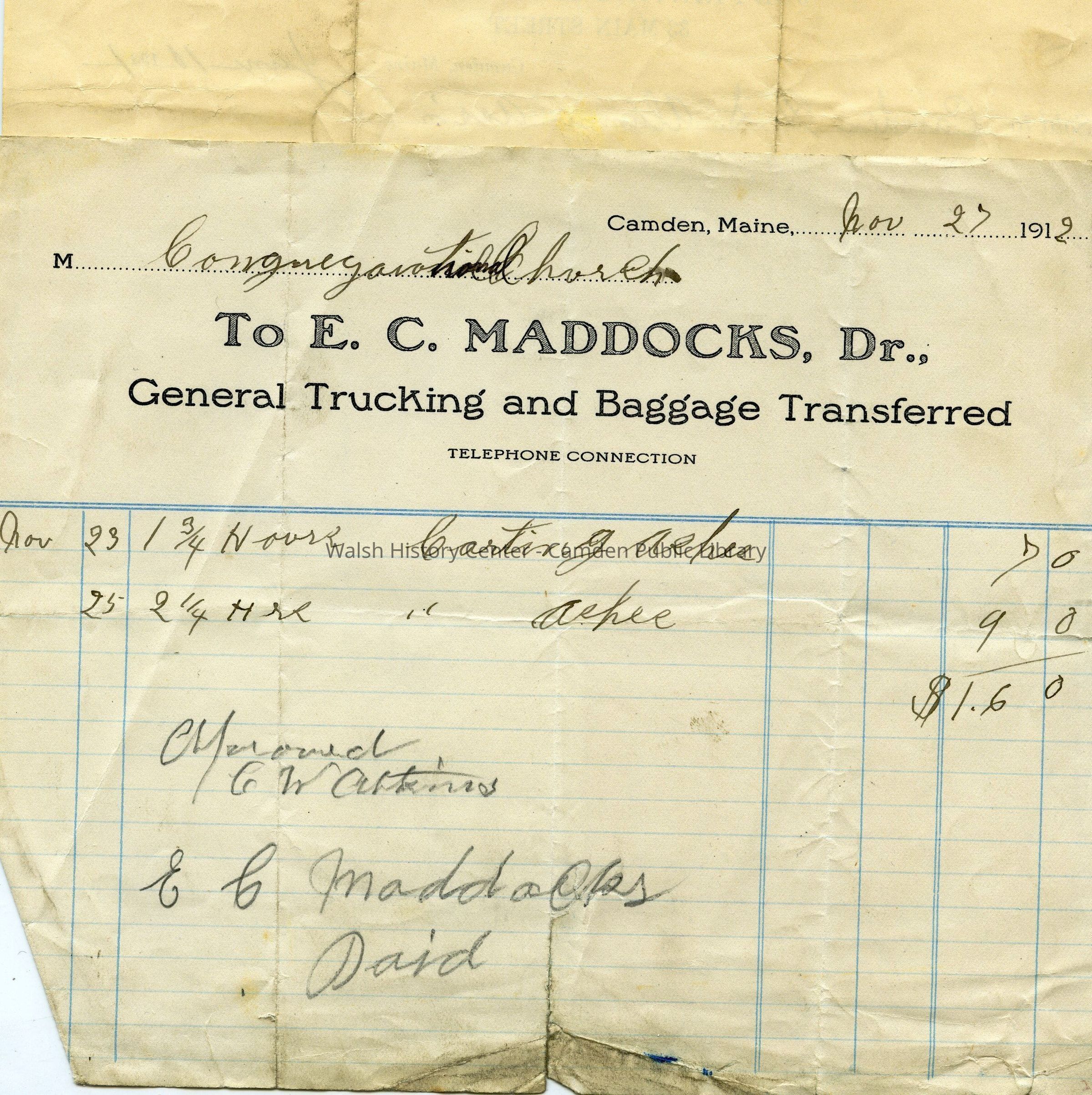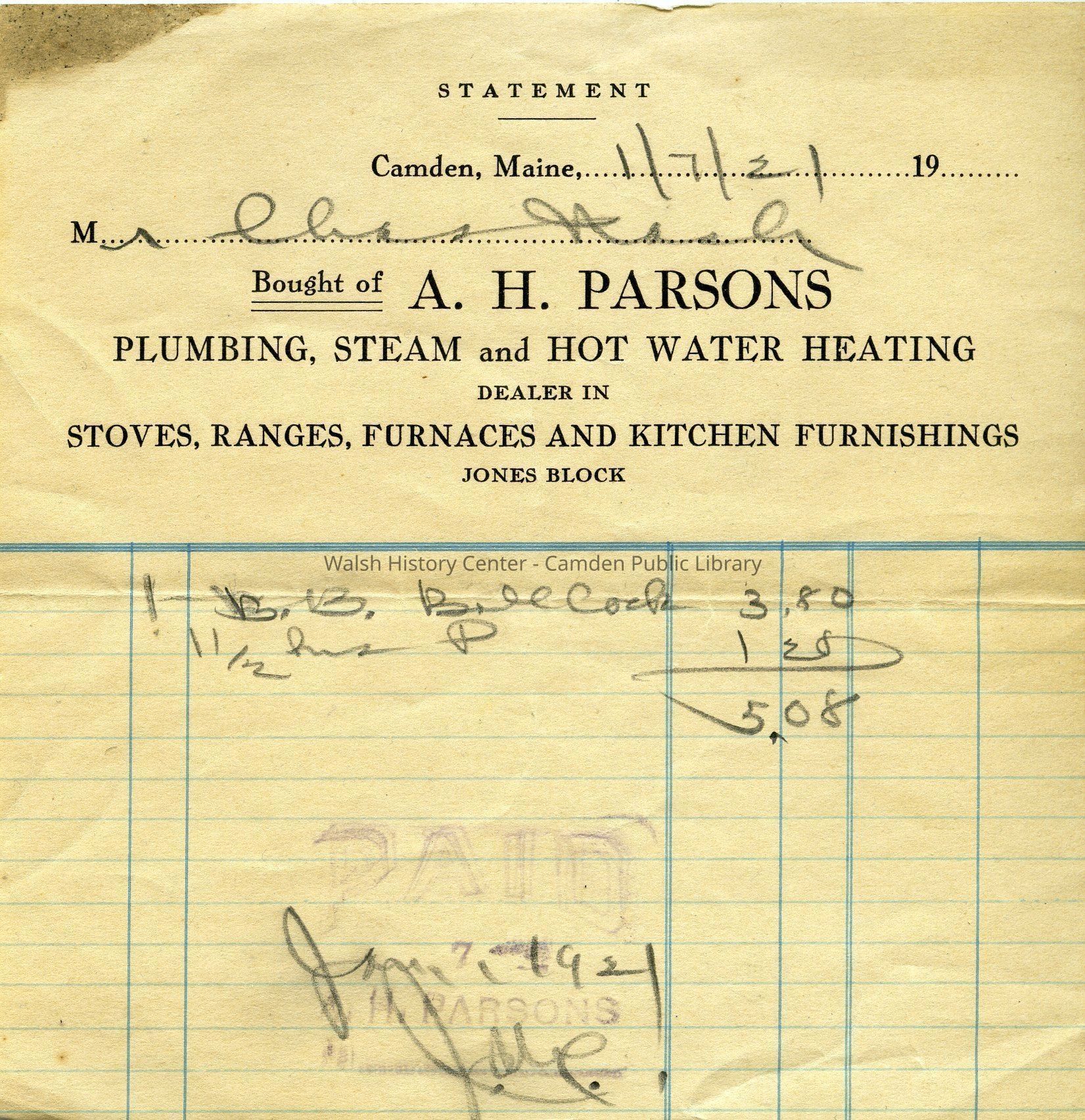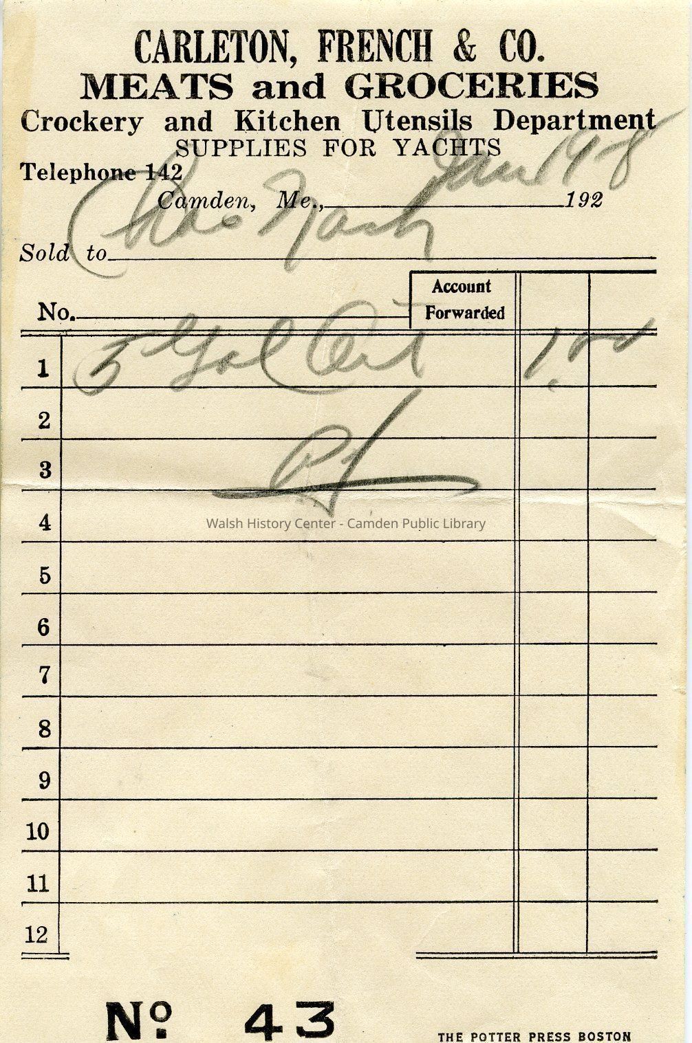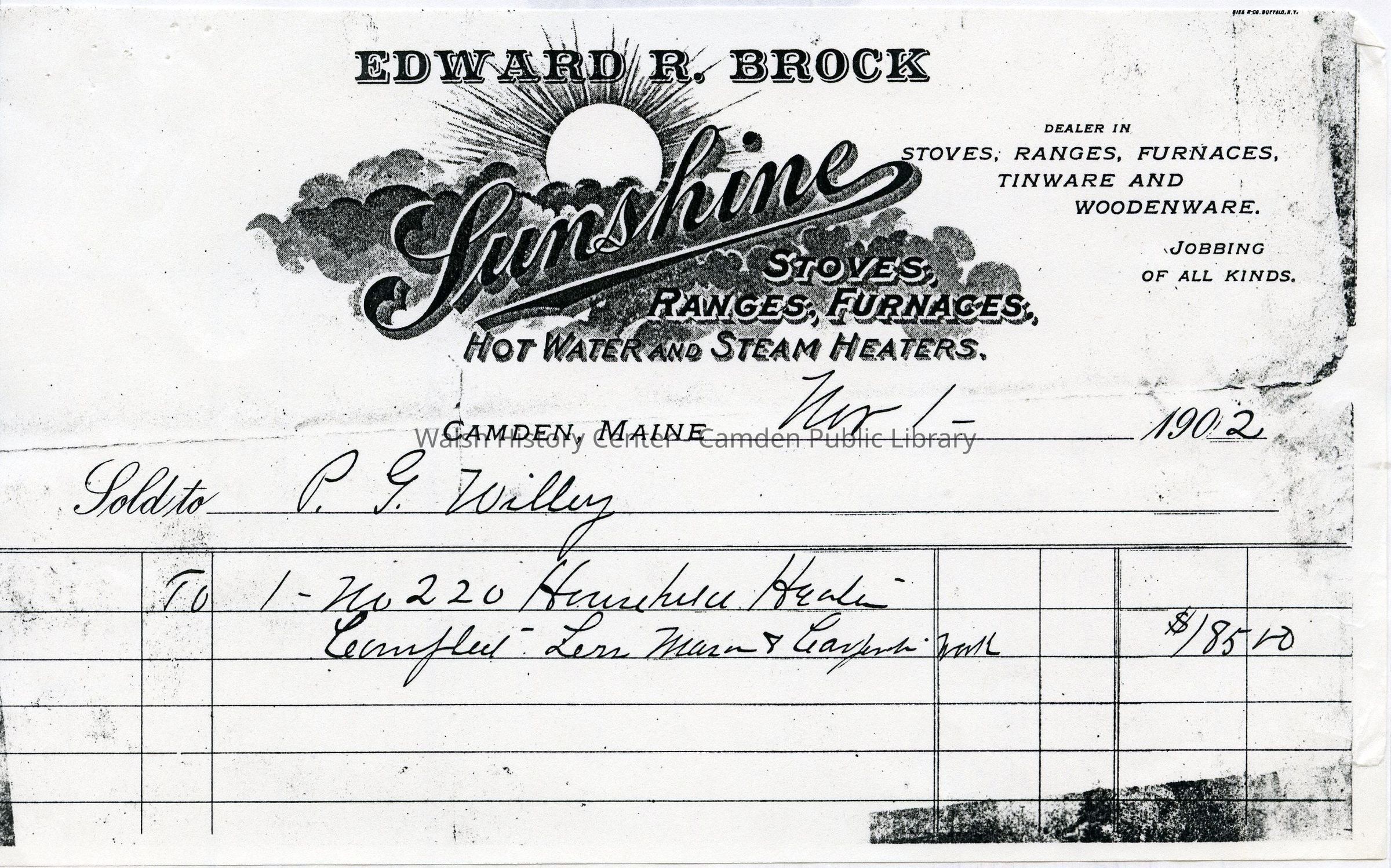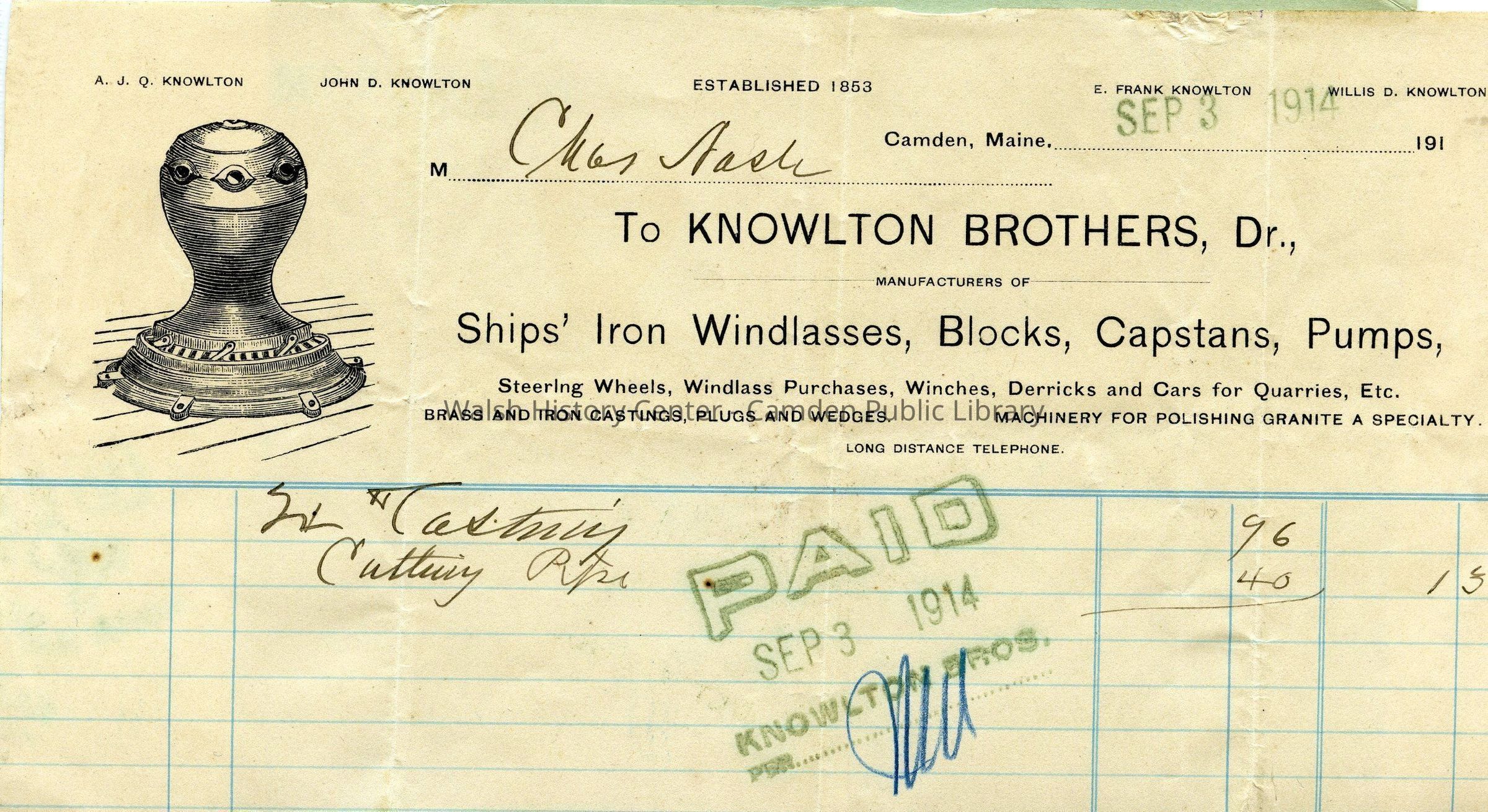 Contains billheads, stationery, bills, letterheads, and receipts from several Camden area businesses. These items date from the 1880's through the 1950's. Partial list of businesses represented: G.W. Achorn; Allen Insurance Agency; Ayers Market; Bay View House; Bay View Street Garage; Boynton's Pharmacy; Brown & Hobbs lumber; Brown's Market; Camden Anchor-Rockland Machine Co.; Camden & Rockland Water Company; Camden Farmer's Union; Camden Lumber Company; Camden Publishing Company; Camden Yacht Building and Railway Company; Carleton, Pascal & Co.; J.C. Curtis Hardware; Follansbee & Wood; Haskell & Corthell; J.H. Hobbs Company; Lenfest's Automotive Service; J.L. Locke; Maiden Cliff Rebekah Lodge; Maine Insane Hospital; The Megunticook Press; A.H. Parsons; Pendleton Dairy; S.G. Ritterbush, contractor; Rockland, Thomaston & Camden Street Railway; S.E. & H.L. Shepherd Company; TalbotArchive Details