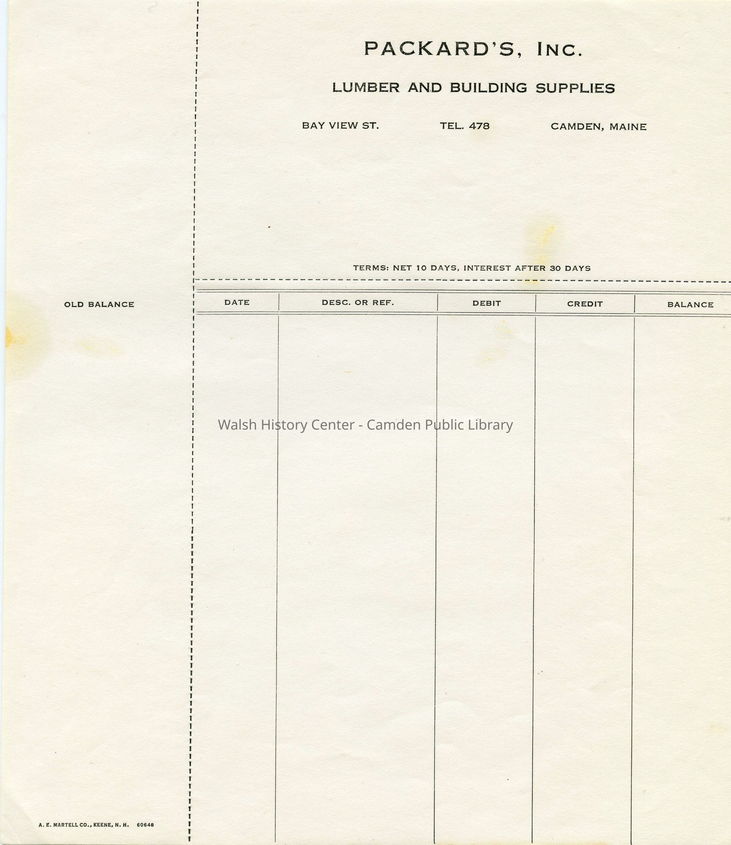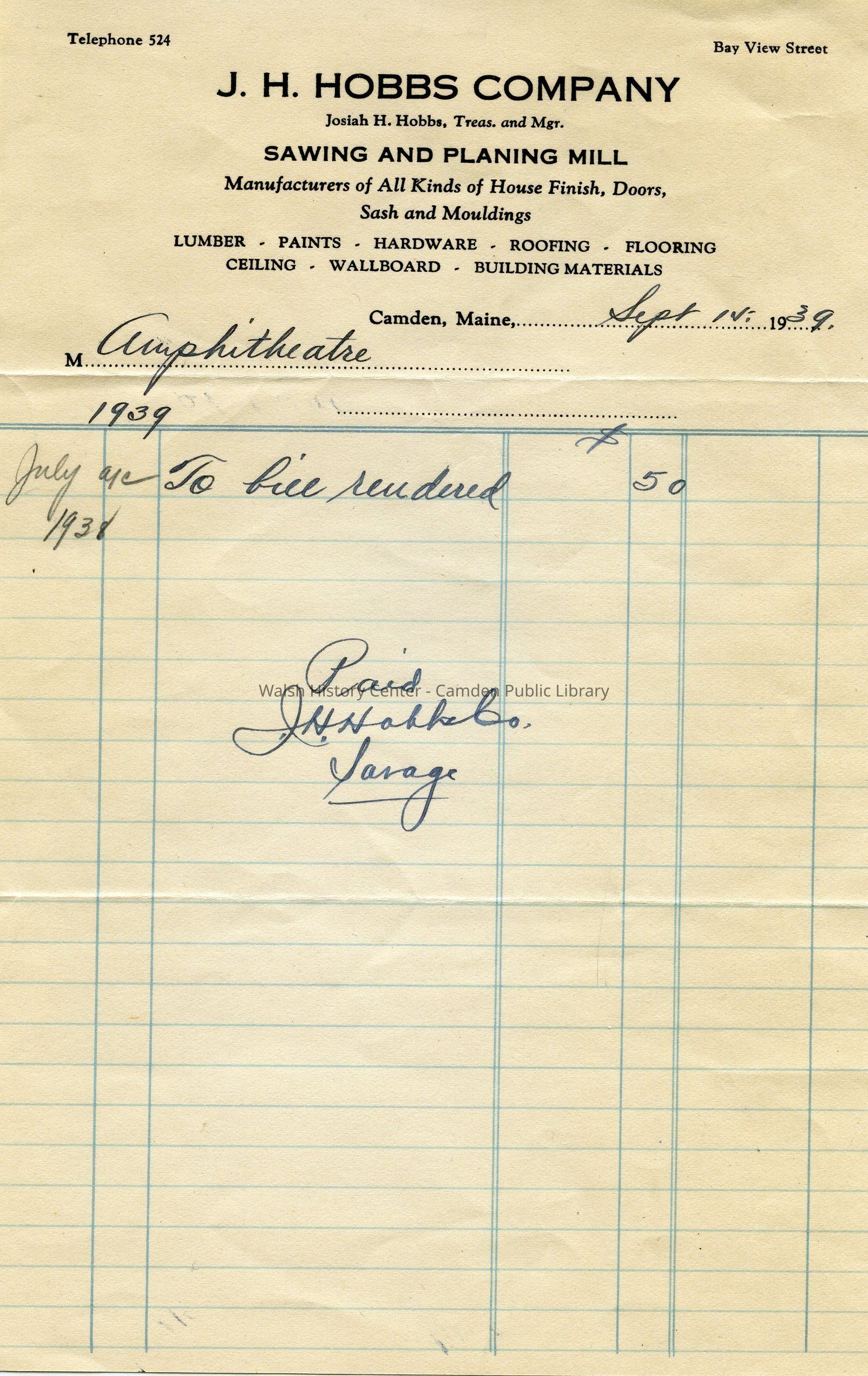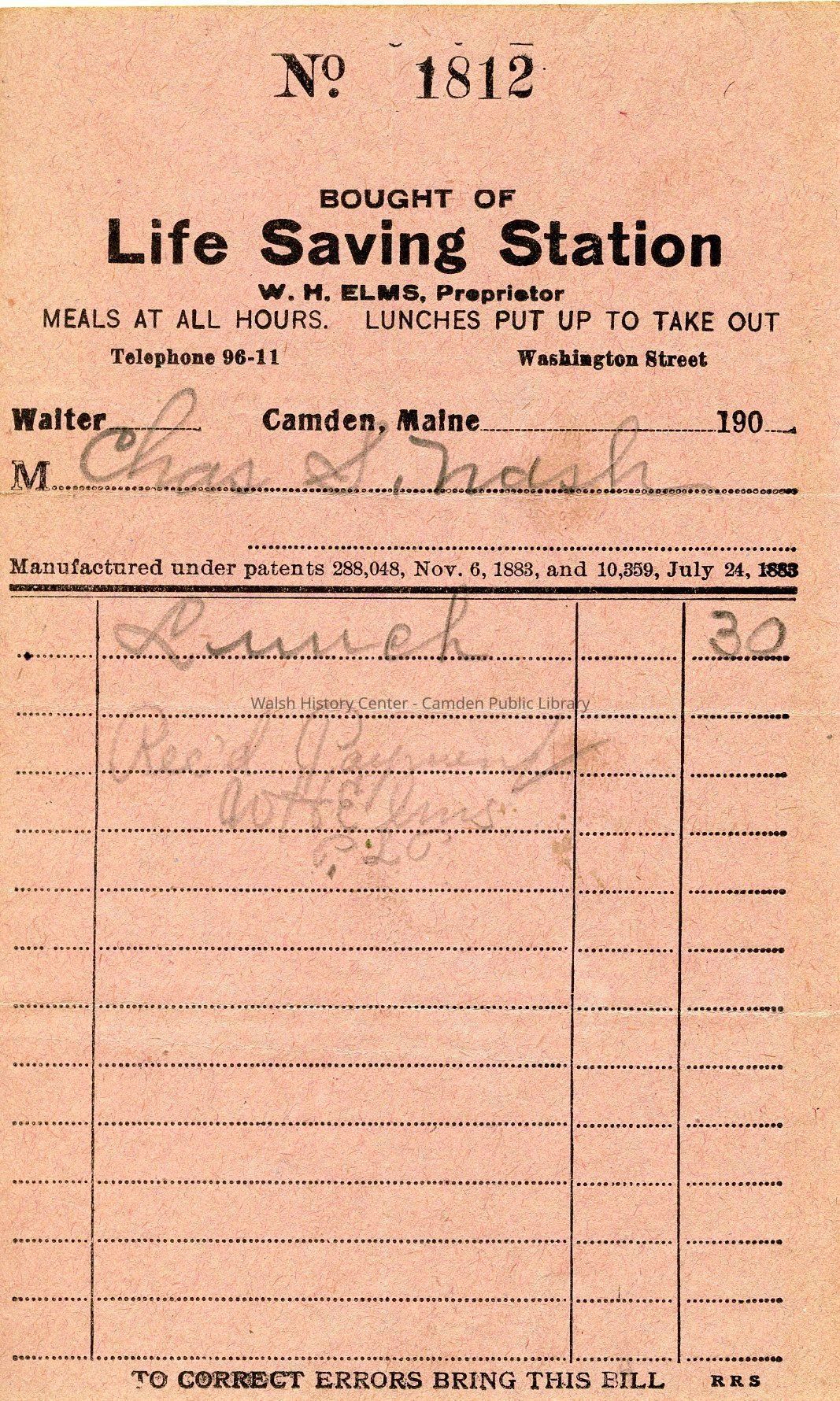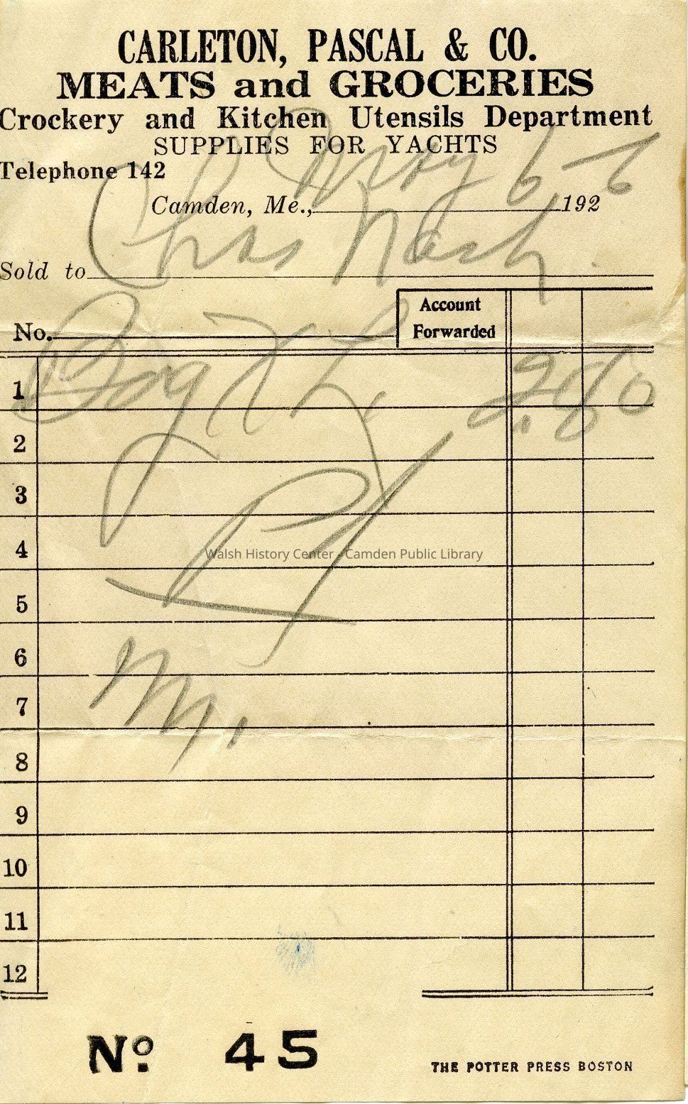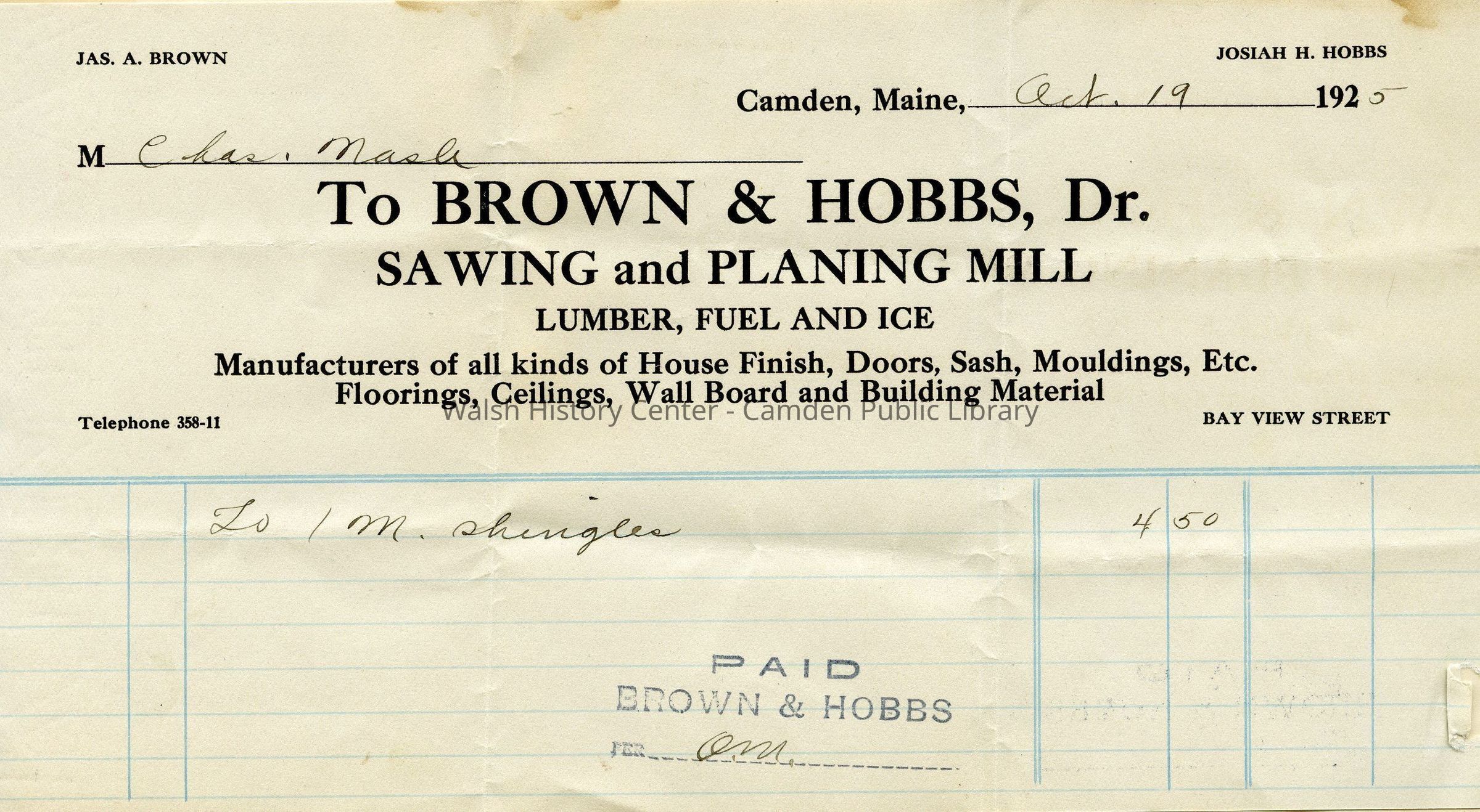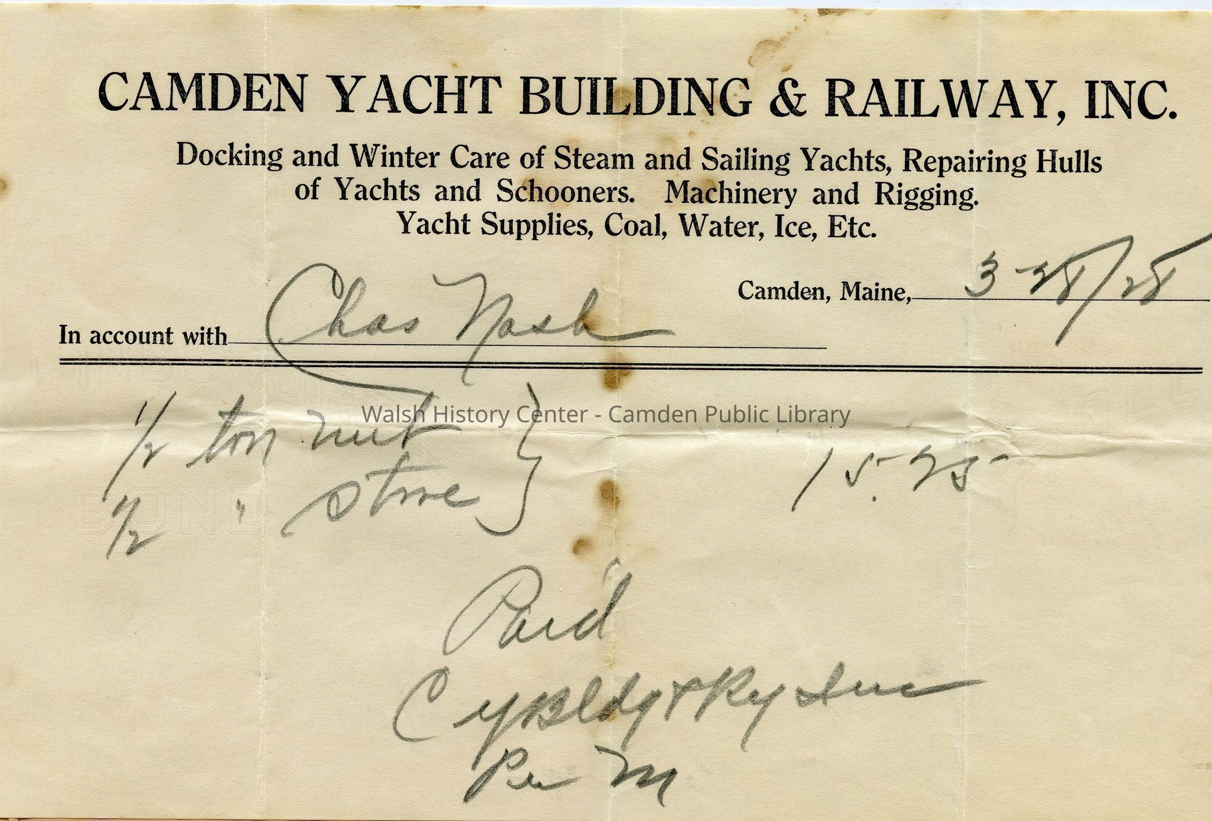 Contains billheads, stationery, bills, letterheads, and receipts from several Camden area businesses. These items date from the 1880's through the 1950's. Partial list of businesses represented: G.W. Achorn; Allen Insurance Agency; Ayers Market; Bay View House; Bay View Street Garage; Boynton's Pharmacy; Brown & Hobbs lumber; Brown's Market; Camden Anchor-Rockland Machine Co.; Camden & Rockland Water Company; Camden Farmer's Union; Camden Lumber Company; Camden Publishing Company; Camden Yacht Building and Railway Company; Carleton, Pascal & Co.; J.C. Curtis Hardware; Follansbee & Wood; Haskell & Corthell; J.H. Hobbs Company; Lenfest's Automotive Service; J.L. Locke; Maiden Cliff Rebekah Lodge; Maine Insane Hospital; The Megunticook Press; A.H. Parsons; Pendleton Dairy; S.G. Ritterbush, contractor; Rockland, Thomaston & Camden Street Railway; S.E. & H.L. Shepherd Company; TalbotArchive Details