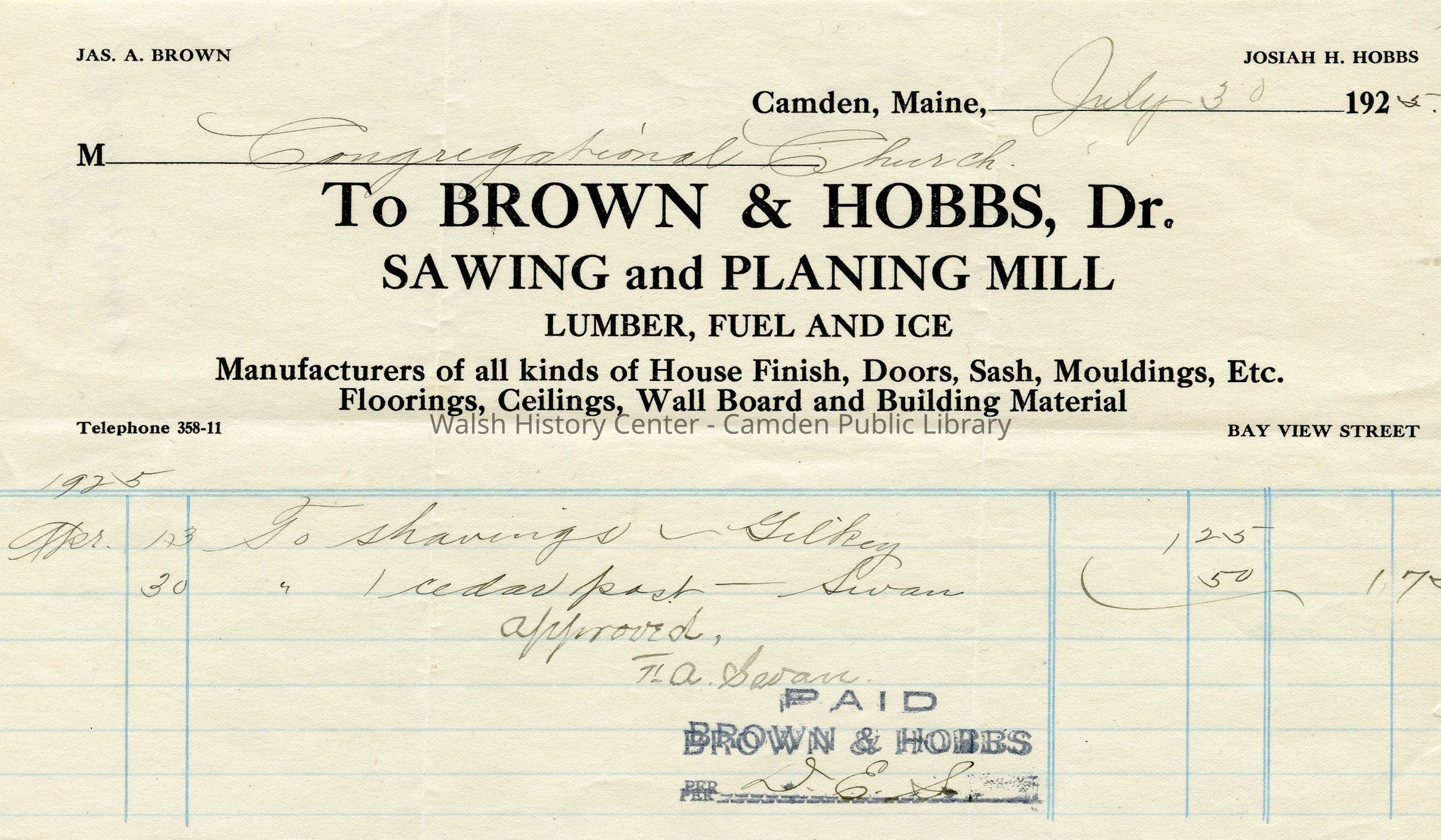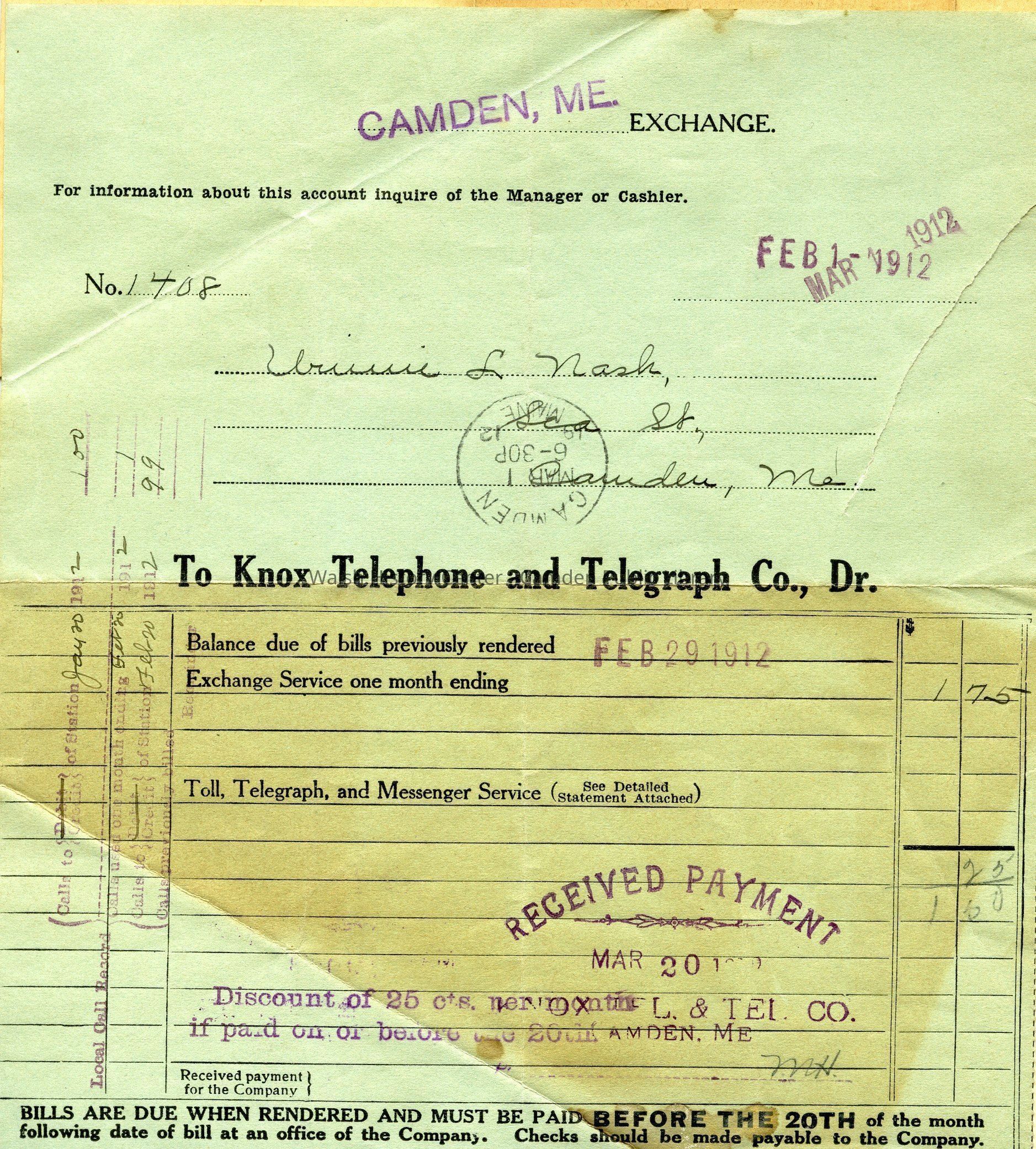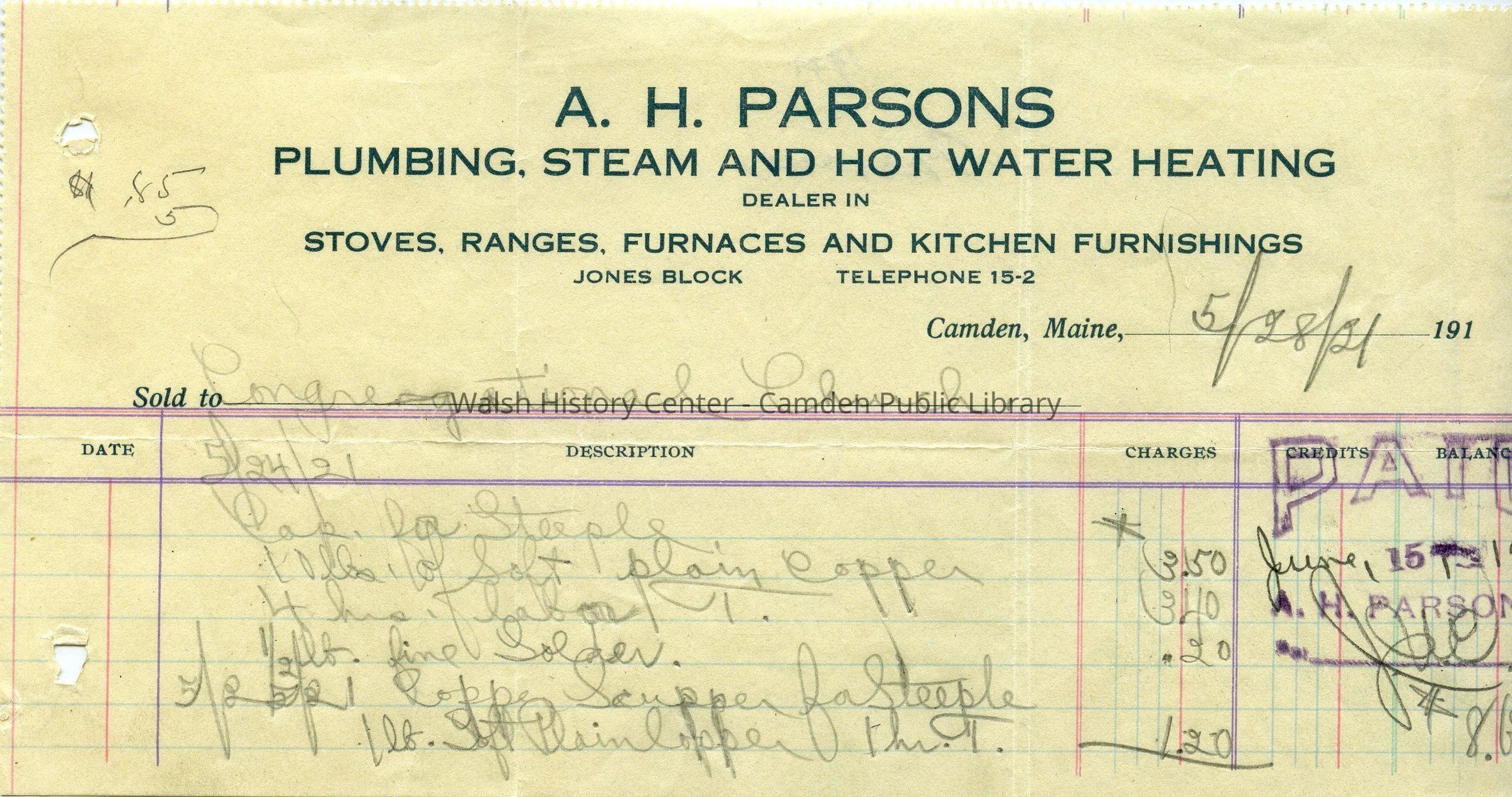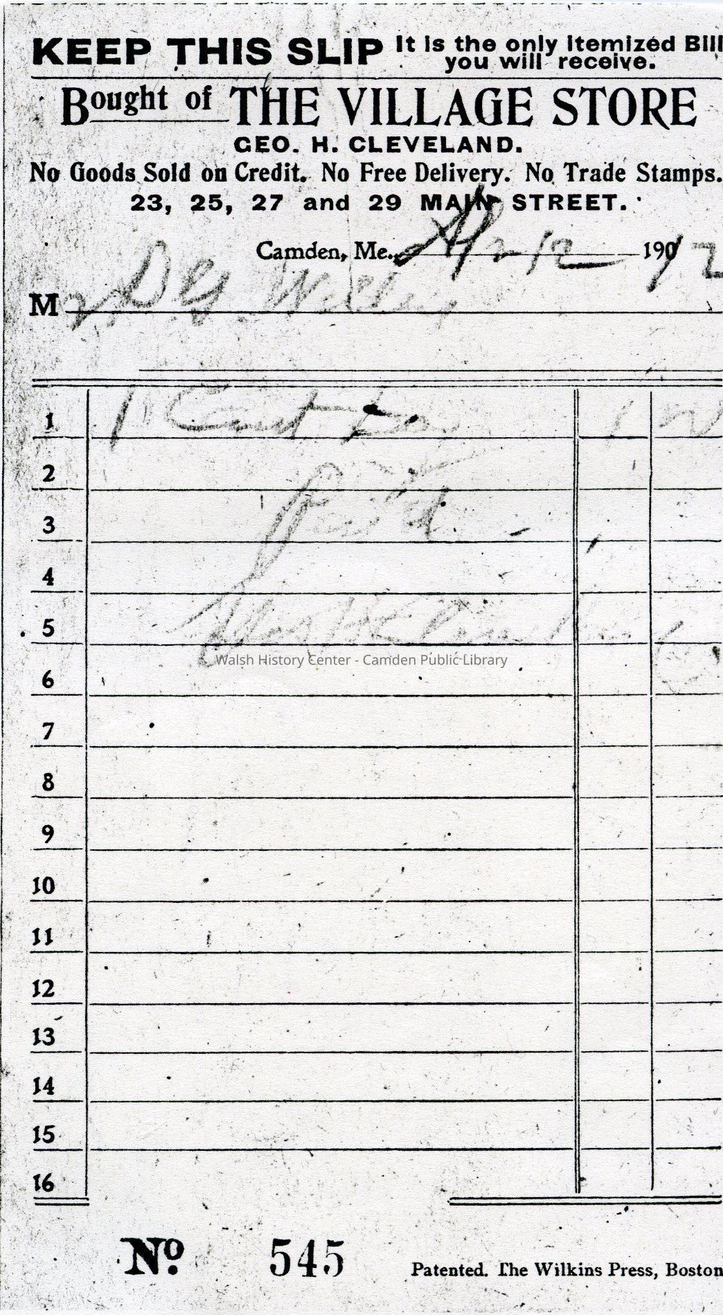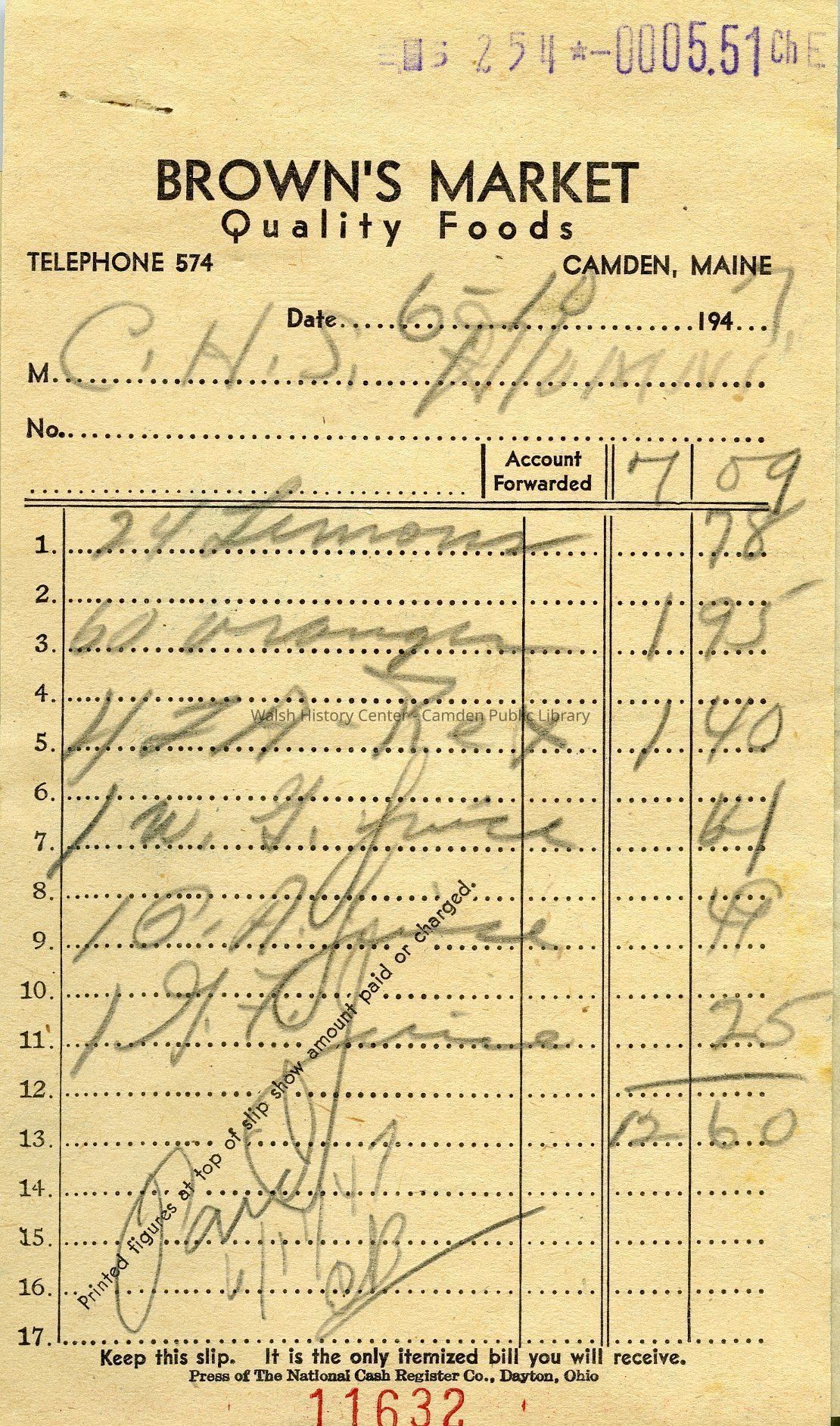 Contains billheads, stationery, bills, letterheads, and receipts from several Camden area businesses. These items date from the 1880's through the 1950's. Partial list of businesses represented: G.W. Achorn; Allen Insurance Agency; Ayers Market; Bay View House; Bay View Street Garage; Boynton's Pharmacy; Brown & Hobbs lumber; Brown's Market; Camden Anchor-Rockland Machine Co.; Camden & Rockland Water Company; Camden Farmer's Union; Camden Lumber Company; Camden Publishing Company; Camden Yacht Building and Railway Company; Carleton, Pascal & Co.; J.C. Curtis Hardware; Follansbee & Wood; Haskell & Corthell; J.H. Hobbs Company; Lenfest's Automotive Service; J.L. Locke; Maiden Cliff Rebekah Lodge; Maine Insane Hospital; The Megunticook Press; A.H. Parsons; Pendleton Dairy; S.G. Ritterbush, contractor; Rockland, Thomaston & Camden Street Railway; S.E. & H.L. Shepherd Company; TalbotArchive Details