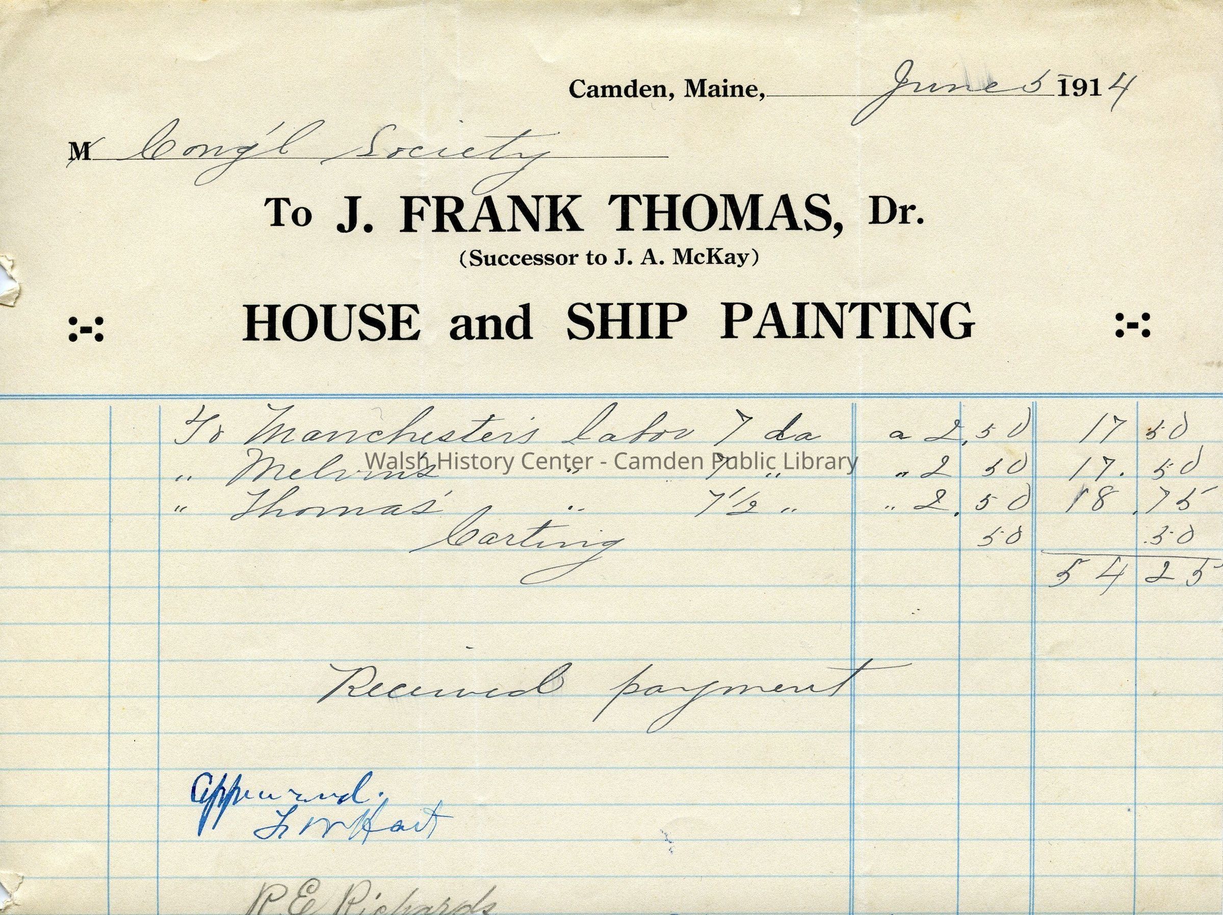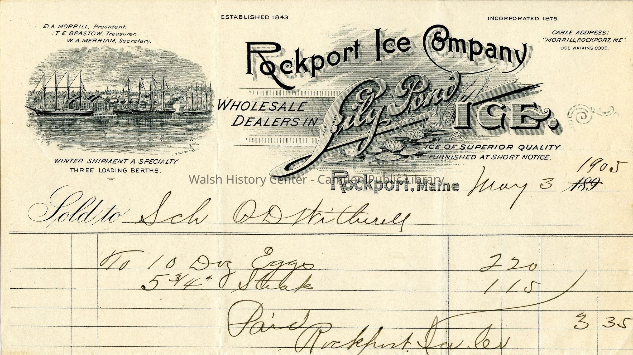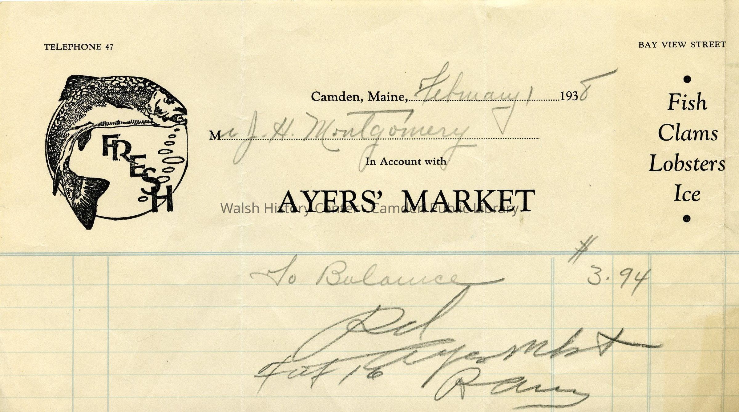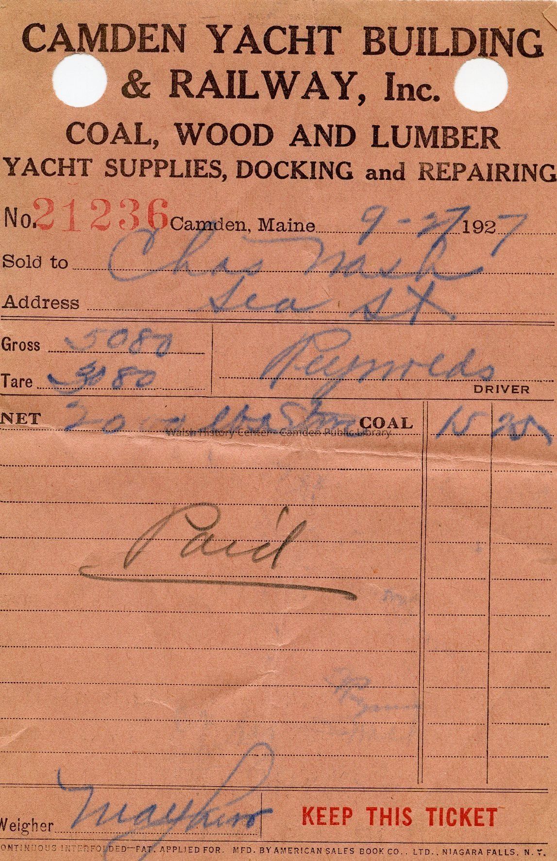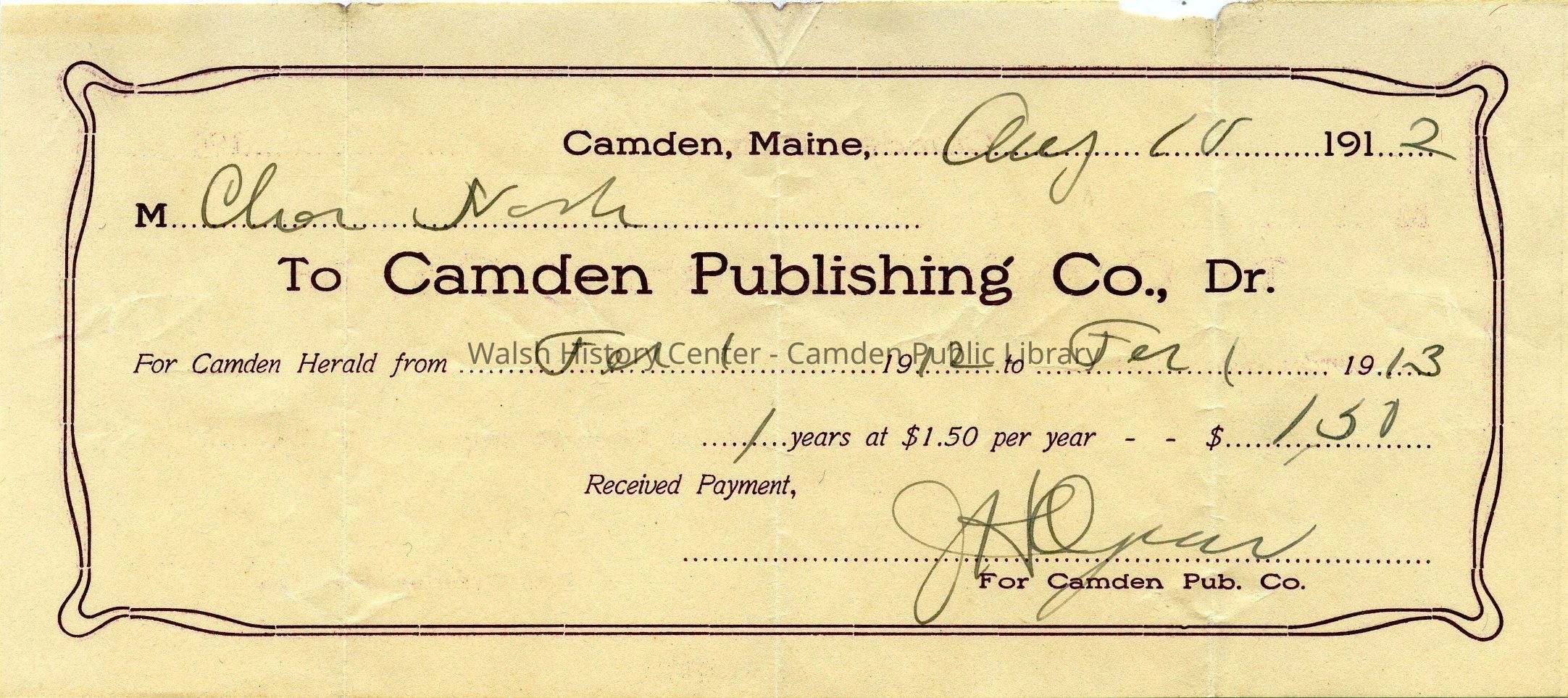 Contains billheads, stationery, bills, letterheads, and receipts from several Camden area businesses. These items date from the 1880's through the 1950's. Partial list of businesses represented: G.W. Achorn; Allen Insurance Agency; Ayers Market; Bay View House; Bay View Street Garage; Boynton's Pharmacy; Brown & Hobbs lumber; Brown's Market; Camden Anchor-Rockland Machine Co.; Camden & Rockland Water Company; Camden Farmer's Union; Camden Lumber Company; Camden Publishing Company; Camden Yacht Building and Railway Company; Carleton, Pascal & Co.; J.C. Curtis Hardware; Follansbee & Wood; Haskell & Corthell; J.H. Hobbs Company; Lenfest's Automotive Service; J.L. Locke; Maiden Cliff Rebekah Lodge; Maine Insane Hospital; The Megunticook Press; A.H. Parsons; Pendleton Dairy; S.G. Ritterbush, contractor; Rockland, Thomaston & Camden Street Railway; S.E. & H.L. Shepherd Company; TalbotArchive Details
