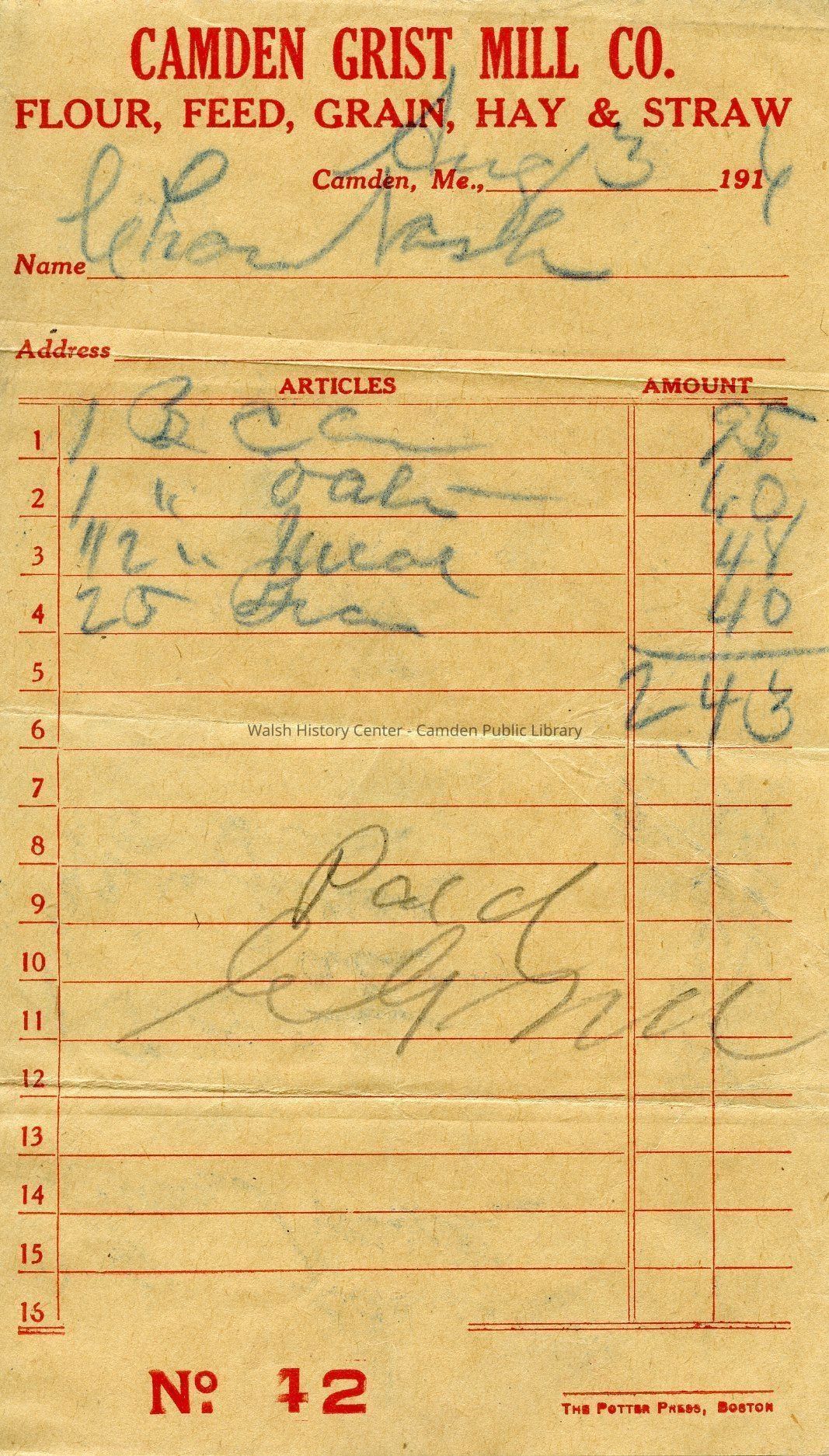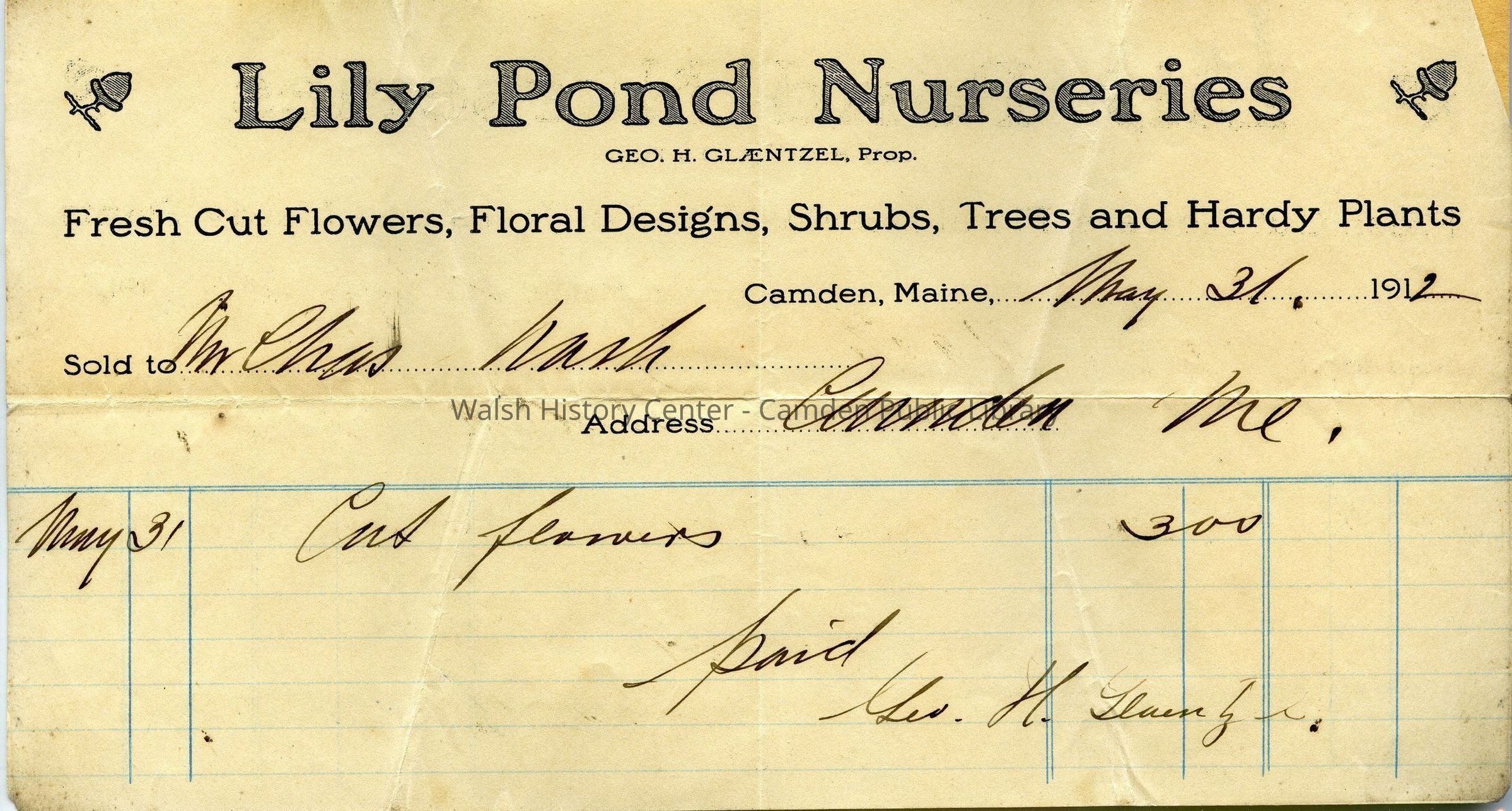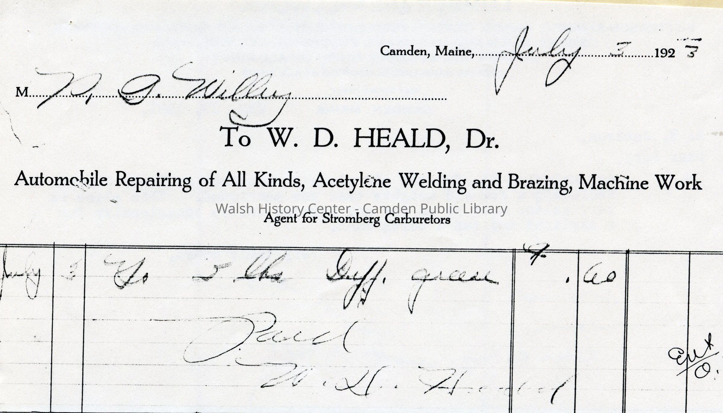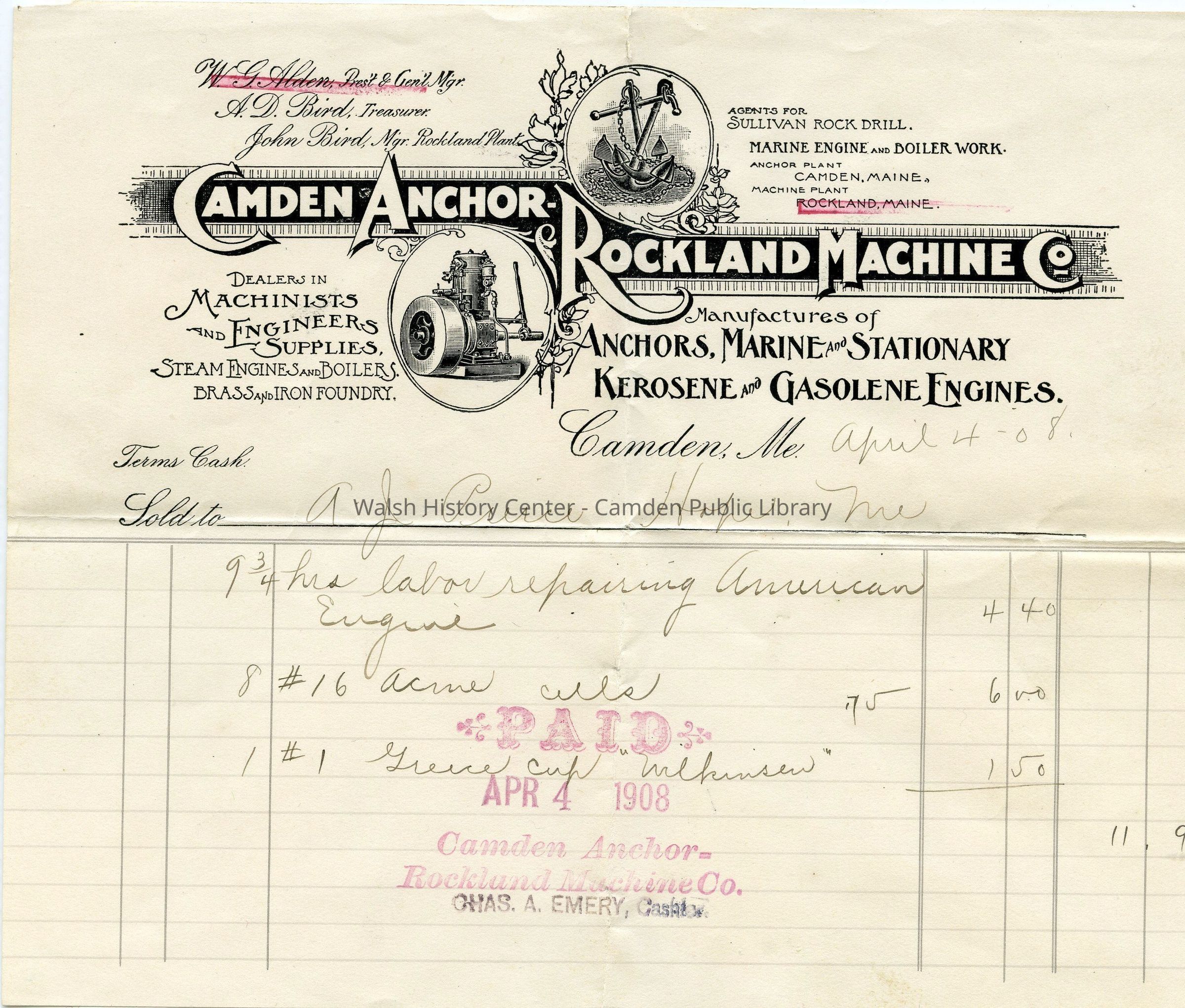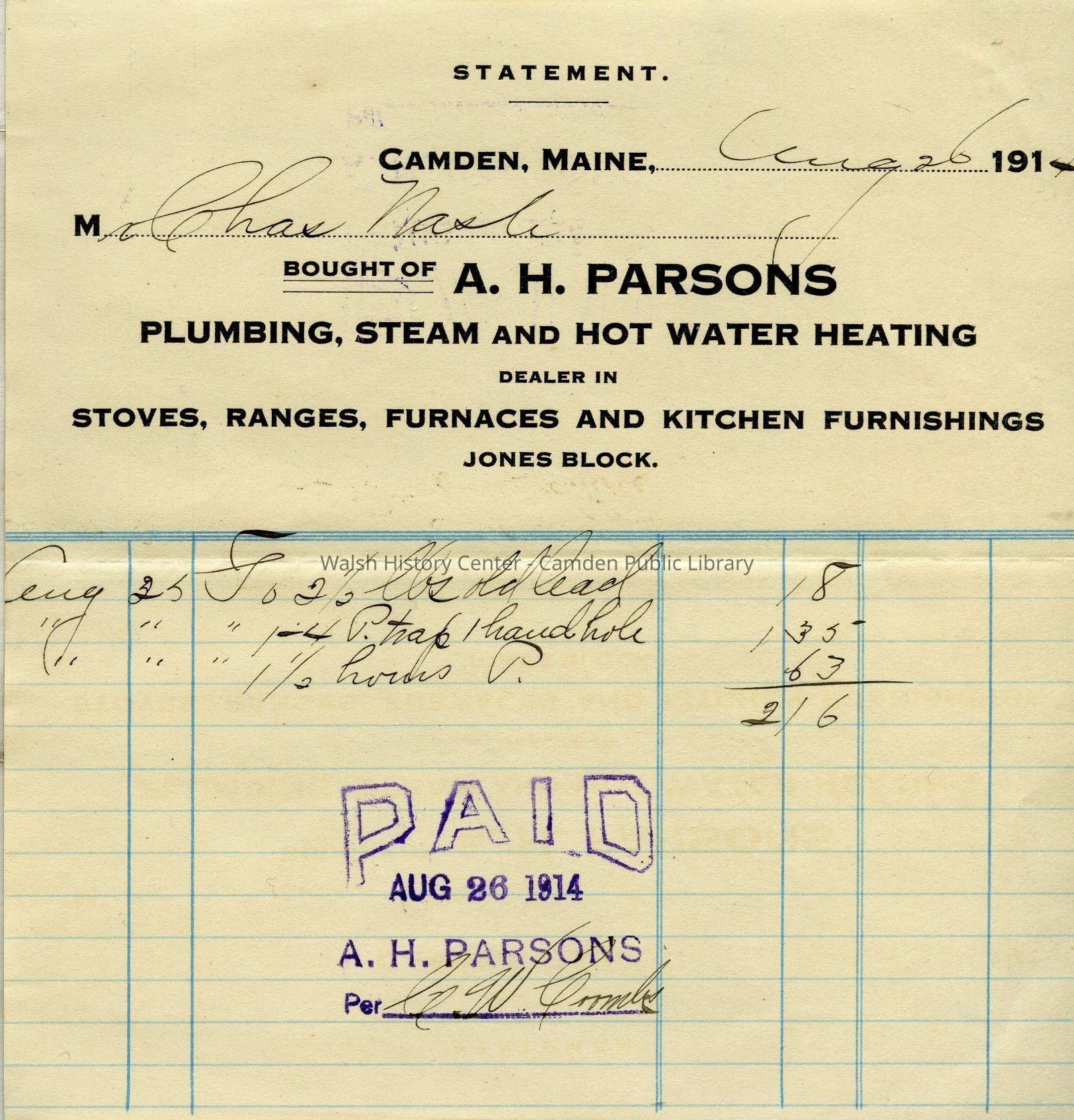 Contains billheads, stationery, bills, letterheads, and receipts from several Camden area businesses. These items date from the 1880's through the 1950's. Partial list of businesses represented: G.W. Achorn; Allen Insurance Agency; Ayers Market; Bay View House; Bay View Street Garage; Boynton's Pharmacy; Brown & Hobbs lumber; Brown's Market; Camden Anchor-Rockland Machine Co.; Camden & Rockland Water Company; Camden Farmer's Union; Camden Lumber Company; Camden Publishing Company; Camden Yacht Building and Railway Company; Carleton, Pascal & Co.; J.C. Curtis Hardware; Follansbee & Wood; Haskell & Corthell; J.H. Hobbs Company; Lenfest's Automotive Service; J.L. Locke; Maiden Cliff Rebekah Lodge; Maine Insane Hospital; The Megunticook Press; A.H. Parsons; Pendleton Dairy; S.G. Ritterbush, contractor; Rockland, Thomaston & Camden Street Railway; S.E. & H.L. Shepherd Company; TalbotArchive Details