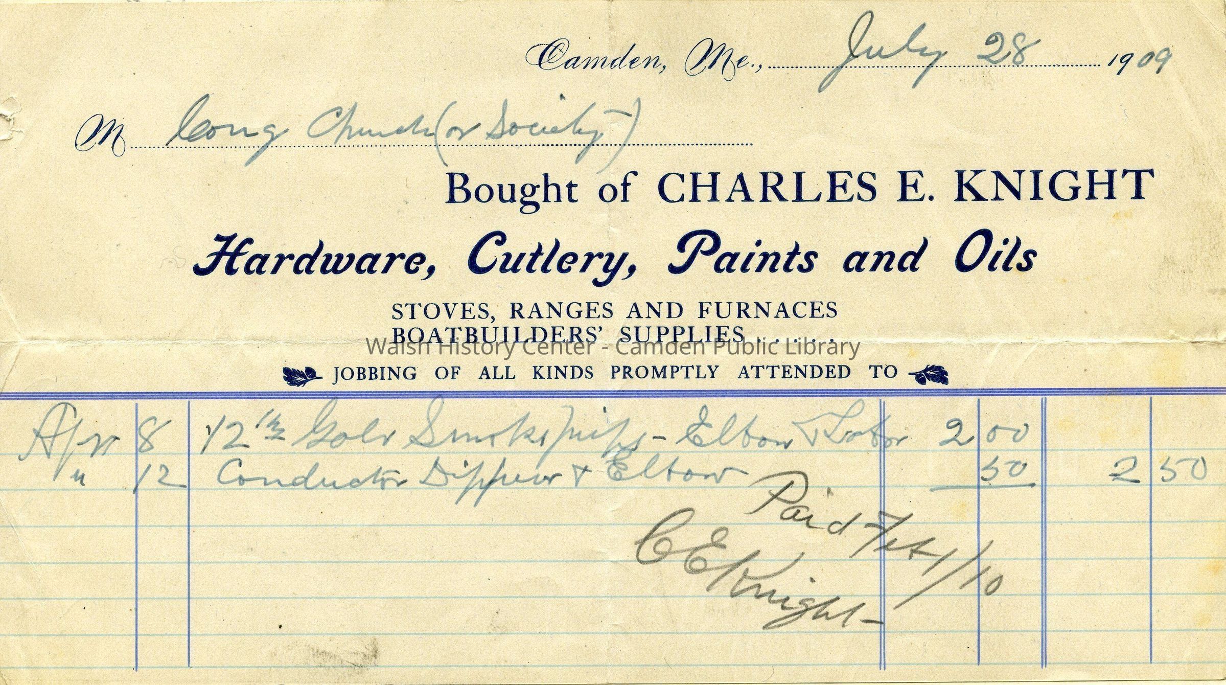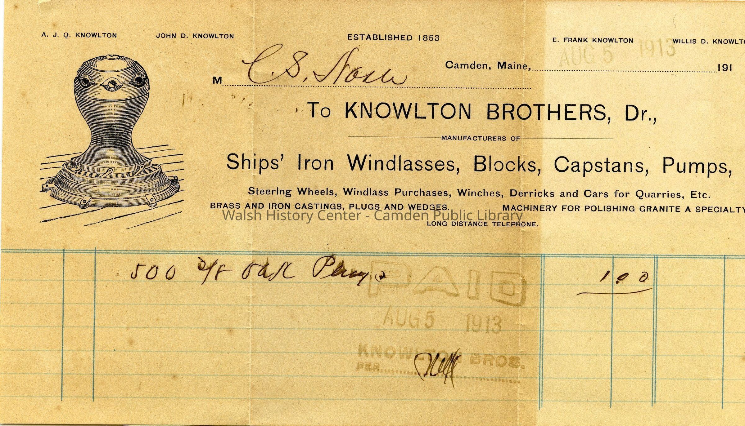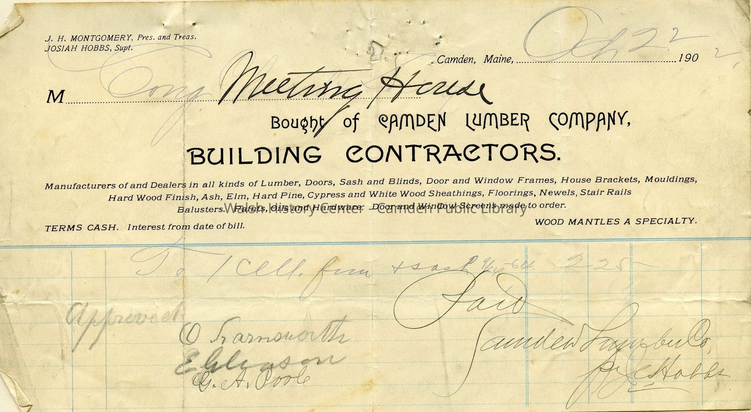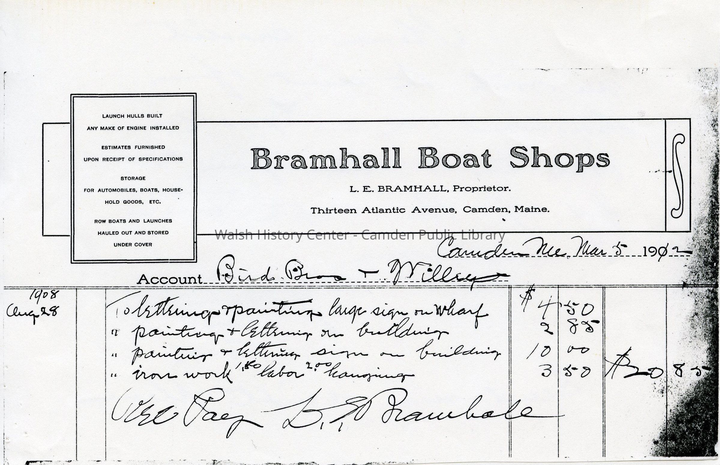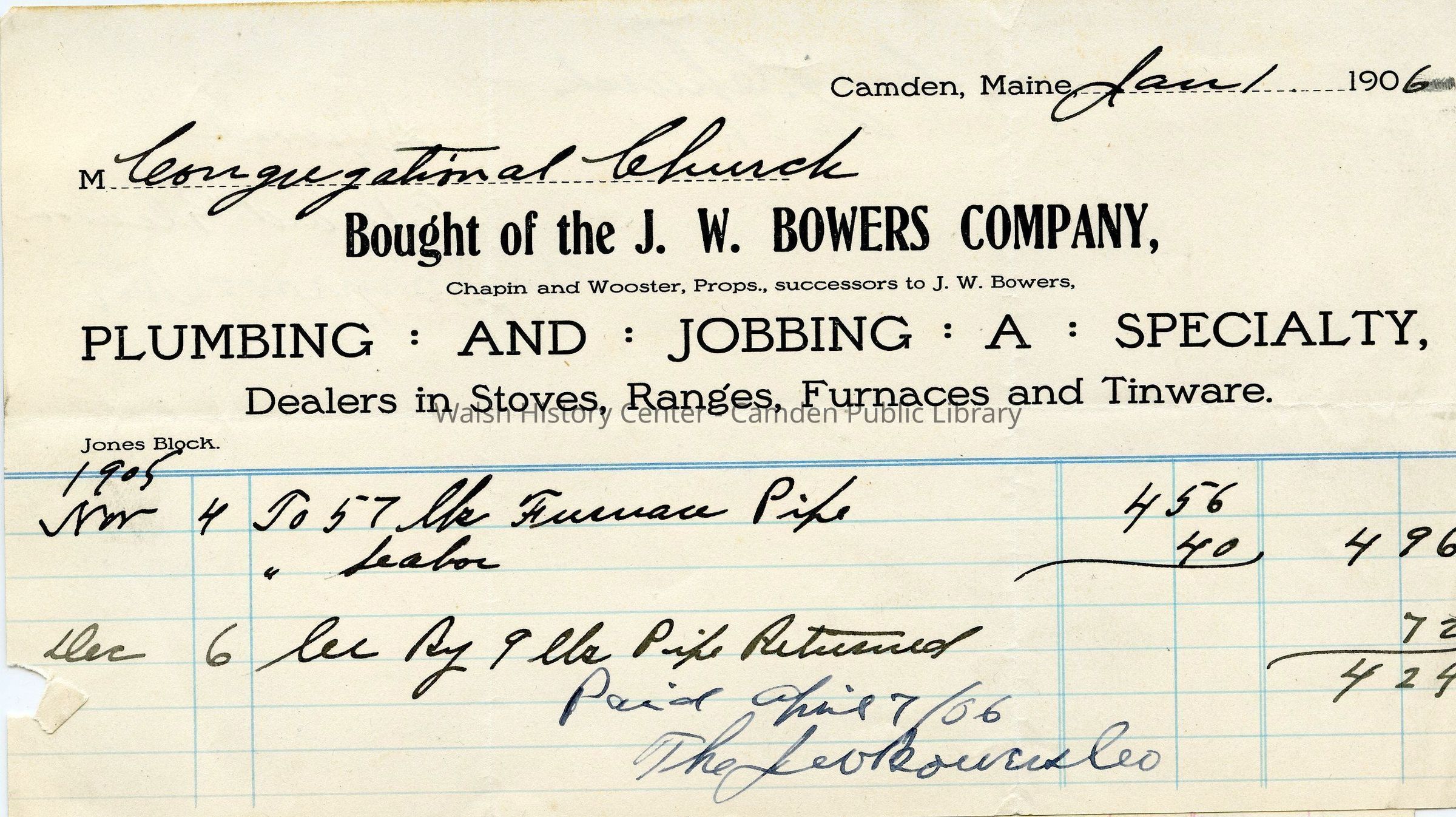 Contains billheads, stationery, bills, letterheads, and receipts from several Camden area businesses. These items date from the 1880's through the 1950's. Partial list of businesses represented: G.W. Achorn; Allen Insurance Agency; Ayers Market; Bay View House; Bay View Street Garage; Boynton's Pharmacy; Brown & Hobbs lumber; Brown's Market; Camden Anchor-Rockland Machine Co.; Camden & Rockland Water Company; Camden Farmer's Union; Camden Lumber Company; Camden Publishing Company; Camden Yacht Building and Railway Company; Carleton, Pascal & Co.; J.C. Curtis Hardware; Follansbee & Wood; Haskell & Corthell; J.H. Hobbs Company; Lenfest's Automotive Service; J.L. Locke; Maiden Cliff Rebekah Lodge; Maine Insane Hospital; The Megunticook Press; A.H. Parsons; Pendleton Dairy; S.G. Ritterbush, contractor; Rockland, Thomaston & Camden Street Railway; S.E. & H.L. Shepherd Company; TalbotArchive Details