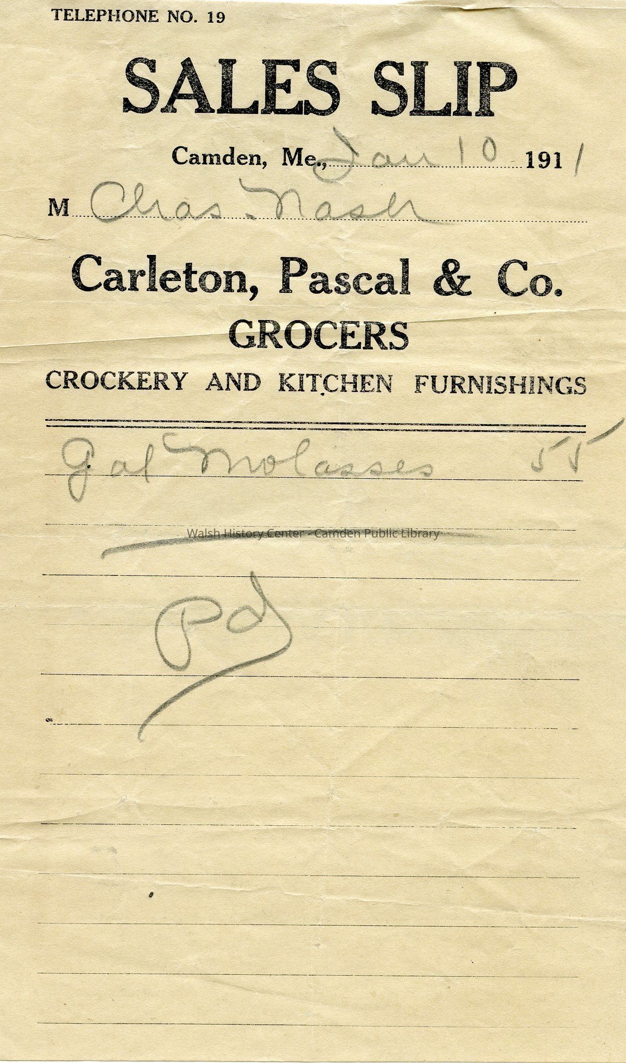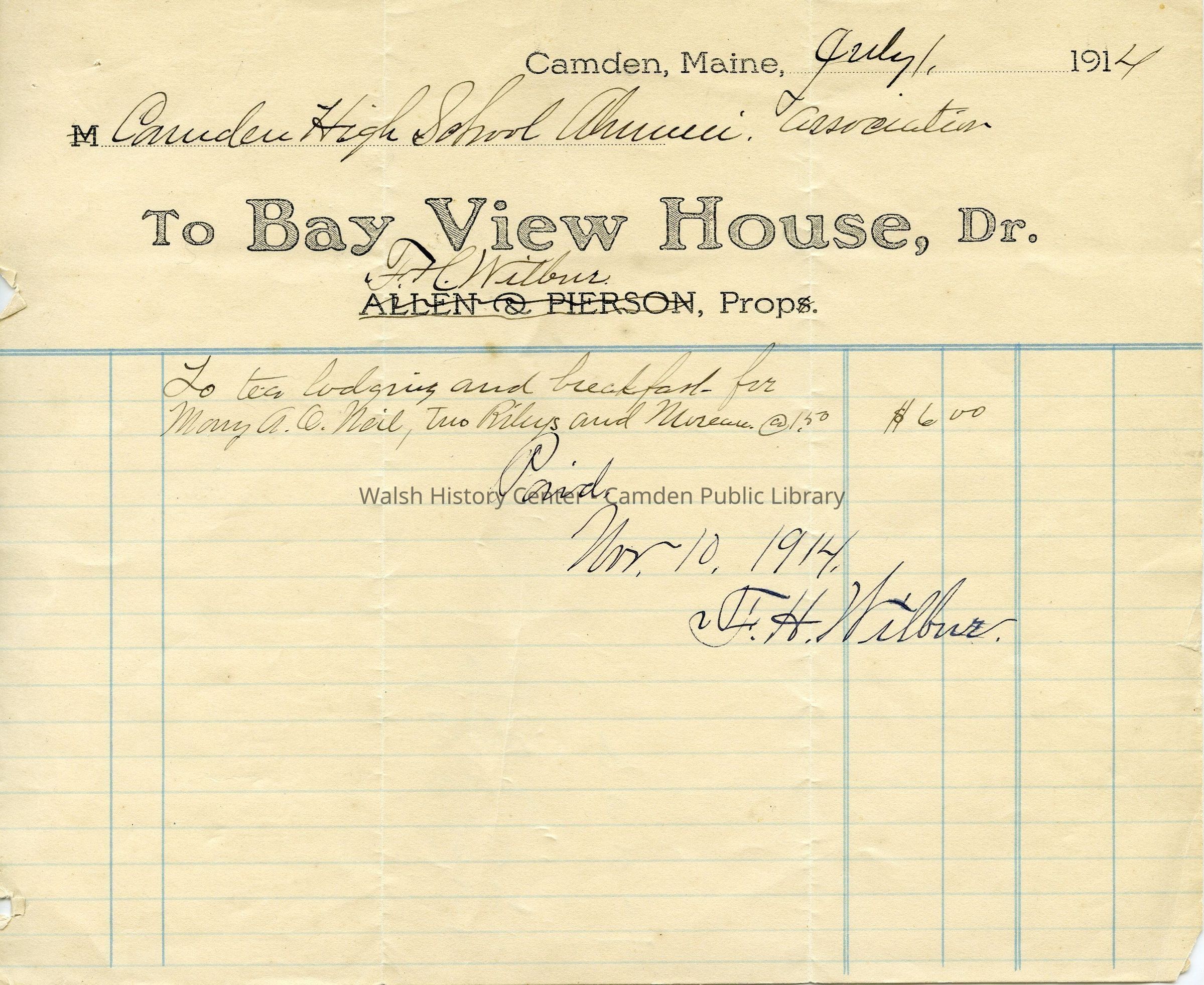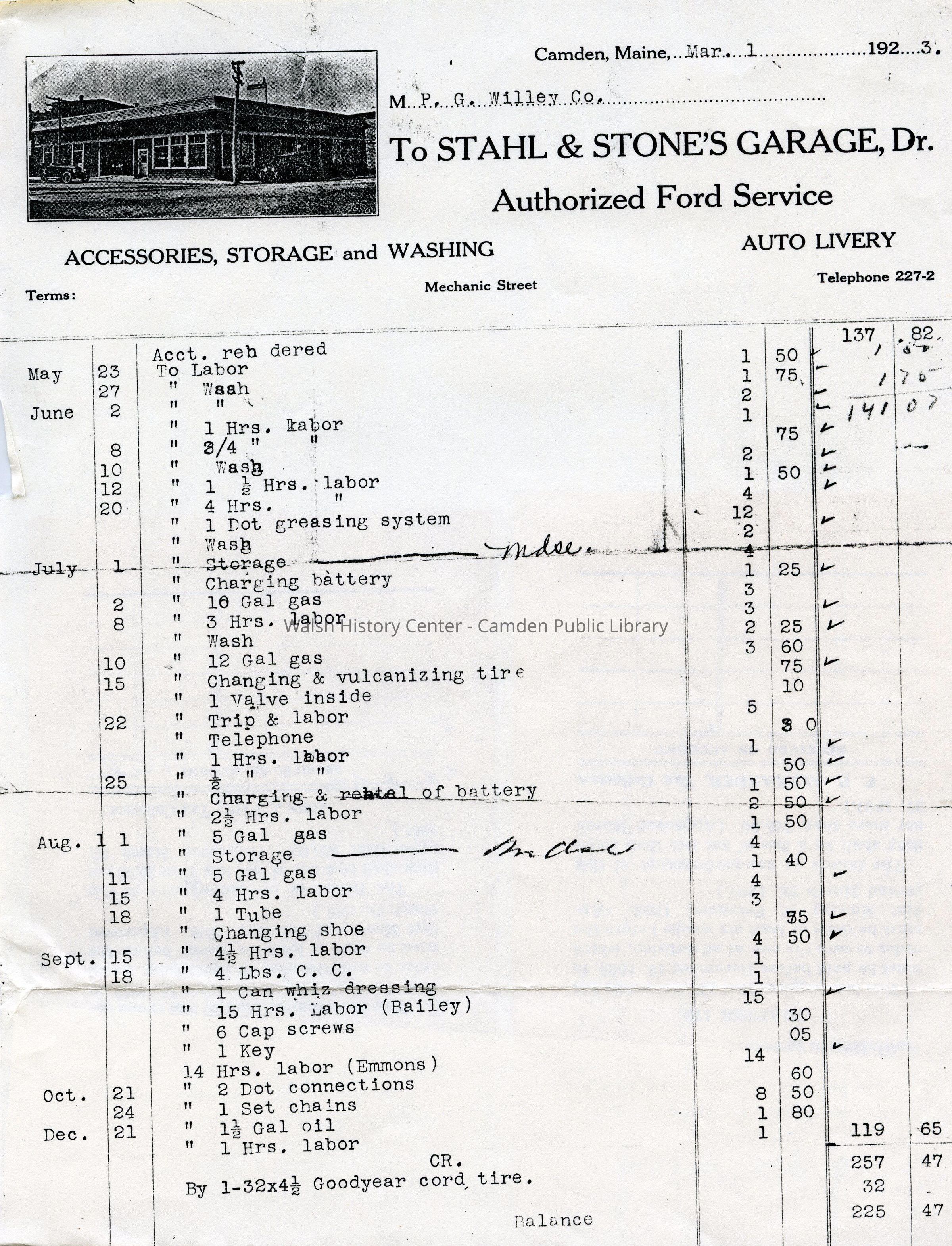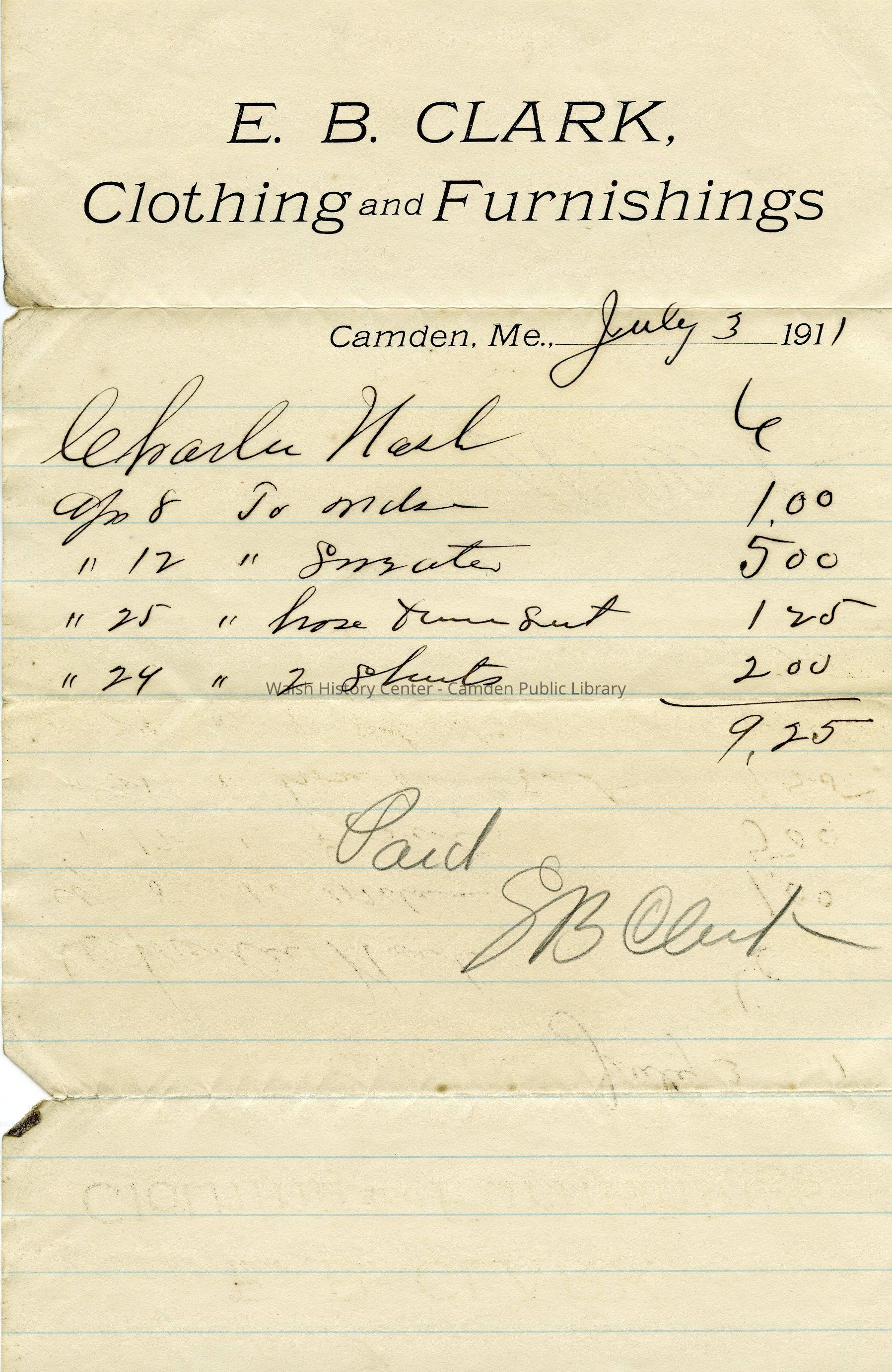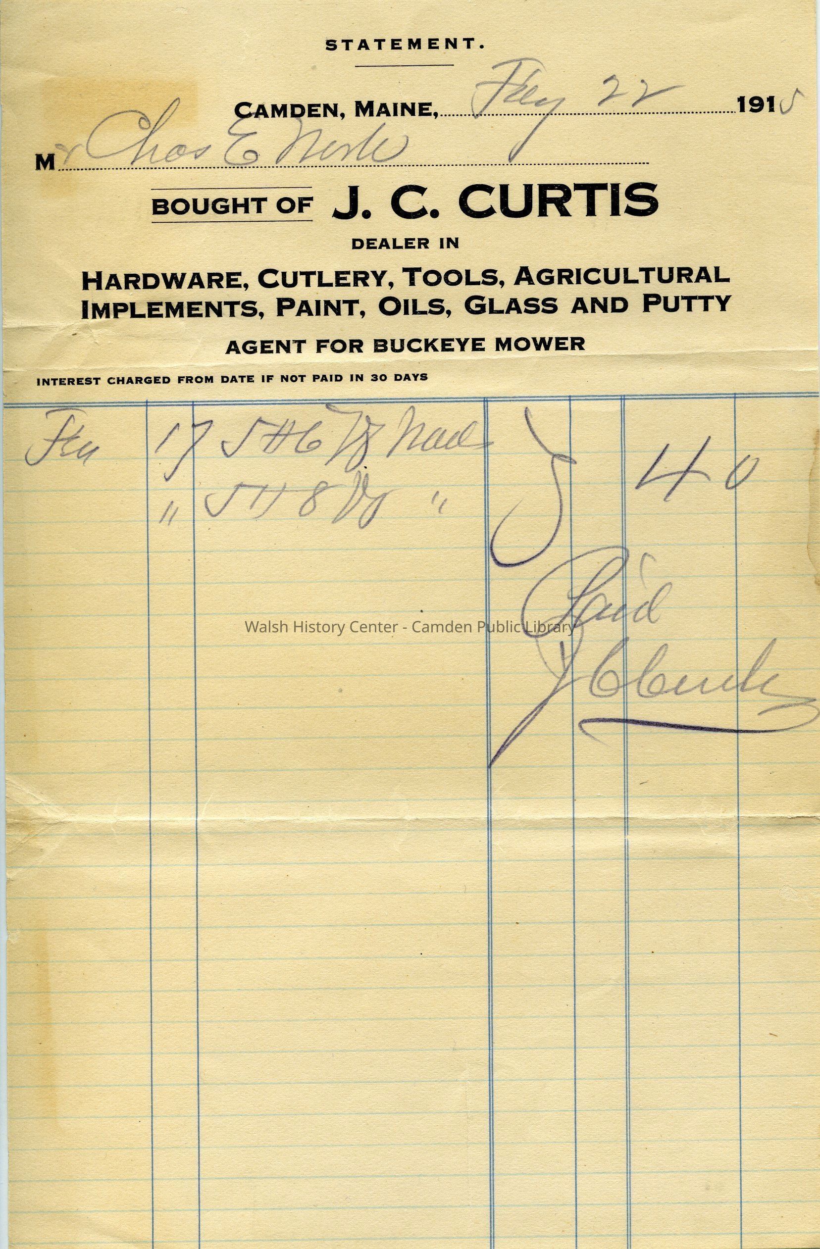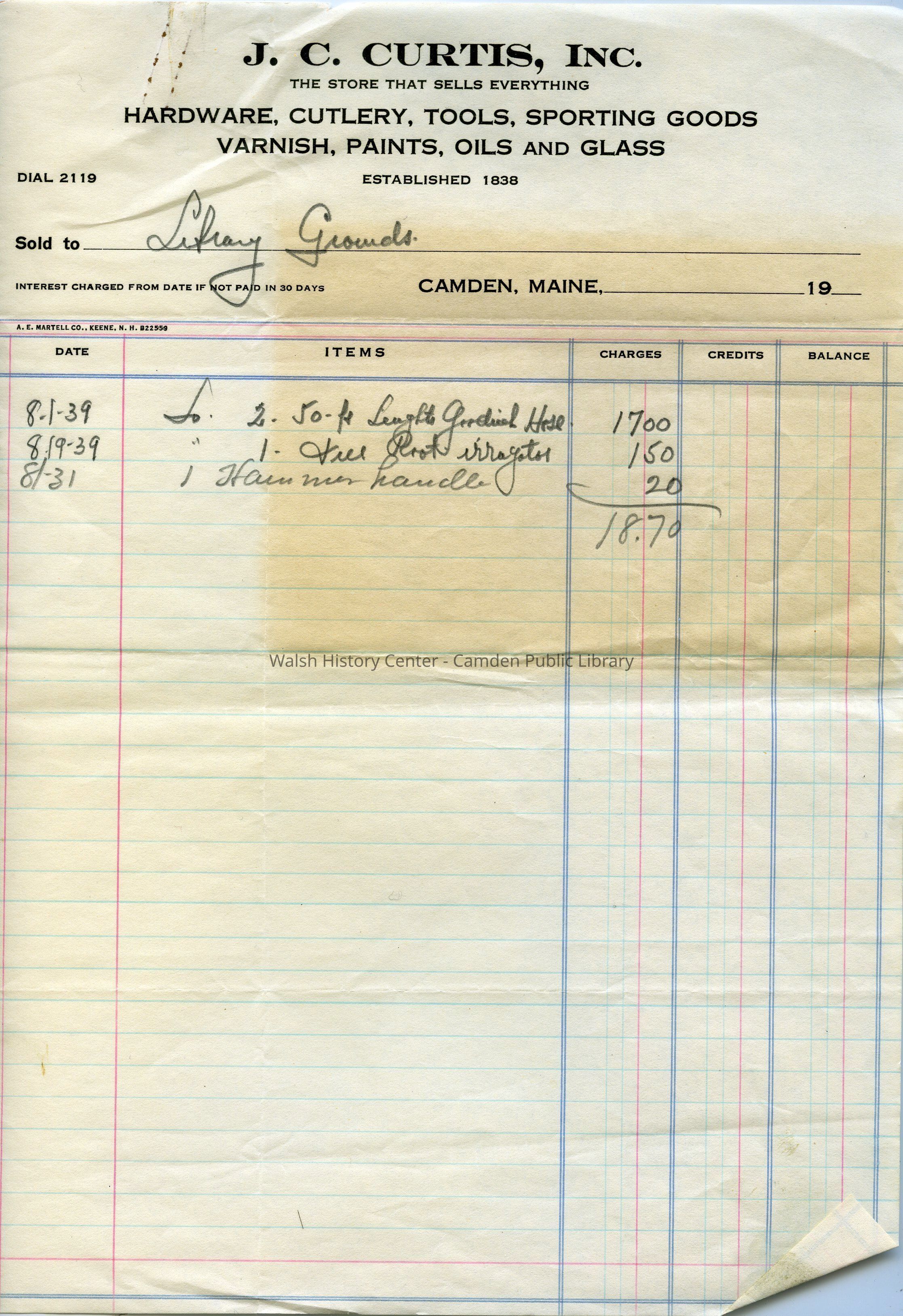Contains billheads, stationery, bills, letterheads, and receipts from several Camden area businesses. These items date from the 1880's through the 1950's. Partial list of businesses represented: G.W. Achorn; Allen Insurance Agency; Ayers Market; Bay View House; Bay View Street Garage; Boynton's Pharmacy; Brown & Hobbs lumber; Brown's Market; Camden Anchor-Rockland Machine Co.; Camden & Rockland Water Company; Camden Farmer's Union; Camden Lumber Company; Camden Publishing Company; Camden Yacht Building and Railway Company; Carleton, Pascal & Co.; J.C. Curtis Hardware; Follansbee & Wood; Haskell & Corthell; J.H. Hobbs Company; Lenfest's Automotive Service; J.L. Locke; Maiden Cliff Rebekah Lodge; Maine Insane Hospital; The Megunticook Press; A.H. Parsons; Pendleton Dairy; S.G. Ritterbush, contractor; Rockland, Thomaston & Camden Street Railway; S.E. & H.L. Shepherd Company; TalbotArchive Details