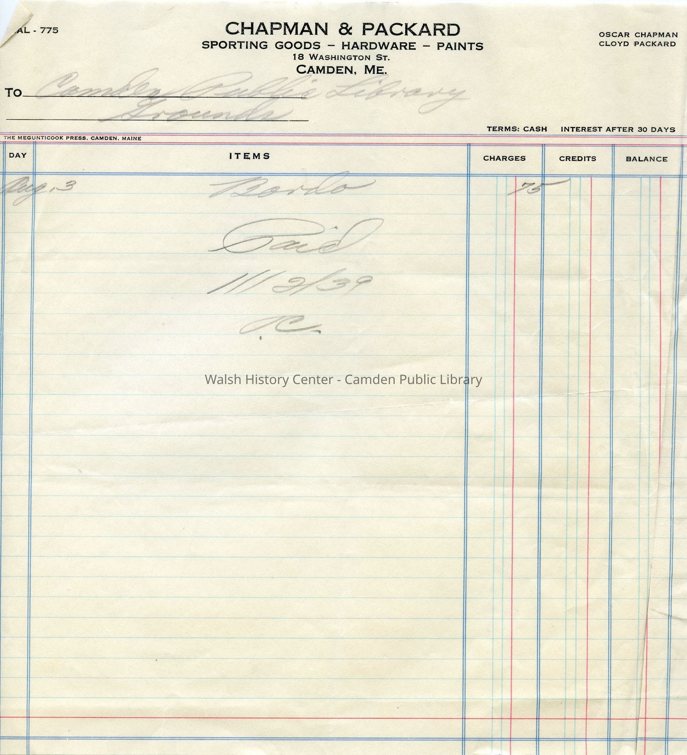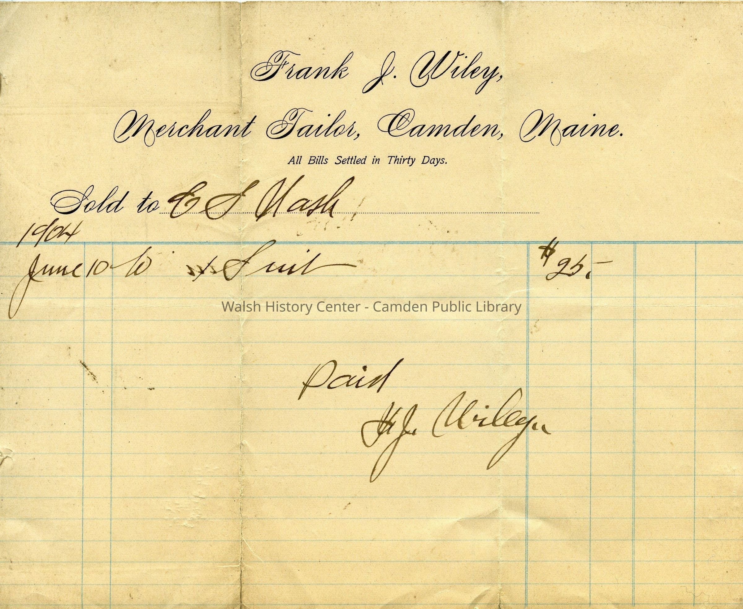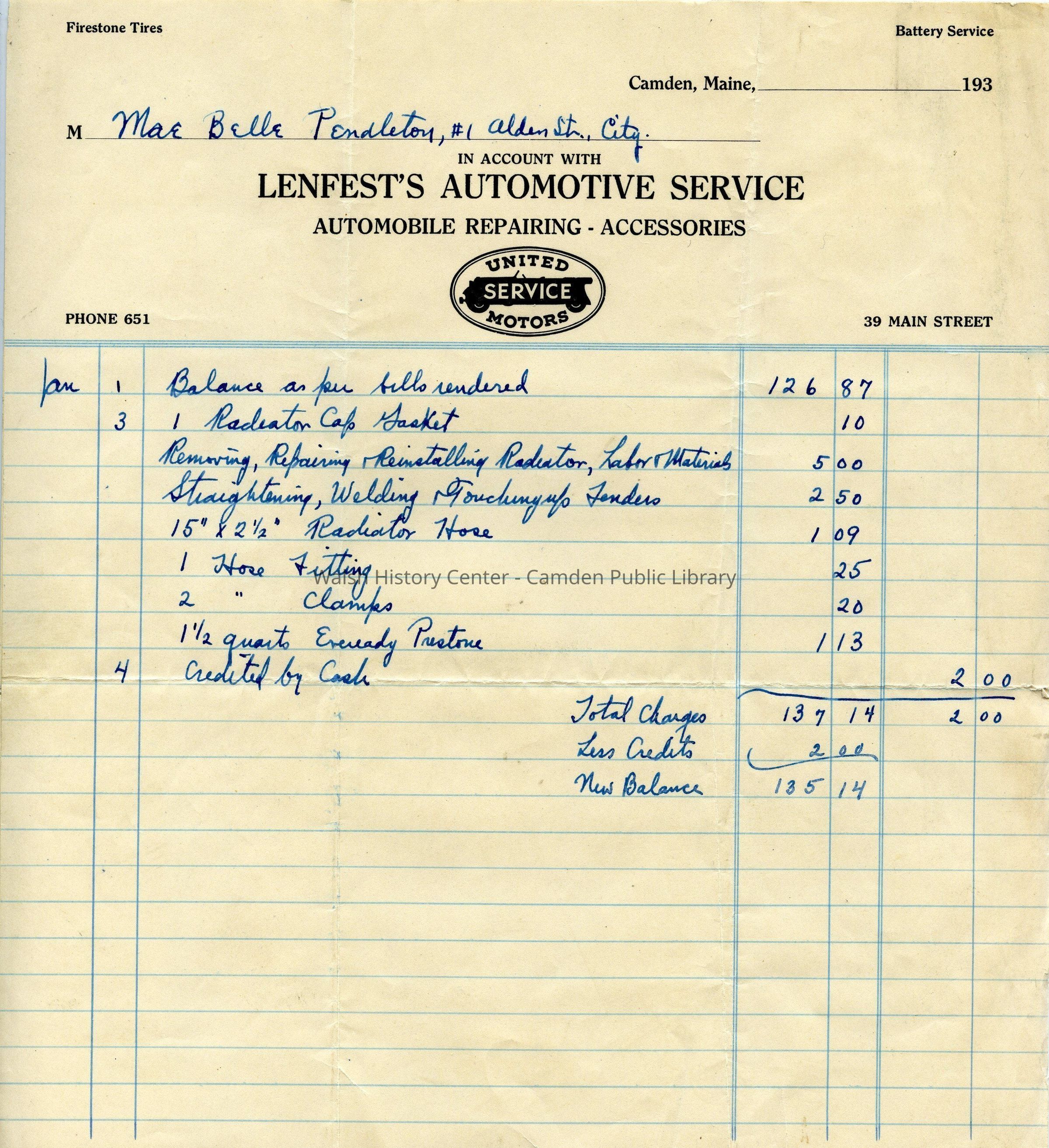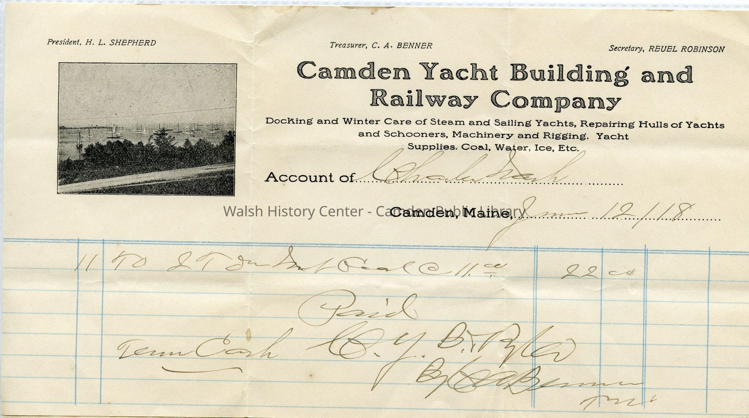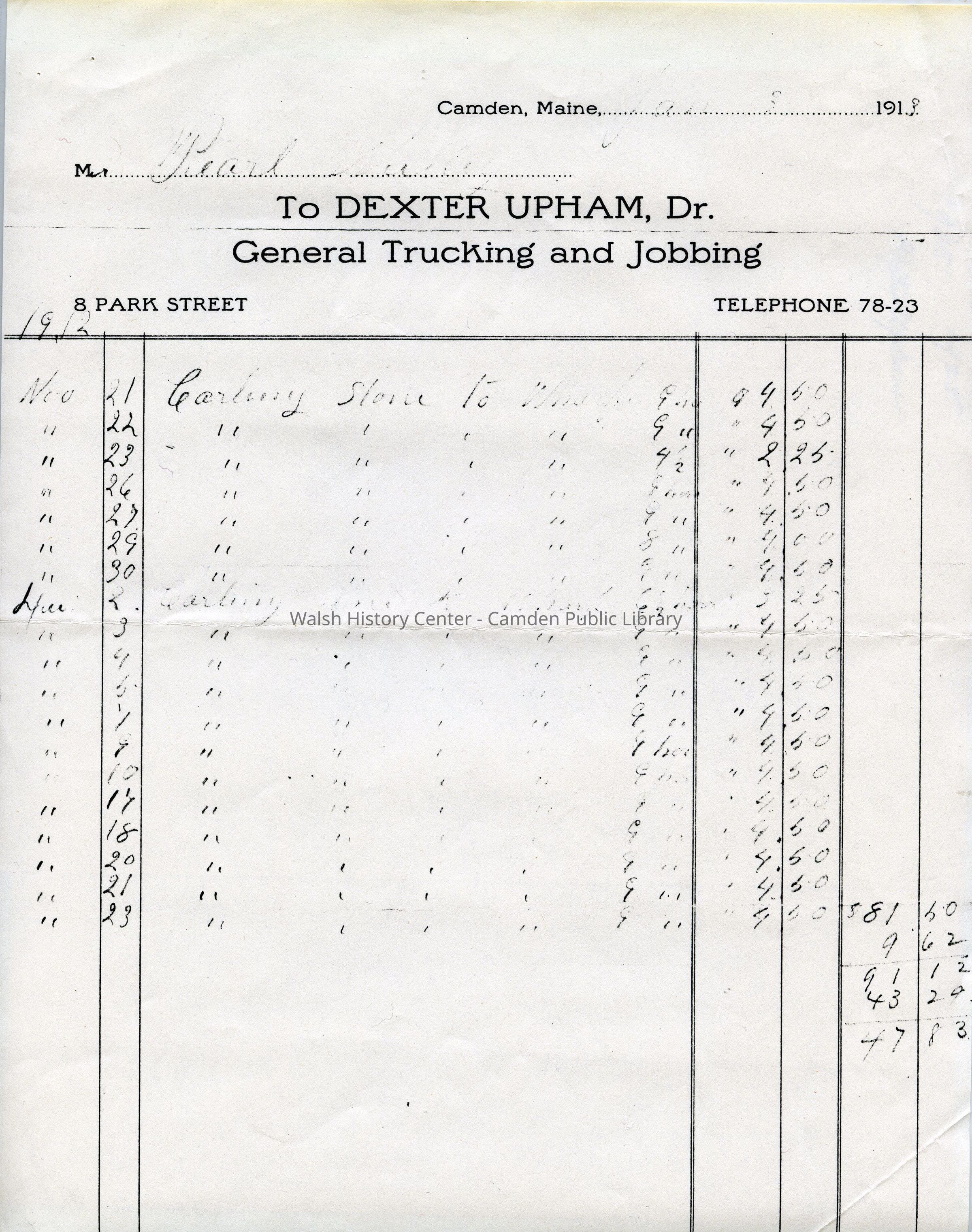 Contains billheads, stationery, bills, letterheads, and receipts from several Camden area businesses. These items date from the 1880's through the 1950's. Partial list of businesses represented: G.W. Achorn; Allen Insurance Agency; Ayers Market; Bay View House; Bay View Street Garage; Boynton's Pharmacy; Brown & Hobbs lumber; Brown's Market; Camden Anchor-Rockland Machine Co.; Camden & Rockland Water Company; Camden Farmer's Union; Camden Lumber Company; Camden Publishing Company; Camden Yacht Building and Railway Company; Carleton, Pascal & Co.; J.C. Curtis Hardware; Follansbee & Wood; Haskell & Corthell; J.H. Hobbs Company; Lenfest's Automotive Service; J.L. Locke; Maiden Cliff Rebekah Lodge; Maine Insane Hospital; The Megunticook Press; A.H. Parsons; Pendleton Dairy; S.G. Ritterbush, contractor; Rockland, Thomaston & Camden Street Railway; S.E. & H.L. Shepherd Company; TalbotArchive Details