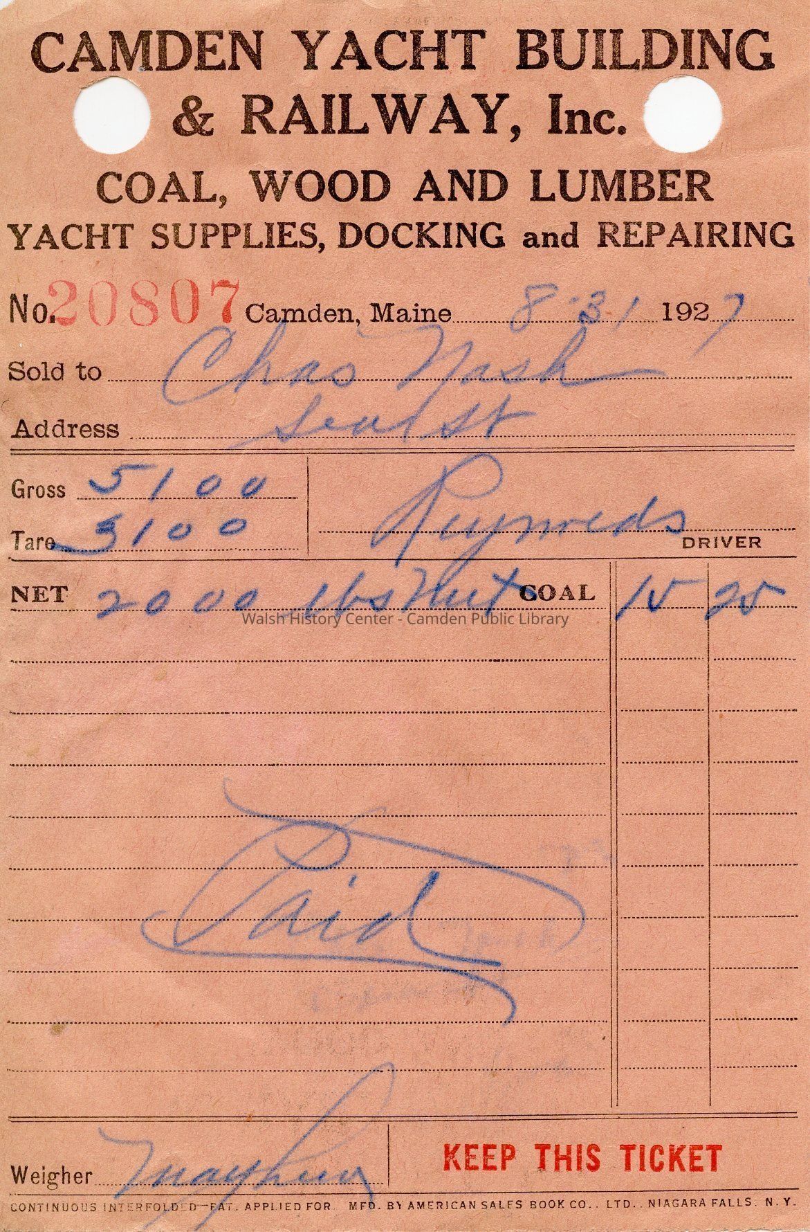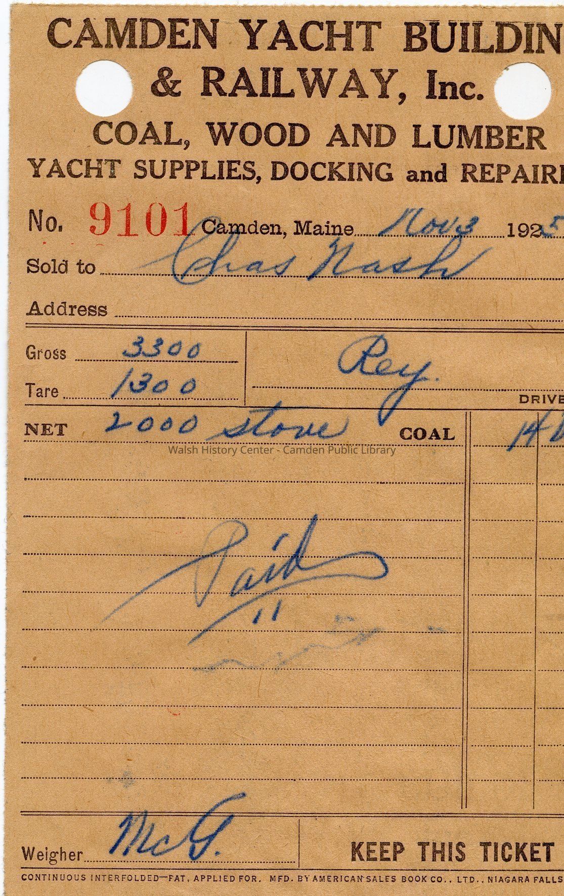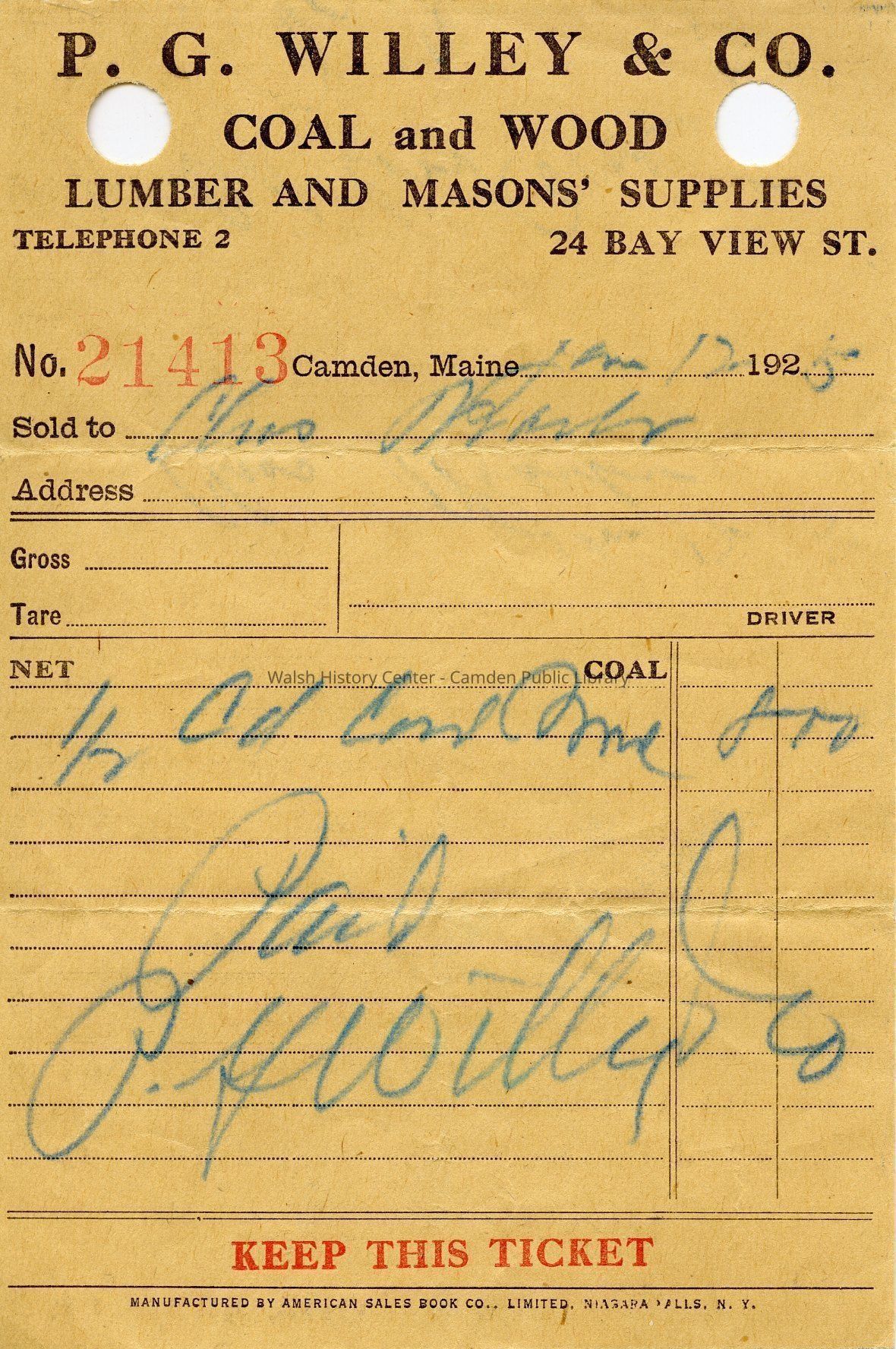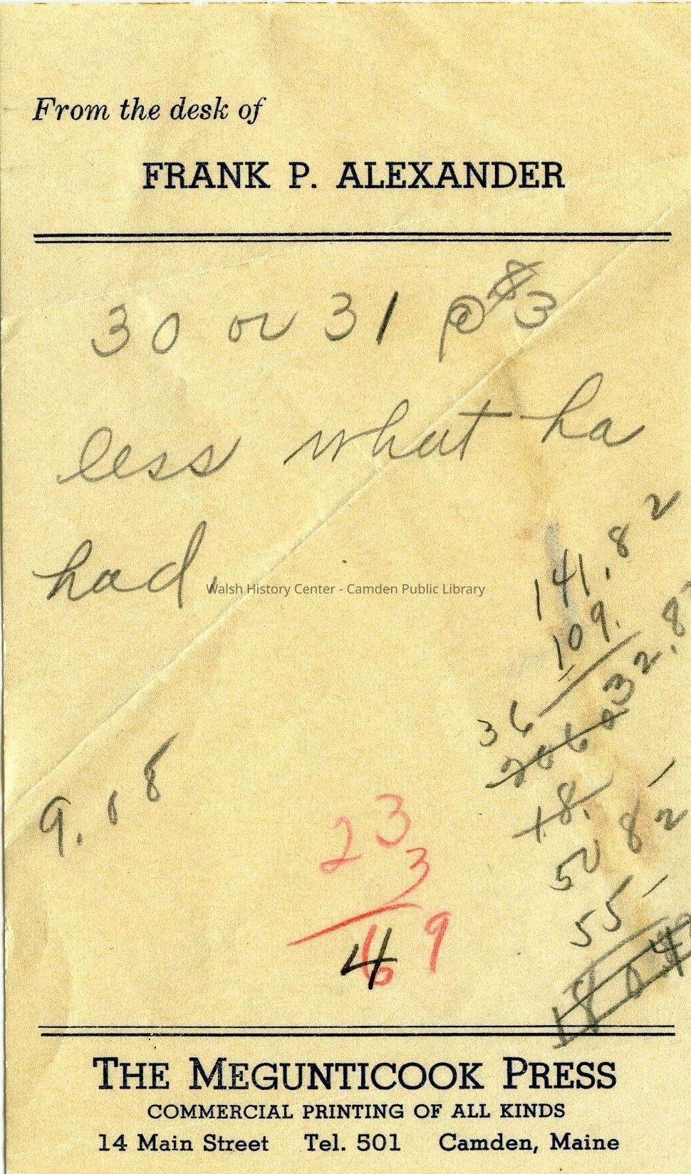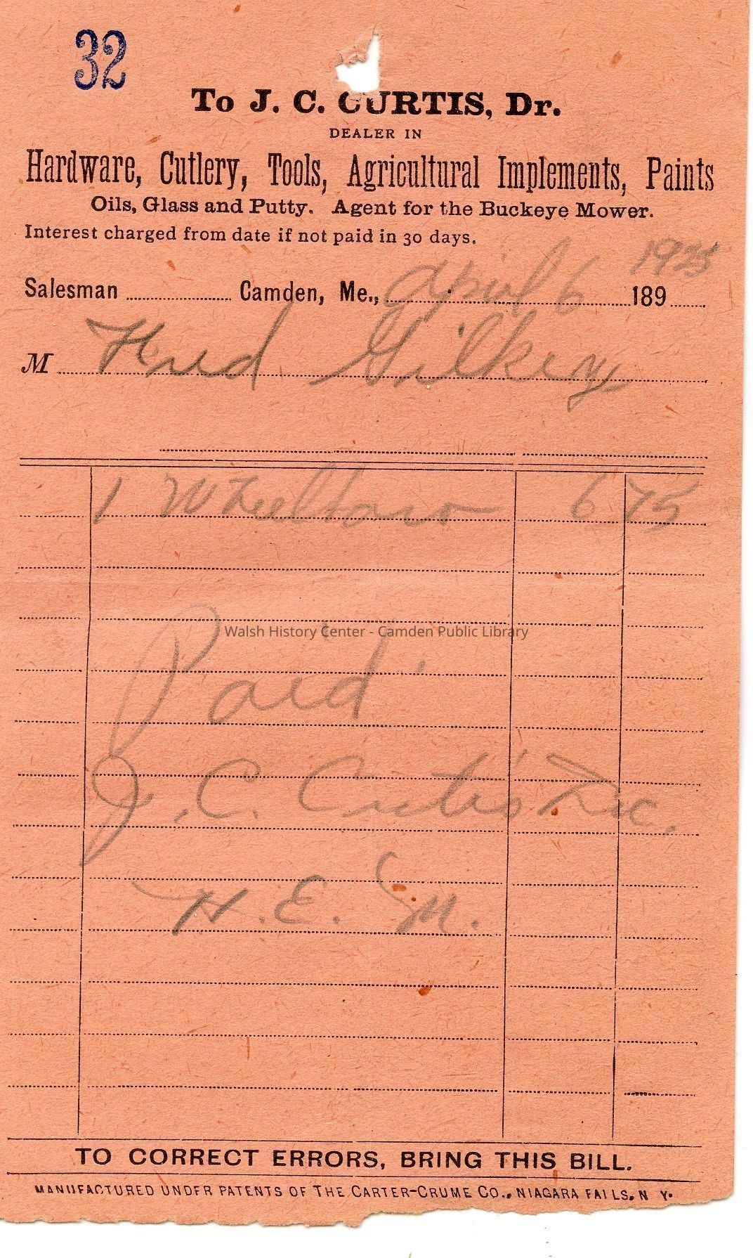 Contains billheads, stationery, bills, letterheads, and receipts from several Camden area businesses. These items date from the 1880's through the 1950's. Partial list of businesses represented: G.W. Achorn; Allen Insurance Agency; Ayers Market; Bay View House; Bay View Street Garage; Boynton's Pharmacy; Brown & Hobbs lumber; Brown's Market; Camden Anchor-Rockland Machine Co.; Camden & Rockland Water Company; Camden Farmer's Union; Camden Lumber Company; Camden Publishing Company; Camden Yacht Building and Railway Company; Carleton, Pascal & Co.; J.C. Curtis Hardware; Follansbee & Wood; Haskell & Corthell; J.H. Hobbs Company; Lenfest's Automotive Service; J.L. Locke; Maiden Cliff Rebekah Lodge; Maine Insane Hospital; The Megunticook Press; A.H. Parsons; Pendleton Dairy; S.G. Ritterbush, contractor; Rockland, Thomaston & Camden Street Railway; S.E. & H.L. Shepherd Company; TalbotArchive Details