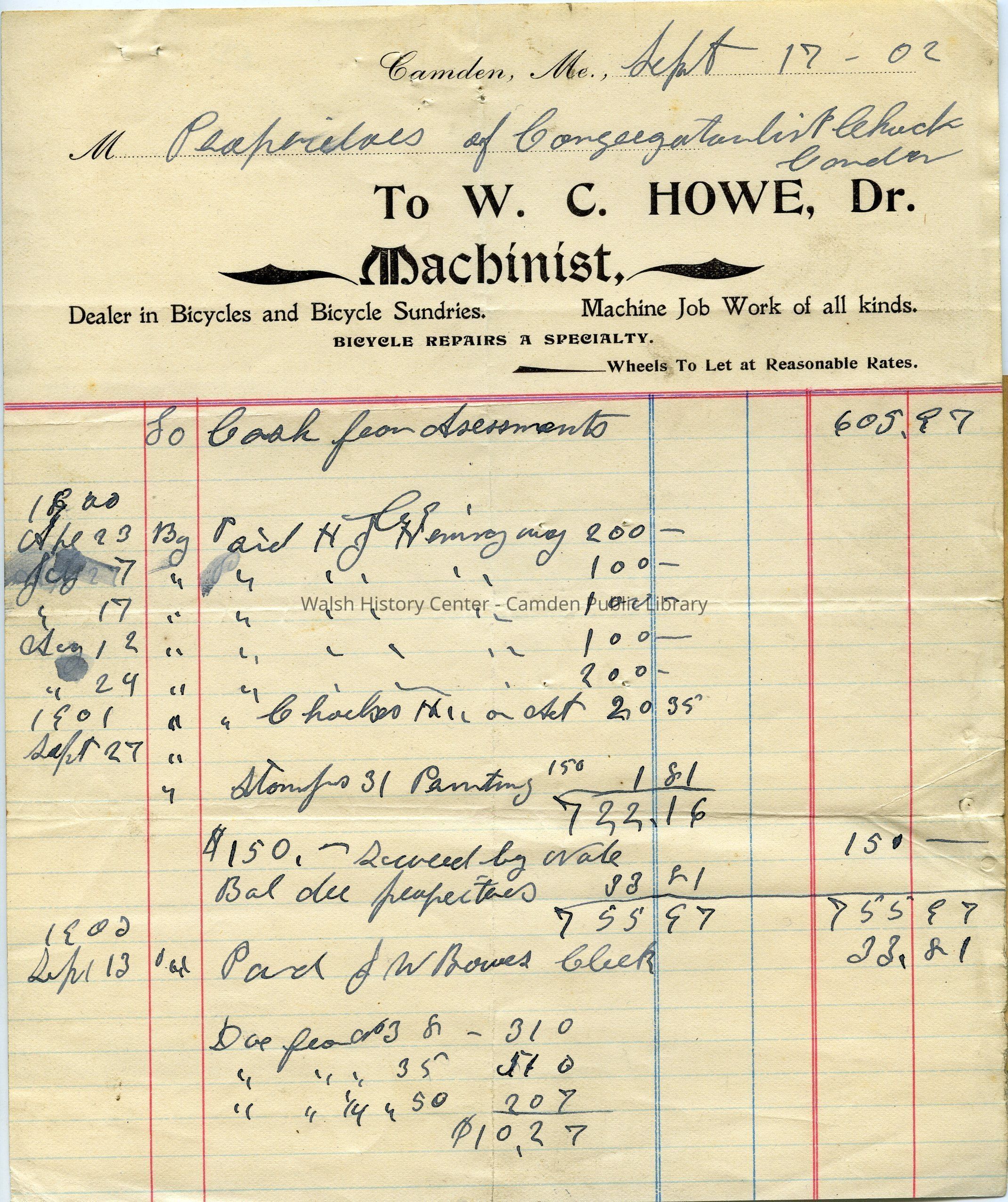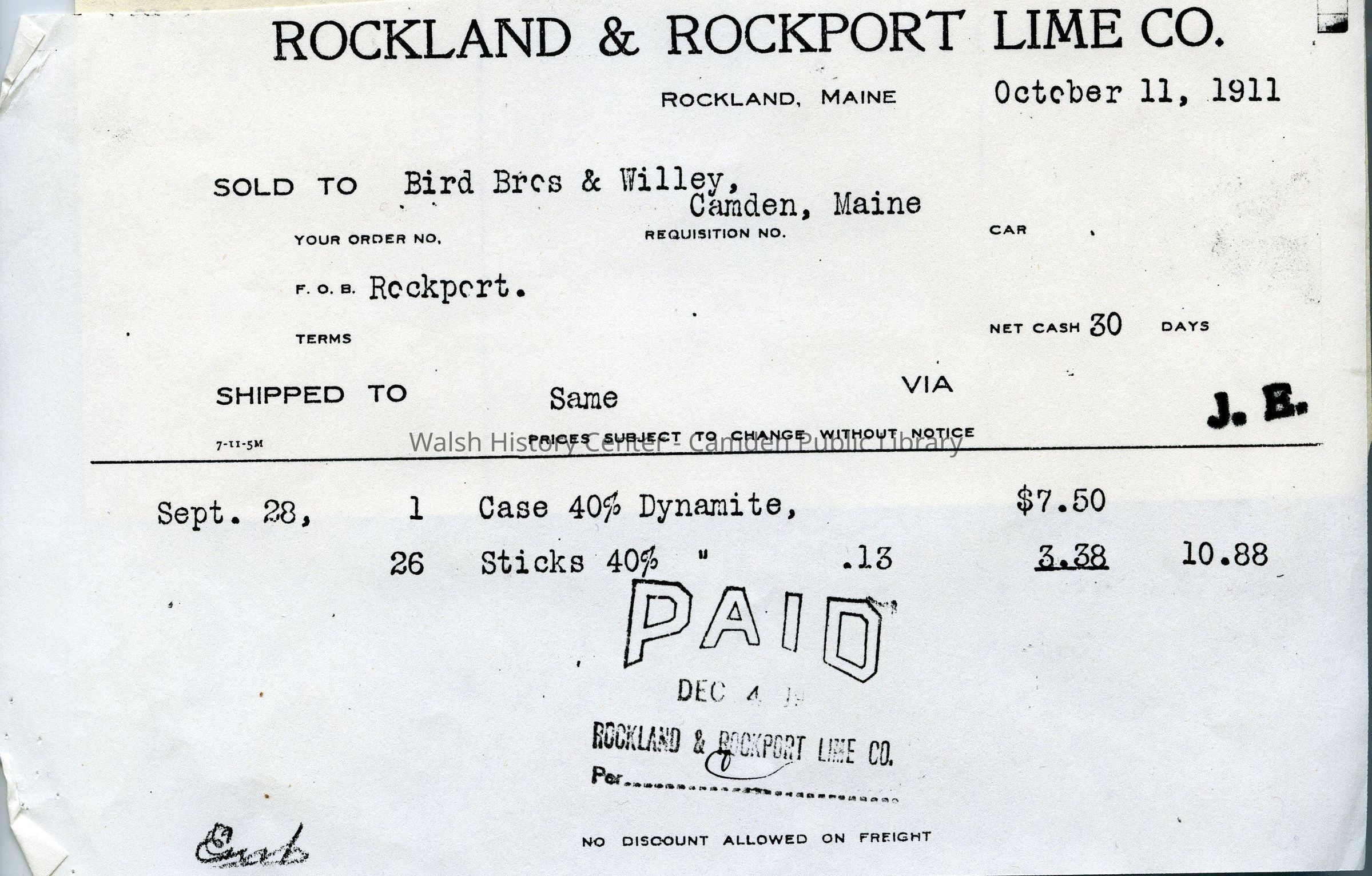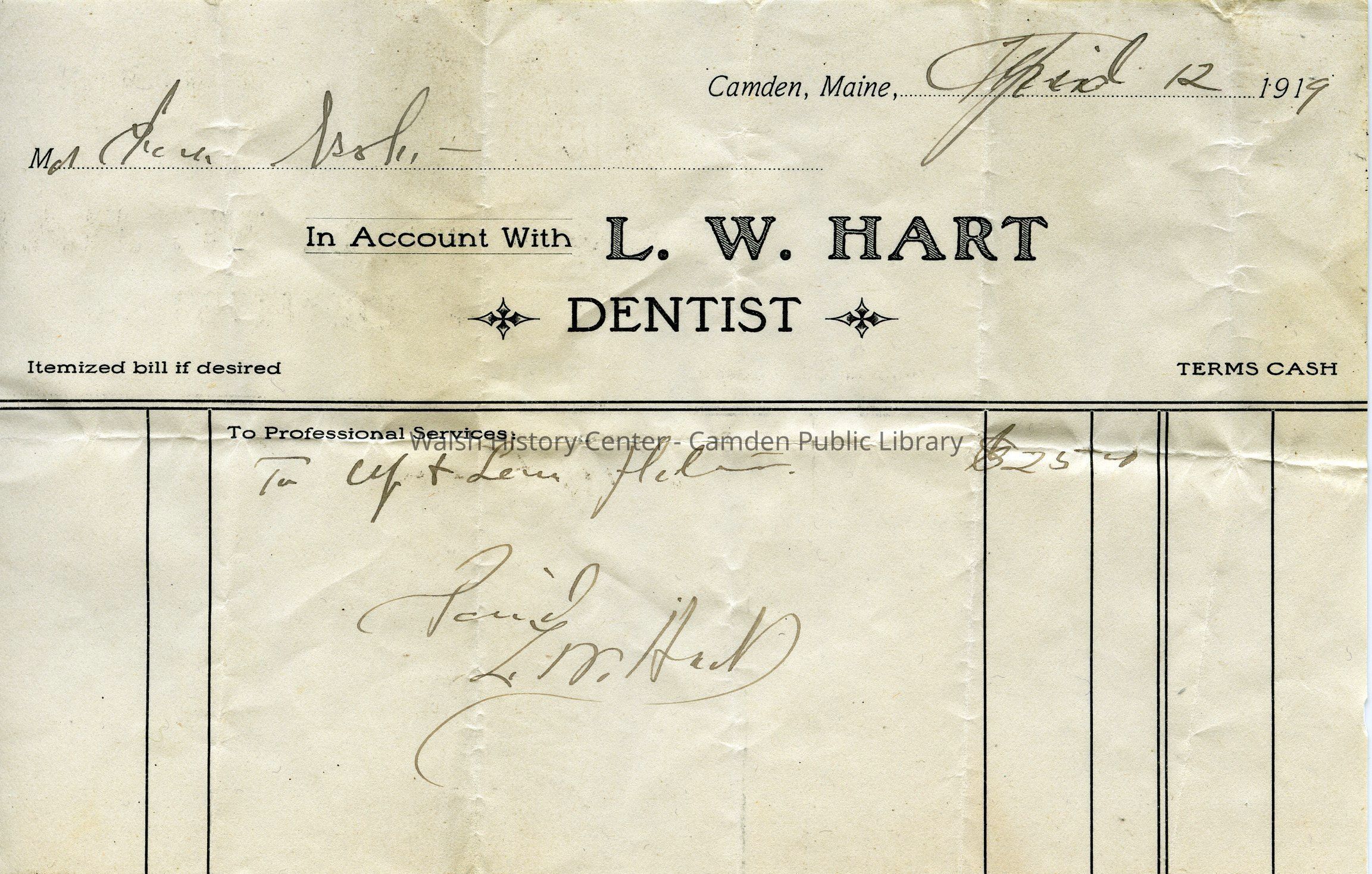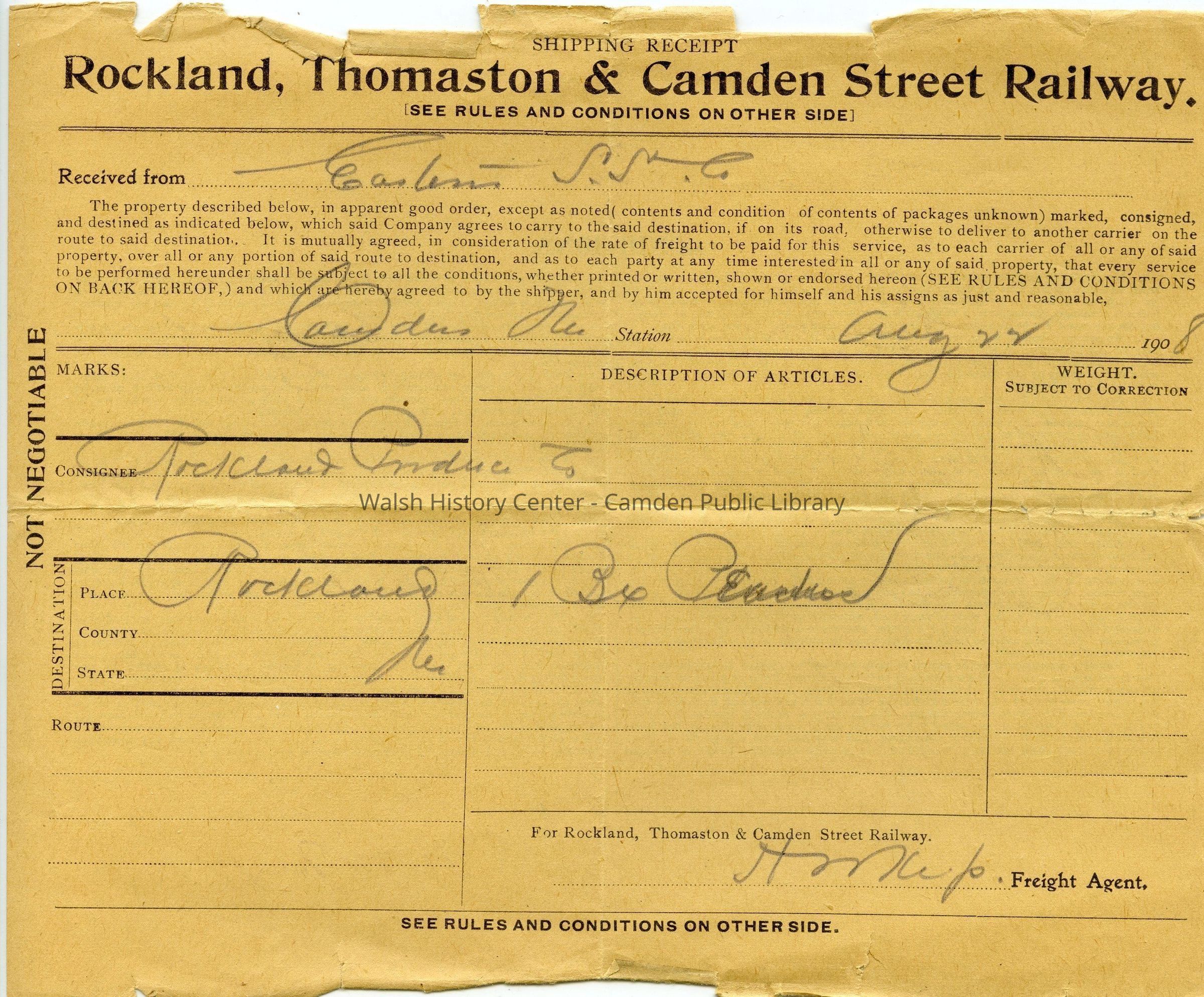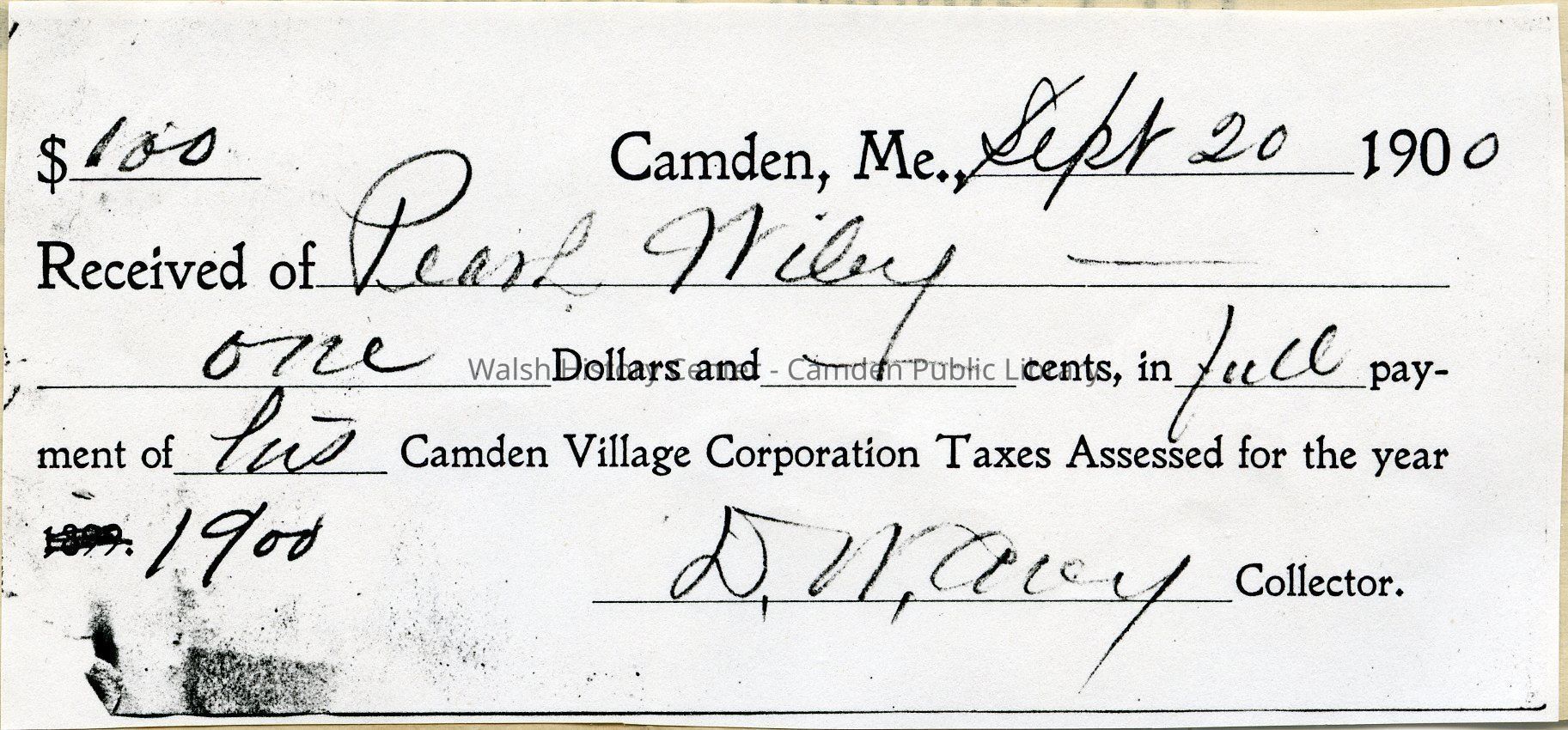 Contains billheads, stationery, bills, letterheads, and receipts from several Camden area businesses. These items date from the 1880's through the 1950's. Partial list of businesses represented: G.W. Achorn; Allen Insurance Agency; Ayers Market; Bay View House; Bay View Street Garage; Boynton's Pharmacy; Brown & Hobbs lumber; Brown's Market; Camden Anchor-Rockland Machine Co.; Camden & Rockland Water Company; Camden Farmer's Union; Camden Lumber Company; Camden Publishing Company; Camden Yacht Building and Railway Company; Carleton, Pascal & Co.; J.C. Curtis Hardware; Follansbee & Wood; Haskell & Corthell; J.H. Hobbs Company; Lenfest's Automotive Service; J.L. Locke; Maiden Cliff Rebekah Lodge; Maine Insane Hospital; The Megunticook Press; A.H. Parsons; Pendleton Dairy; S.G. Ritterbush, contractor; Rockland, Thomaston & Camden Street Railway; S.E. & H.L. Shepherd Company; TalbotArchive Details
