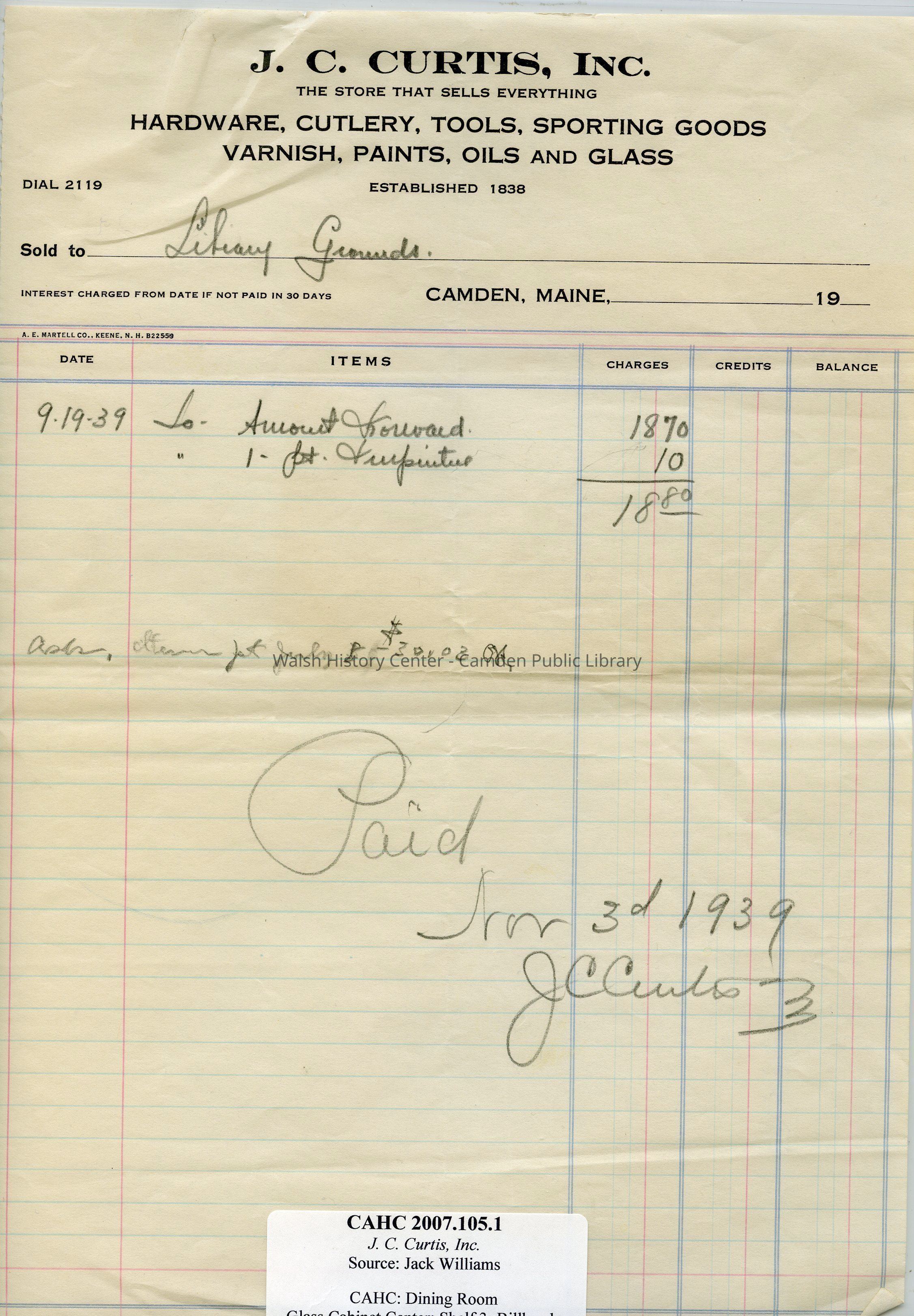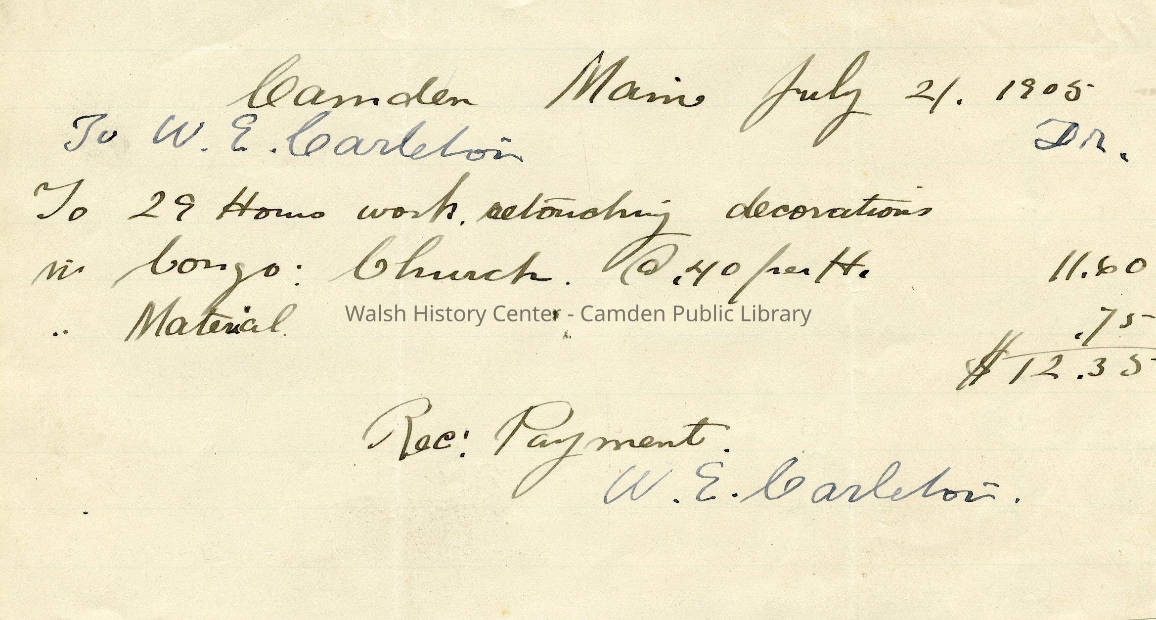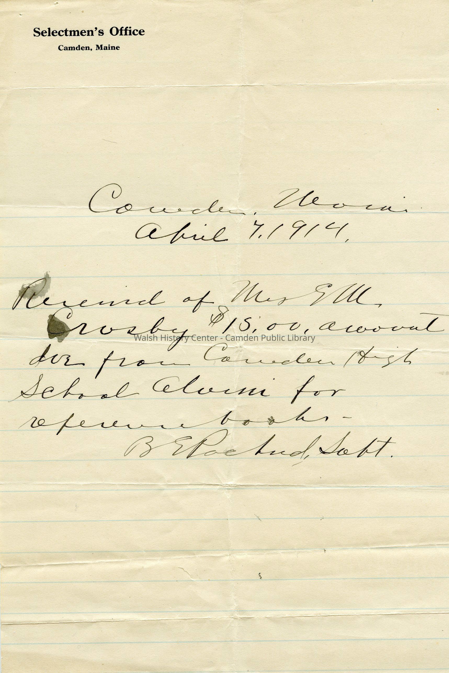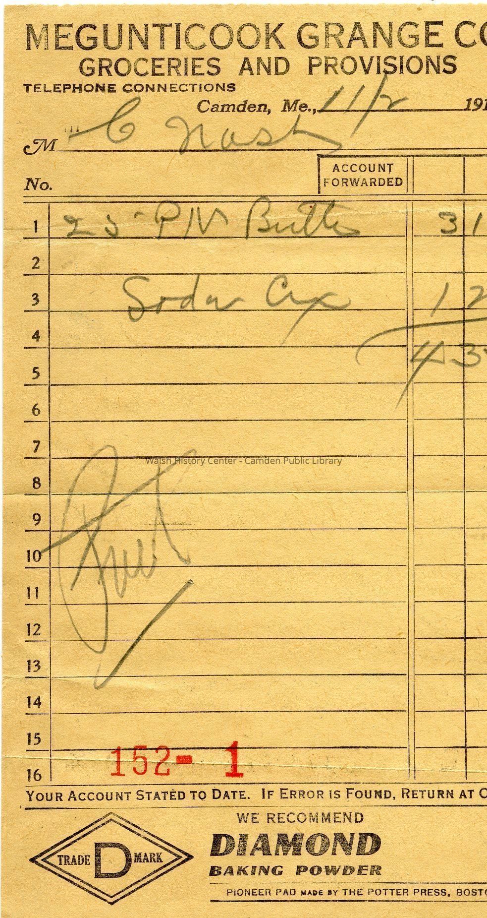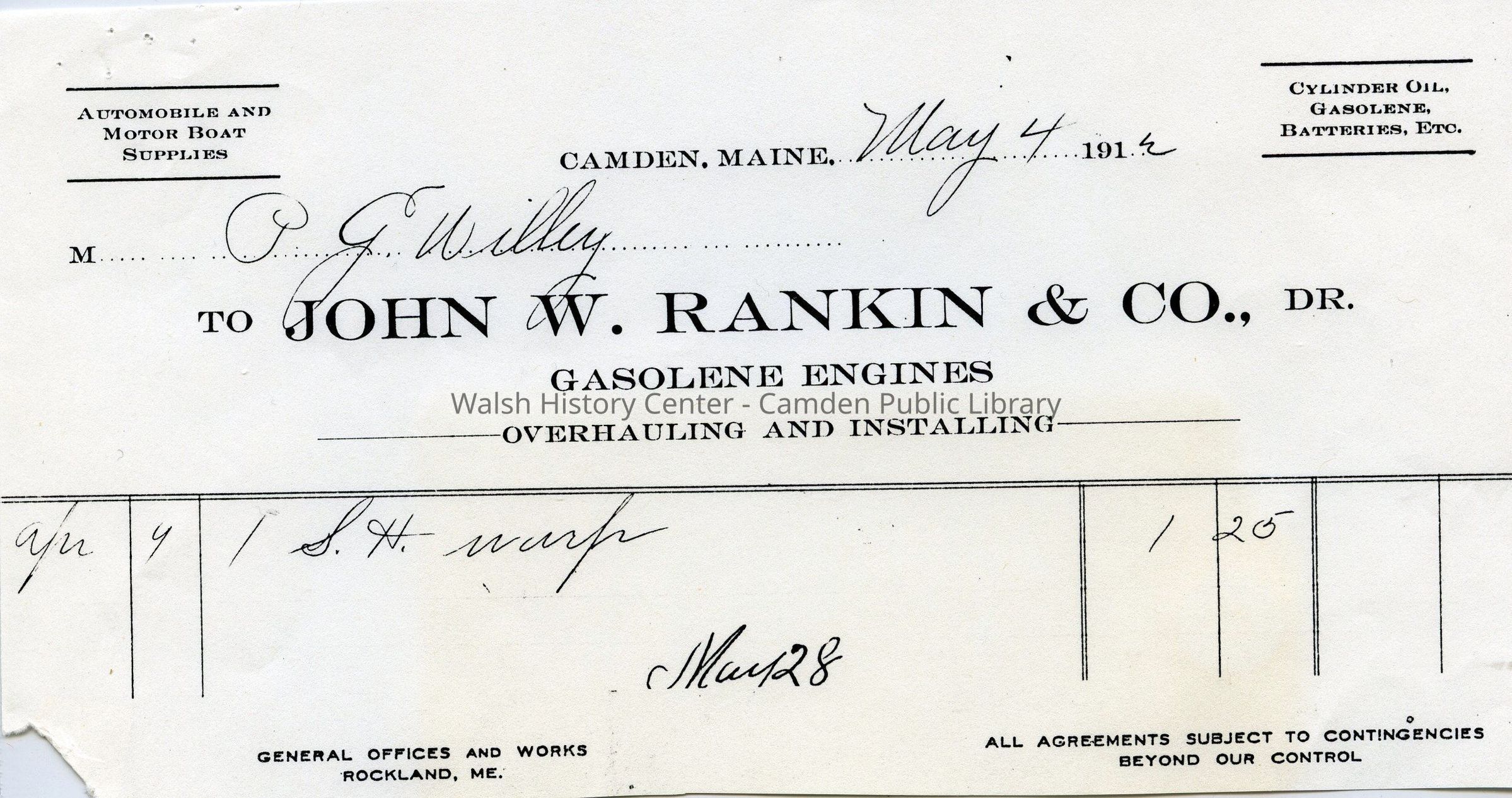 Contains billheads, stationery, bills, letterheads, and receipts from several Camden area businesses. These items date from the 1880's through the 1950's. Partial list of businesses represented: G.W. Achorn; Allen Insurance Agency; Ayers Market; Bay View House; Bay View Street Garage; Boynton's Pharmacy; Brown & Hobbs lumber; Brown's Market; Camden Anchor-Rockland Machine Co.; Camden & Rockland Water Company; Camden Farmer's Union; Camden Lumber Company; Camden Publishing Company; Camden Yacht Building and Railway Company; Carleton, Pascal & Co.; J.C. Curtis Hardware; Follansbee & Wood; Haskell & Corthell; J.H. Hobbs Company; Lenfest's Automotive Service; J.L. Locke; Maiden Cliff Rebekah Lodge; Maine Insane Hospital; The Megunticook Press; A.H. Parsons; Pendleton Dairy; S.G. Ritterbush, contractor; Rockland, Thomaston & Camden Street Railway; S.E. & H.L. Shepherd Company; TalbotArchive Details