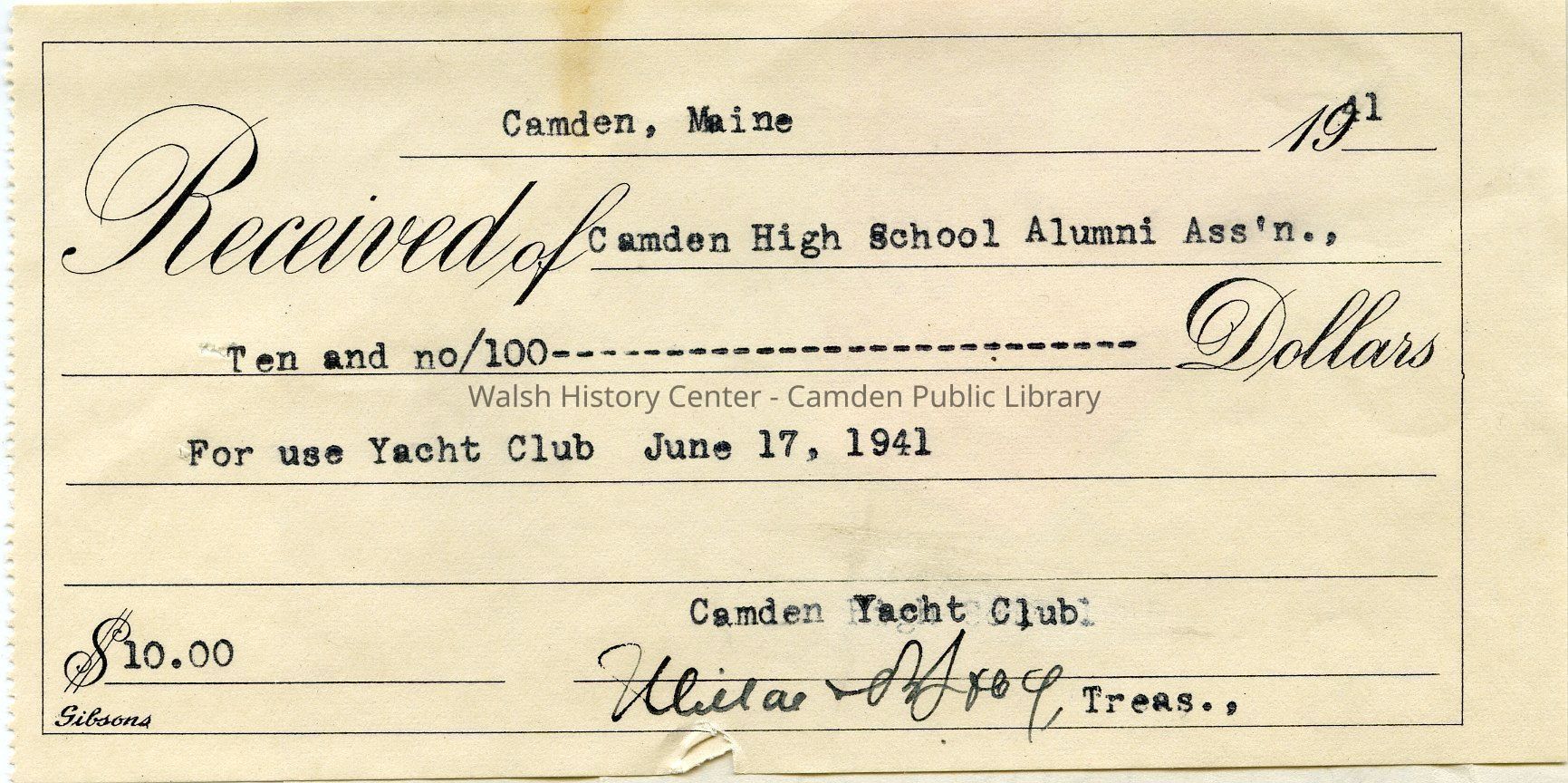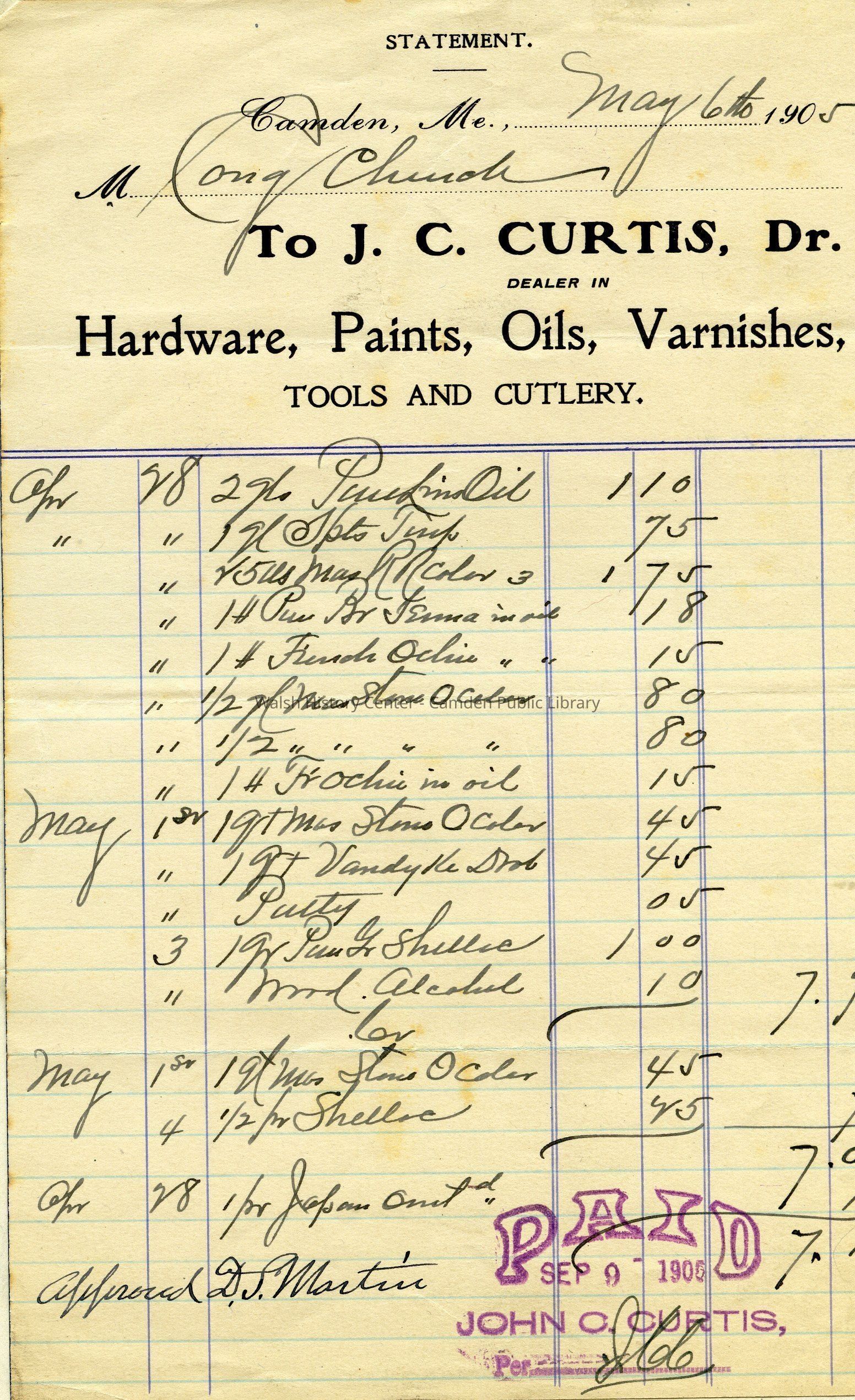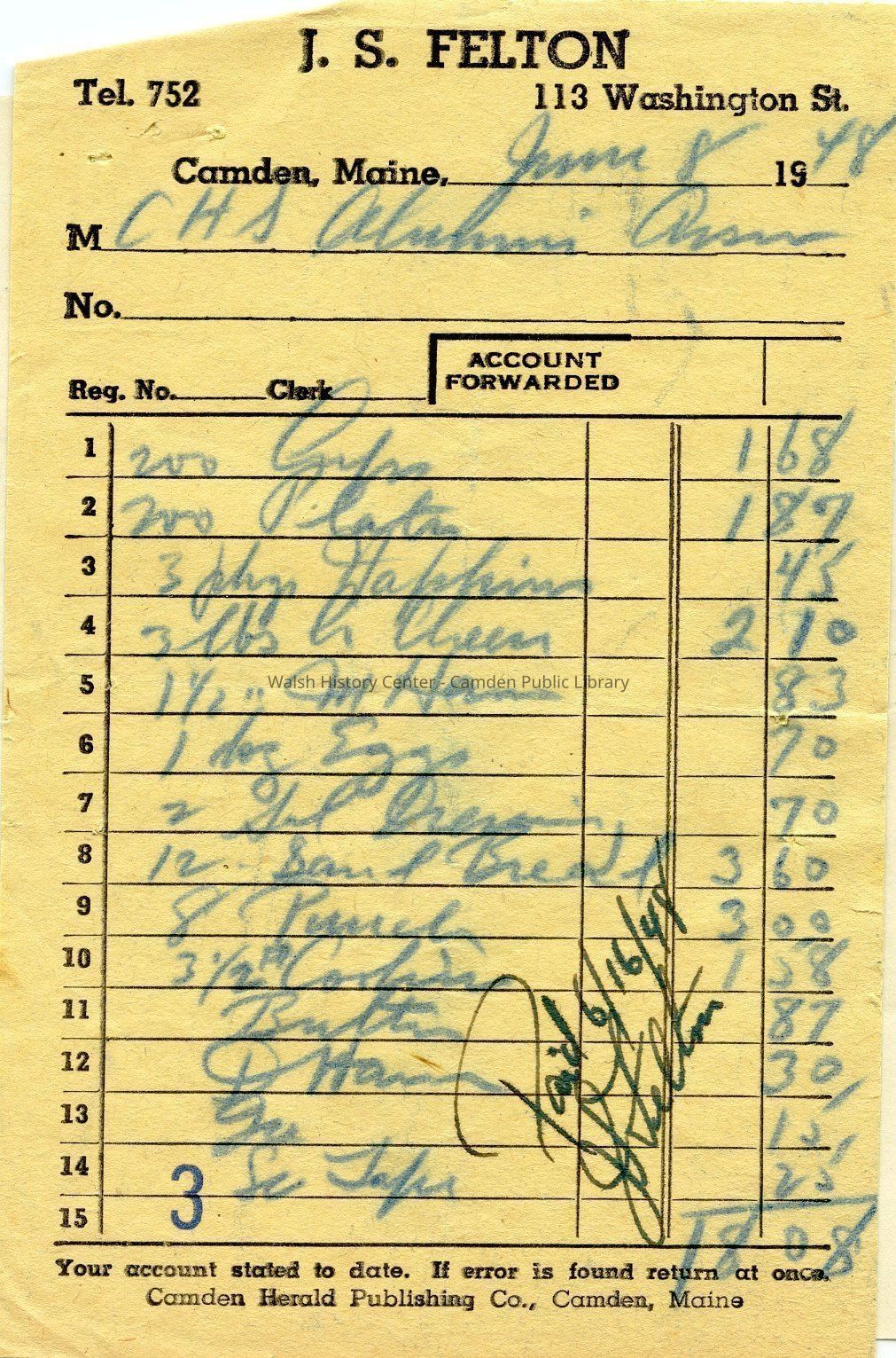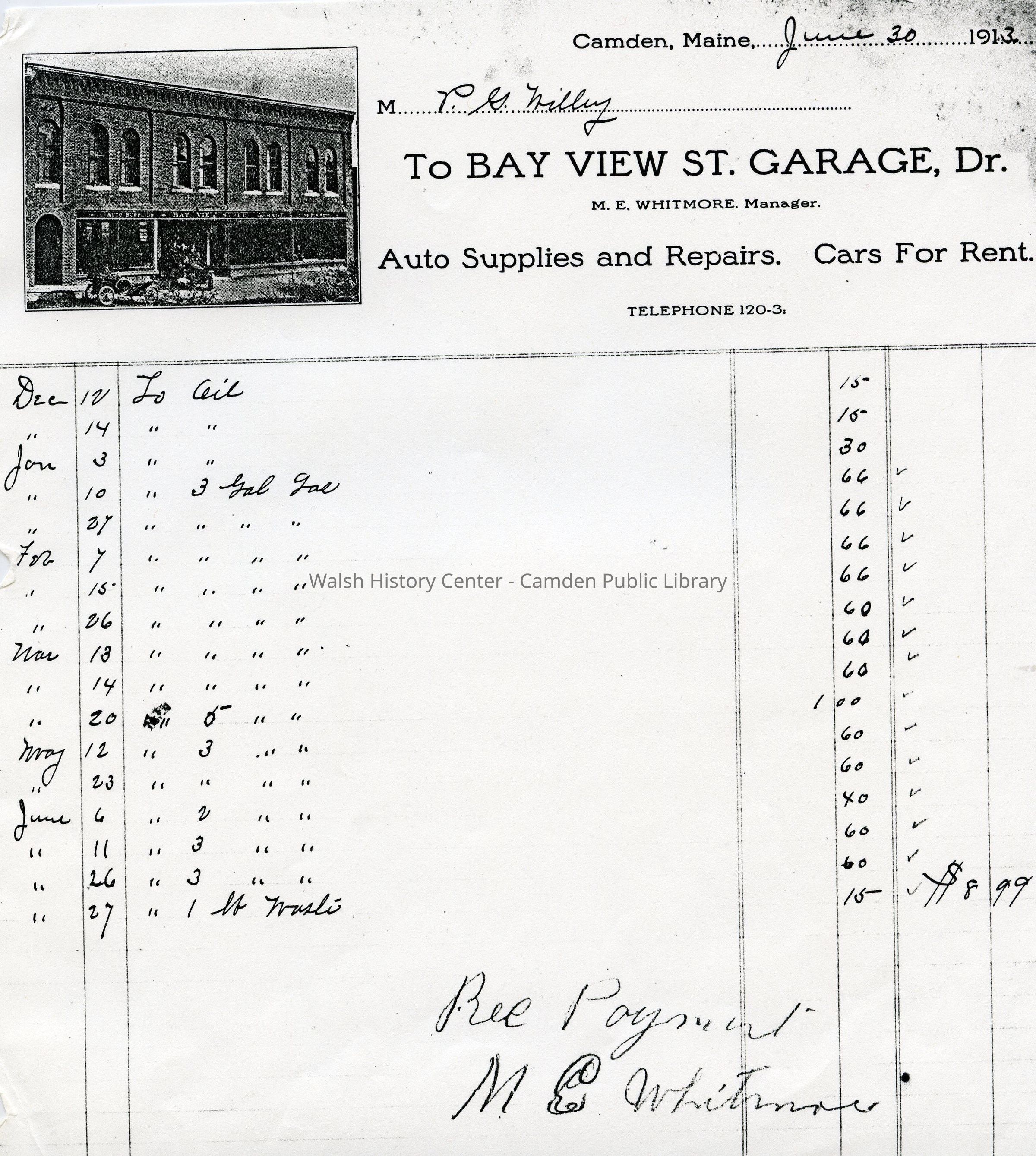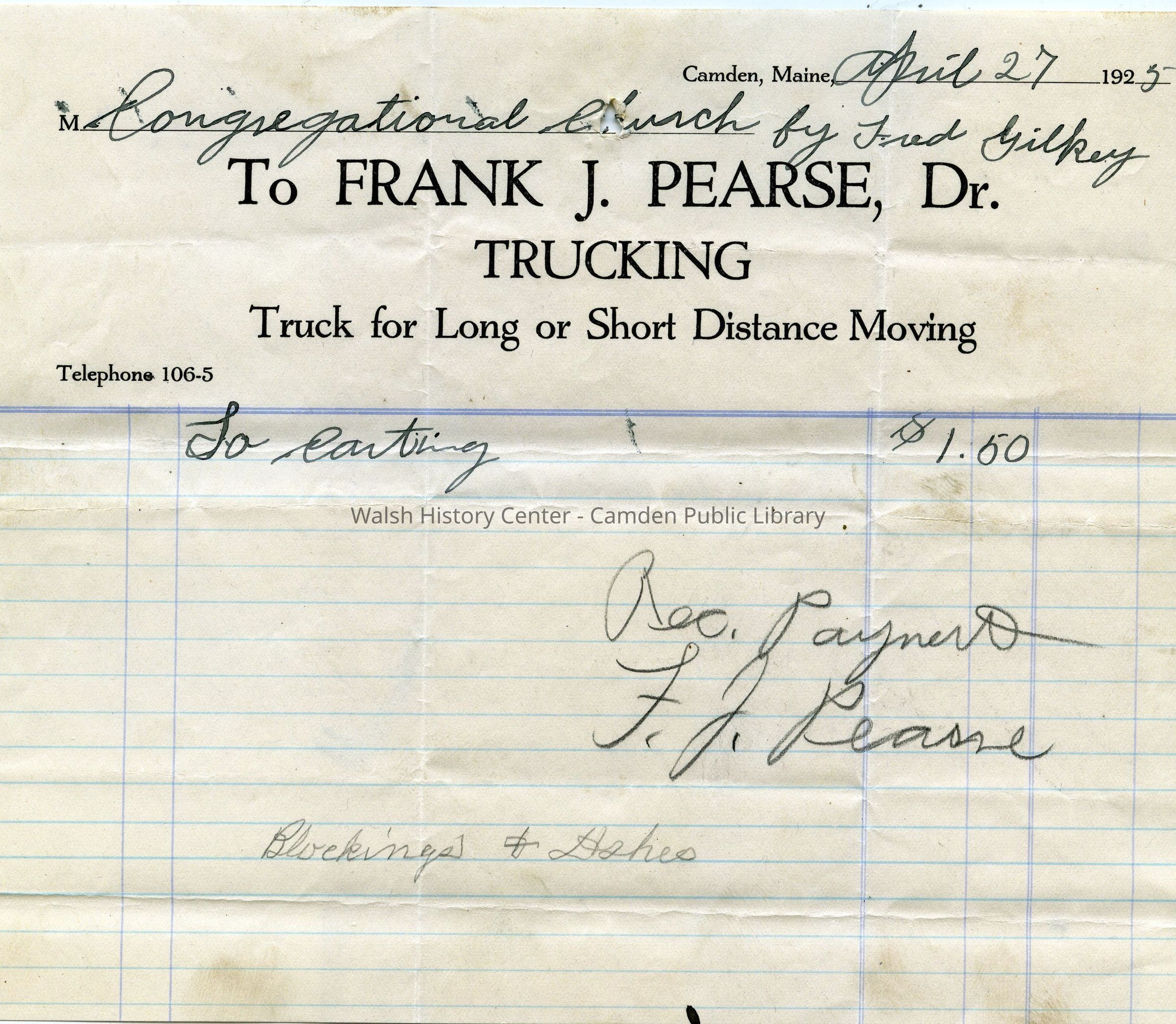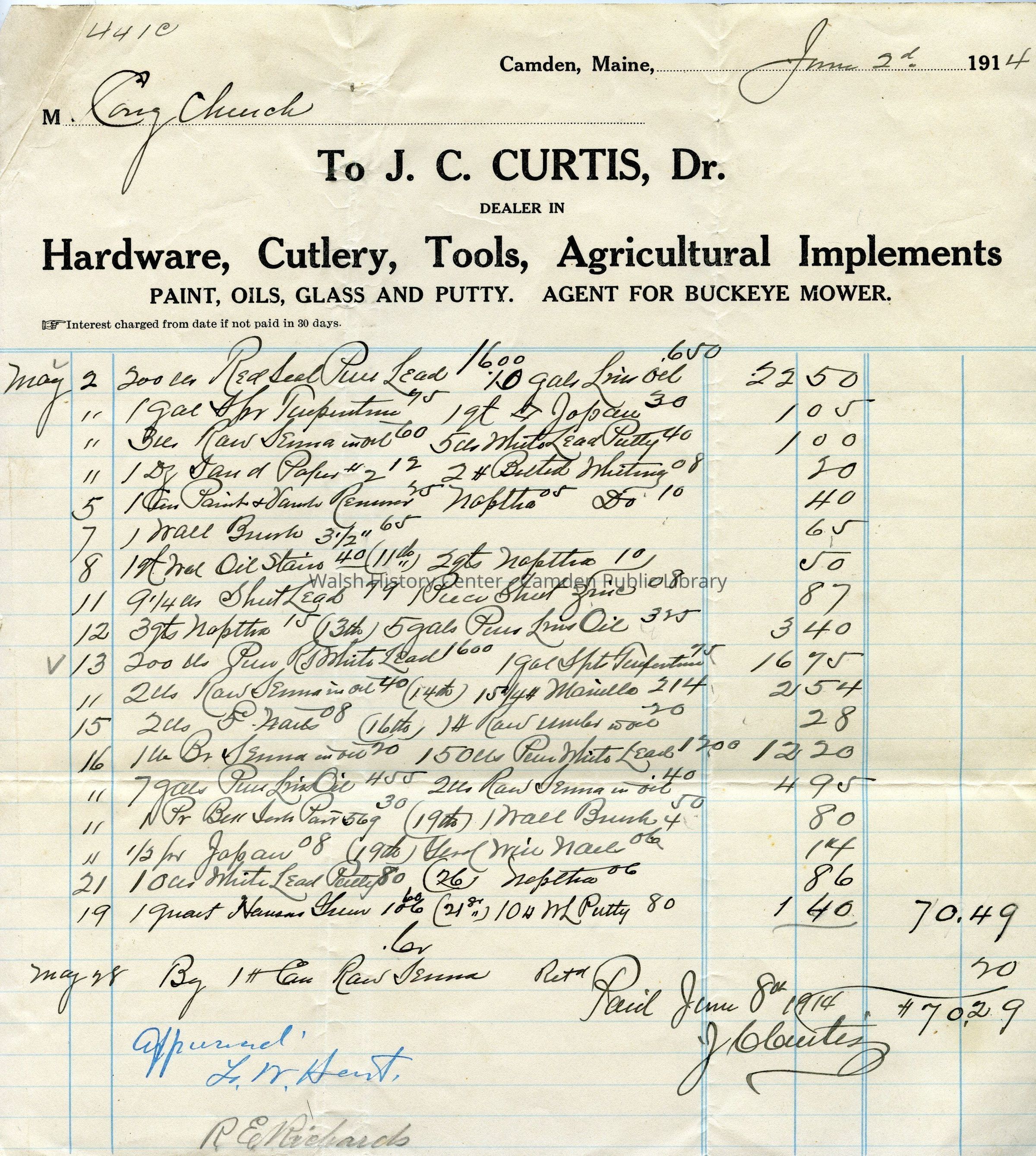 Contains billheads, stationery, bills, letterheads, and receipts from several Camden area businesses. These items date from the 1880's through the 1950's. Partial list of businesses represented: G.W. Achorn; Allen Insurance Agency; Ayers Market; Bay View House; Bay View Street Garage; Boynton's Pharmacy; Brown & Hobbs lumber; Brown's Market; Camden Anchor-Rockland Machine Co.; Camden & Rockland Water Company; Camden Farmer's Union; Camden Lumber Company; Camden Publishing Company; Camden Yacht Building and Railway Company; Carleton, Pascal & Co.; J.C. Curtis Hardware; Follansbee & Wood; Haskell & Corthell; J.H. Hobbs Company; Lenfest's Automotive Service; J.L. Locke; Maiden Cliff Rebekah Lodge; Maine Insane Hospital; The Megunticook Press; A.H. Parsons; Pendleton Dairy; S.G. Ritterbush, contractor; Rockland, Thomaston & Camden Street Railway; S.E. & H.L. Shepherd Company; TalbotArchive Details