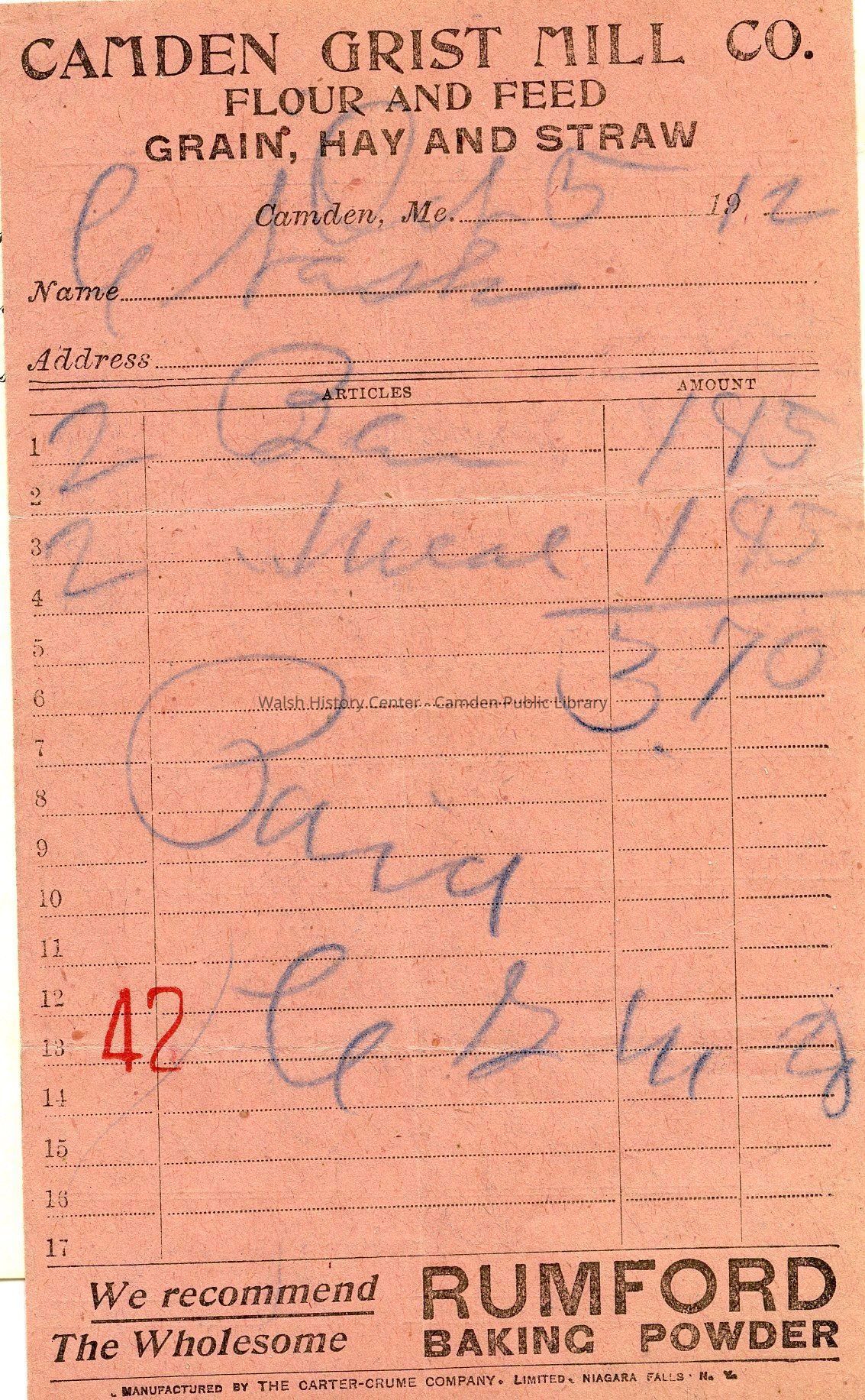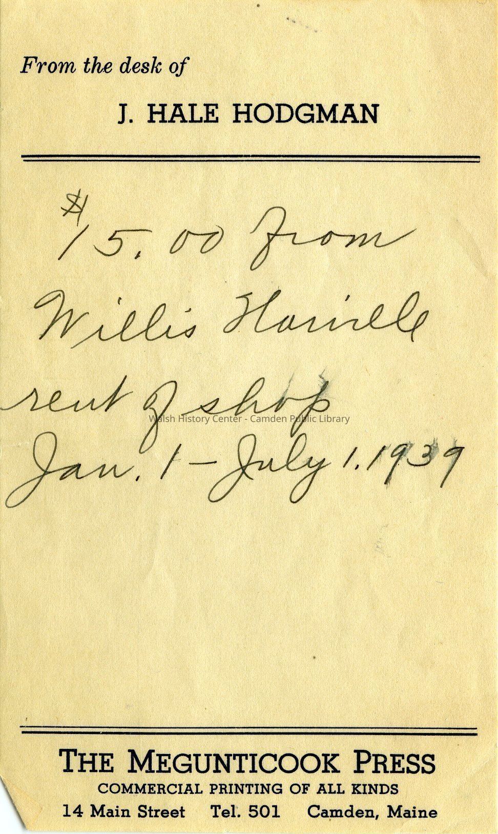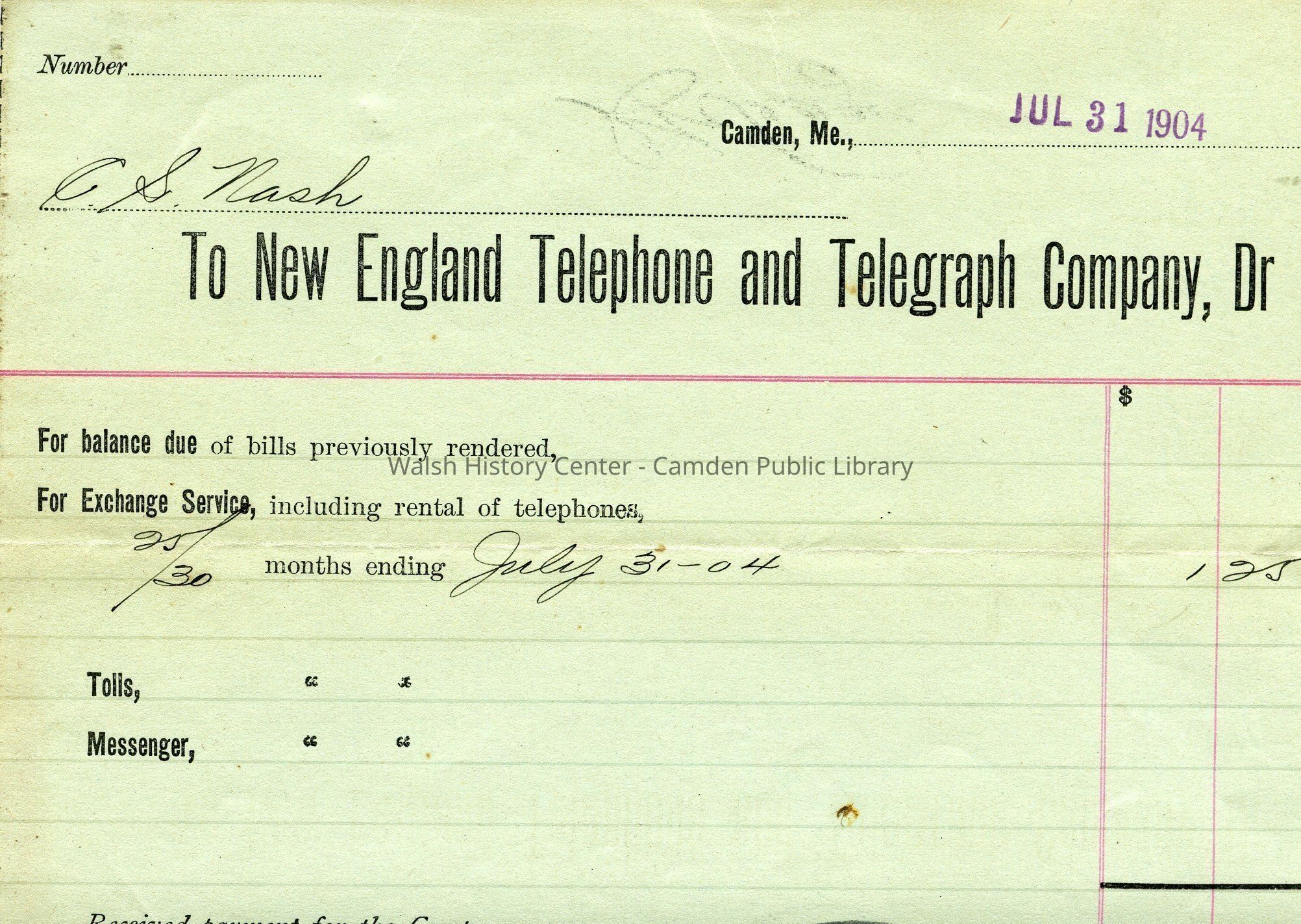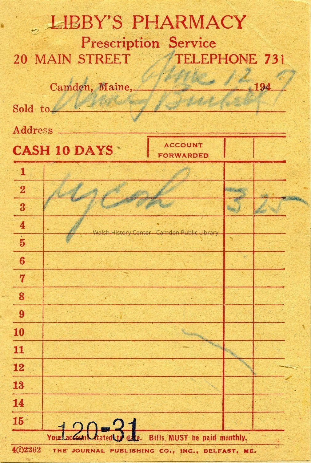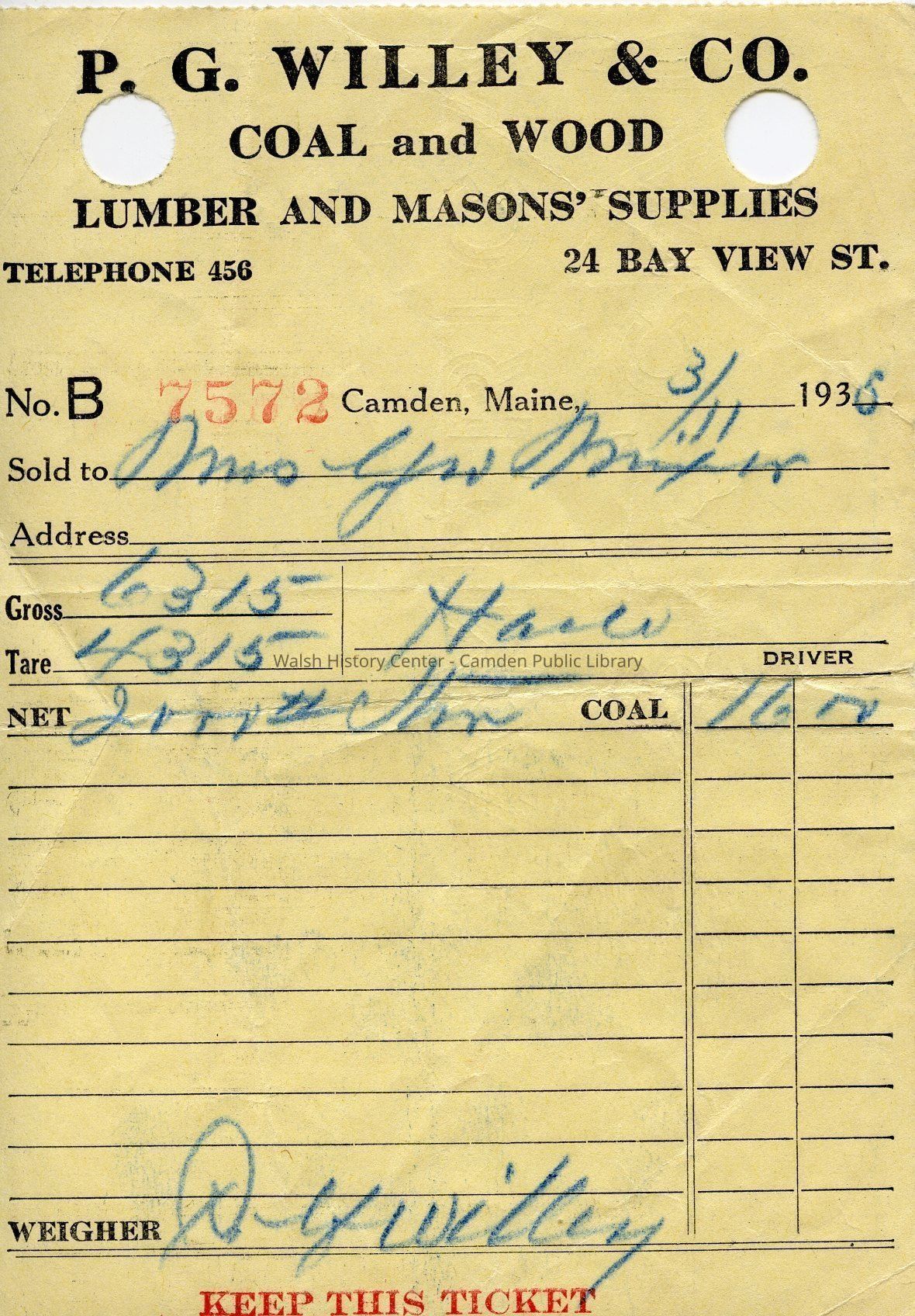 Contains billheads, stationery, bills, letterheads, and receipts from several Camden area businesses. These items date from the 1880's through the 1950's. Partial list of businesses represented: G.W. Achorn; Allen Insurance Agency; Ayers Market; Bay View House; Bay View Street Garage; Boynton's Pharmacy; Brown & Hobbs lumber; Brown's Market; Camden Anchor-Rockland Machine Co.; Camden & Rockland Water Company; Camden Farmer's Union; Camden Lumber Company; Camden Publishing Company; Camden Yacht Building and Railway Company; Carleton, Pascal & Co.; J.C. Curtis Hardware; Follansbee & Wood; Haskell & Corthell; J.H. Hobbs Company; Lenfest's Automotive Service; J.L. Locke; Maiden Cliff Rebekah Lodge; Maine Insane Hospital; The Megunticook Press; A.H. Parsons; Pendleton Dairy; S.G. Ritterbush, contractor; Rockland, Thomaston & Camden Street Railway; S.E. & H.L. Shepherd Company; TalbotArchive Details