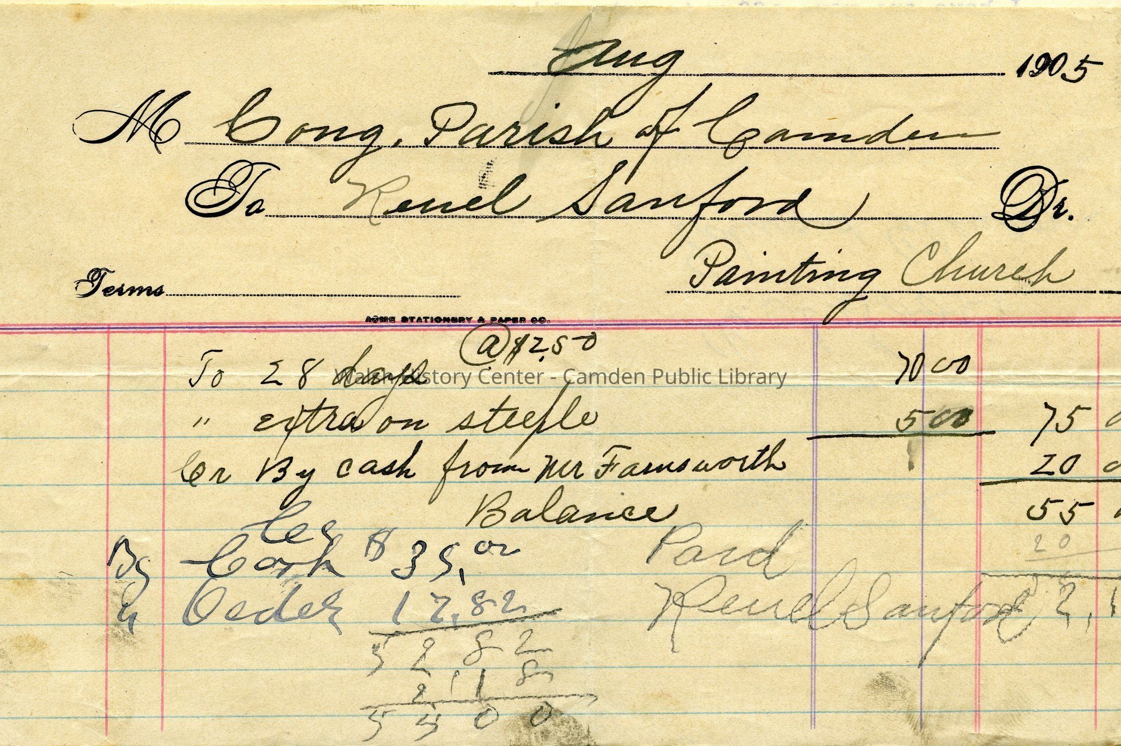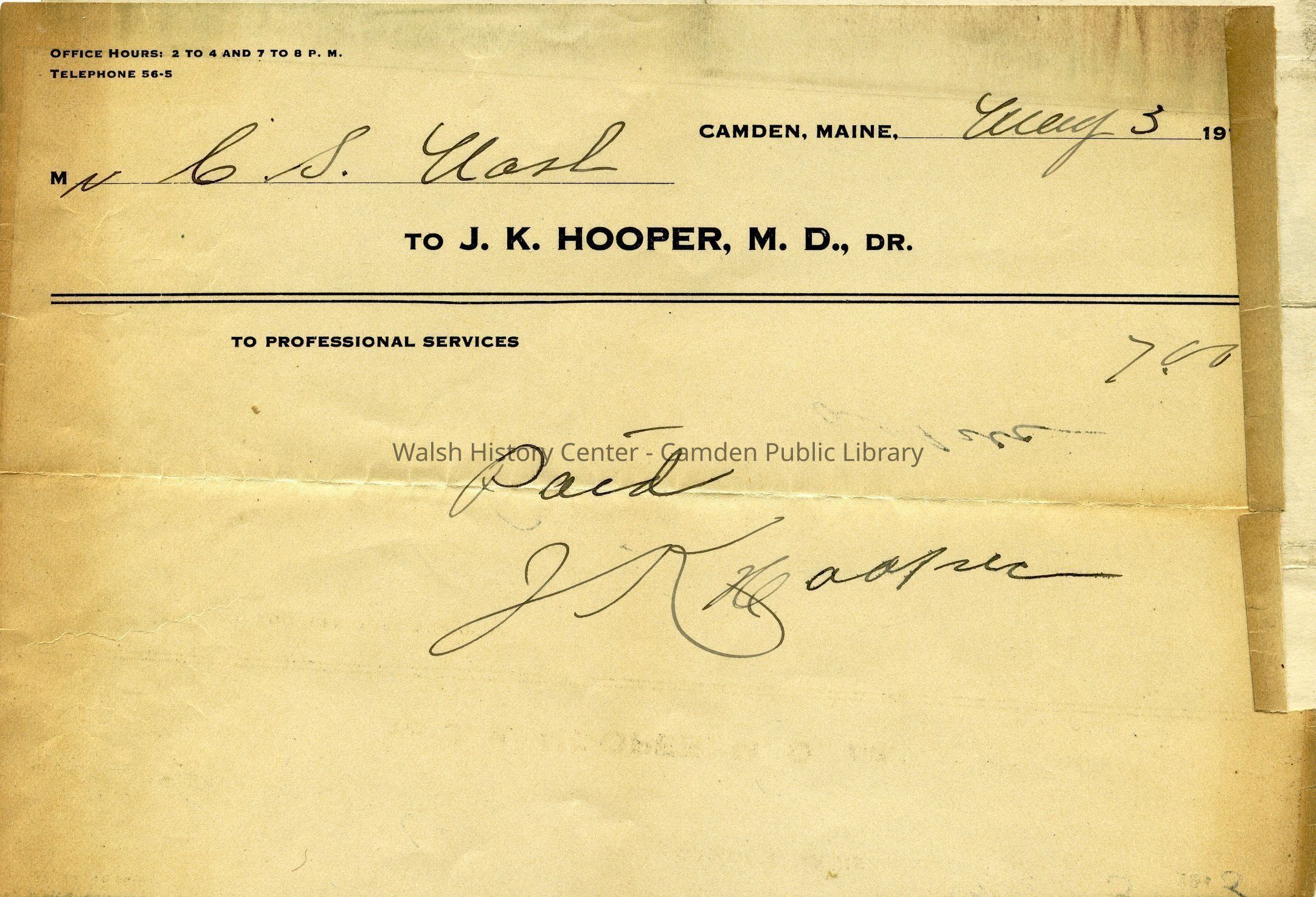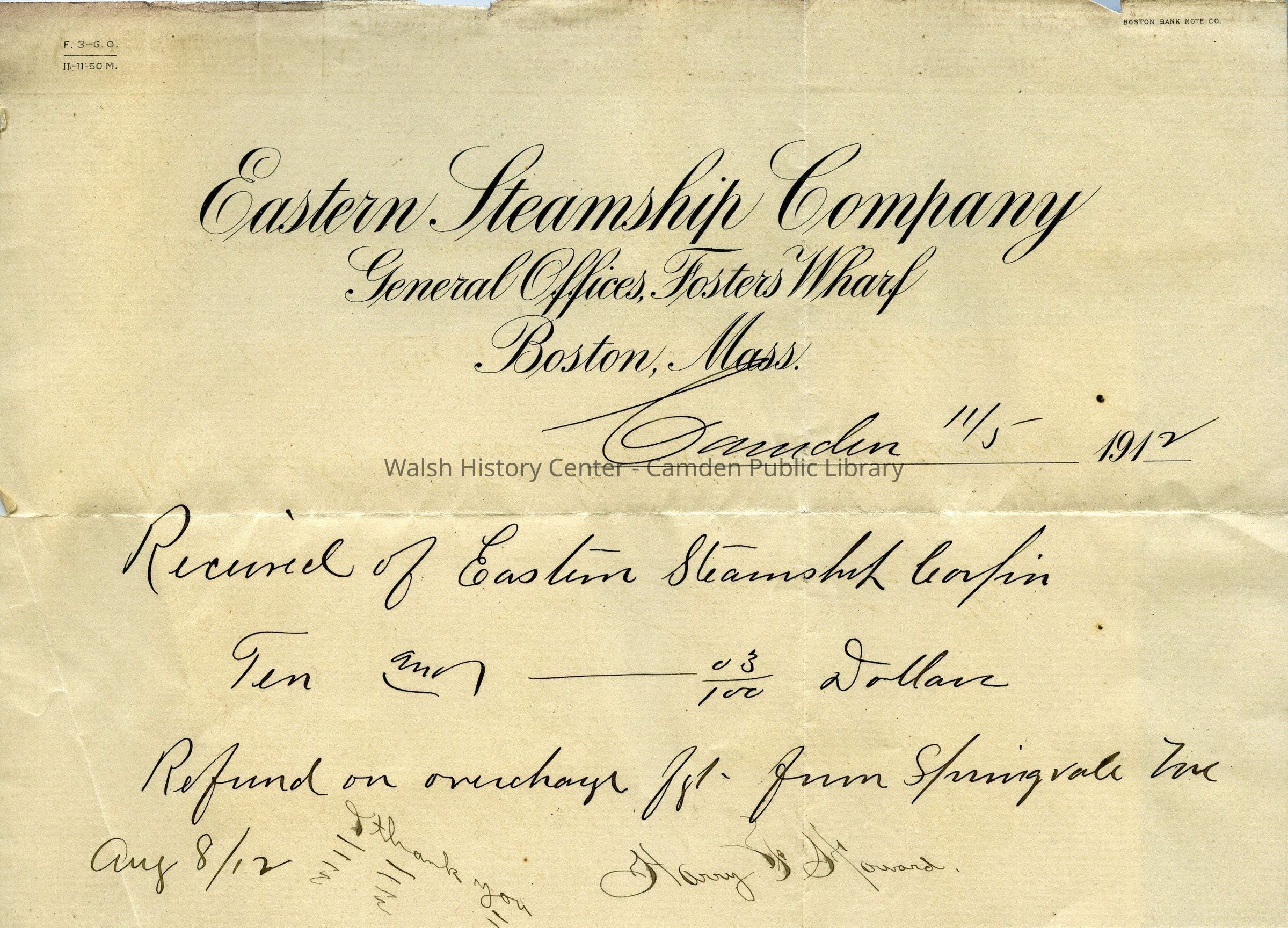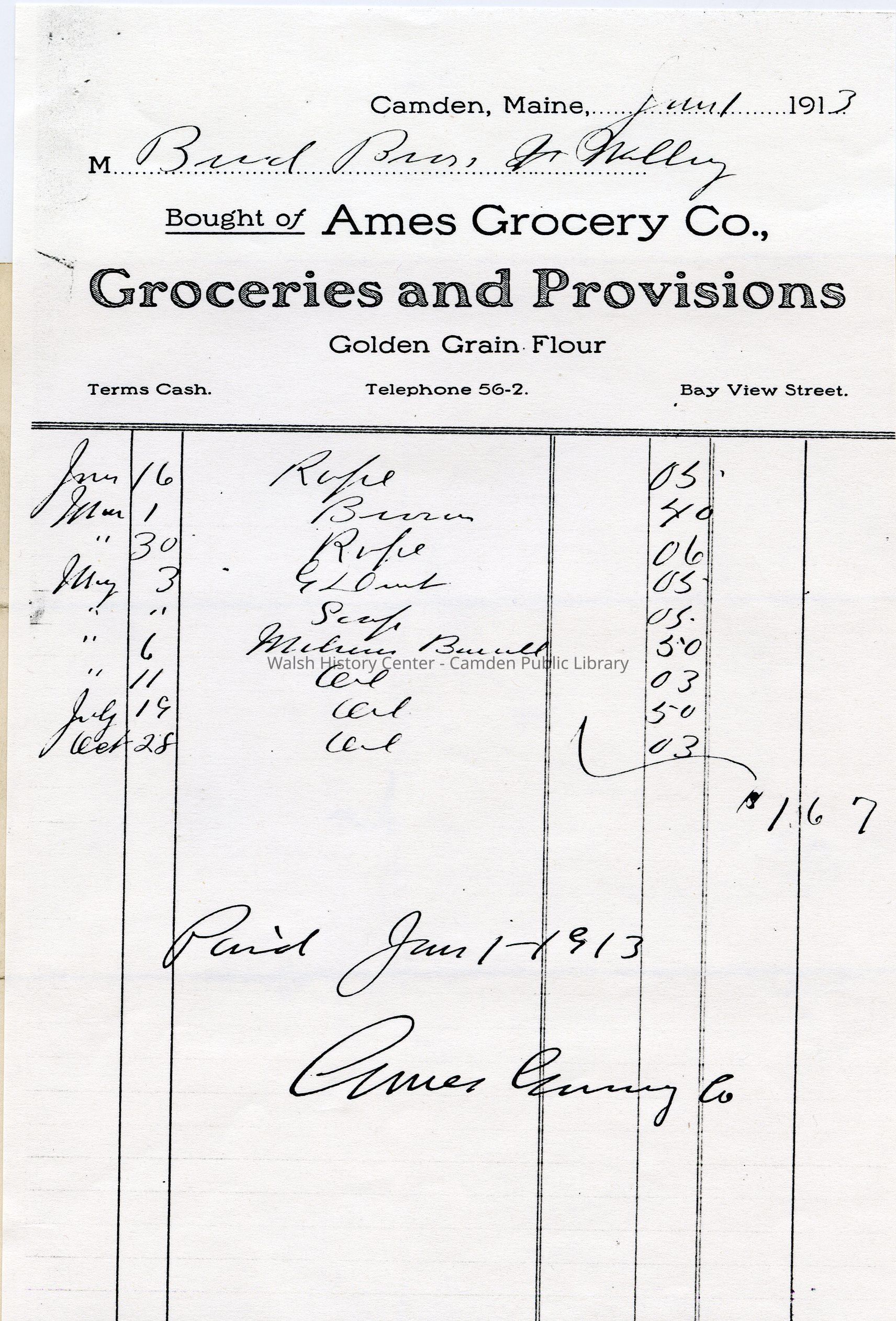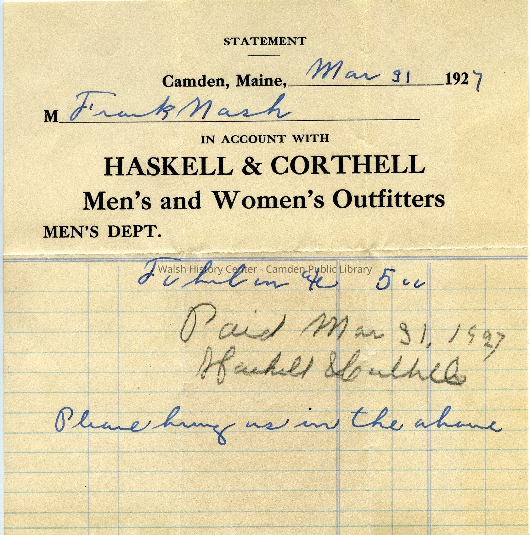 Contains billheads, stationery, bills, letterheads, and receipts from several Camden area businesses. These items date from the 1880's through the 1950's. Partial list of businesses represented: G.W. Achorn; Allen Insurance Agency; Ayers Market; Bay View House; Bay View Street Garage; Boynton's Pharmacy; Brown & Hobbs lumber; Brown's Market; Camden Anchor-Rockland Machine Co.; Camden & Rockland Water Company; Camden Farmer's Union; Camden Lumber Company; Camden Publishing Company; Camden Yacht Building and Railway Company; Carleton, Pascal & Co.; J.C. Curtis Hardware; Follansbee & Wood; Haskell & Corthell; J.H. Hobbs Company; Lenfest's Automotive Service; J.L. Locke; Maiden Cliff Rebekah Lodge; Maine Insane Hospital; The Megunticook Press; A.H. Parsons; Pendleton Dairy; S.G. Ritterbush, contractor; Rockland, Thomaston & Camden Street Railway; S.E. & H.L. Shepherd Company; TalbotArchive Details