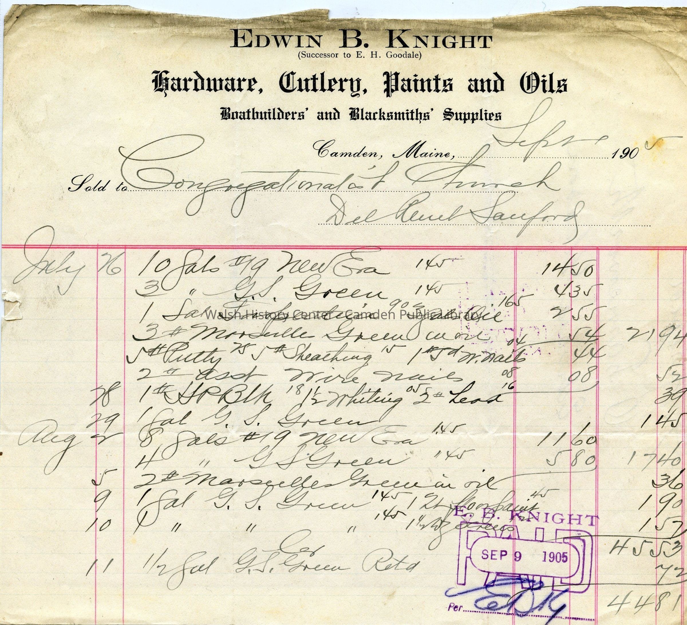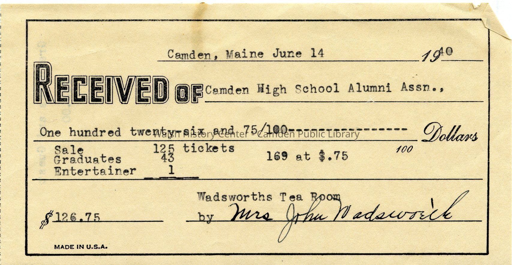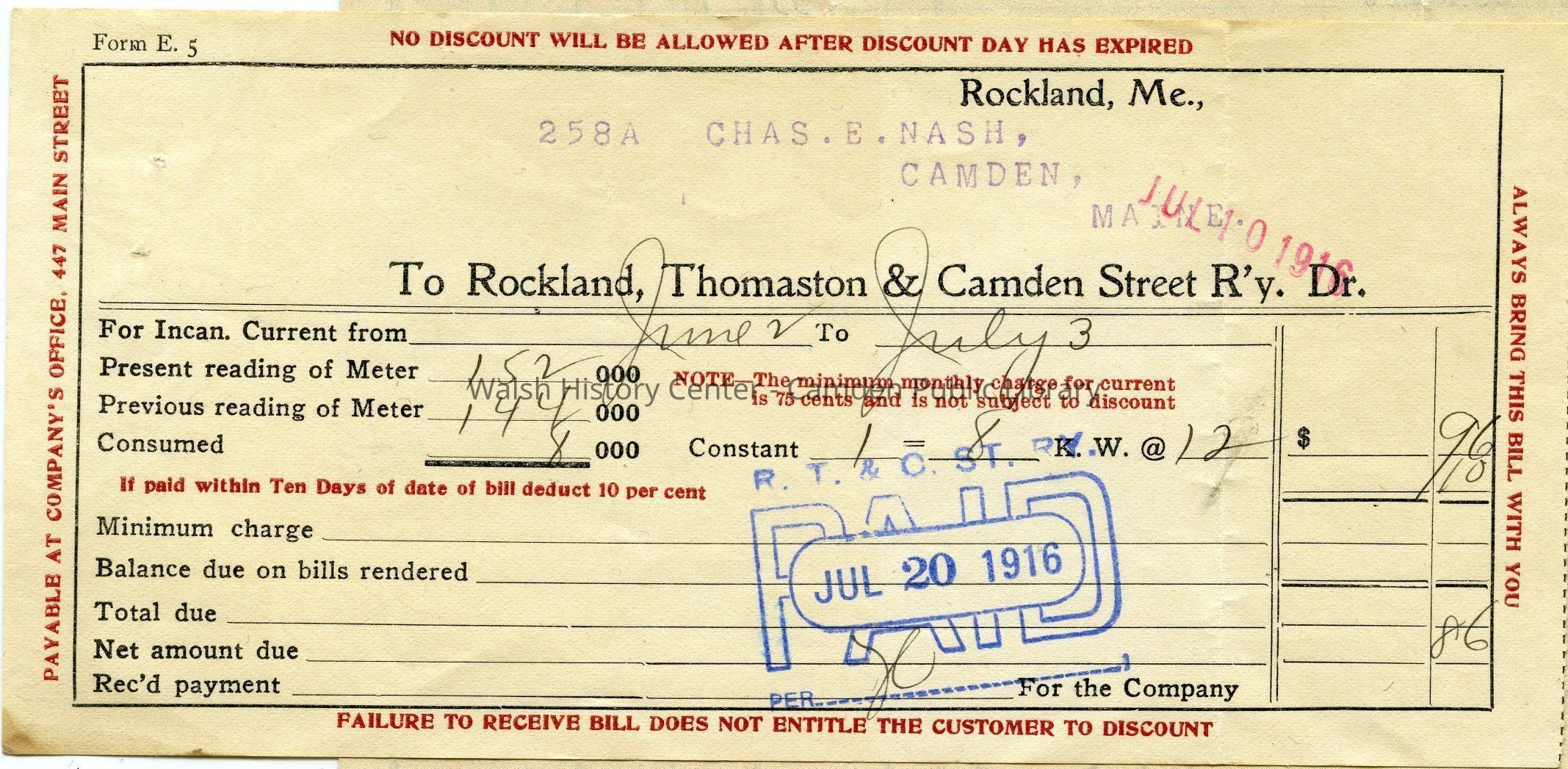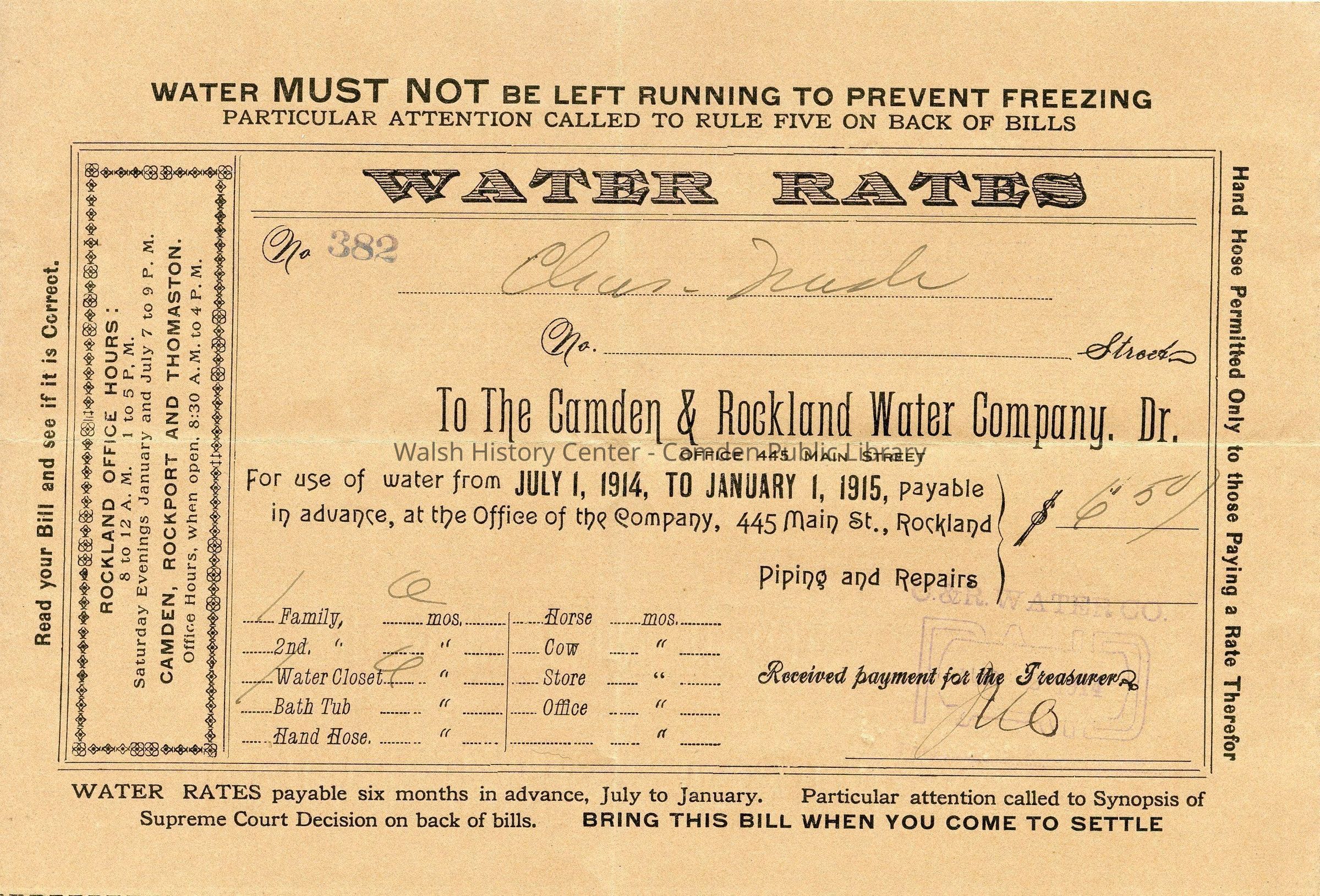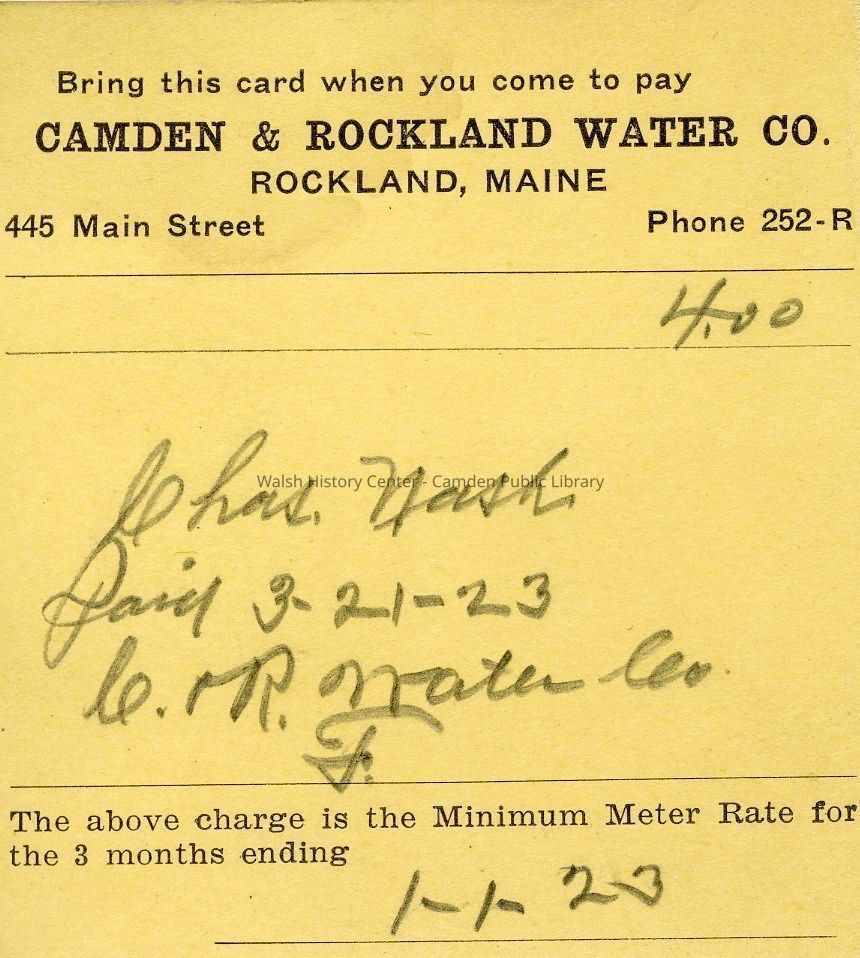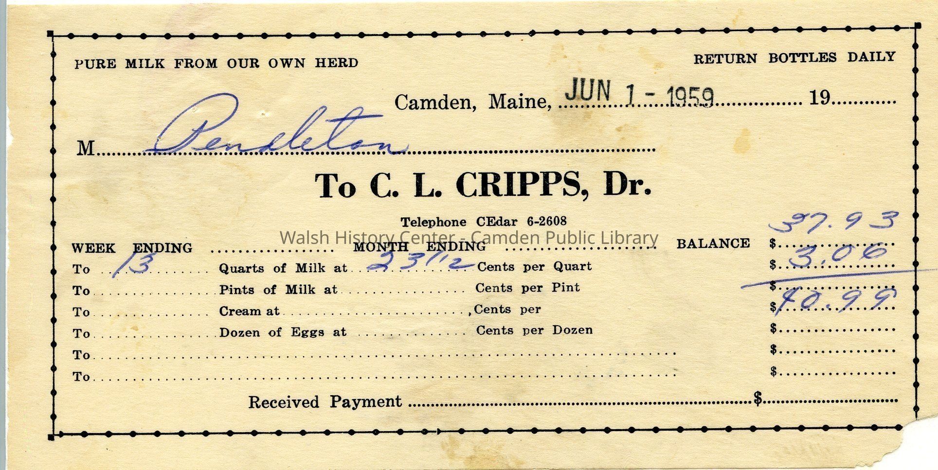 Contains billheads, stationery, bills, letterheads, and receipts from several Camden area businesses. These items date from the 1880's through the 1950's. Partial list of businesses represented: G.W. Achorn; Allen Insurance Agency; Ayers Market; Bay View House; Bay View Street Garage; Boynton's Pharmacy; Brown & Hobbs lumber; Brown's Market; Camden Anchor-Rockland Machine Co.; Camden & Rockland Water Company; Camden Farmer's Union; Camden Lumber Company; Camden Publishing Company; Camden Yacht Building and Railway Company; Carleton, Pascal & Co.; J.C. Curtis Hardware; Follansbee & Wood; Haskell & Corthell; J.H. Hobbs Company; Lenfest's Automotive Service; J.L. Locke; Maiden Cliff Rebekah Lodge; Maine Insane Hospital; The Megunticook Press; A.H. Parsons; Pendleton Dairy; S.G. Ritterbush, contractor; Rockland, Thomaston & Camden Street Railway; S.E. & H.L. Shepherd Company; TalbotArchive Details