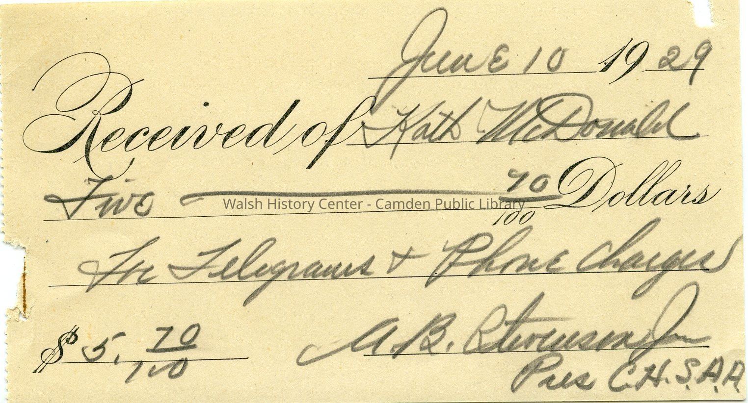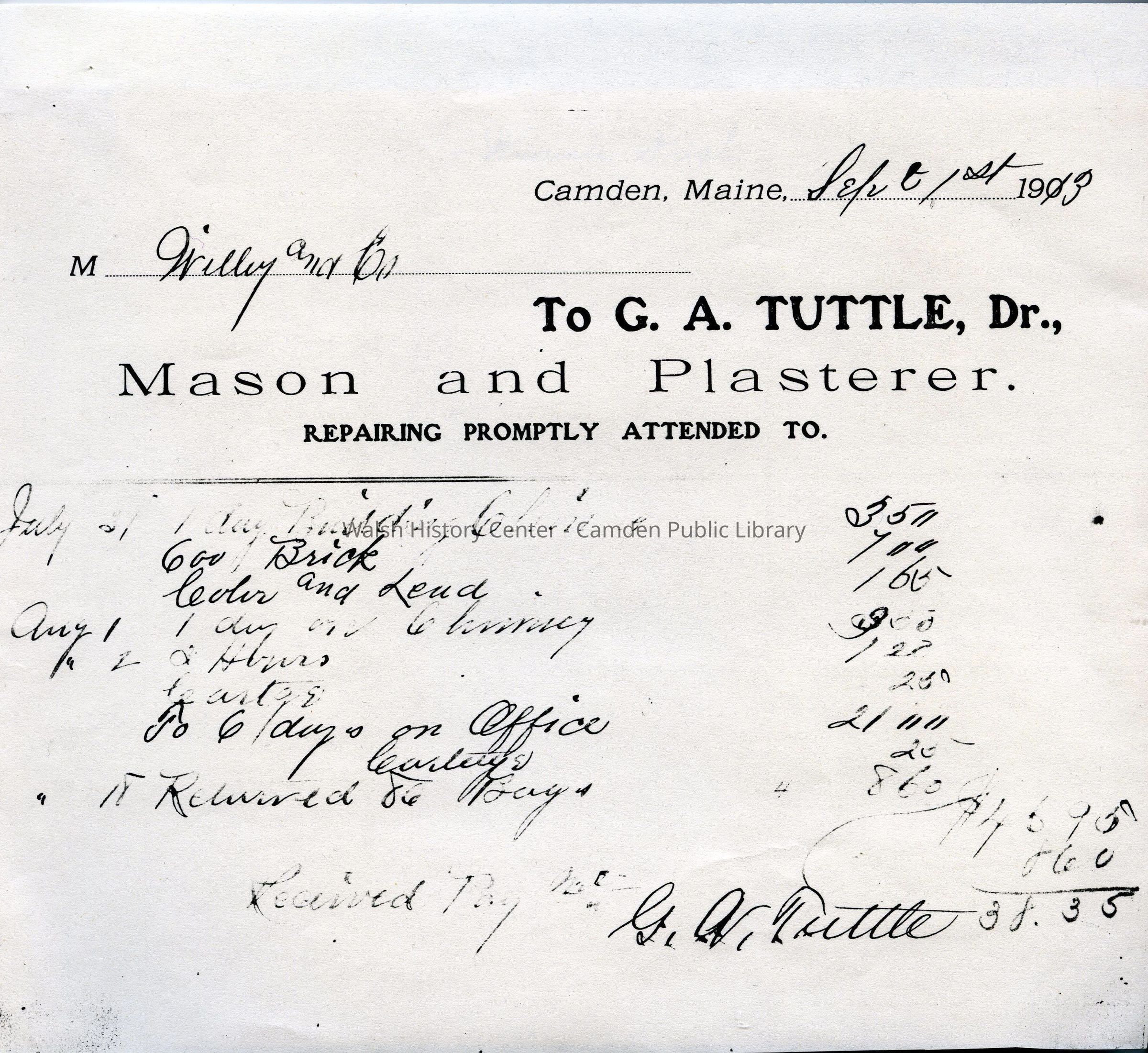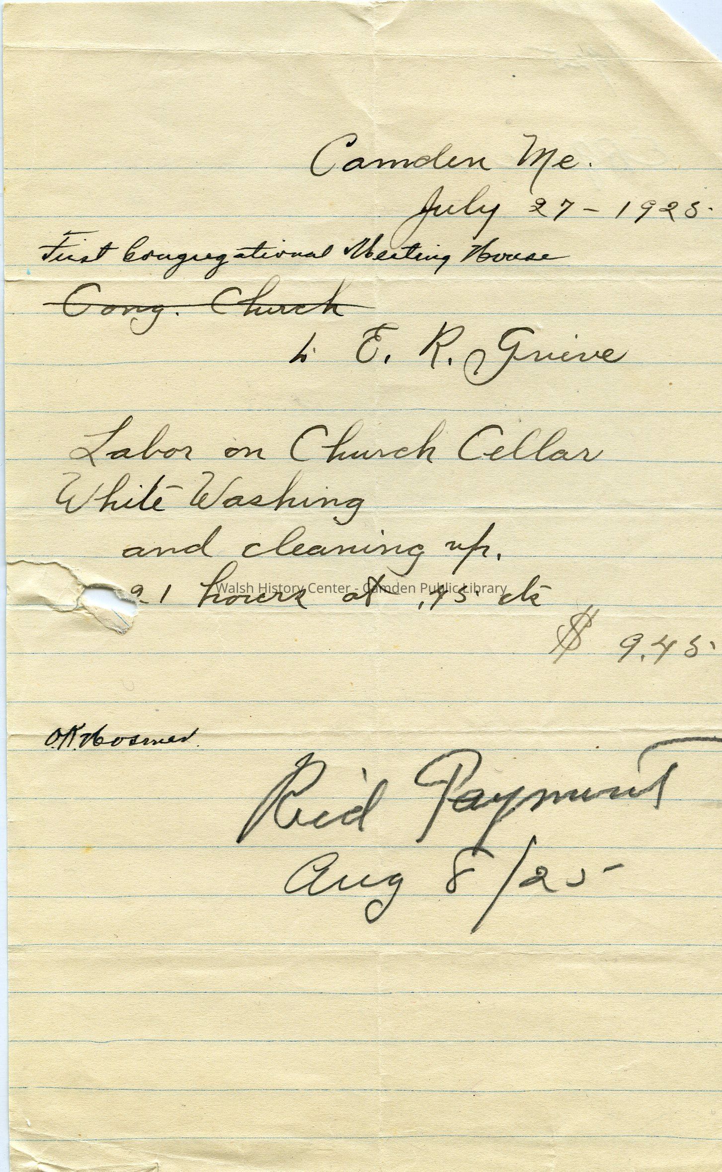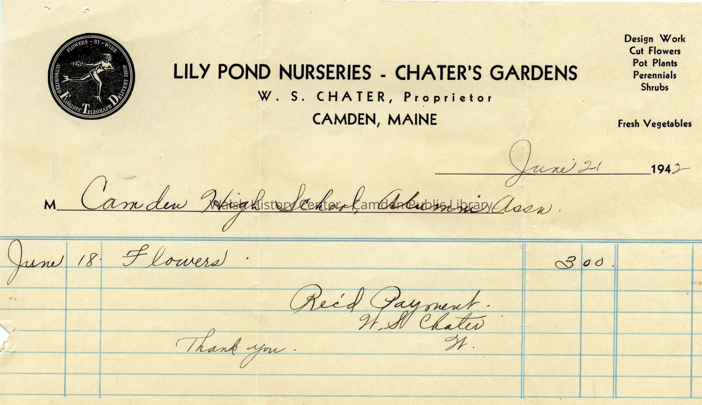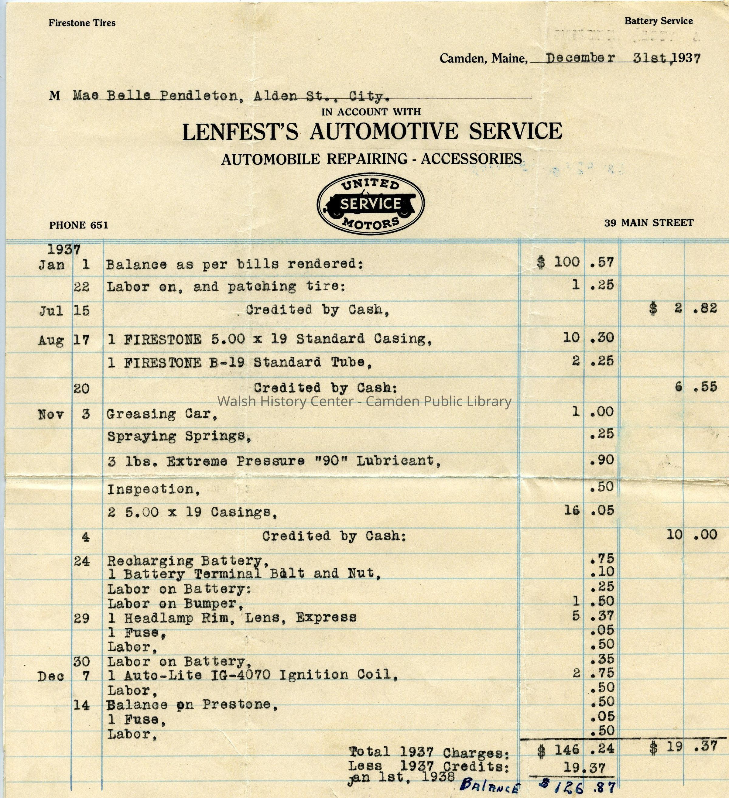 Contains billheads, stationery, bills, letterheads, and receipts from several Camden area businesses. These items date from the 1880's through the 1950's. Partial list of businesses represented: G.W. Achorn; Allen Insurance Agency; Ayers Market; Bay View House; Bay View Street Garage; Boynton's Pharmacy; Brown & Hobbs lumber; Brown's Market; Camden Anchor-Rockland Machine Co.; Camden & Rockland Water Company; Camden Farmer's Union; Camden Lumber Company; Camden Publishing Company; Camden Yacht Building and Railway Company; Carleton, Pascal & Co.; J.C. Curtis Hardware; Follansbee & Wood; Haskell & Corthell; J.H. Hobbs Company; Lenfest's Automotive Service; J.L. Locke; Maiden Cliff Rebekah Lodge; Maine Insane Hospital; The Megunticook Press; A.H. Parsons; Pendleton Dairy; S.G. Ritterbush, contractor; Rockland, Thomaston & Camden Street Railway; S.E. & H.L. Shepherd Company; TalbotArchive Details
