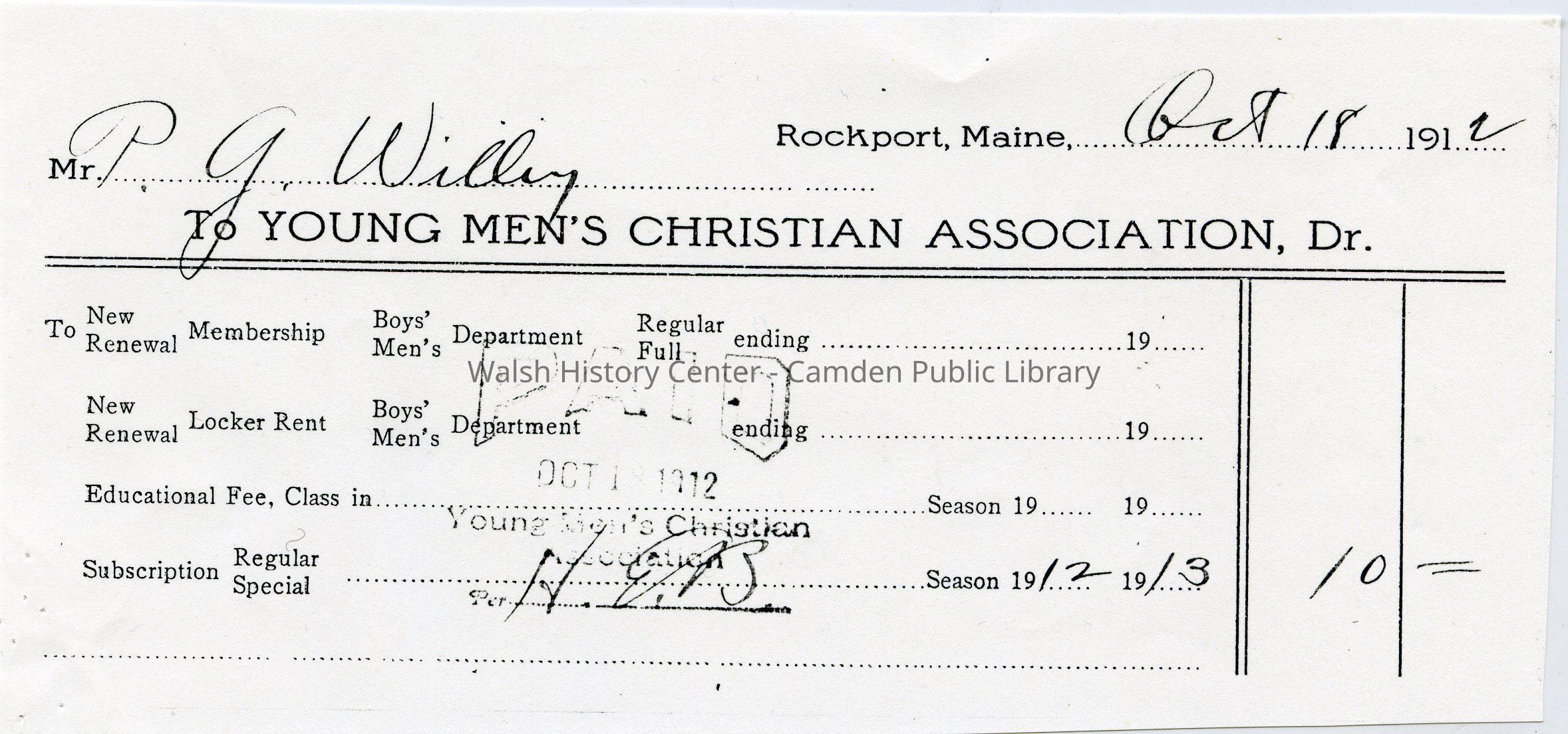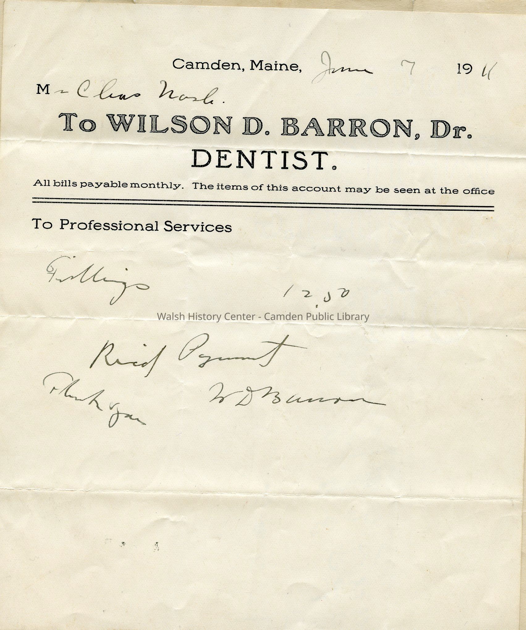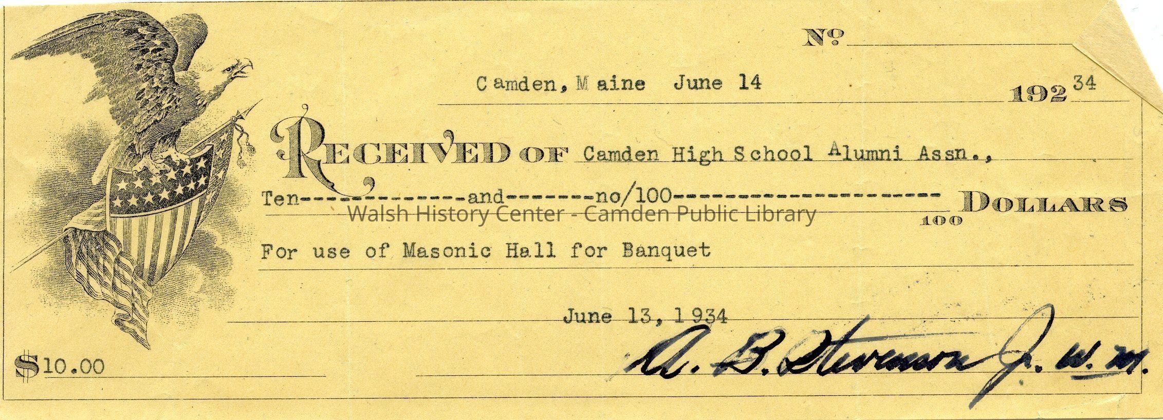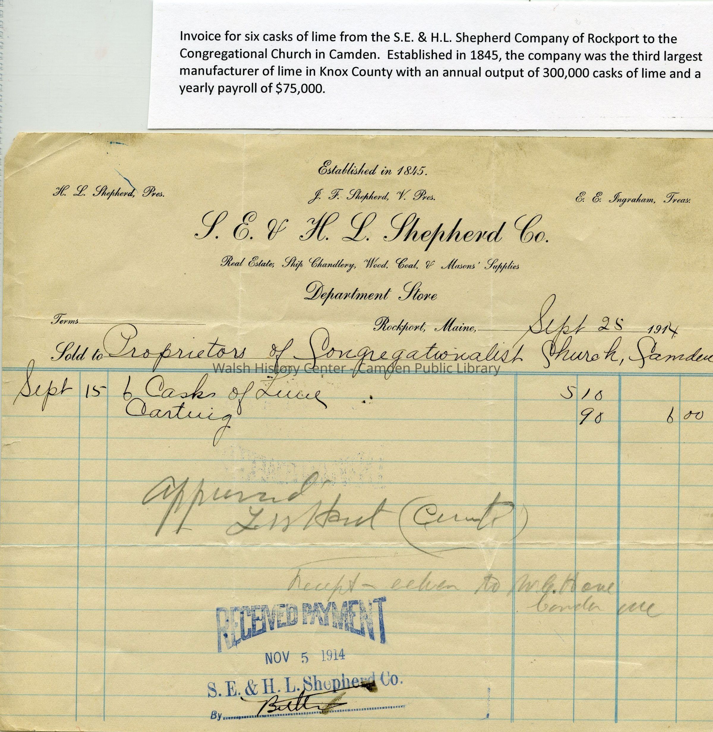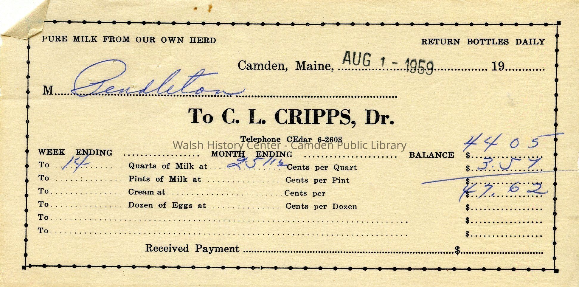 Contains billheads, stationery, bills, letterheads, and receipts from several Camden area businesses. These items date from the 1880's through the 1950's. Partial list of businesses represented: G.W. Achorn; Allen Insurance Agency; Ayers Market; Bay View House; Bay View Street Garage; Boynton's Pharmacy; Brown & Hobbs lumber; Brown's Market; Camden Anchor-Rockland Machine Co.; Camden & Rockland Water Company; Camden Farmer's Union; Camden Lumber Company; Camden Publishing Company; Camden Yacht Building and Railway Company; Carleton, Pascal & Co.; J.C. Curtis Hardware; Follansbee & Wood; Haskell & Corthell; J.H. Hobbs Company; Lenfest's Automotive Service; J.L. Locke; Maiden Cliff Rebekah Lodge; Maine Insane Hospital; The Megunticook Press; A.H. Parsons; Pendleton Dairy; S.G. Ritterbush, contractor; Rockland, Thomaston & Camden Street Railway; S.E. & H.L. Shepherd Company; TalbotArchive Details