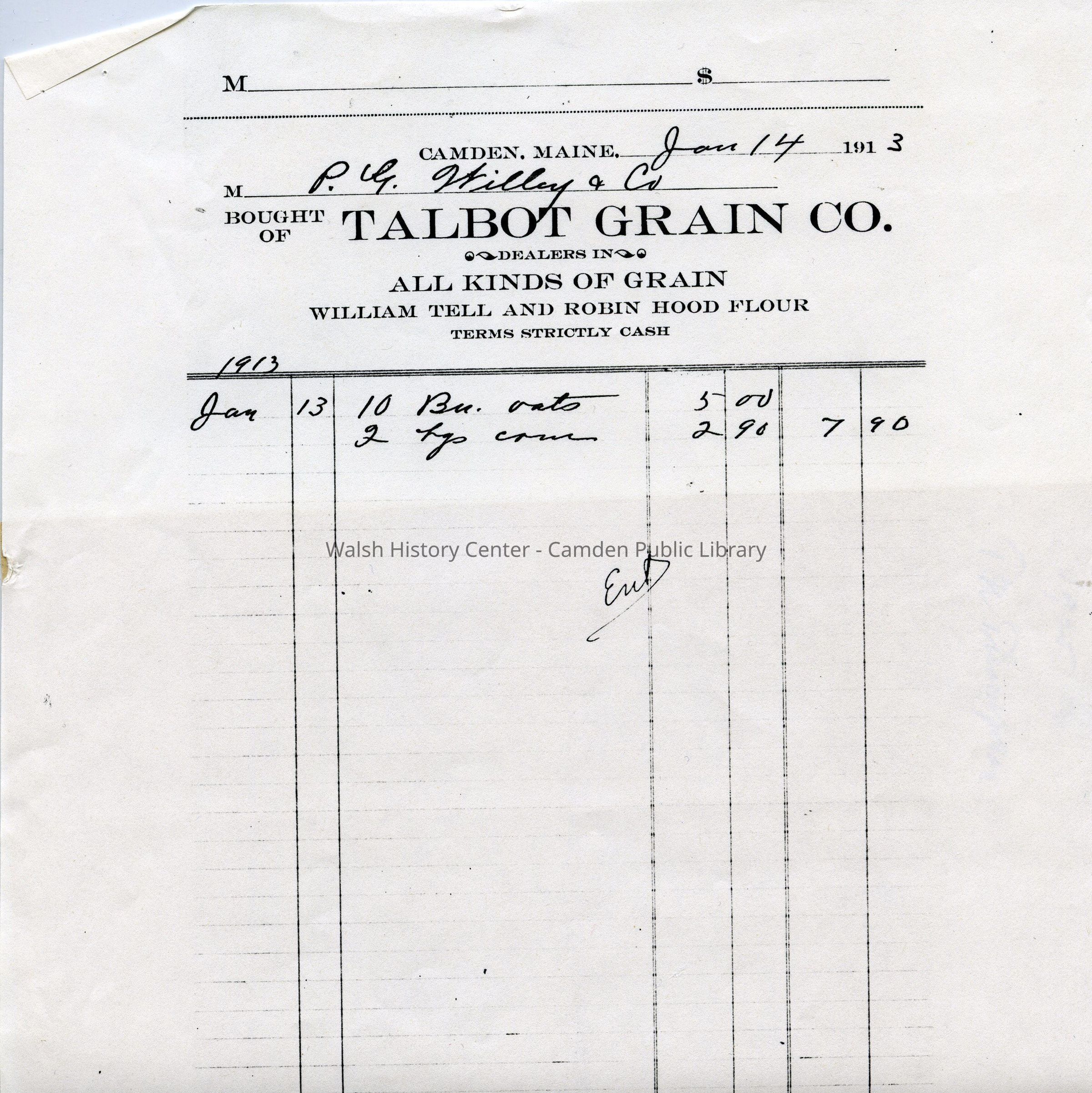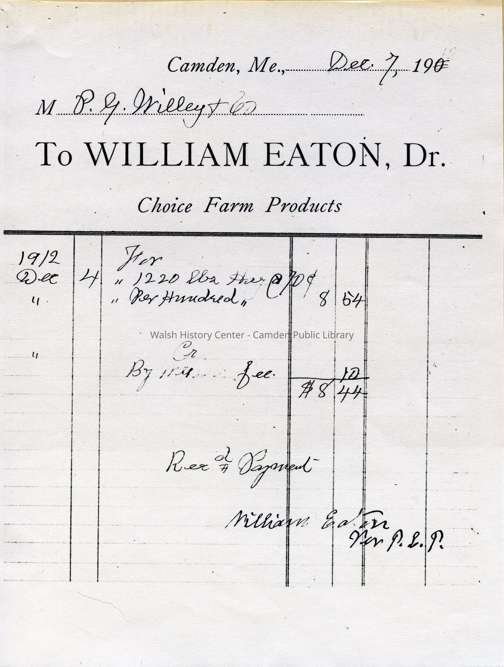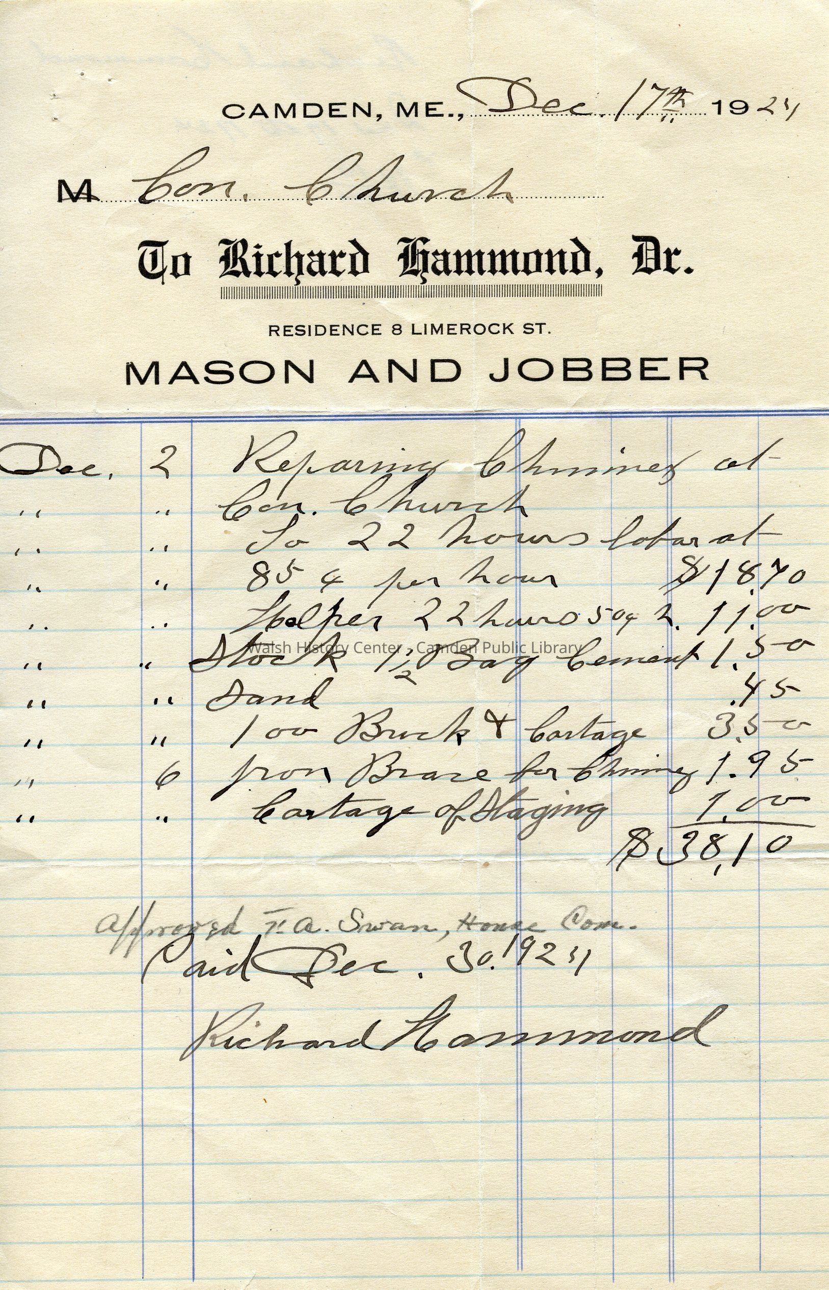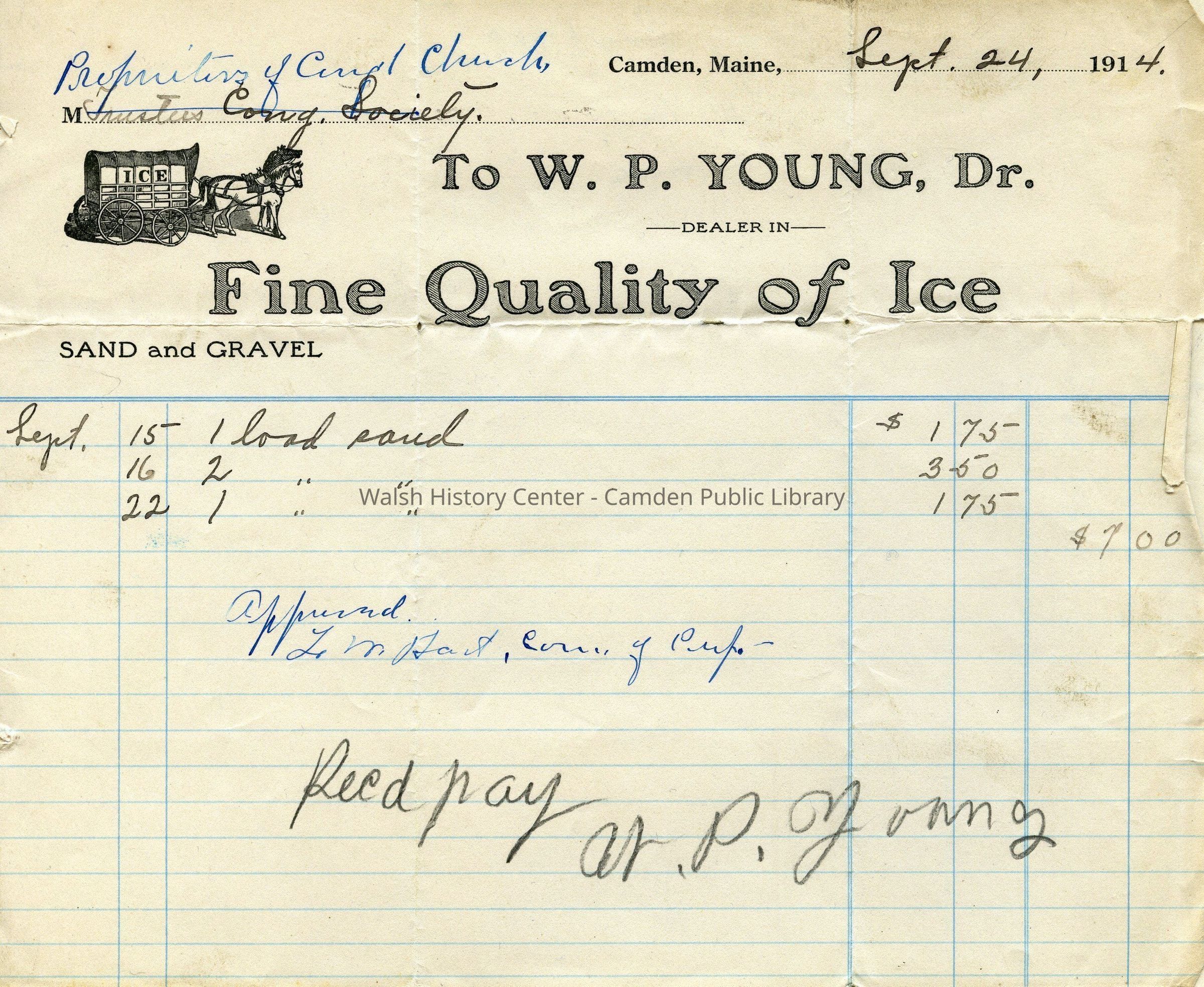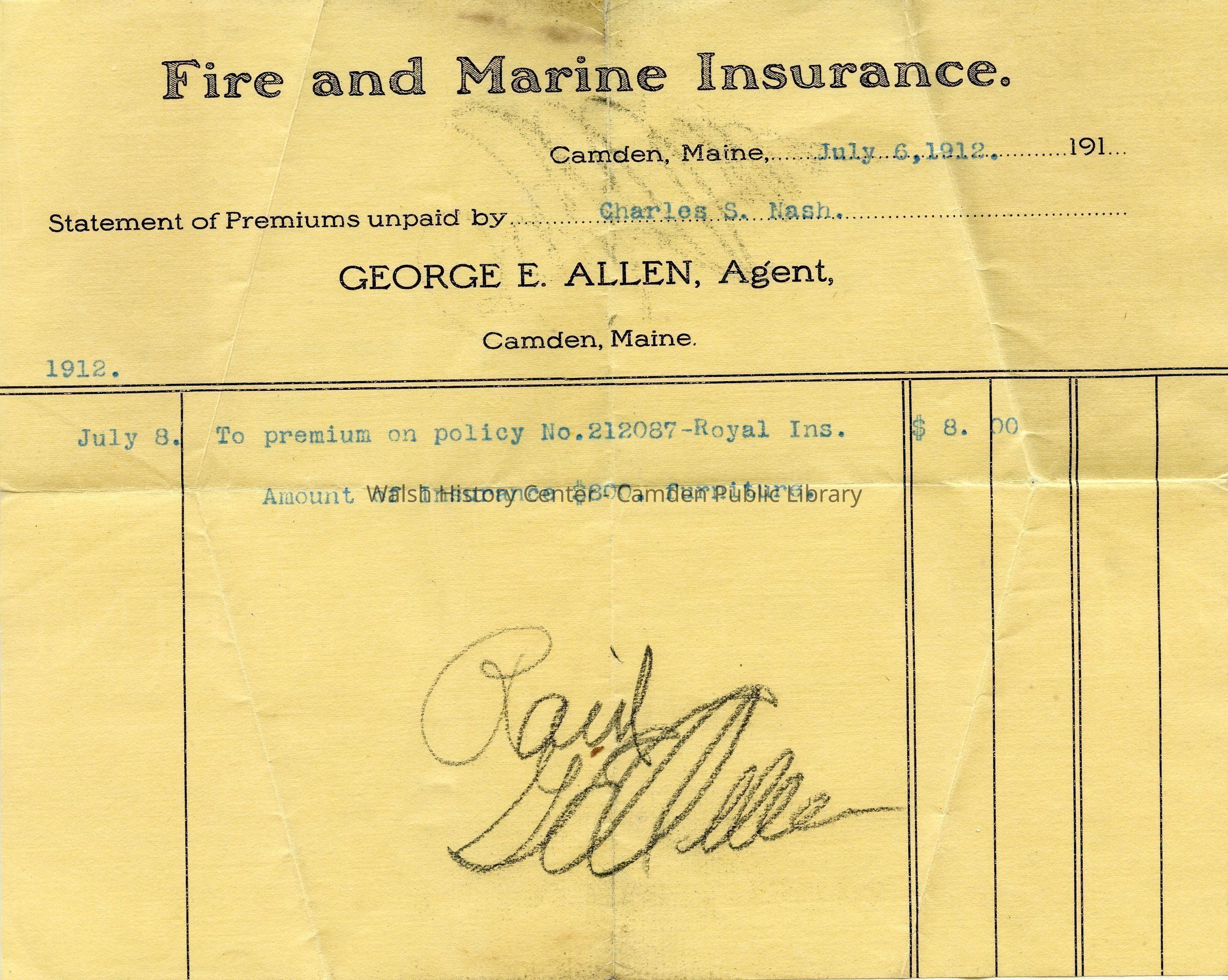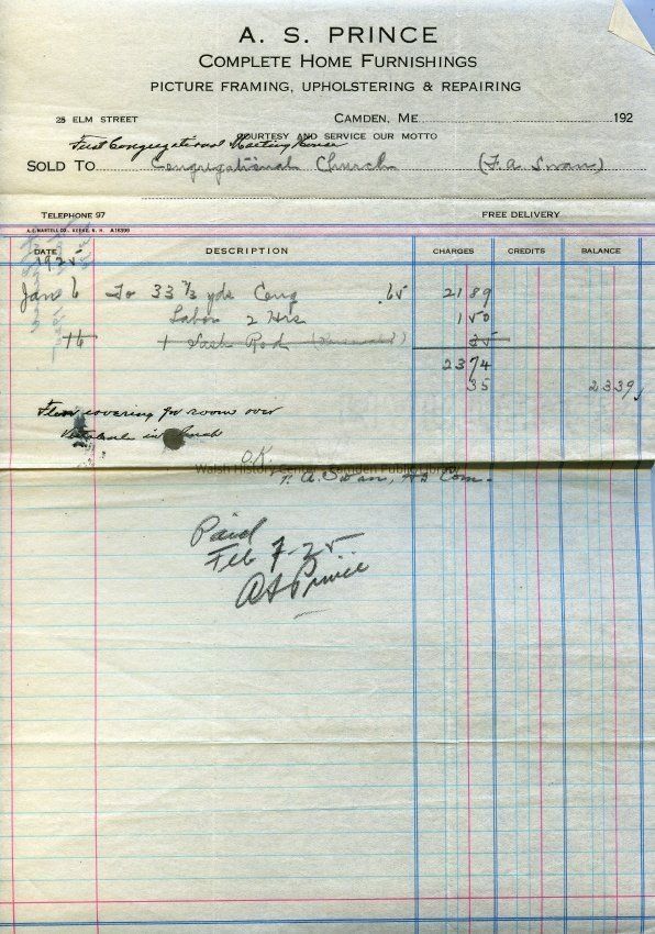 Contains billheads, stationery, bills, letterheads, and receipts from several Camden area businesses. These items date from the 1880's through the 1950's. Partial list of businesses represented: G.W. Achorn; Allen Insurance Agency; Ayers Market; Bay View House; Bay View Street Garage; Boynton's Pharmacy; Brown & Hobbs lumber; Brown's Market; Camden Anchor-Rockland Machine Co.; Camden & Rockland Water Company; Camden Farmer's Union; Camden Lumber Company; Camden Publishing Company; Camden Yacht Building and Railway Company; Carleton, Pascal & Co.; J.C. Curtis Hardware; Follansbee & Wood; Haskell & Corthell; J.H. Hobbs Company; Lenfest's Automotive Service; J.L. Locke; Maiden Cliff Rebekah Lodge; Maine Insane Hospital; The Megunticook Press; A.H. Parsons; Pendleton Dairy; S.G. Ritterbush, contractor; Rockland, Thomaston & Camden Street Railway; S.E. & H.L. Shepherd Company; TalbotArchive Details