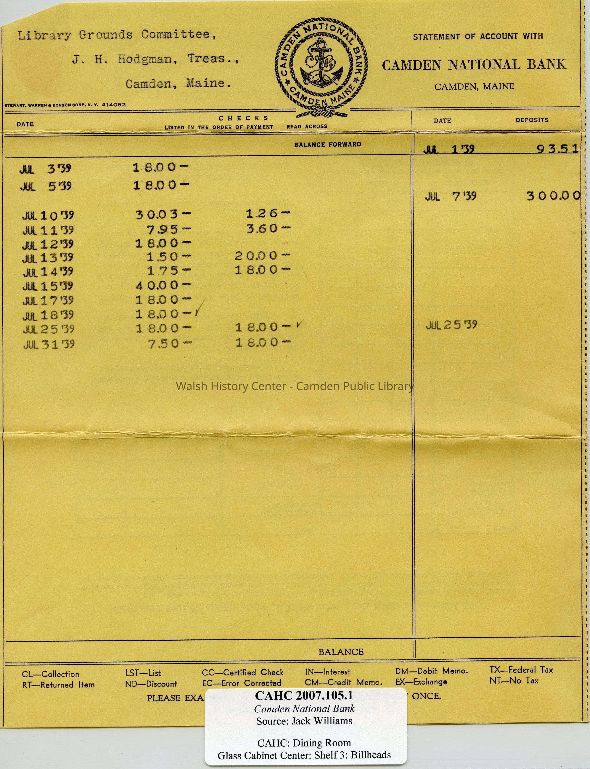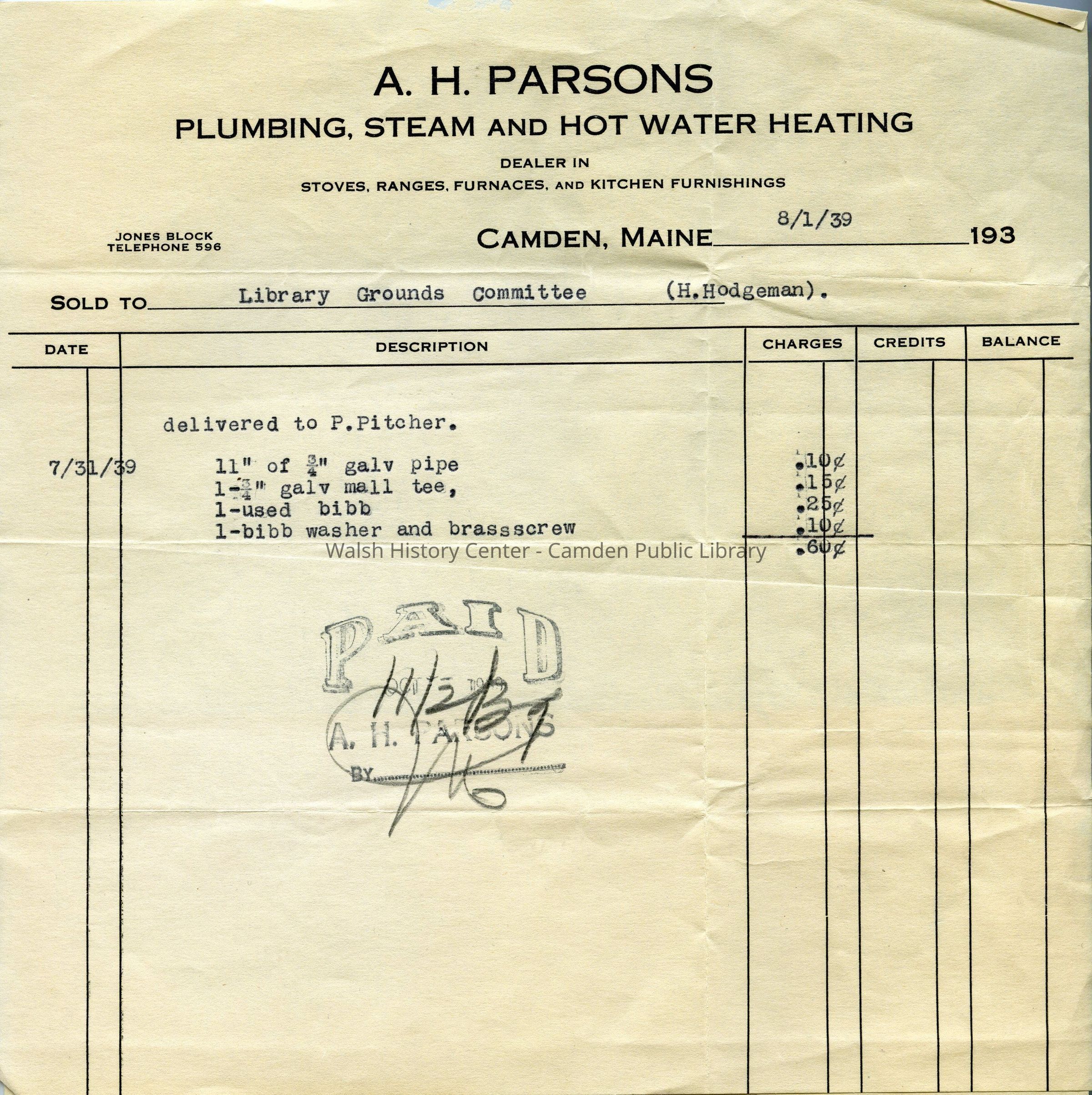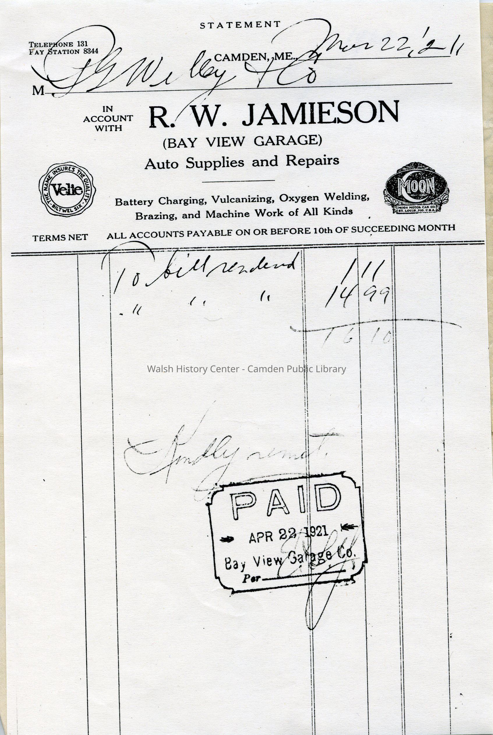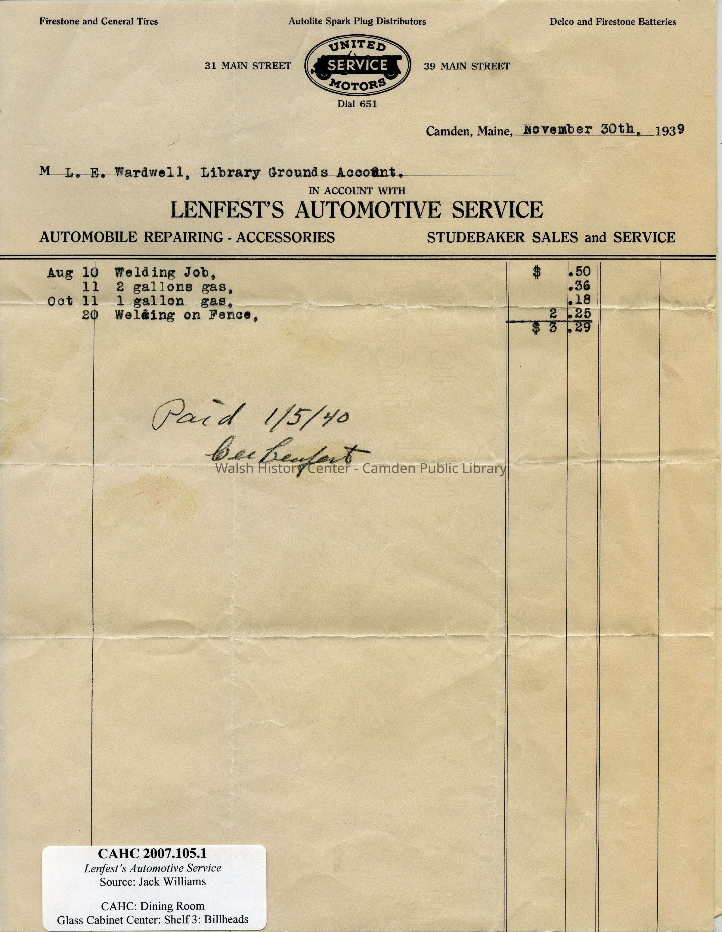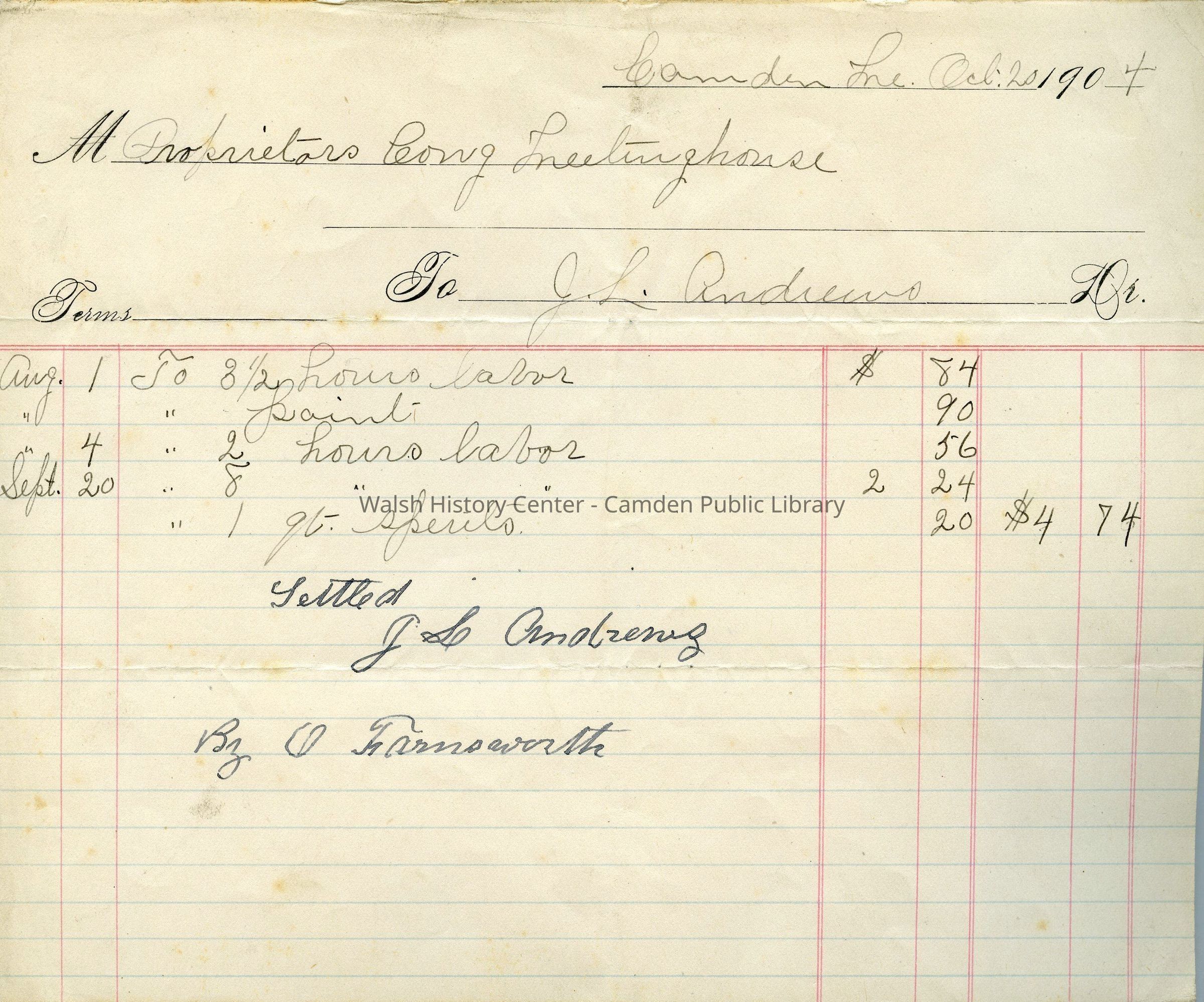 Contains billheads, stationery, bills, letterheads, and receipts from several Camden area businesses. These items date from the 1880's through the 1950's. Partial list of businesses represented: G.W. Achorn; Allen Insurance Agency; Ayers Market; Bay View House; Bay View Street Garage; Boynton's Pharmacy; Brown & Hobbs lumber; Brown's Market; Camden Anchor-Rockland Machine Co.; Camden & Rockland Water Company; Camden Farmer's Union; Camden Lumber Company; Camden Publishing Company; Camden Yacht Building and Railway Company; Carleton, Pascal & Co.; J.C. Curtis Hardware; Follansbee & Wood; Haskell & Corthell; J.H. Hobbs Company; Lenfest's Automotive Service; J.L. Locke; Maiden Cliff Rebekah Lodge; Maine Insane Hospital; The Megunticook Press; A.H. Parsons; Pendleton Dairy; S.G. Ritterbush, contractor; Rockland, Thomaston & Camden Street Railway; S.E. & H.L. Shepherd Company; TalbotArchive Details