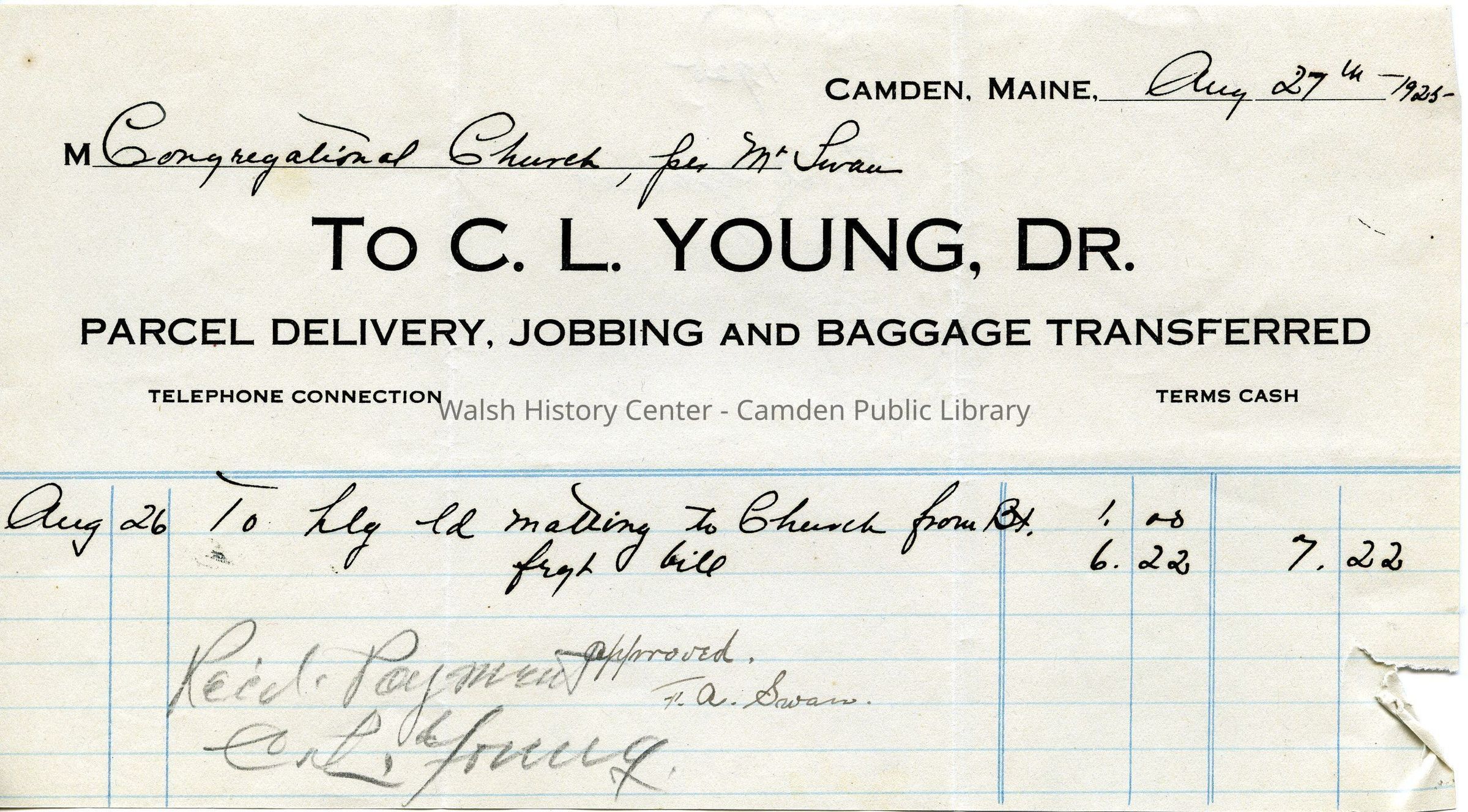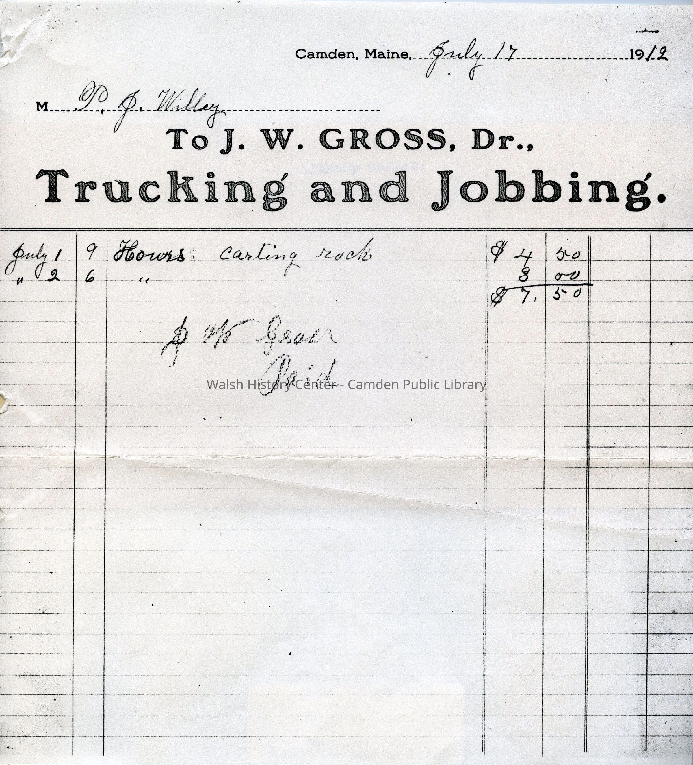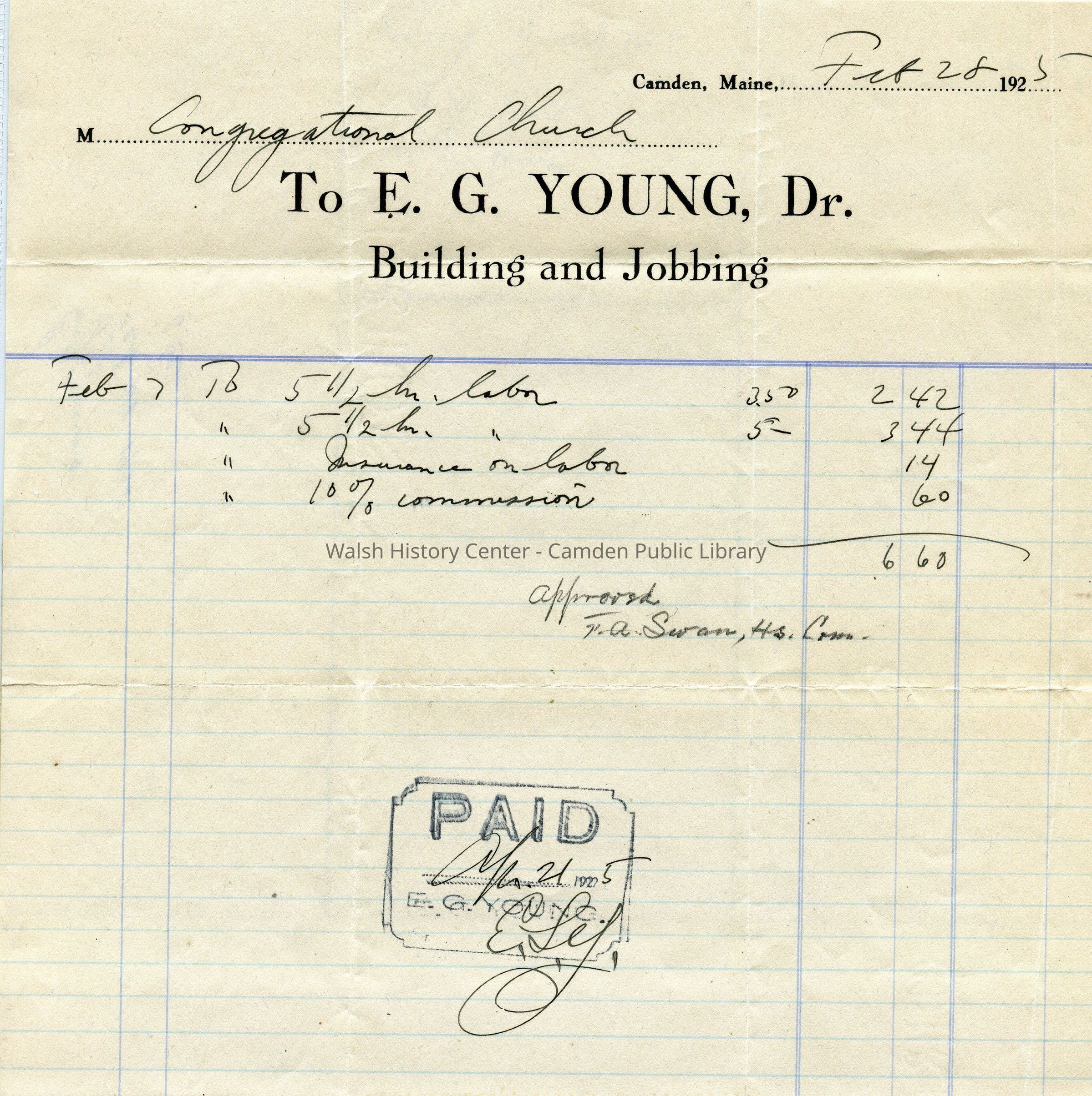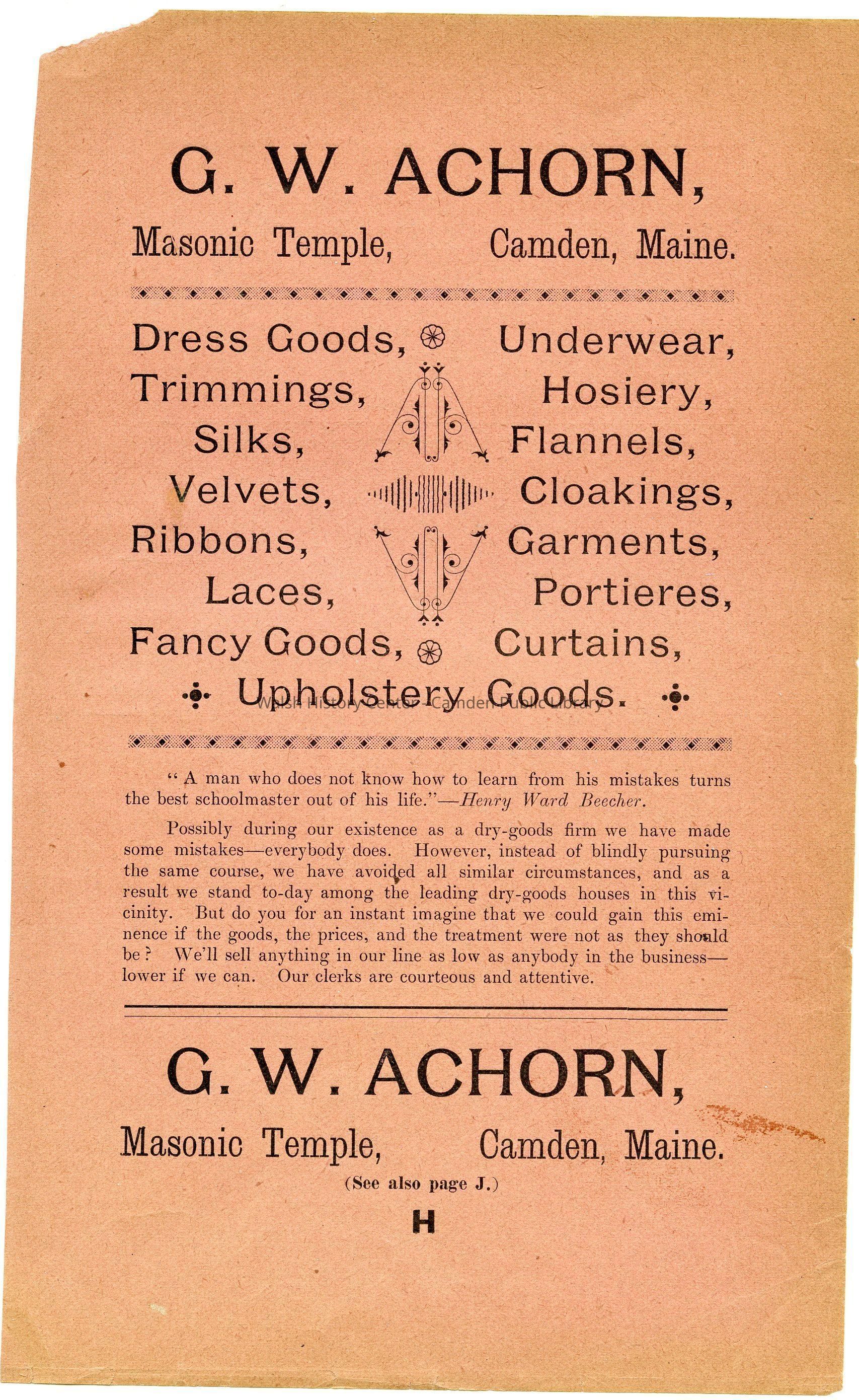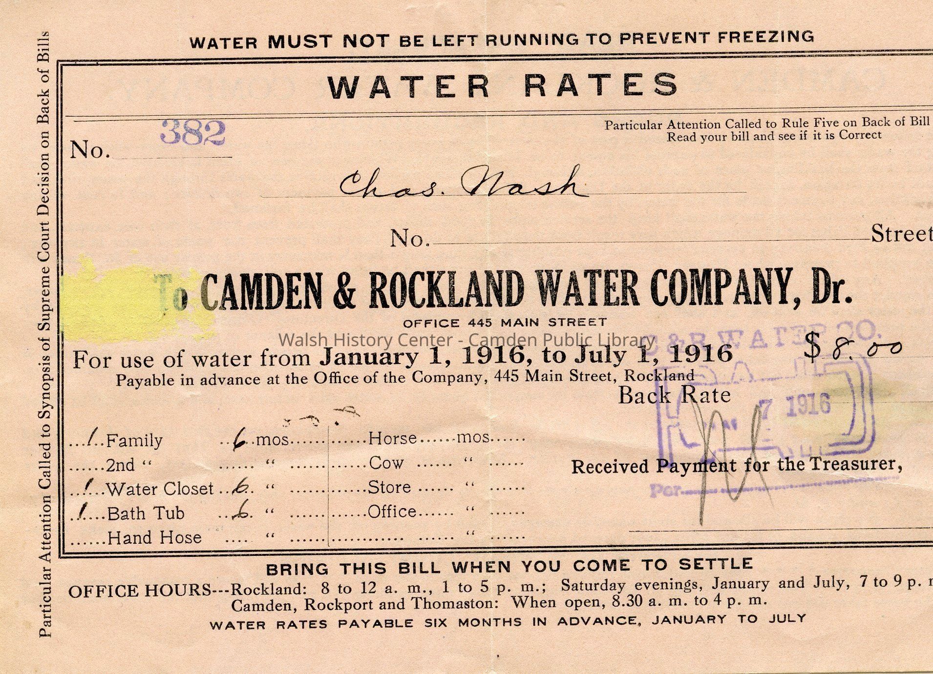 Contains billheads, stationery, bills, letterheads, and receipts from several Camden area businesses. These items date from the 1880's through the 1950's. Partial list of businesses represented: G.W. Achorn; Allen Insurance Agency; Ayers Market; Bay View House; Bay View Street Garage; Boynton's Pharmacy; Brown & Hobbs lumber; Brown's Market; Camden Anchor-Rockland Machine Co.; Camden & Rockland Water Company; Camden Farmer's Union; Camden Lumber Company; Camden Publishing Company; Camden Yacht Building and Railway Company; Carleton, Pascal & Co.; J.C. Curtis Hardware; Follansbee & Wood; Haskell & Corthell; J.H. Hobbs Company; Lenfest's Automotive Service; J.L. Locke; Maiden Cliff Rebekah Lodge; Maine Insane Hospital; The Megunticook Press; A.H. Parsons; Pendleton Dairy; S.G. Ritterbush, contractor; Rockland, Thomaston & Camden Street Railway; S.E. & H.L. Shepherd Company; TalbotArchive Details