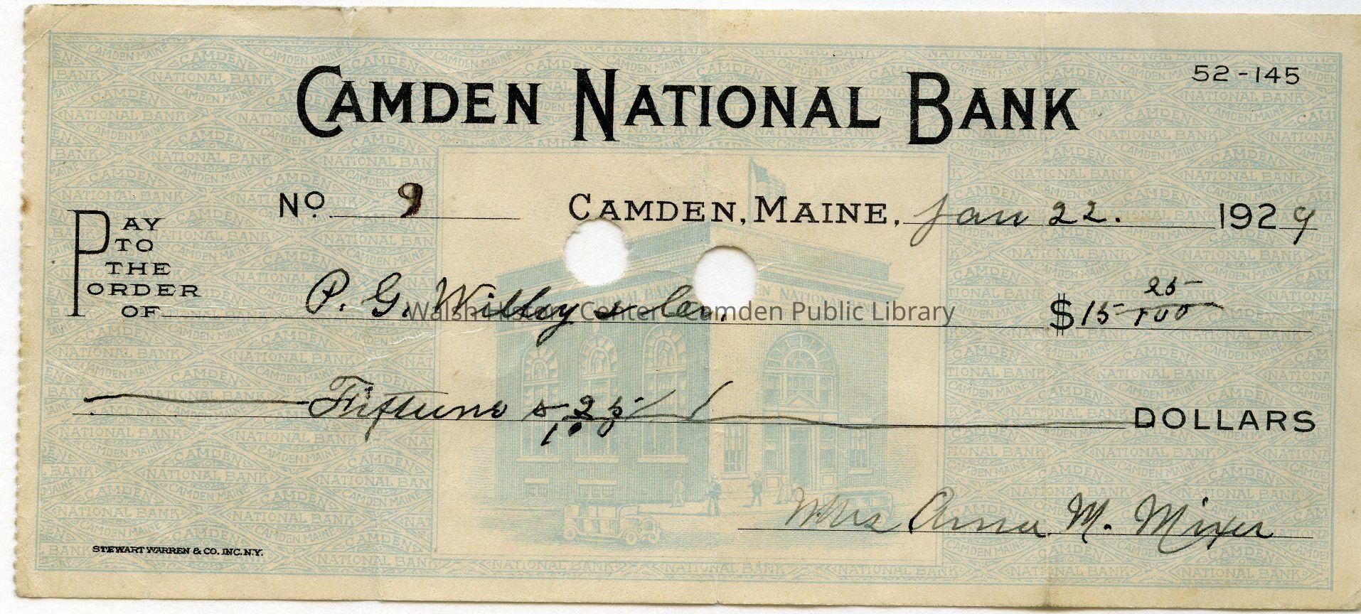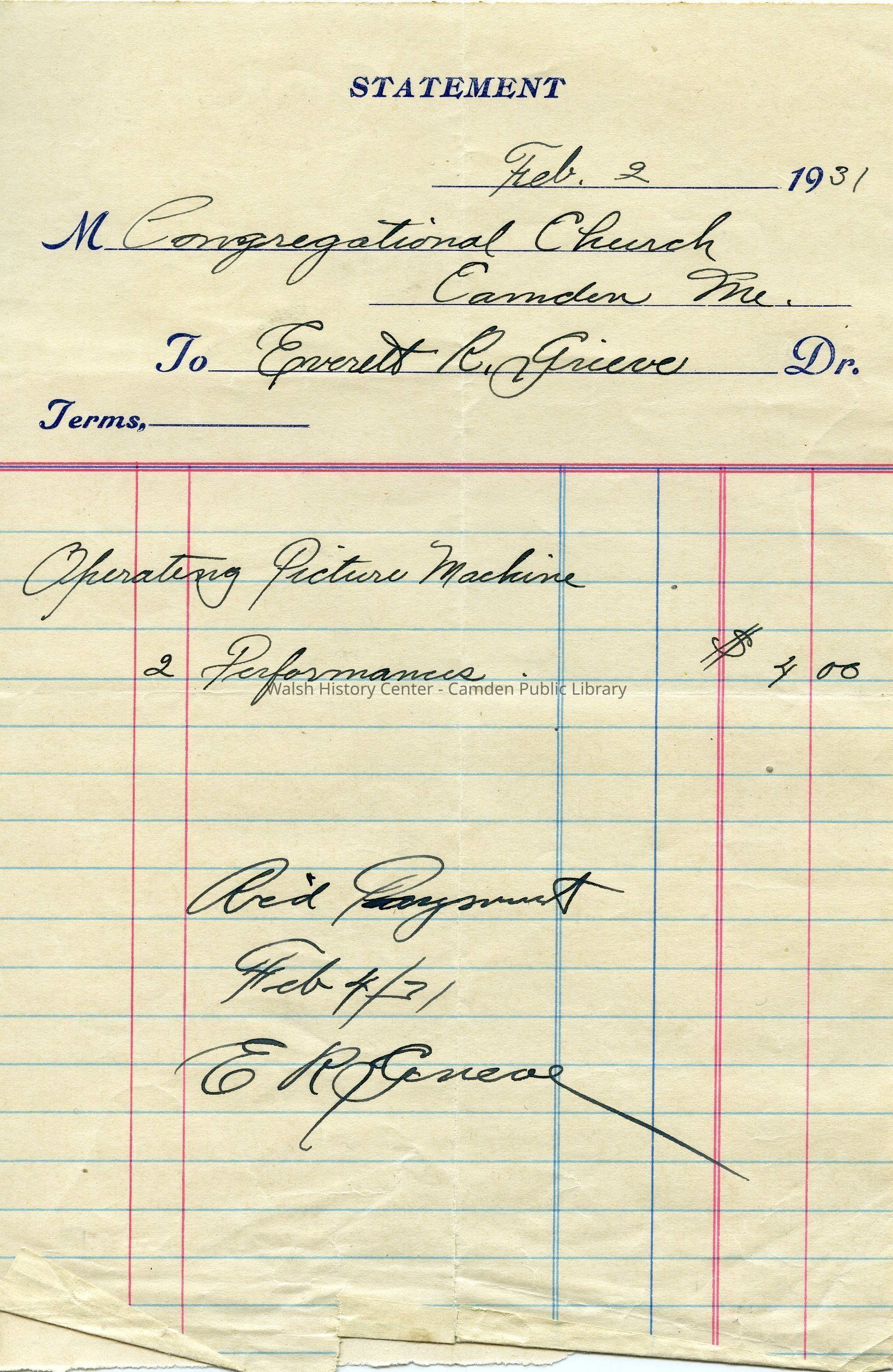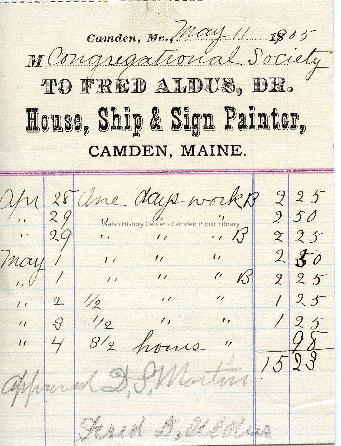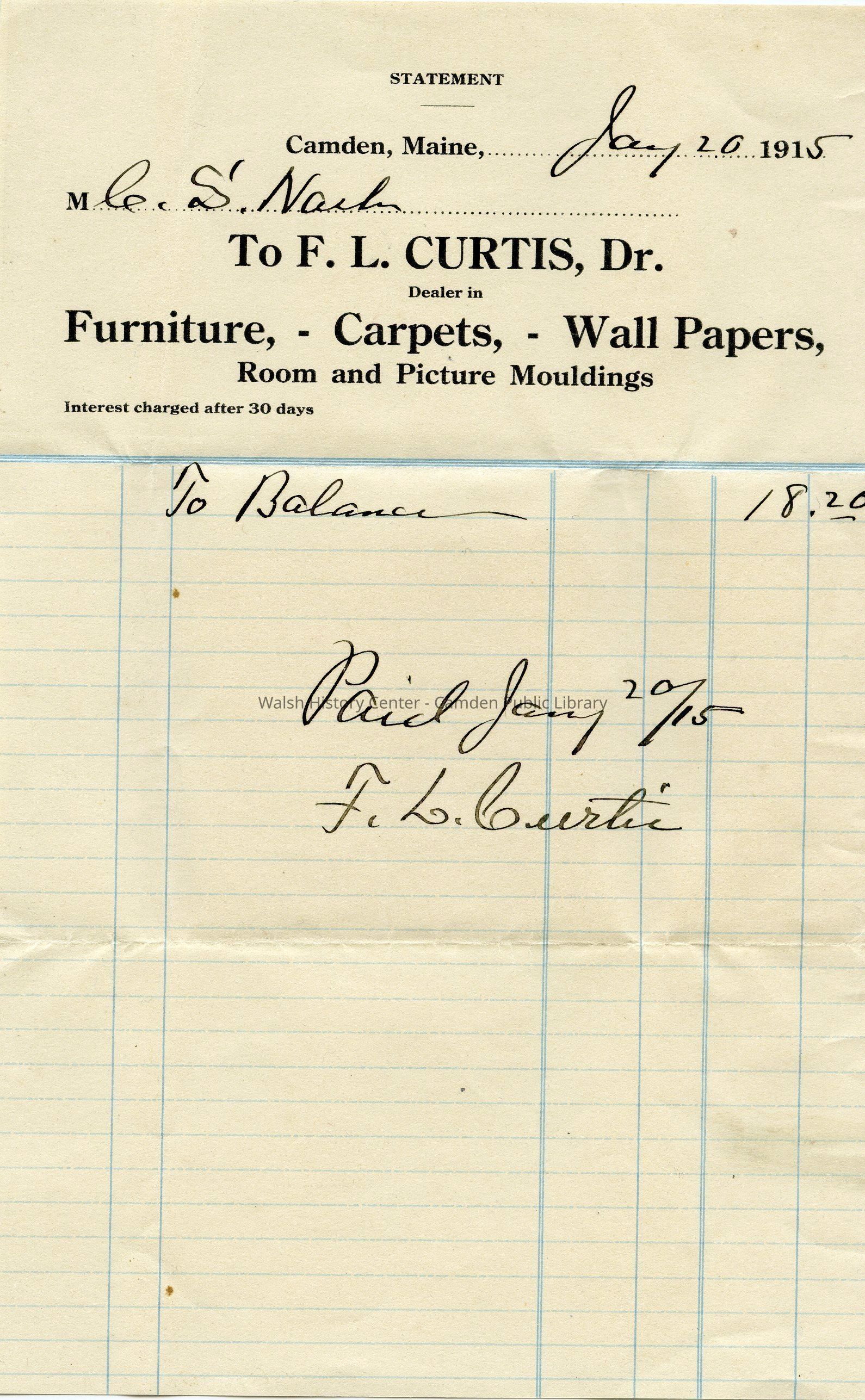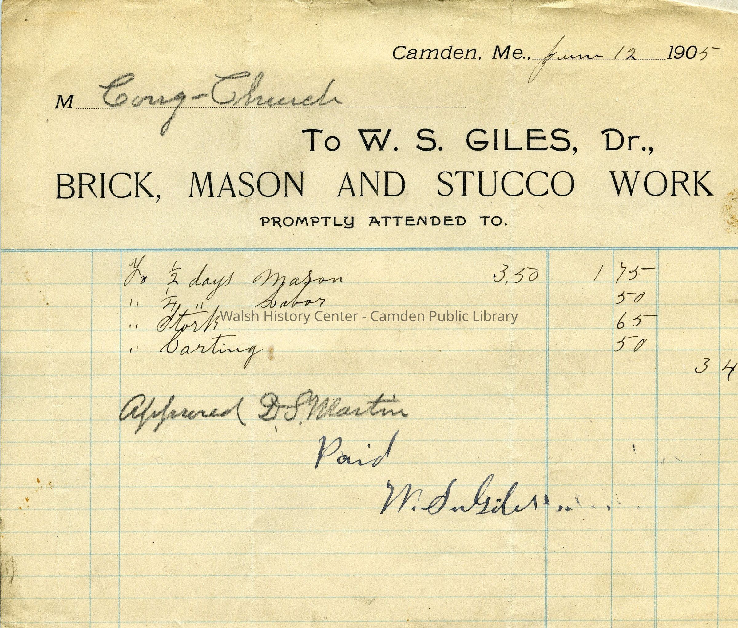 Contains billheads, stationery, bills, letterheads, and receipts from several Camden area businesses. These items date from the 1880's through the 1950's. Partial list of businesses represented: G.W. Achorn; Allen Insurance Agency; Ayers Market; Bay View House; Bay View Street Garage; Boynton's Pharmacy; Brown & Hobbs lumber; Brown's Market; Camden Anchor-Rockland Machine Co.; Camden & Rockland Water Company; Camden Farmer's Union; Camden Lumber Company; Camden Publishing Company; Camden Yacht Building and Railway Company; Carleton, Pascal & Co.; J.C. Curtis Hardware; Follansbee & Wood; Haskell & Corthell; J.H. Hobbs Company; Lenfest's Automotive Service; J.L. Locke; Maiden Cliff Rebekah Lodge; Maine Insane Hospital; The Megunticook Press; A.H. Parsons; Pendleton Dairy; S.G. Ritterbush, contractor; Rockland, Thomaston & Camden Street Railway; S.E. & H.L. Shepherd Company; TalbotArchive Details
