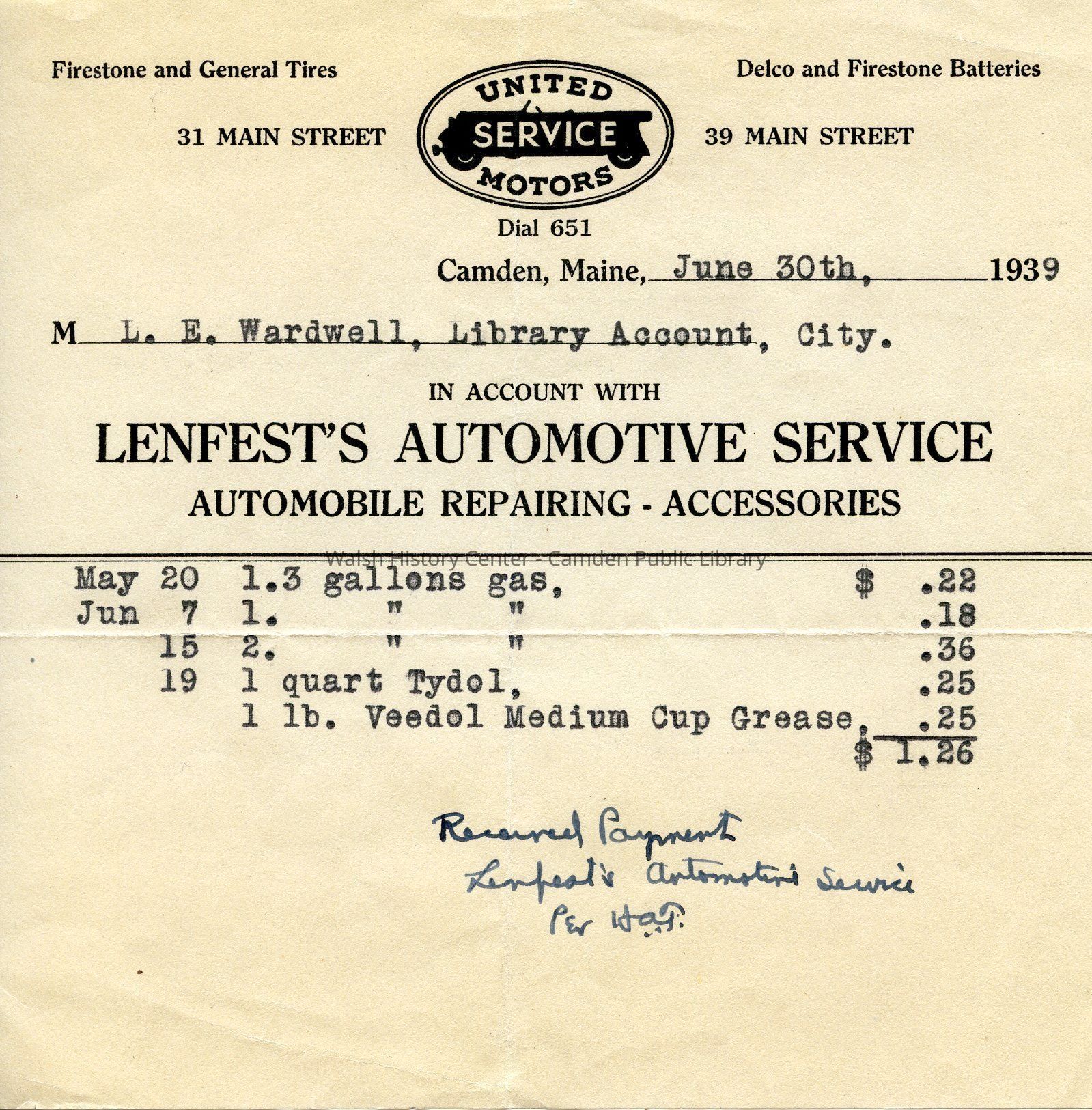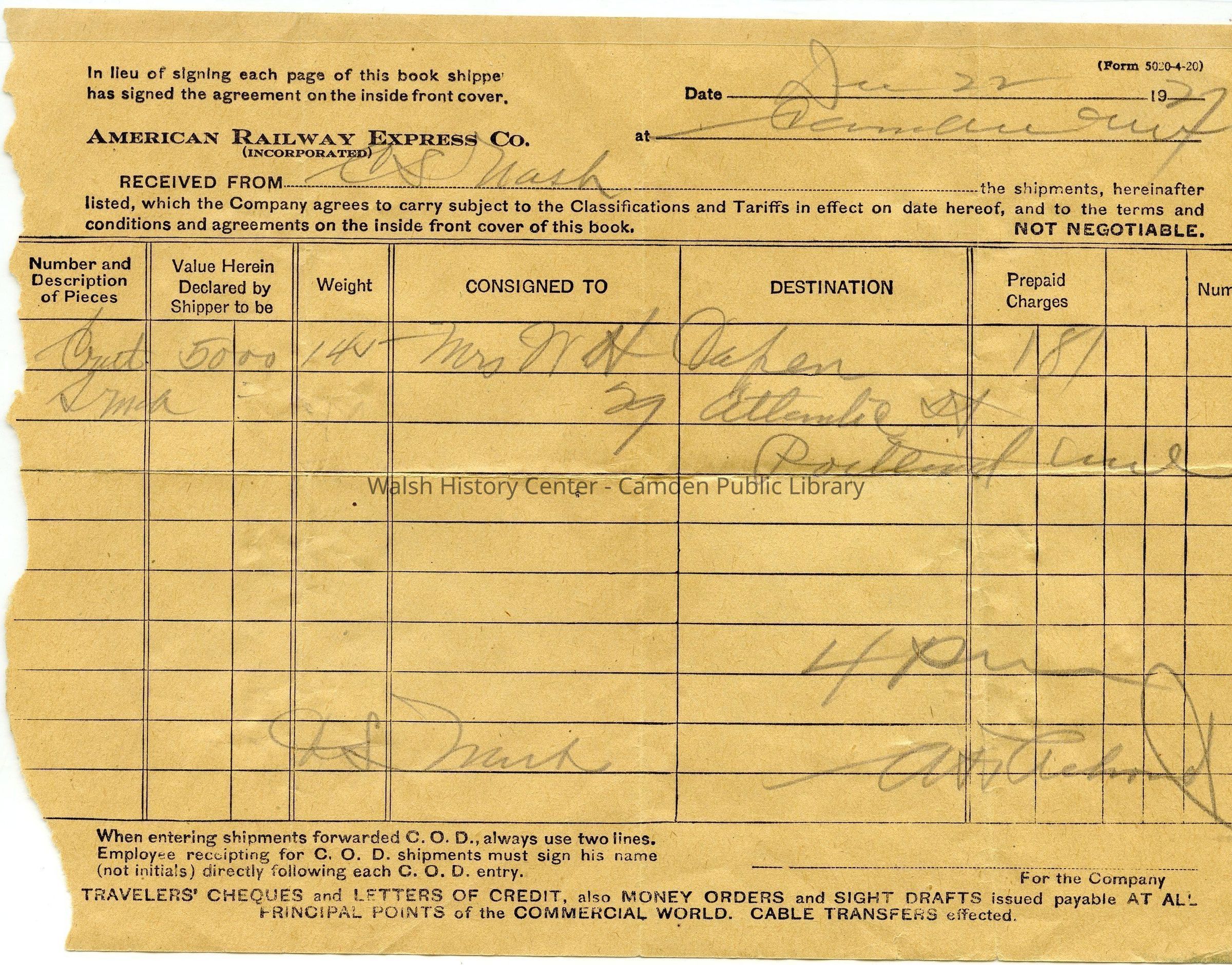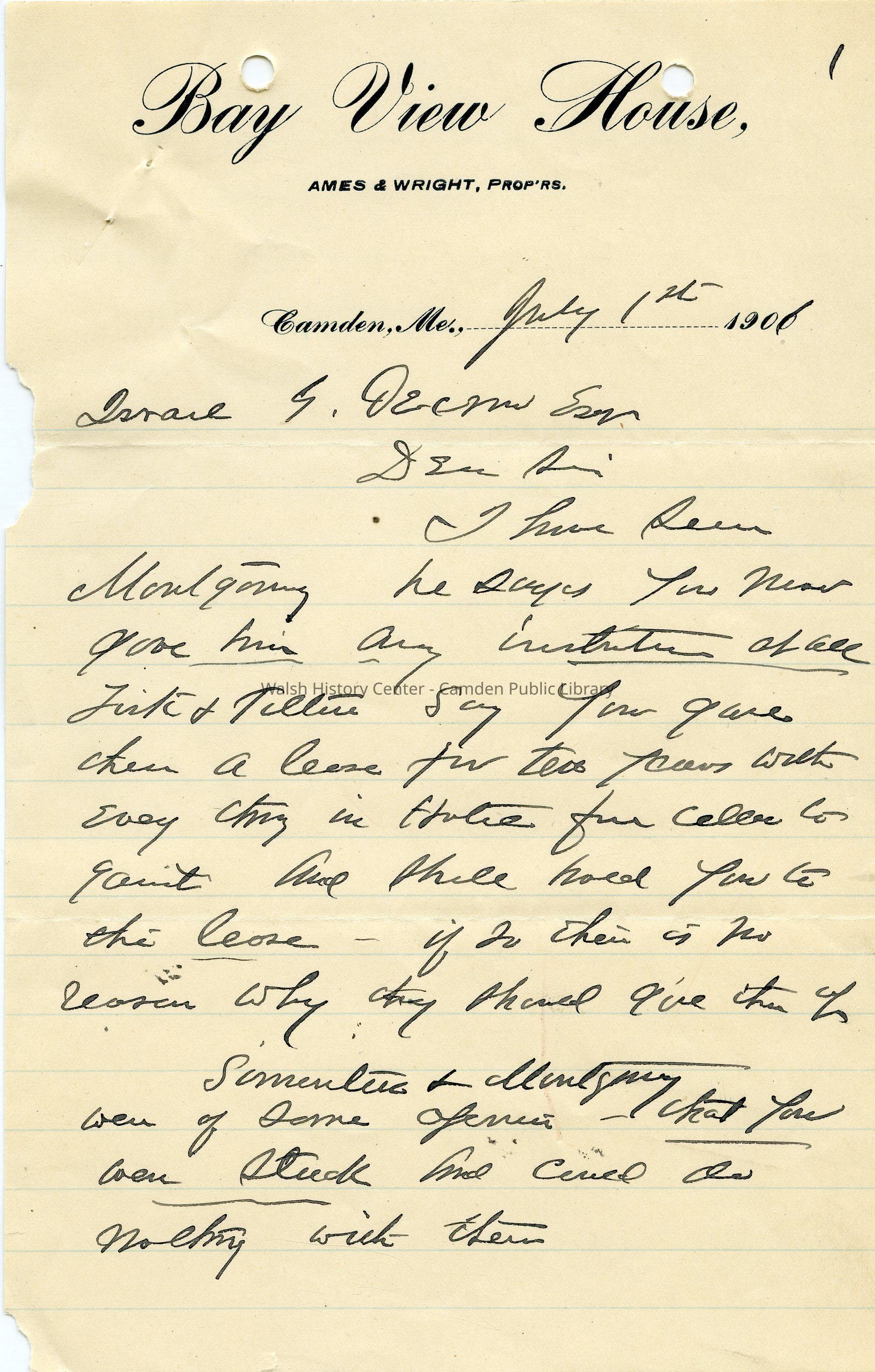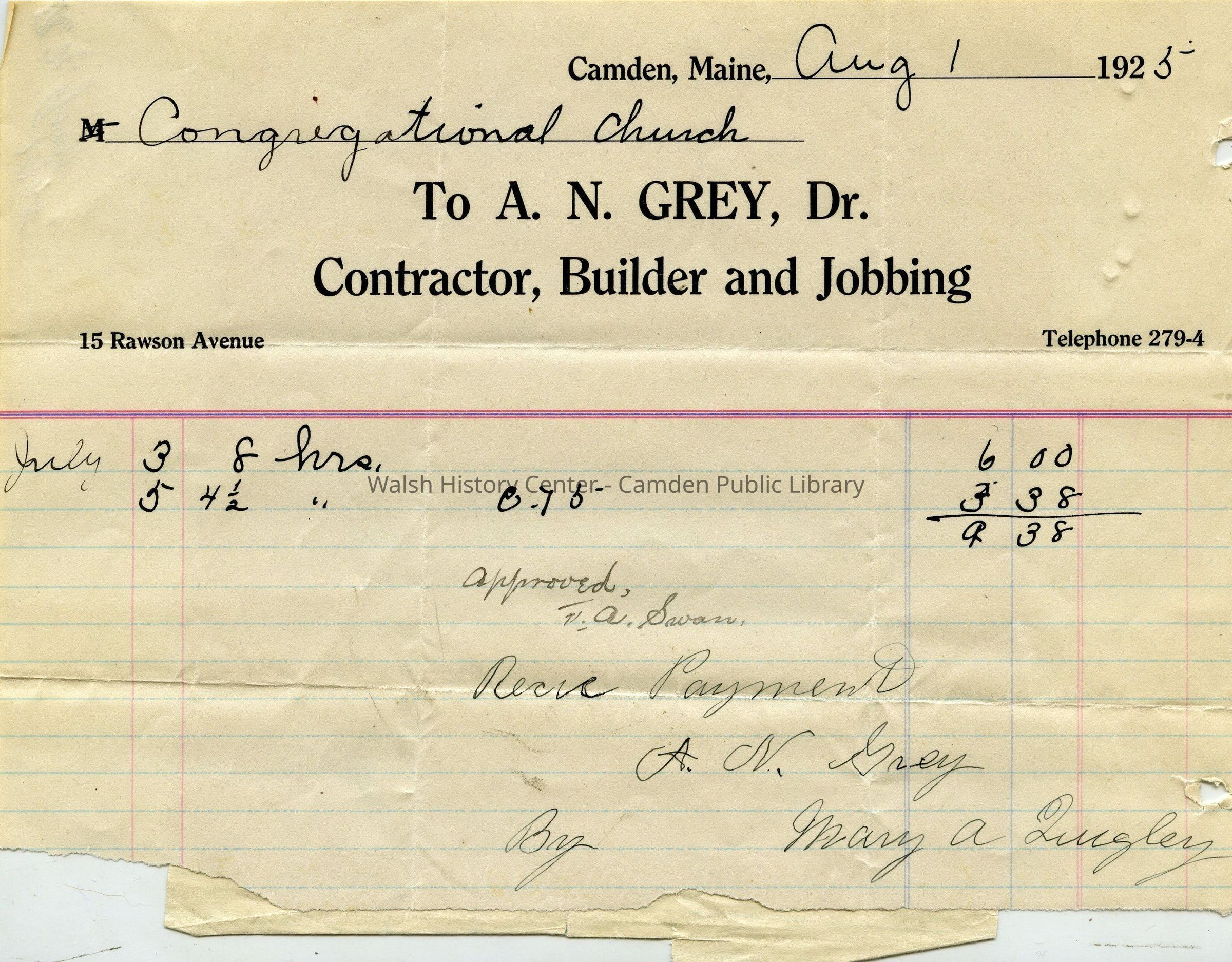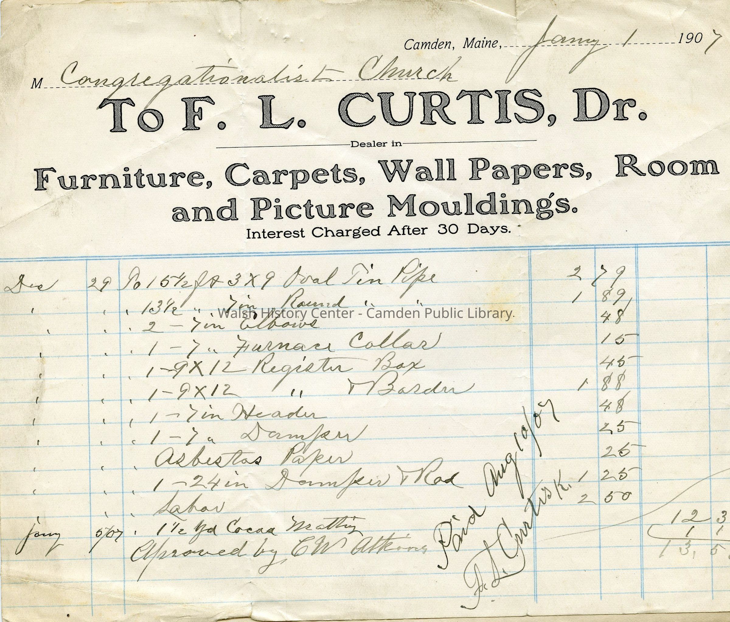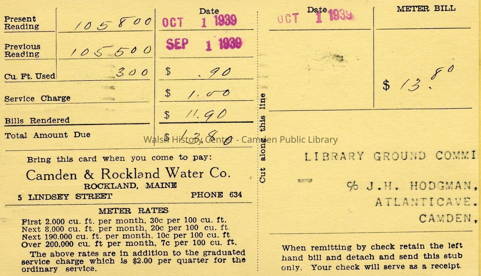 Contains billheads, stationery, bills, letterheads, and receipts from several Camden area businesses. These items date from the 1880's through the 1950's. Partial list of businesses represented: G.W. Achorn; Allen Insurance Agency; Ayers Market; Bay View House; Bay View Street Garage; Boynton's Pharmacy; Brown & Hobbs lumber; Brown's Market; Camden Anchor-Rockland Machine Co.; Camden & Rockland Water Company; Camden Farmer's Union; Camden Lumber Company; Camden Publishing Company; Camden Yacht Building and Railway Company; Carleton, Pascal & Co.; J.C. Curtis Hardware; Follansbee & Wood; Haskell & Corthell; J.H. Hobbs Company; Lenfest's Automotive Service; J.L. Locke; Maiden Cliff Rebekah Lodge; Maine Insane Hospital; The Megunticook Press; A.H. Parsons; Pendleton Dairy; S.G. Ritterbush, contractor; Rockland, Thomaston & Camden Street Railway; S.E. & H.L. Shepherd Company; TalbotArchive Details