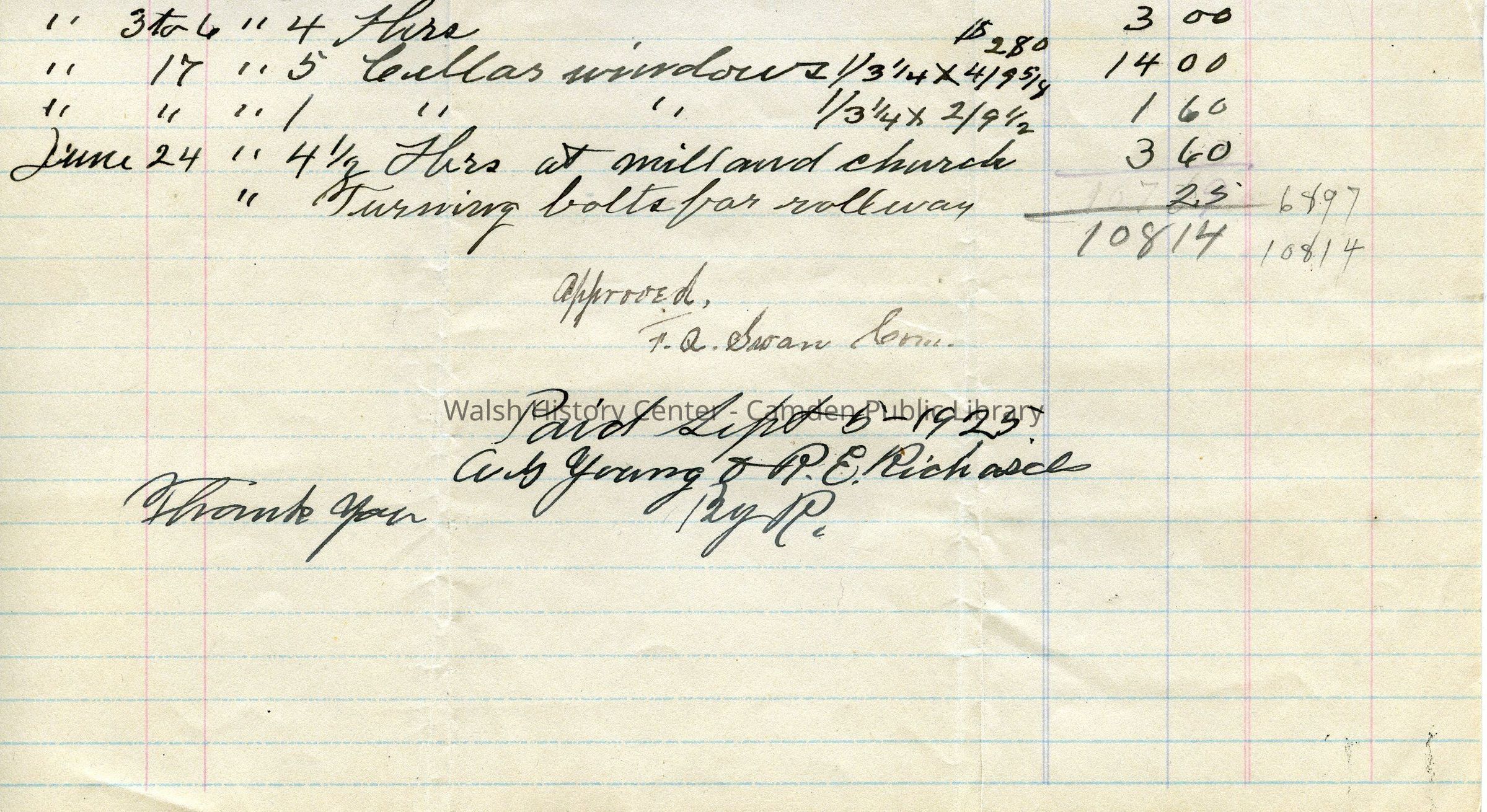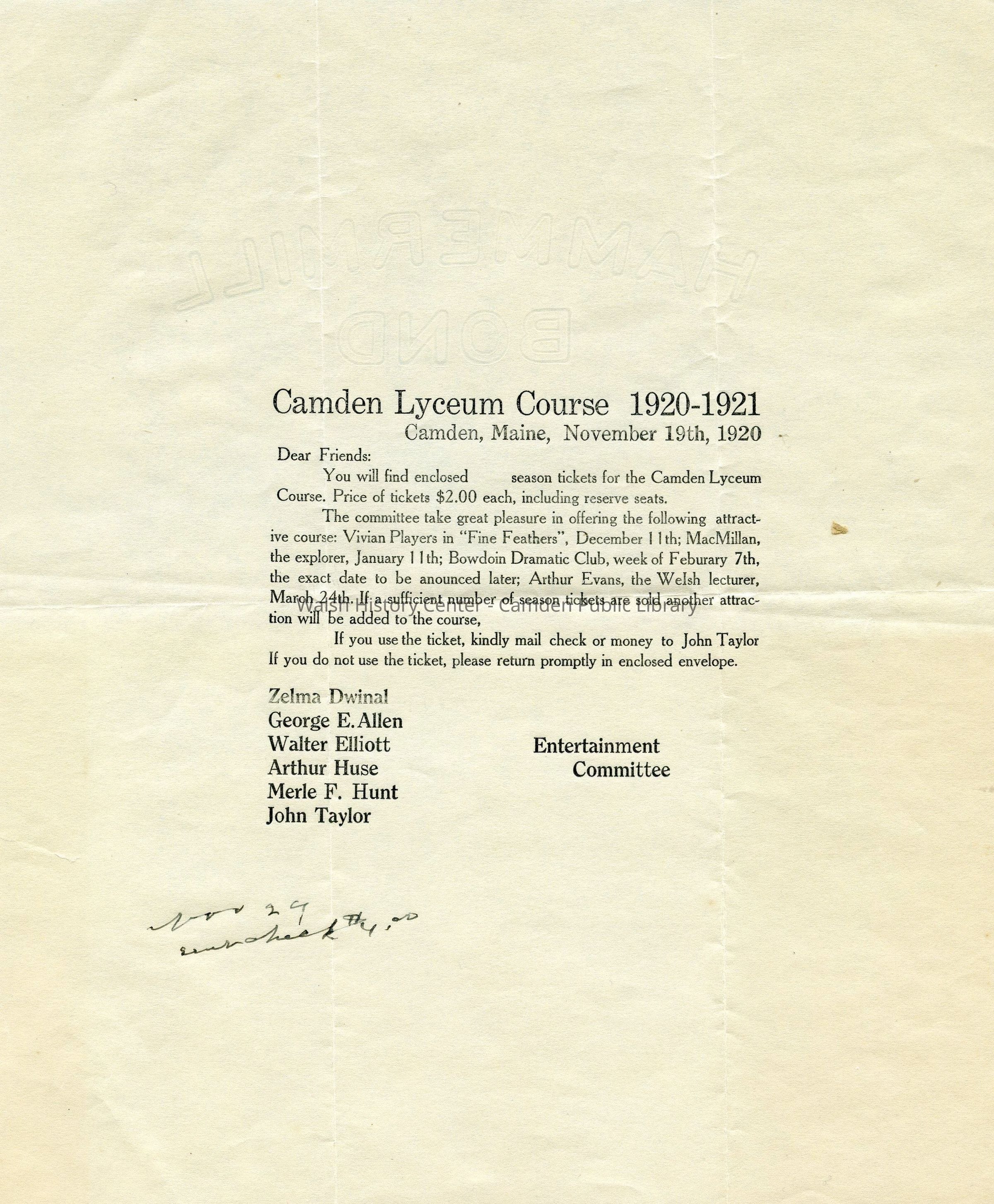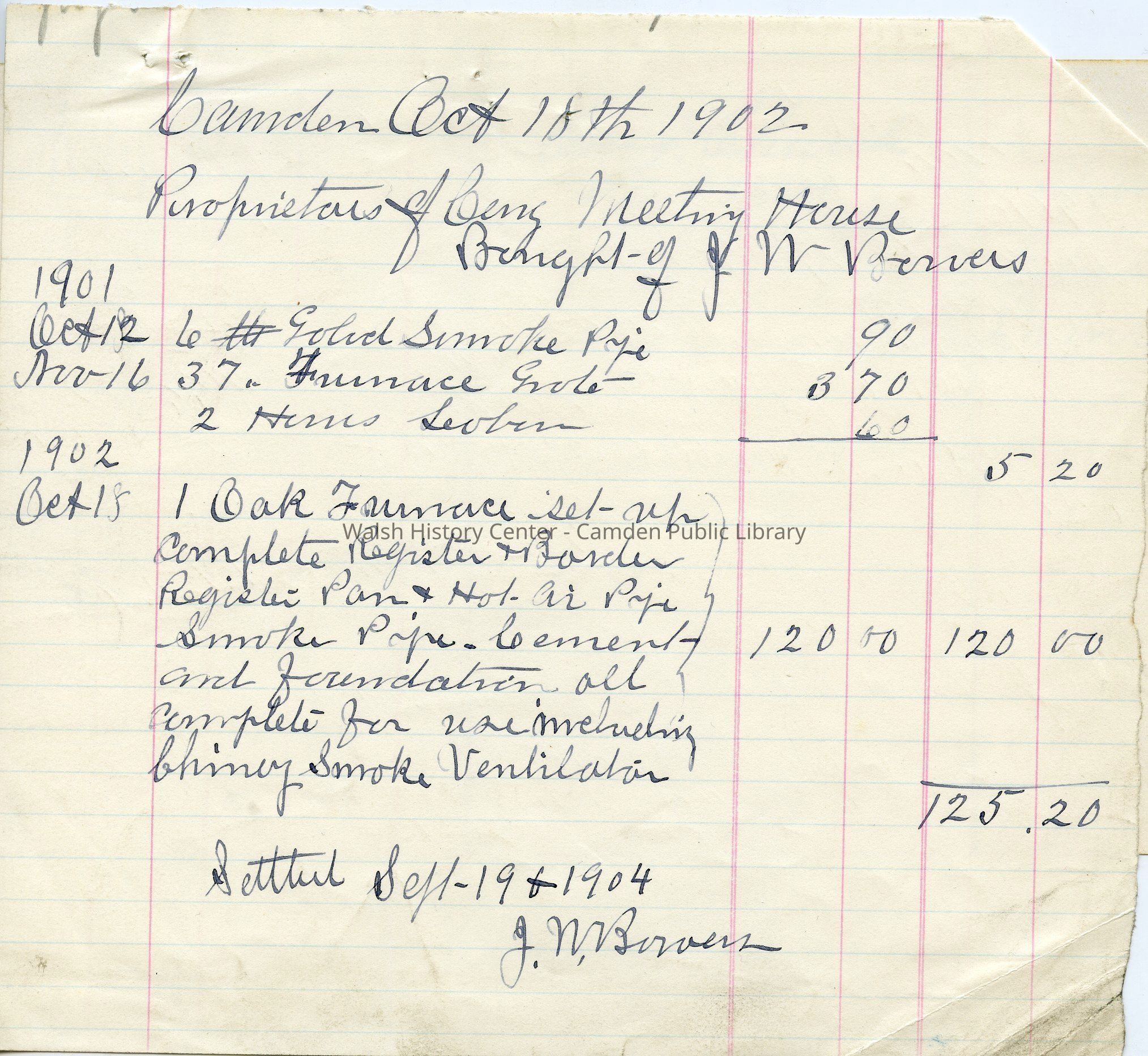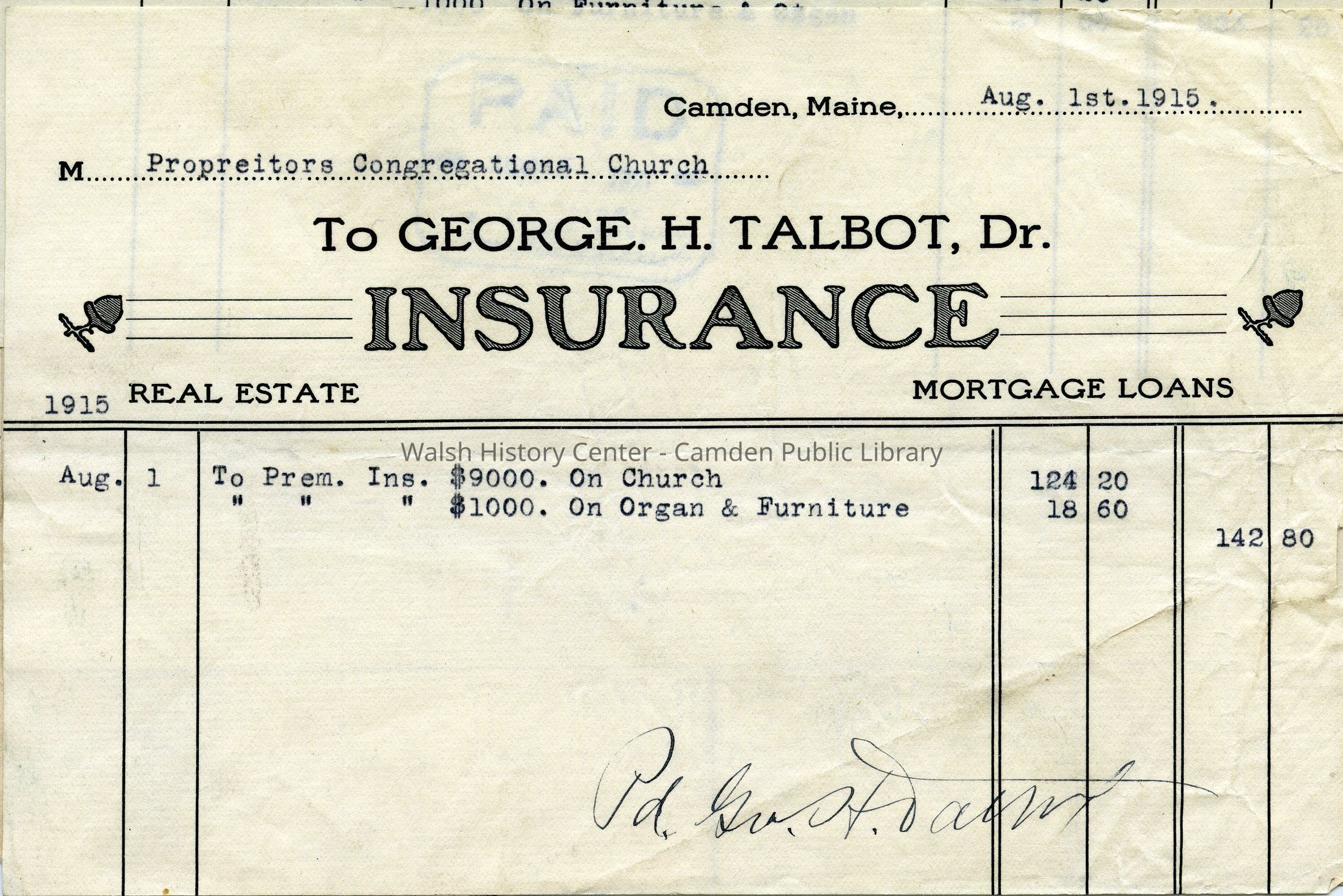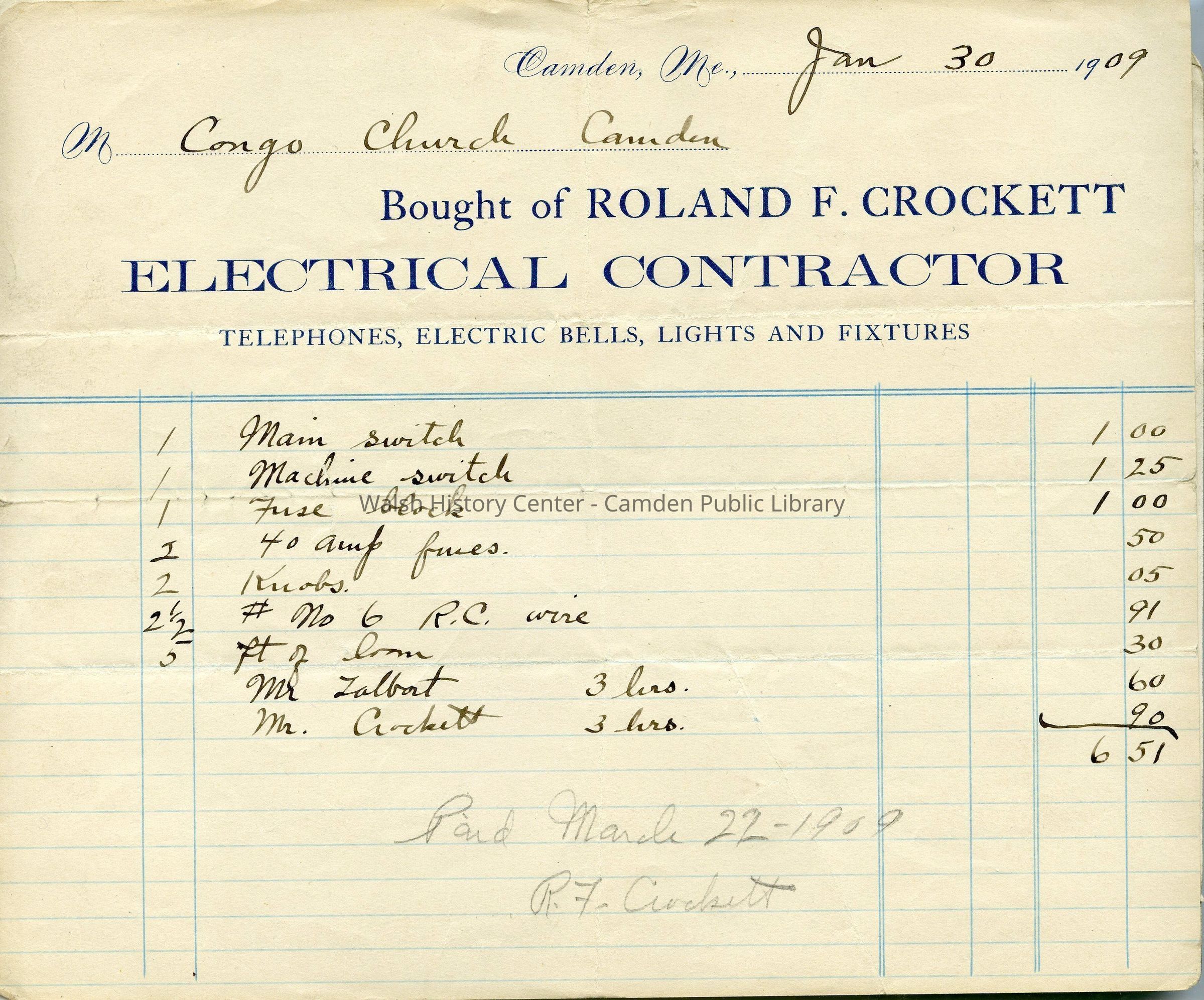 Contains billheads, stationery, bills, letterheads, and receipts from several Camden area businesses. These items date from the 1880's through the 1950's. Partial list of businesses represented: G.W. Achorn; Allen Insurance Agency; Ayers Market; Bay View House; Bay View Street Garage; Boynton's Pharmacy; Brown & Hobbs lumber; Brown's Market; Camden Anchor-Rockland Machine Co.; Camden & Rockland Water Company; Camden Farmer's Union; Camden Lumber Company; Camden Publishing Company; Camden Yacht Building and Railway Company; Carleton, Pascal & Co.; J.C. Curtis Hardware; Follansbee & Wood; Haskell & Corthell; J.H. Hobbs Company; Lenfest's Automotive Service; J.L. Locke; Maiden Cliff Rebekah Lodge; Maine Insane Hospital; The Megunticook Press; A.H. Parsons; Pendleton Dairy; S.G. Ritterbush, contractor; Rockland, Thomaston & Camden Street Railway; S.E. & H.L. Shepherd Company; TalbotArchive Details