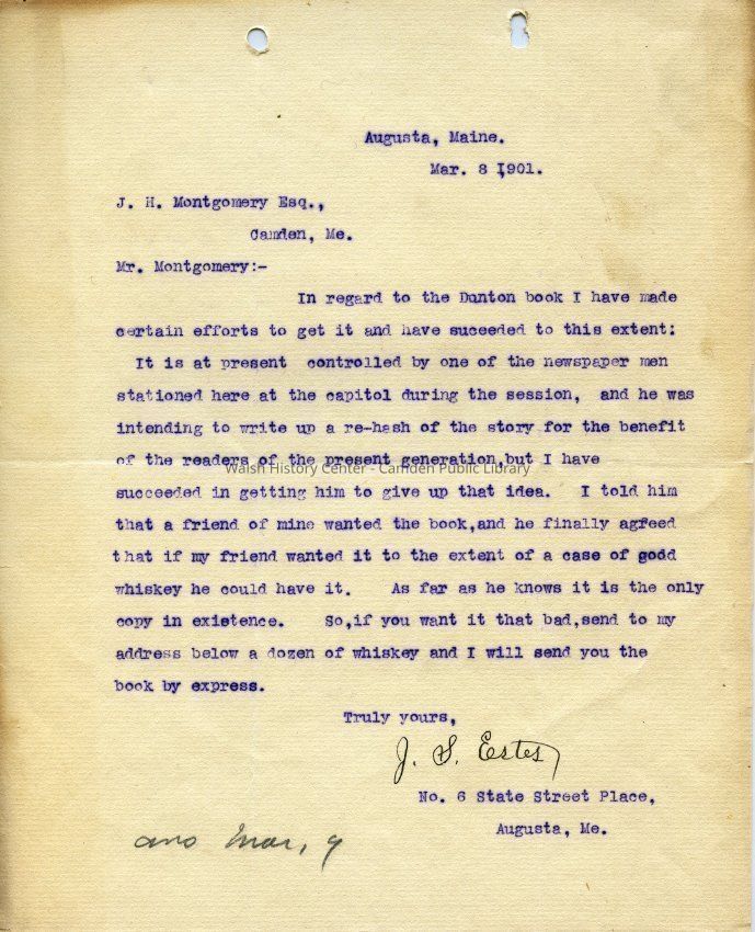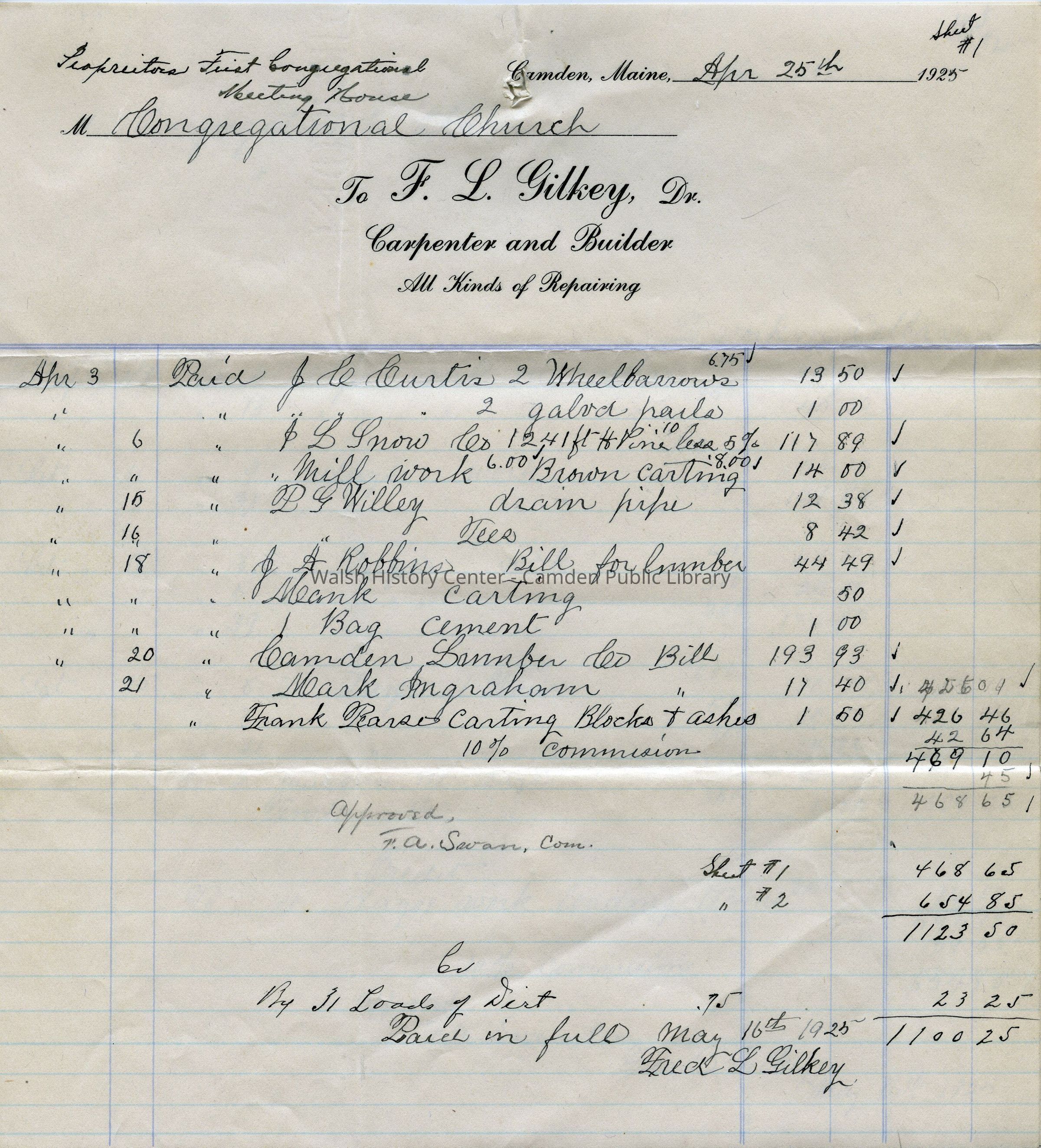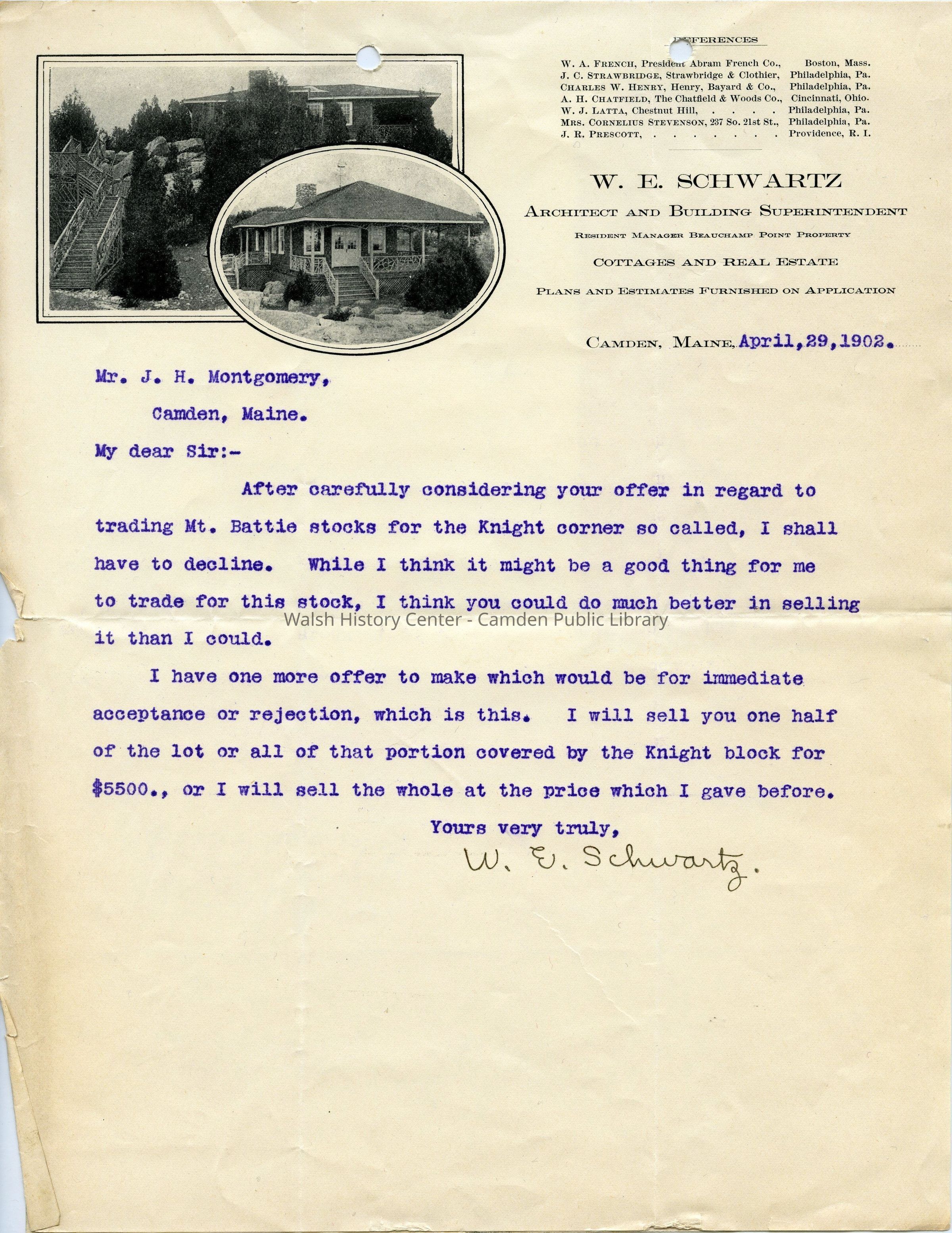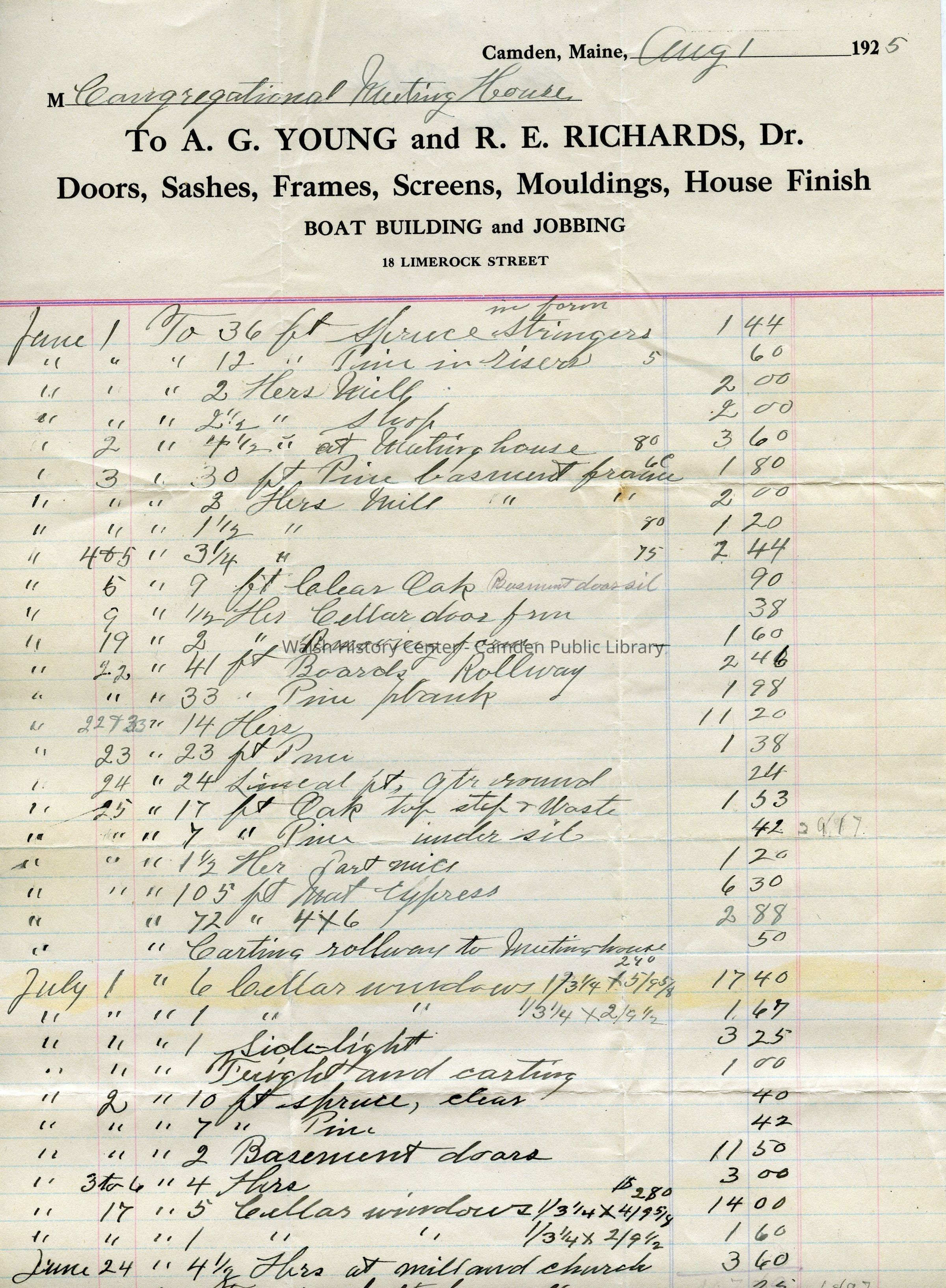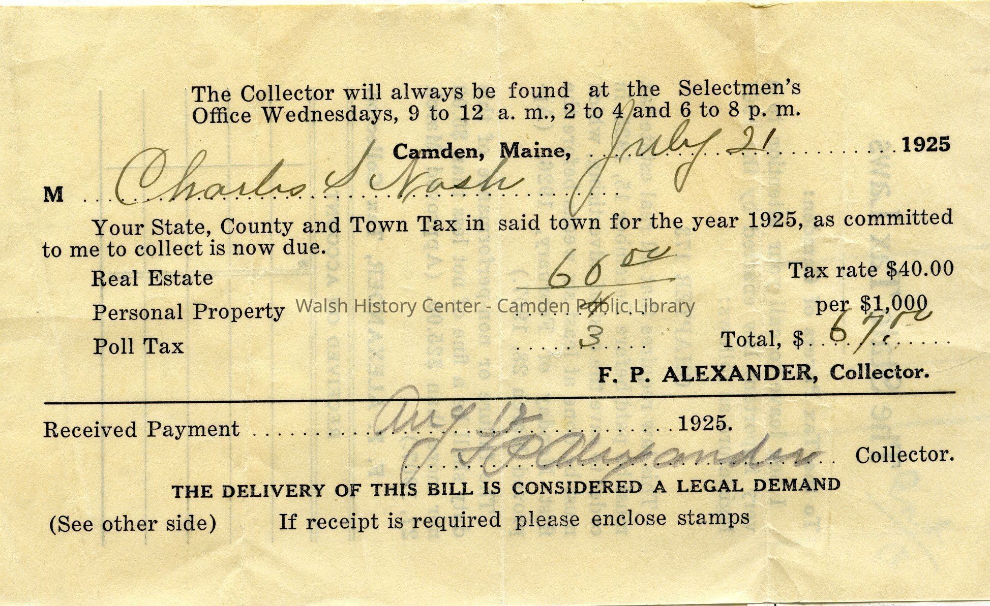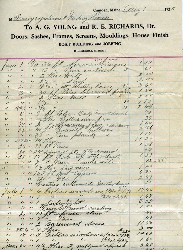 Contains billheads, stationery, bills, letterheads, and receipts from several Camden area businesses. These items date from the 1880's through the 1950's. Partial list of businesses represented: G.W. Achorn; Allen Insurance Agency; Ayers Market; Bay View House; Bay View Street Garage; Boynton's Pharmacy; Brown & Hobbs lumber; Brown's Market; Camden Anchor-Rockland Machine Co.; Camden & Rockland Water Company; Camden Farmer's Union; Camden Lumber Company; Camden Publishing Company; Camden Yacht Building and Railway Company; Carleton, Pascal & Co.; J.C. Curtis Hardware; Follansbee & Wood; Haskell & Corthell; J.H. Hobbs Company; Lenfest's Automotive Service; J.L. Locke; Maiden Cliff Rebekah Lodge; Maine Insane Hospital; The Megunticook Press; A.H. Parsons; Pendleton Dairy; S.G. Ritterbush, contractor; Rockland, Thomaston & Camden Street Railway; S.E. & H.L. Shepherd Company; TalbotArchive Details