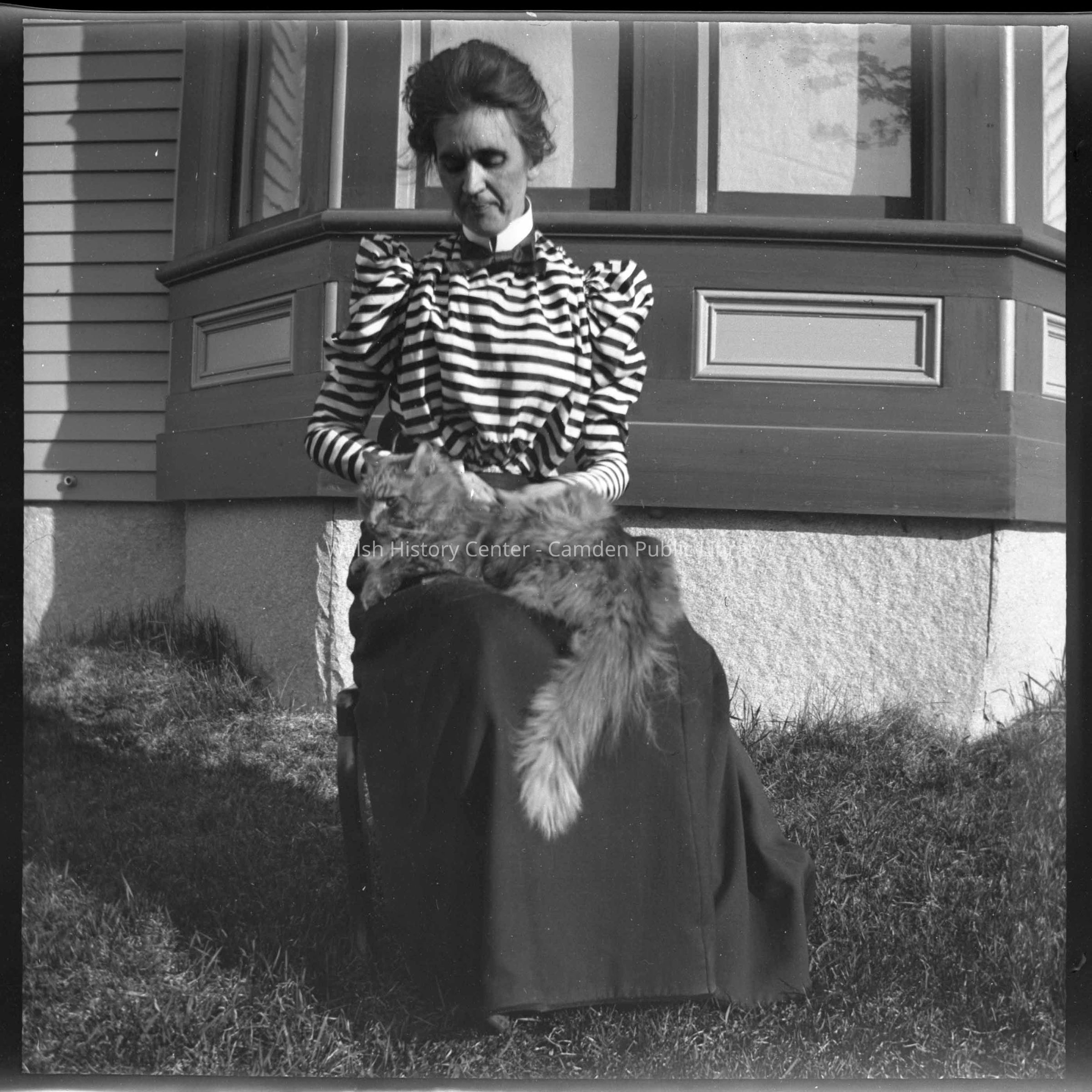 B/w photo labeled "Blanche & Blutchin." Image is of a woman seated outdoors holding a large long-haired cat.Collection