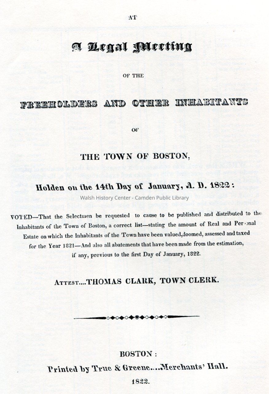 Boston Taxpayers book contains the entire 1821 tax list for both Boston and South Boston, and thus for 99% of Suffolk County, Mass. Originally published in 1822 and never before reprinted. A wealth of detail is included, touching on every family in Boston as awell as on partnerships, corporations, heirs, and estates.