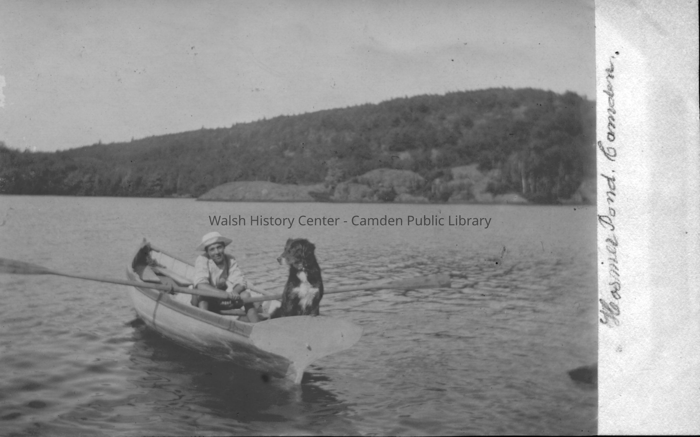 Photo on front of postcard depicts a boy and his dog on a boat on Hosmer Pond, Camden. No postmark.Collection