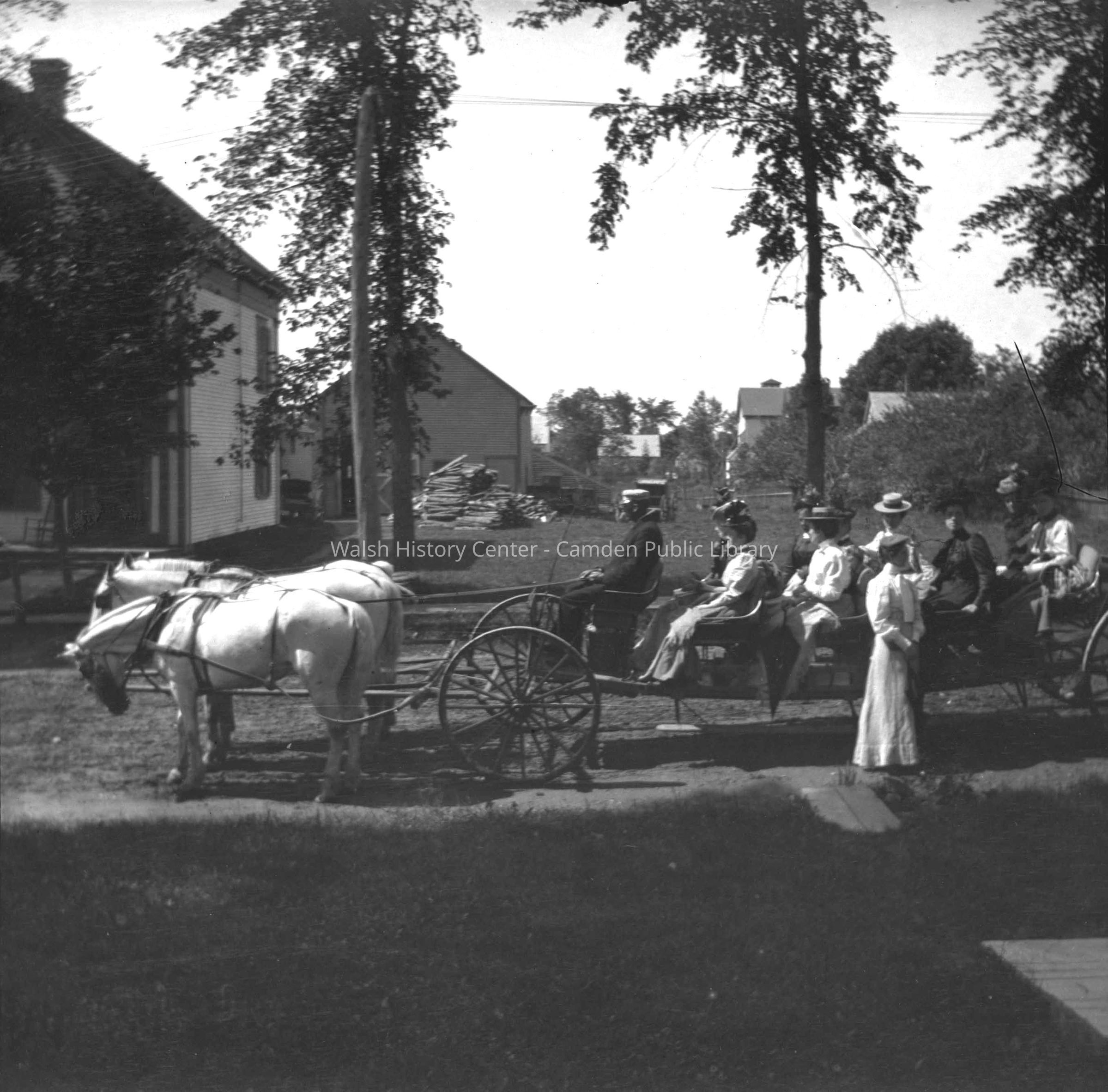 B/W photograph of a team of white horses and buckboard with several passengers. Photo is described by the photographer as "a buckboard ride to Northport and Belfast, 20 August 1898."Collection