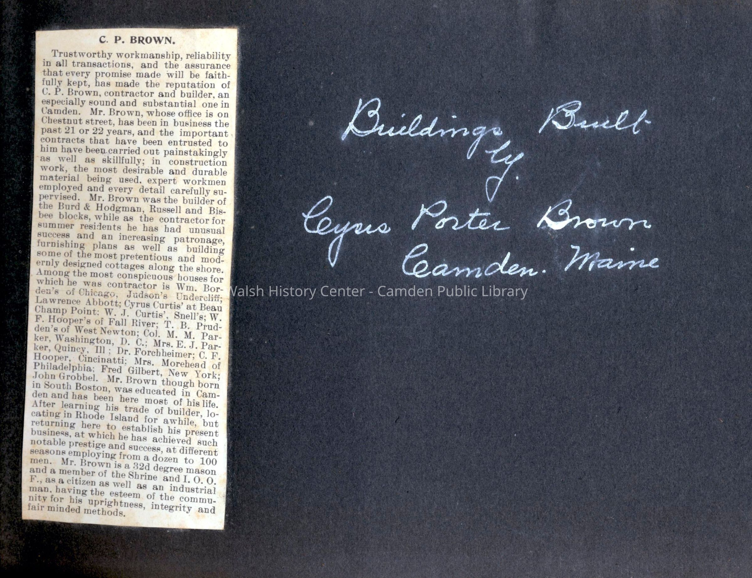 Scanned copy of page 1 in leather photo album (see also: Object ID CRHS 2006.1) Newspaper clipping titled, "C. P. Brown." Handwritten on page is "Buildings Built by Cyrus Porter Brown, Camden, Maine."