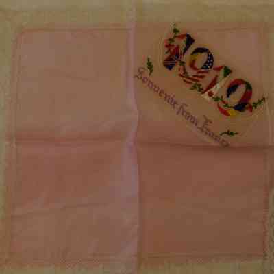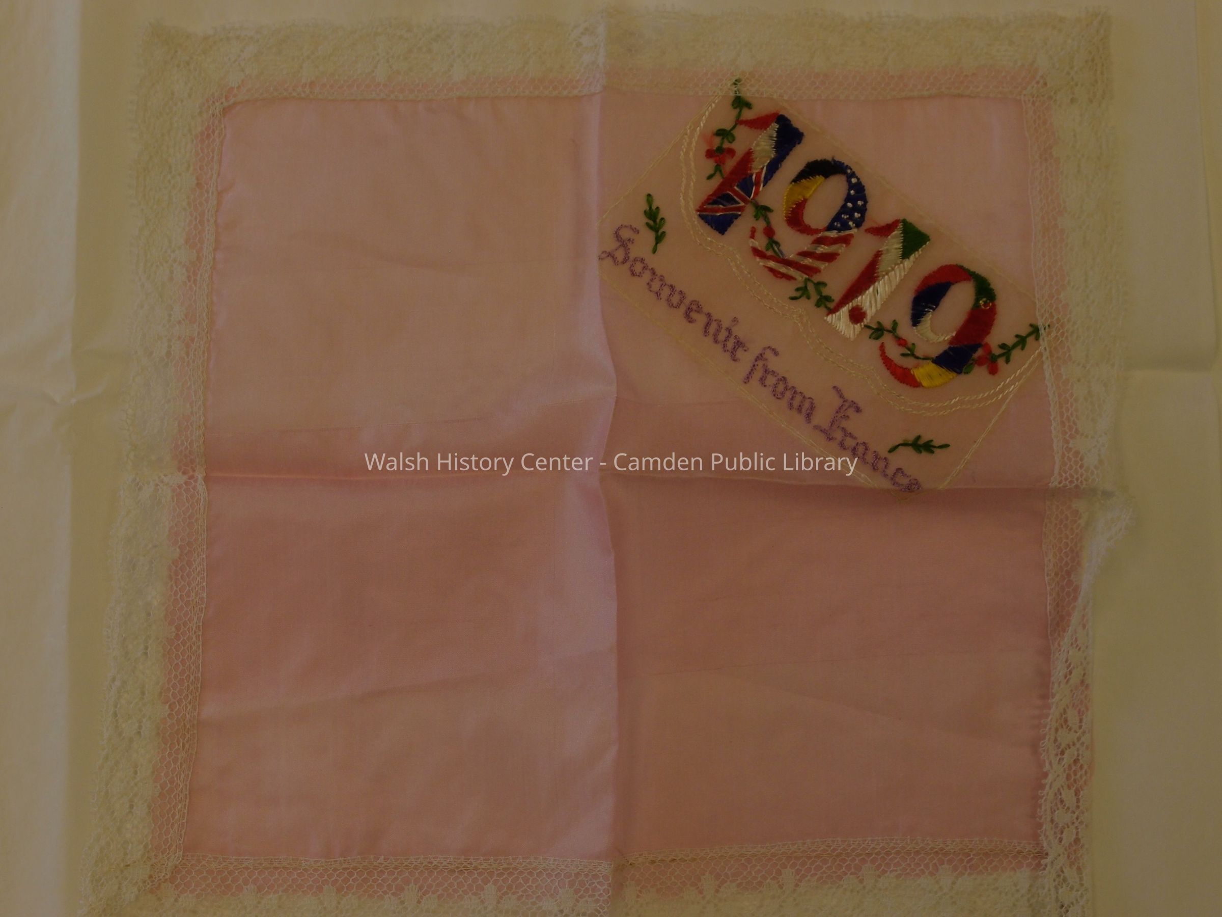 Souvenir handkerchief made in France after World War I. Bright pink with lace edging, the handkerchief has the words "Souvenir from France" embroidered in one corner. The year "1919" is also embroidered in the corner, made up of the colors of the flags of the participating countries.Collection