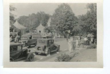 Small black and white photograph of a crowd of people in the Amphitheatre in Camden, Maine. The photograph is captioned as "Event at the new Camden Amphitheatre," so this photograph could have been taken in the early to mid 1930's. Three cars are parked along Atlantic Avenue, and the Amphitheatre gatehouses can be seen in the background. The vehicle facing the camera belonged to Pathe News.Collection