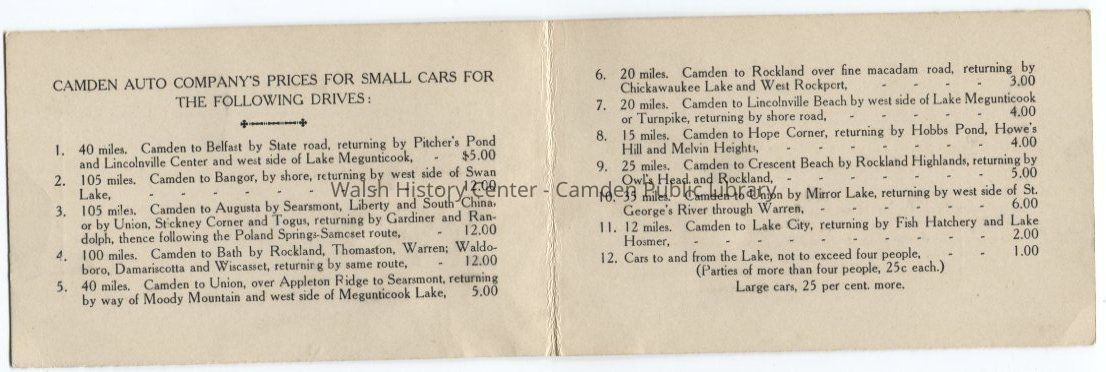 Advertising booklet for the Camden Auto Company. Lists prices for scenic drives in small cars.Collection